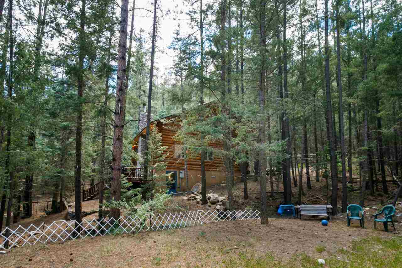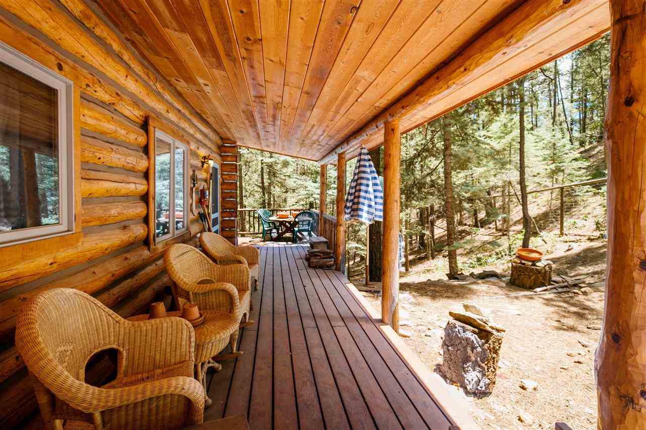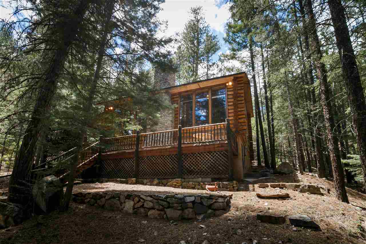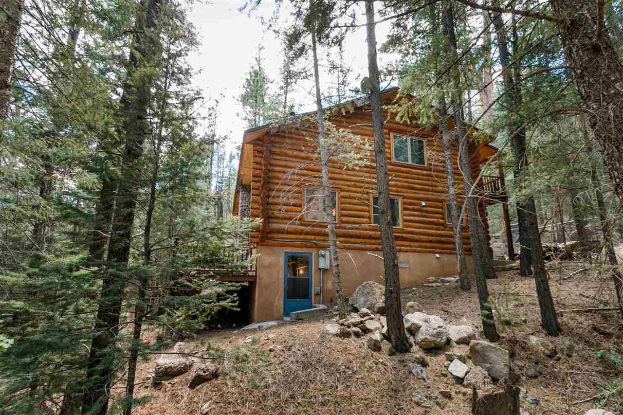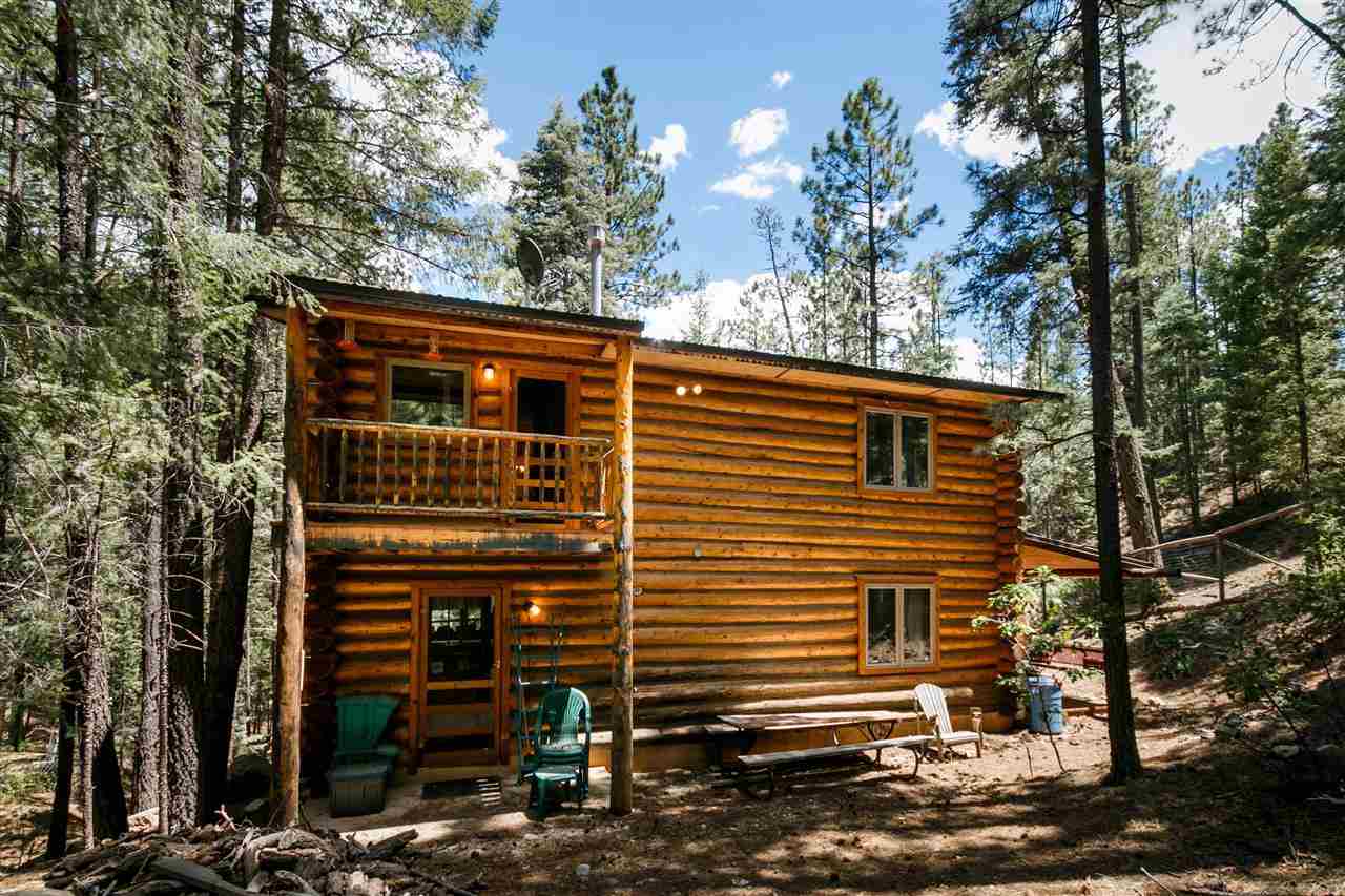 Rare Log Cabin Listing in the heart of the Pecos Canyon that includes the 3/4 acre lot. 1579 NM Hwy 63 was built by Richard Roybal of Pecos Trail Contractor, and has an open concept living/dining/kitchen with River Rock fireplace, vaulted ceiling, covered porch, laundry area and basement storage area. One bedroom and bath downstairs, one bed, bath and office with outdoor balcony, upstairs. The lot adjoins the Santa Fe National Forest, all appliances included and furnishings are available. Fully fenced for a dog, wonderful grassed play area, Granite kitchen counters wrap around porch. Located just before Cathedral Rock, a short distance past Windy bridge. Access for fishing along the Pecos River included, located behind an electric gate. A true destination for weekend fun or year round living. 40 minutes east of Santa Fe in the Pecos Canyon.