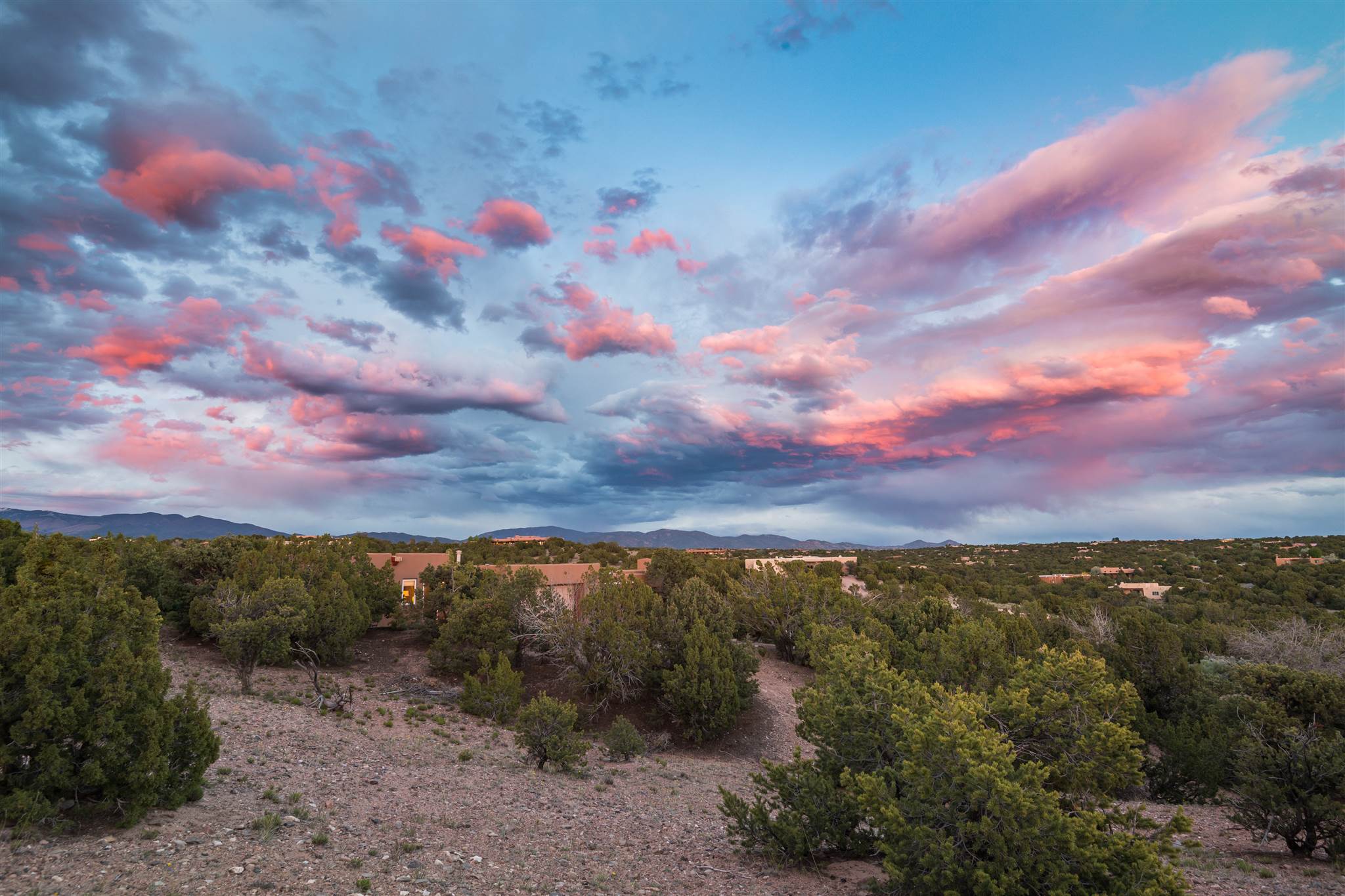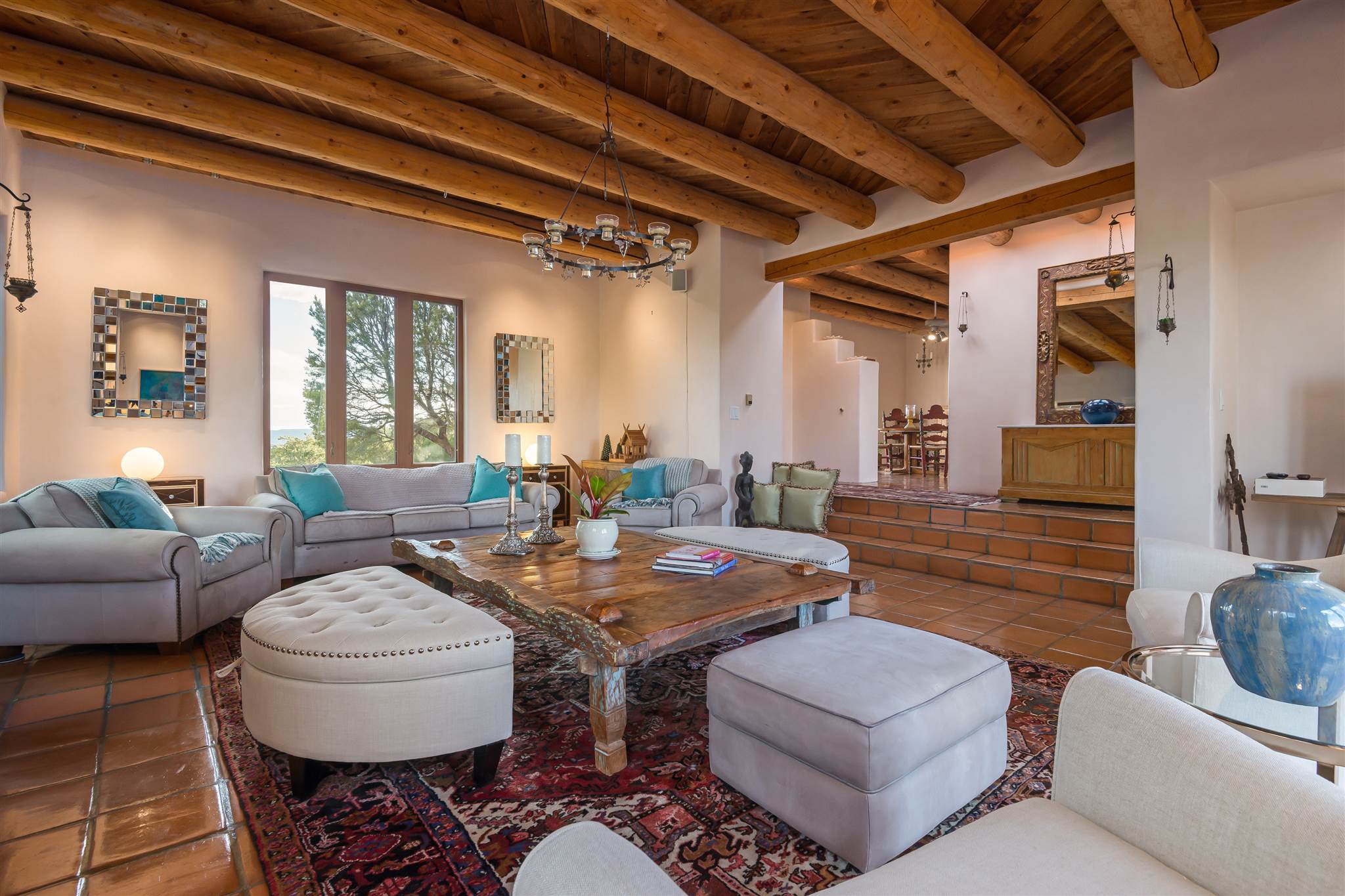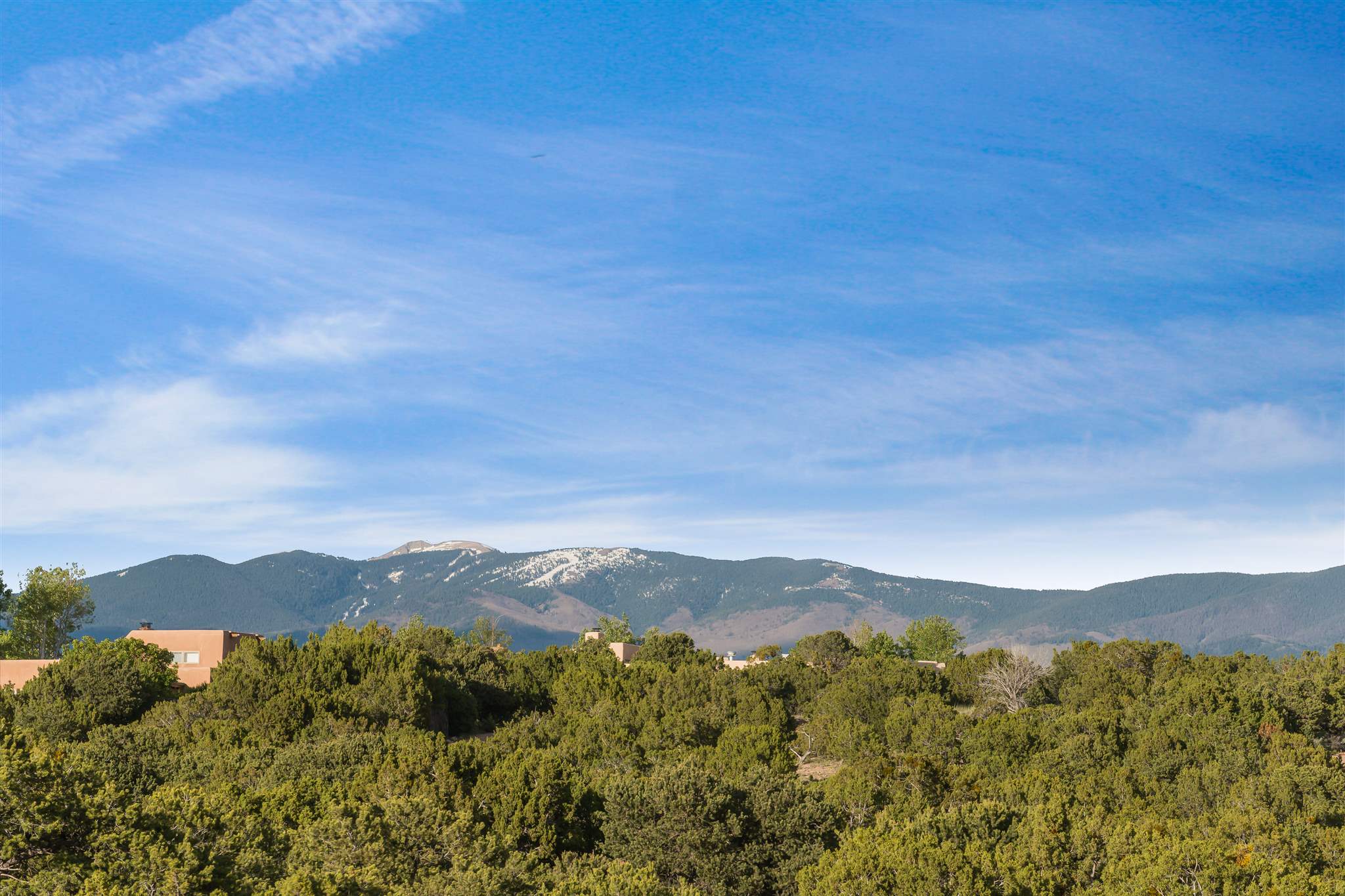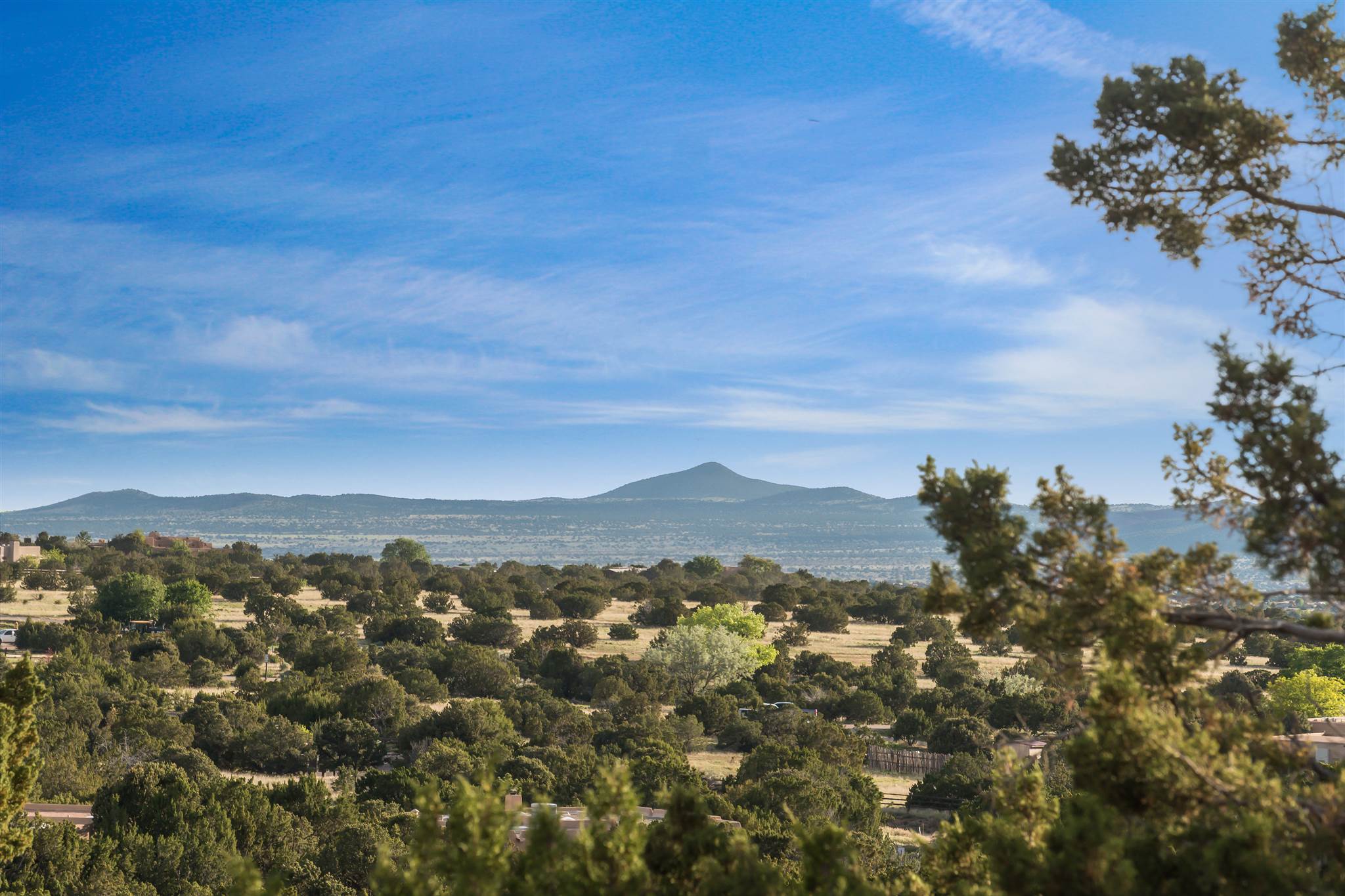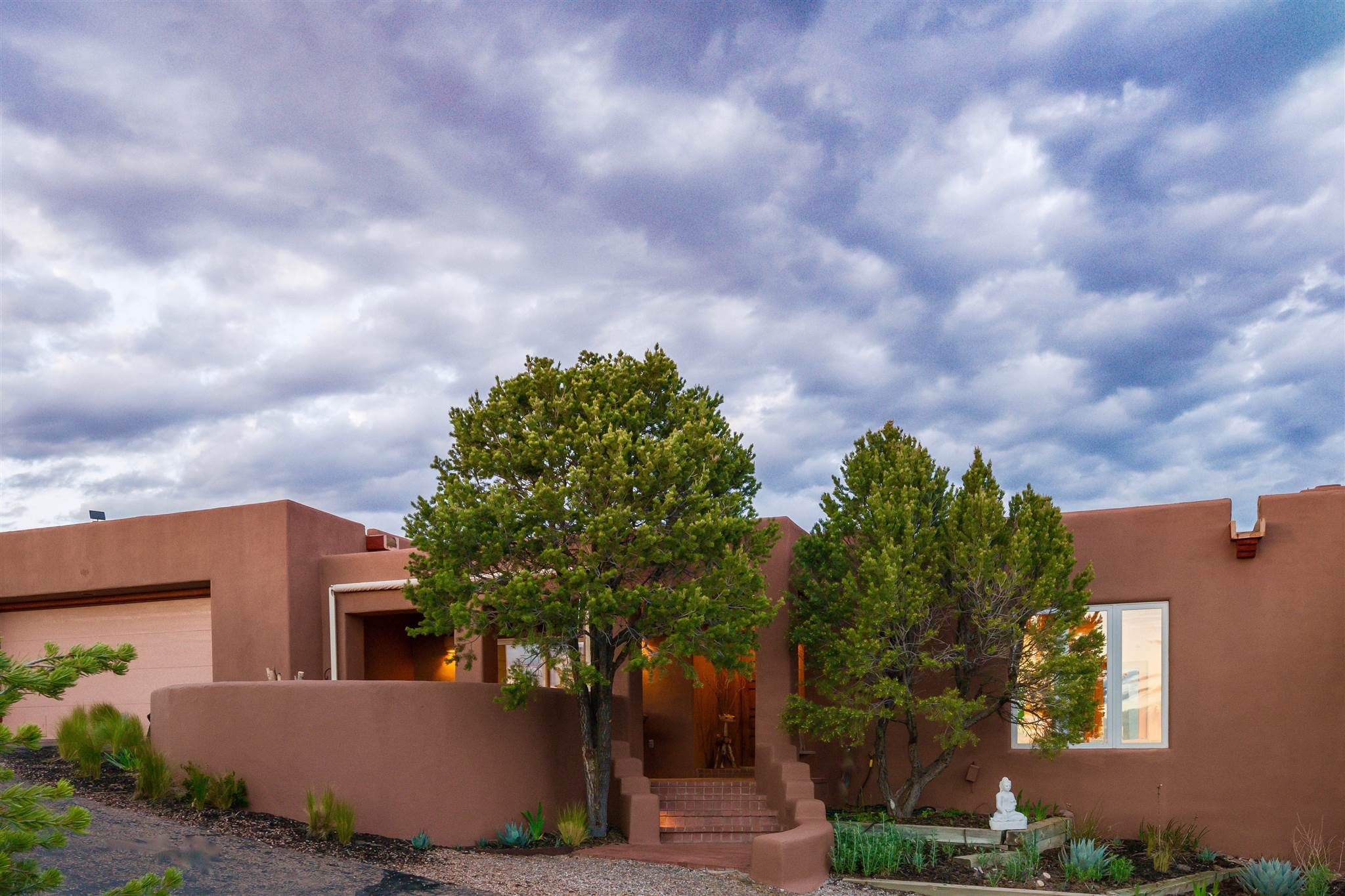 A beautiful perfectly sited custom built home in the Gated Community of Salva Tierra; only 15 minutes to Santa Fe and an easy commute to Los Alamos. The 3,346 sq. ft. updated home on an elevated 1.5 -Acre lot, has Spectacular Mountain and big sky views from most every window and outdoor portals/decks. Enter through the front door to an elegant open floor plan, to the right a large living room, with wood burning fireplace, lots of room for art and French doors opening out to a back deck. To your left a Chef's Kitchen, with marble countertops, custom appliances, breakfast bar, and cabinets galore. The adjoining casual dining space has a sliding glass door out to a private walled front portal. Just off the front entry and kitchen is a beautiful formal dining room. A wide hallway leads to a powder room, garage door entry, two guest rooms, laundry room, full hall bath, office/bedroom with a private entrance and a grand master-suite. This expansive inviting suite has a wood burning kiva, luxurious bathroom, with walk-in shower and wonderful soaking tub. Another mountain range viewing deck just off the master, a good-sized fenced side yard, with water feature, mature trees, plants and thoughtful landscaping completes this great home. Ready for lots of entertaining! There are a few interior steps, floor plan in documents.