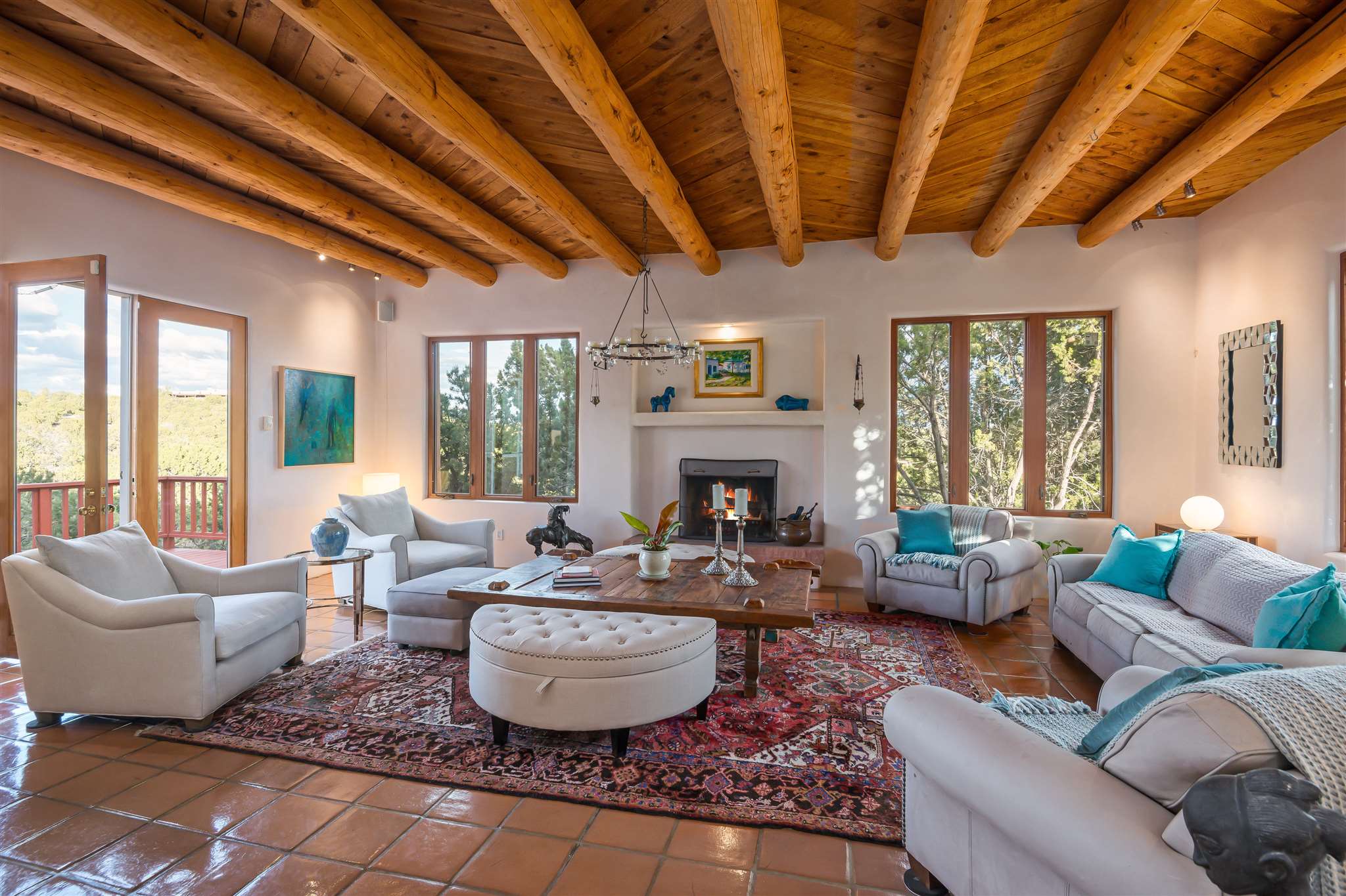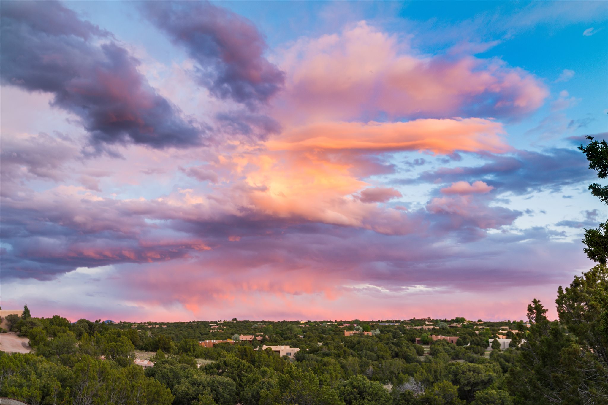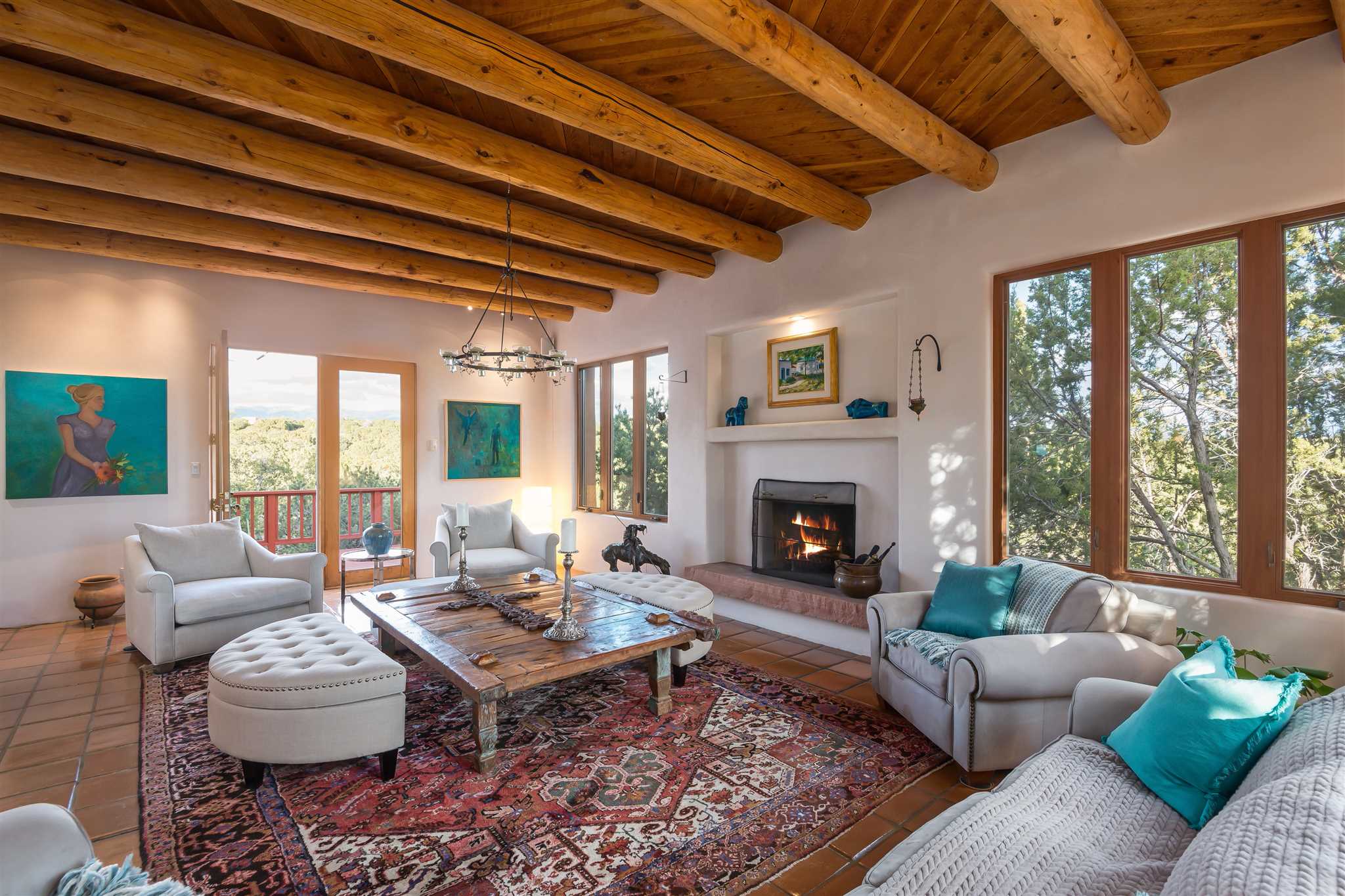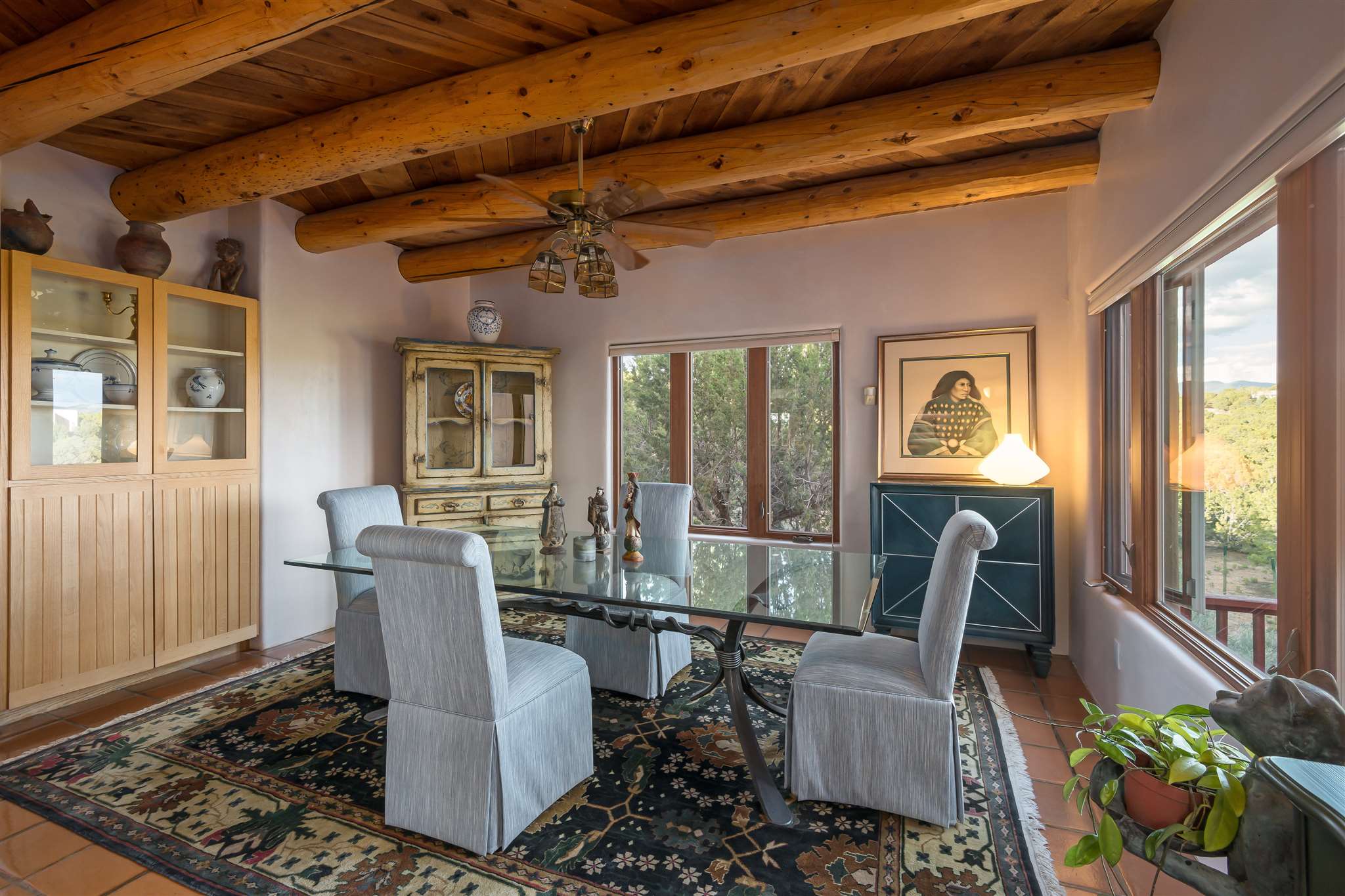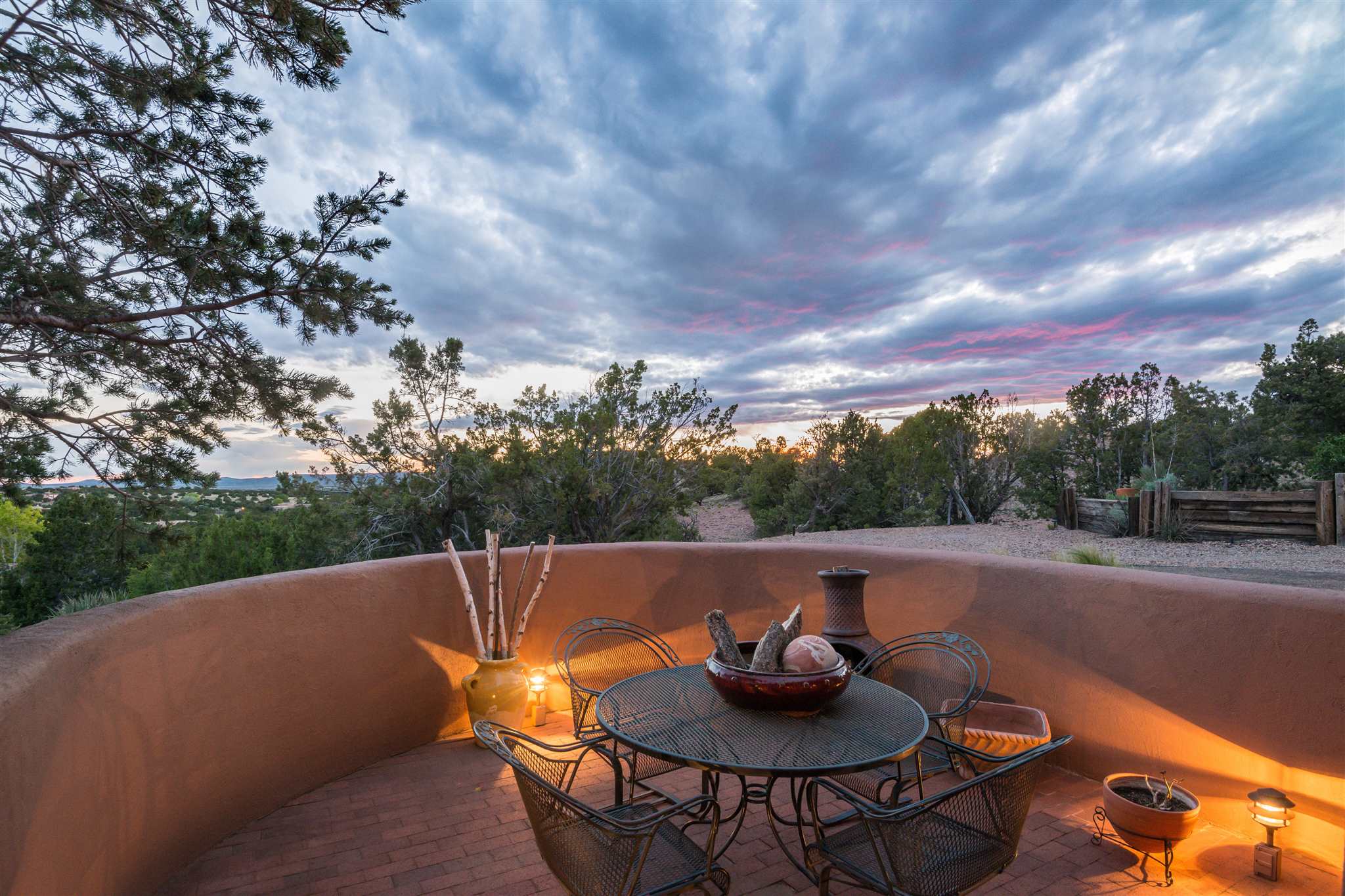 A beautiful perfectly sited custom built home in the Gated Community of Salva Tierra; only 15 minutes to Santa Fe and an easy commute to Los Alamos. The 3,346 sq. ft. updated home on an elevated 1.5 -Acre lot, has Spectacular Mountain and big sky views from most every window and outdoor portals/decks. Enter through the front door to an elegant open floor plan, to the right a large living room, with wood burning fireplace, lots of room for art and French doors opening out to a back deck. To your left a Chef's Kitchen, with marble countertops, custom appliances, breakfast bar, and cabinets galore. The adjoining casual dining space has a sliding glass door out to a private walled front portal. Just off the front entry and kitchen is a beautiful formal dining room. A wide hallway leads to a powder room, garage door entry, two guest rooms, laundry room, full hall bath, office/bedroom with a private entrance and a grand master-suite. This expansive inviting suite has a wood burning kiva, luxurious bathroom, with walk-in shower and wonderful soaking tub. Another mountain range viewing deck just off the master, a good-sized fenced side yard, with water feature, mature trees, plants and thoughtful landscaping completes this great home. Ready for lots of entertaining! There are a few interior steps, floor plan in documents.