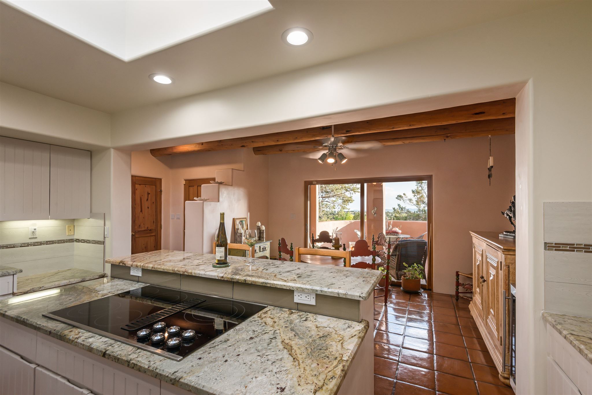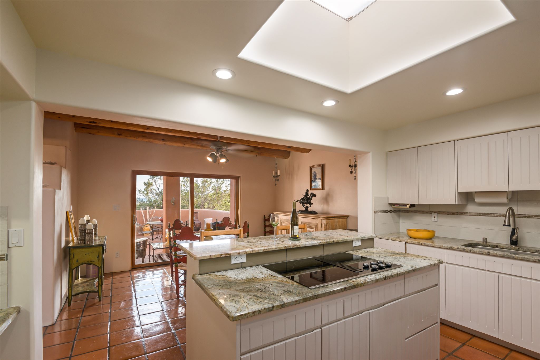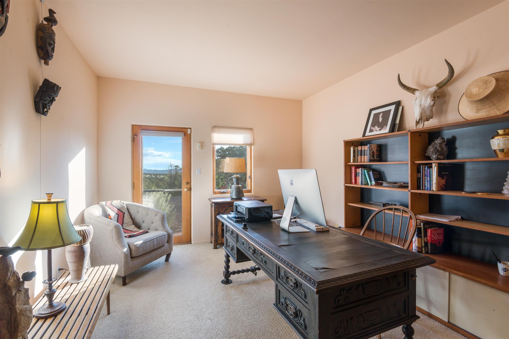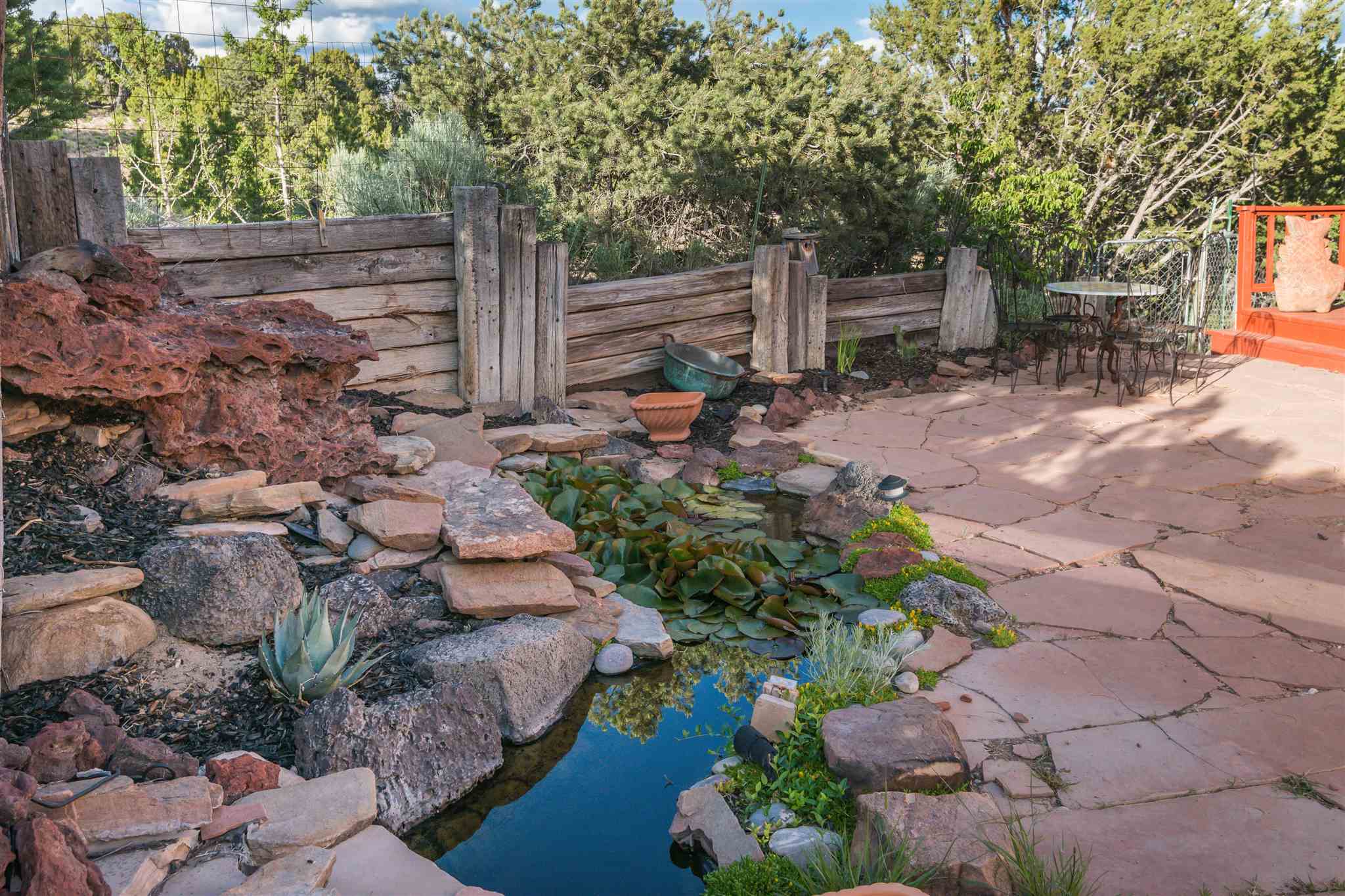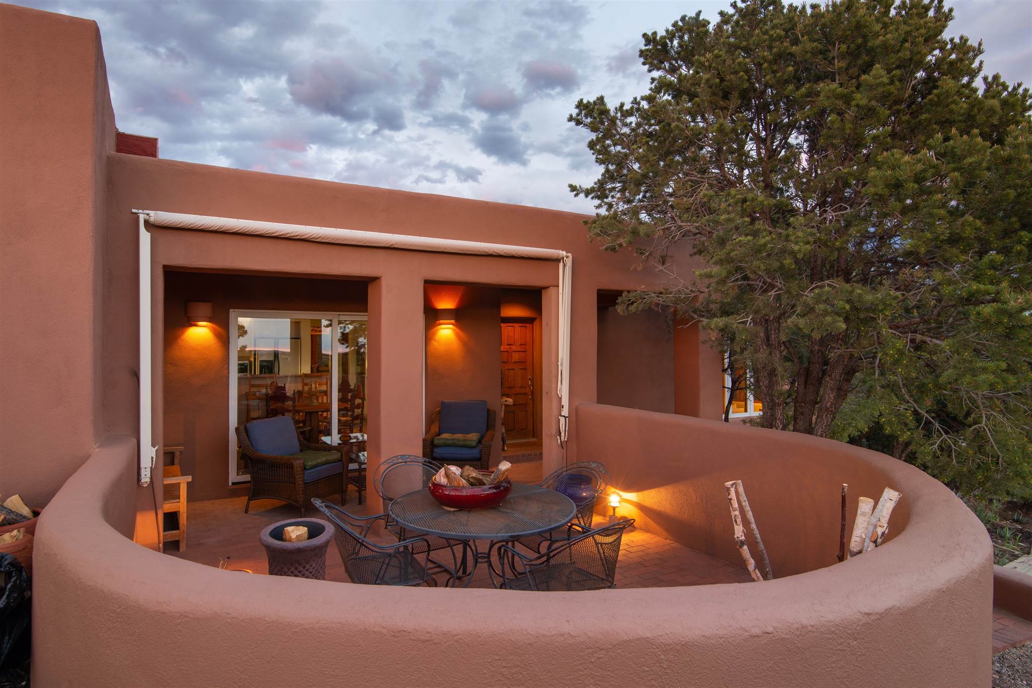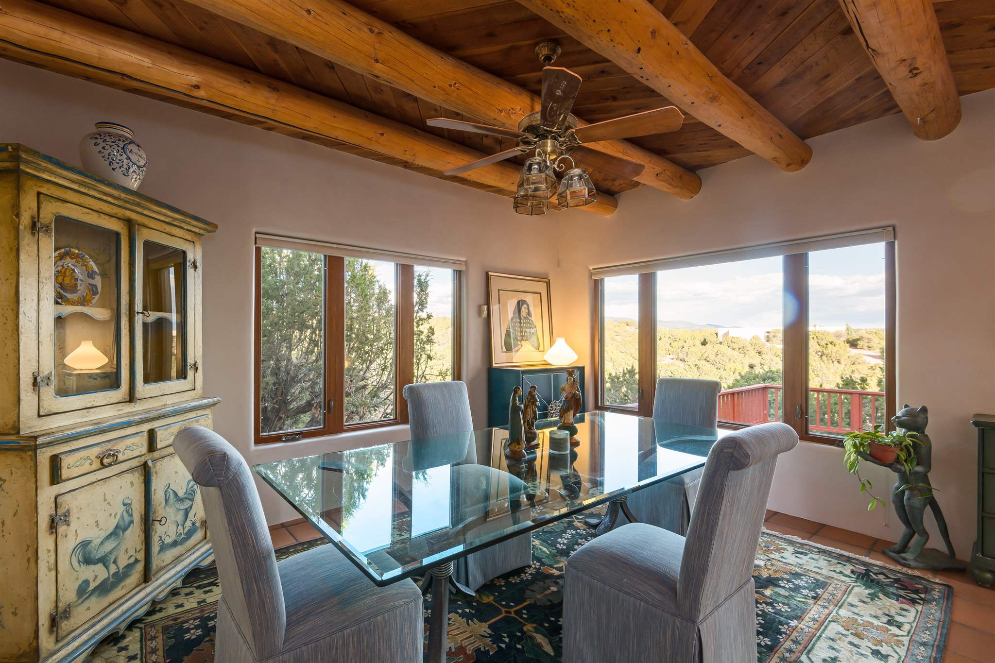 A beautiful perfectly sited custom built home in the Gated Community of Salva Tierra; only 15 minutes to Santa Fe and an easy commute to Los Alamos. The 3,346 sq. ft. updated home on an elevated 1.5 -Acre lot, has Spectacular Mountain and big sky views from most every window and outdoor portals/decks. Enter through the front door to an elegant open floor plan, to the right a large living room, with wood burning fireplace, lots of room for art and French doors opening out to a back deck. To your left a Chef's Kitchen, with marble countertops, custom appliances, breakfast bar, and cabinets galore. The adjoining casual dining space has a sliding glass door out to a private walled front portal. Just off the front entry and kitchen is a beautiful formal dining room. A wide hallway leads to a powder room, garage door entry, two guest rooms, laundry room, full hall bath, office/bedroom with a private entrance and a grand master-suite. This expansive inviting suite has a wood burning kiva, luxurious bathroom, with walk-in shower and wonderful soaking tub. Another mountain range viewing deck just off the master, a good-sized fenced side yard, with water feature, mature trees, plants and thoughtful landscaping completes this great home. Ready for lots of entertaining! There are a few interior steps, floor plan in documents.