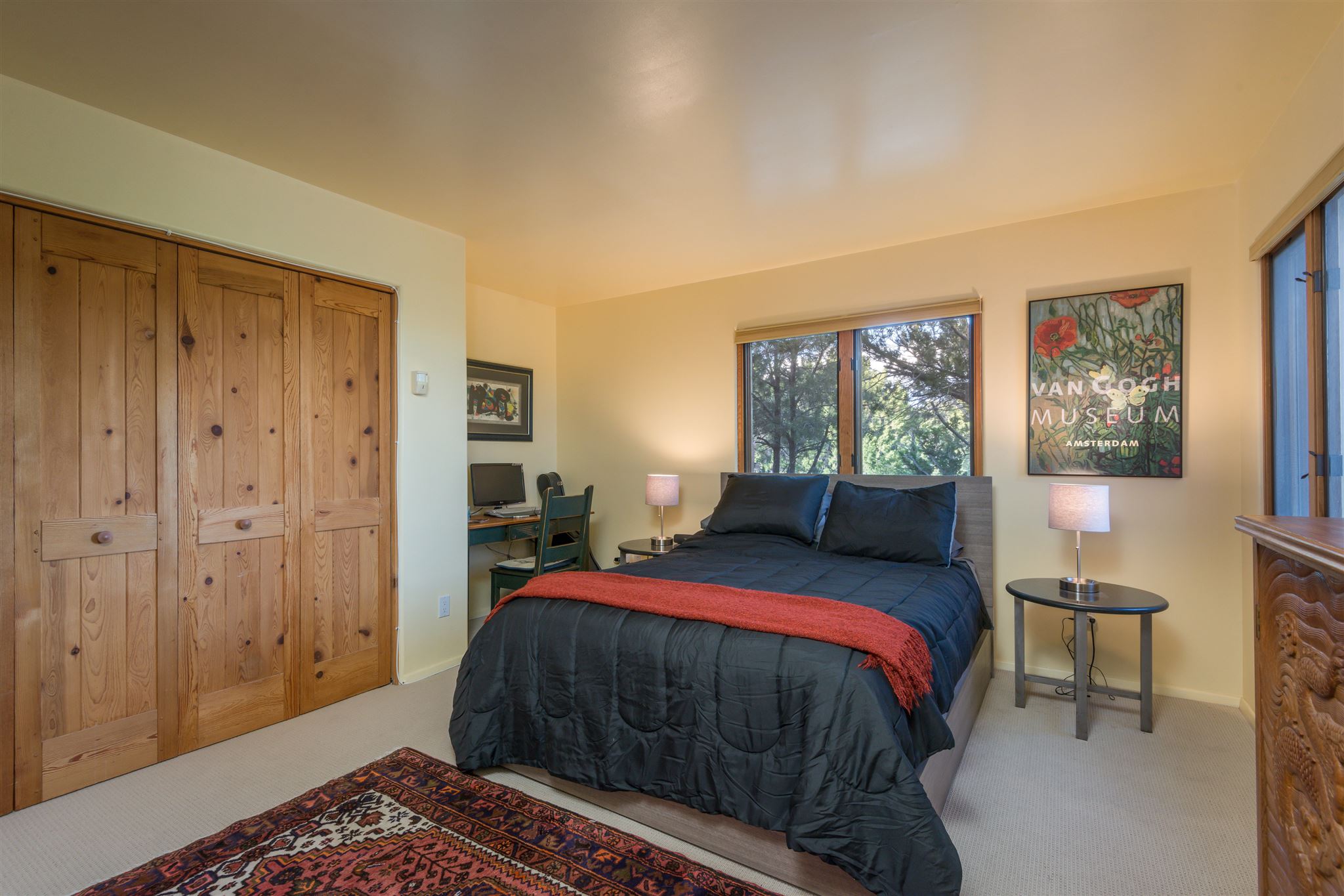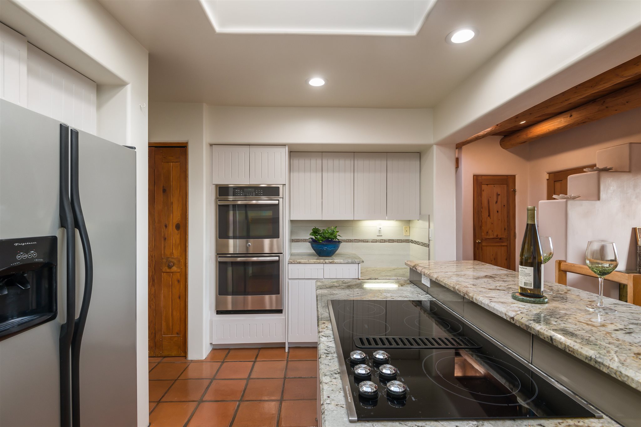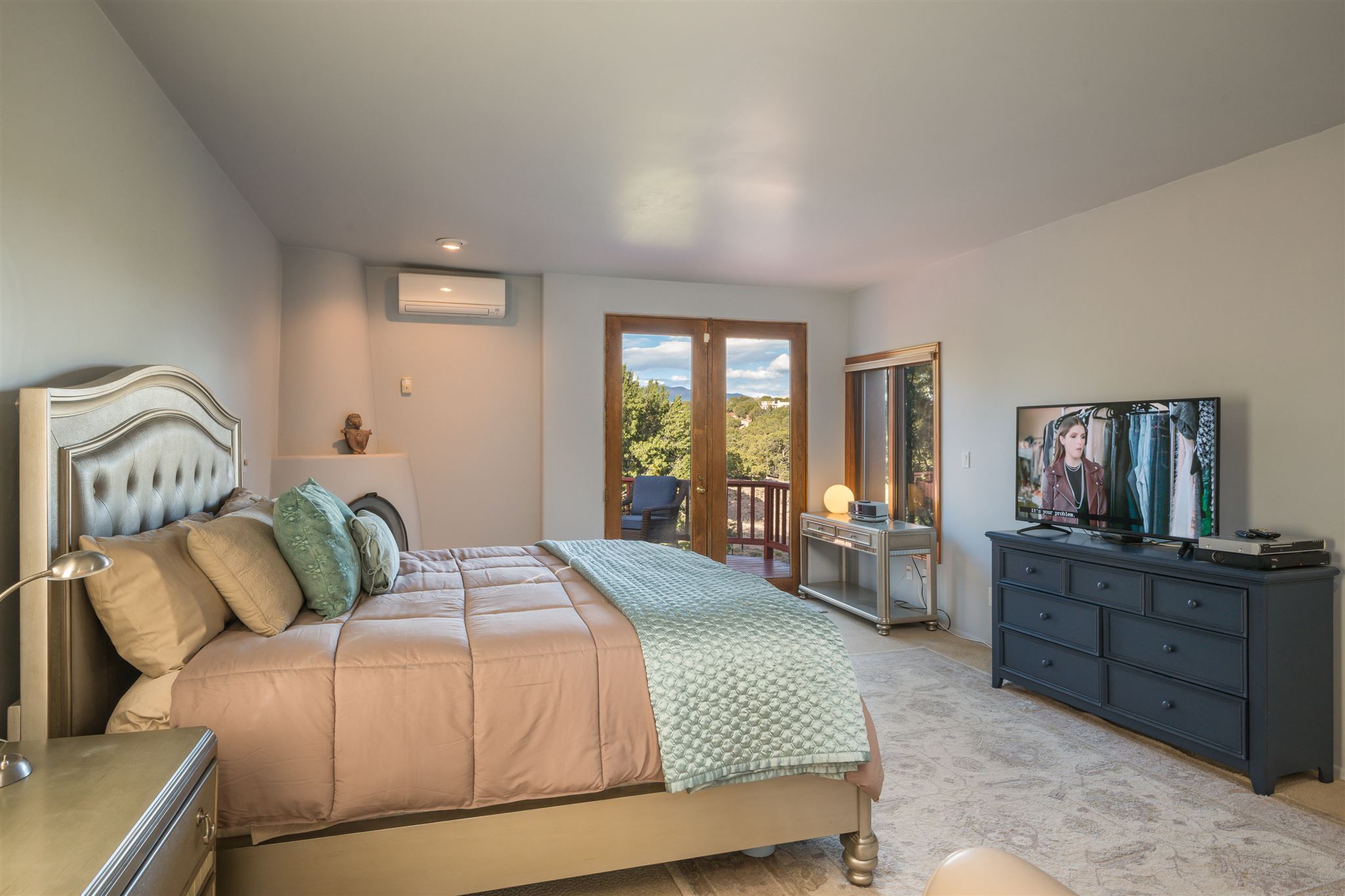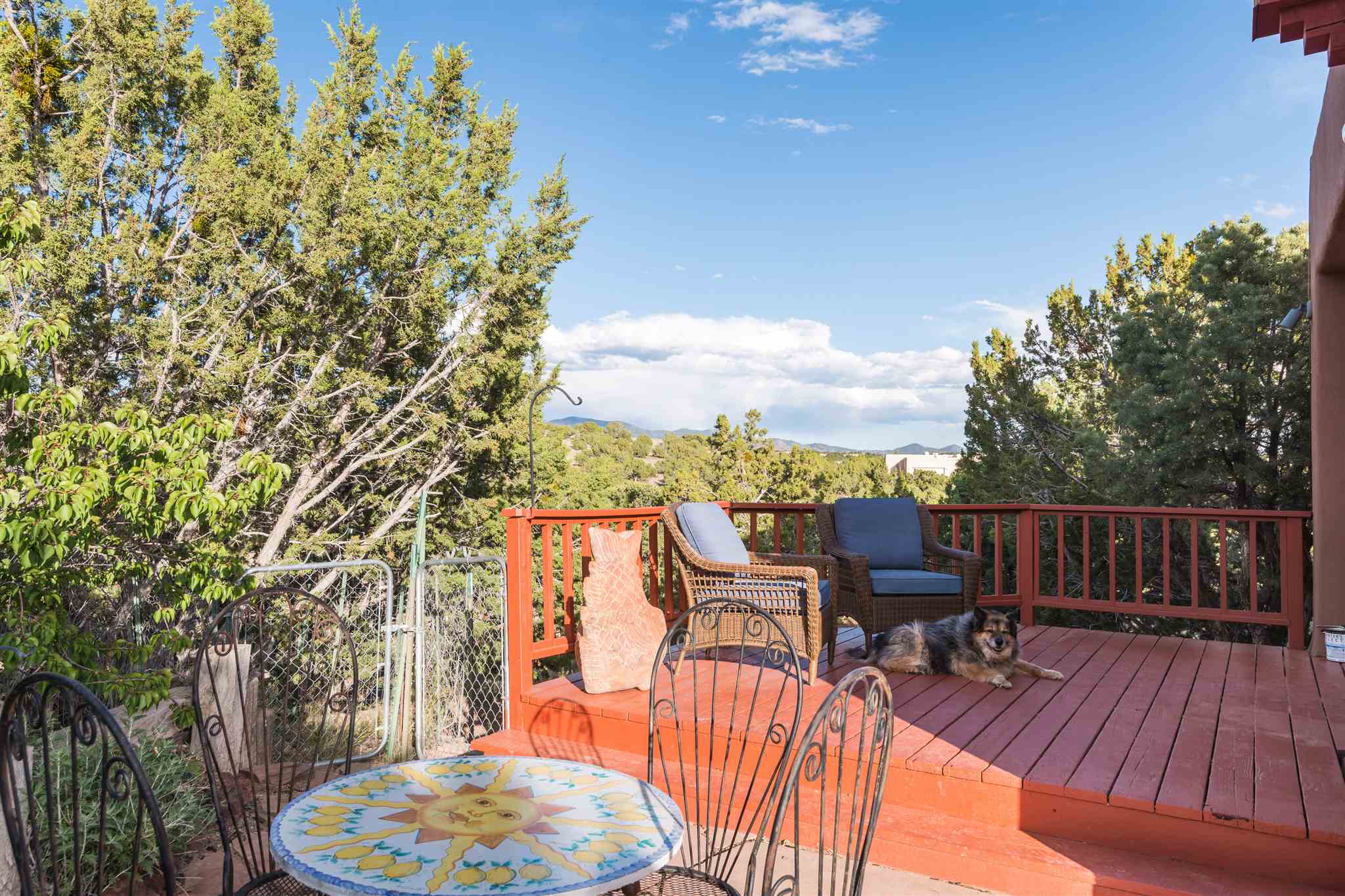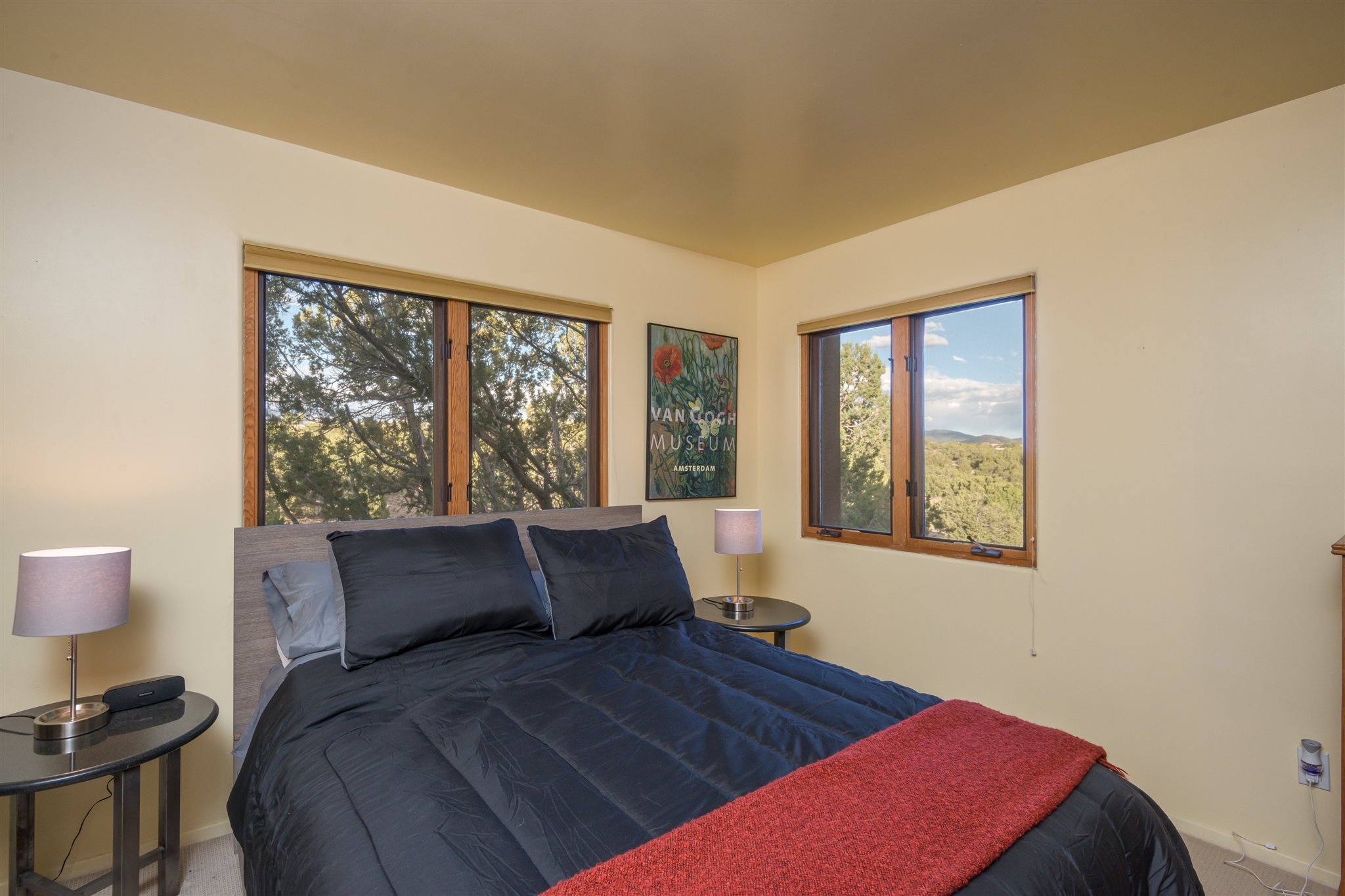 A beautiful perfectly sited custom built home in the Gated Community of Salva Tierra; only 15 minutes to Santa Fe and an easy commute to Los Alamos. The 3,346 sq. ft. updated home on an elevated 1.5 -Acre lot, has Spectacular Mountain and big sky views from most every window and outdoor portals/decks. Enter through the front door to an elegant open floor plan, to the right a large living room, with wood burning fireplace, lots of room for art and French doors opening out to a back deck. To your left a Chef's Kitchen, with marble countertops, custom appliances, breakfast bar, and cabinets galore. The adjoining casual dining space has a sliding glass door out to a private walled front portal. Just off the front entry and kitchen is a beautiful formal dining room. A wide hallway leads to a powder room, garage door entry, two guest rooms, laundry room, full hall bath, office/bedroom with a private entrance and a grand master-suite. This expansive inviting suite has a wood burning kiva, luxurious bathroom, with walk-in shower and wonderful soaking tub. Another mountain range viewing deck just off the master, a good-sized fenced side yard, with water feature, mature trees, plants and thoughtful landscaping completes this great home. Ready for lots of entertaining! There are a few interior steps, floor plan in documents.