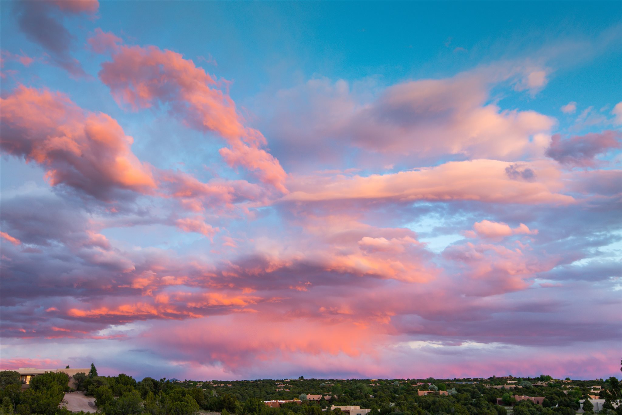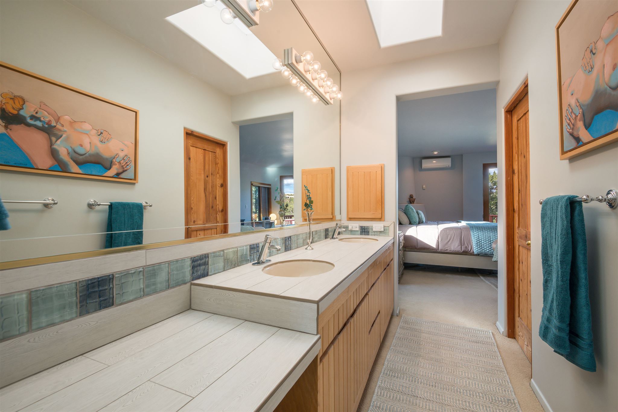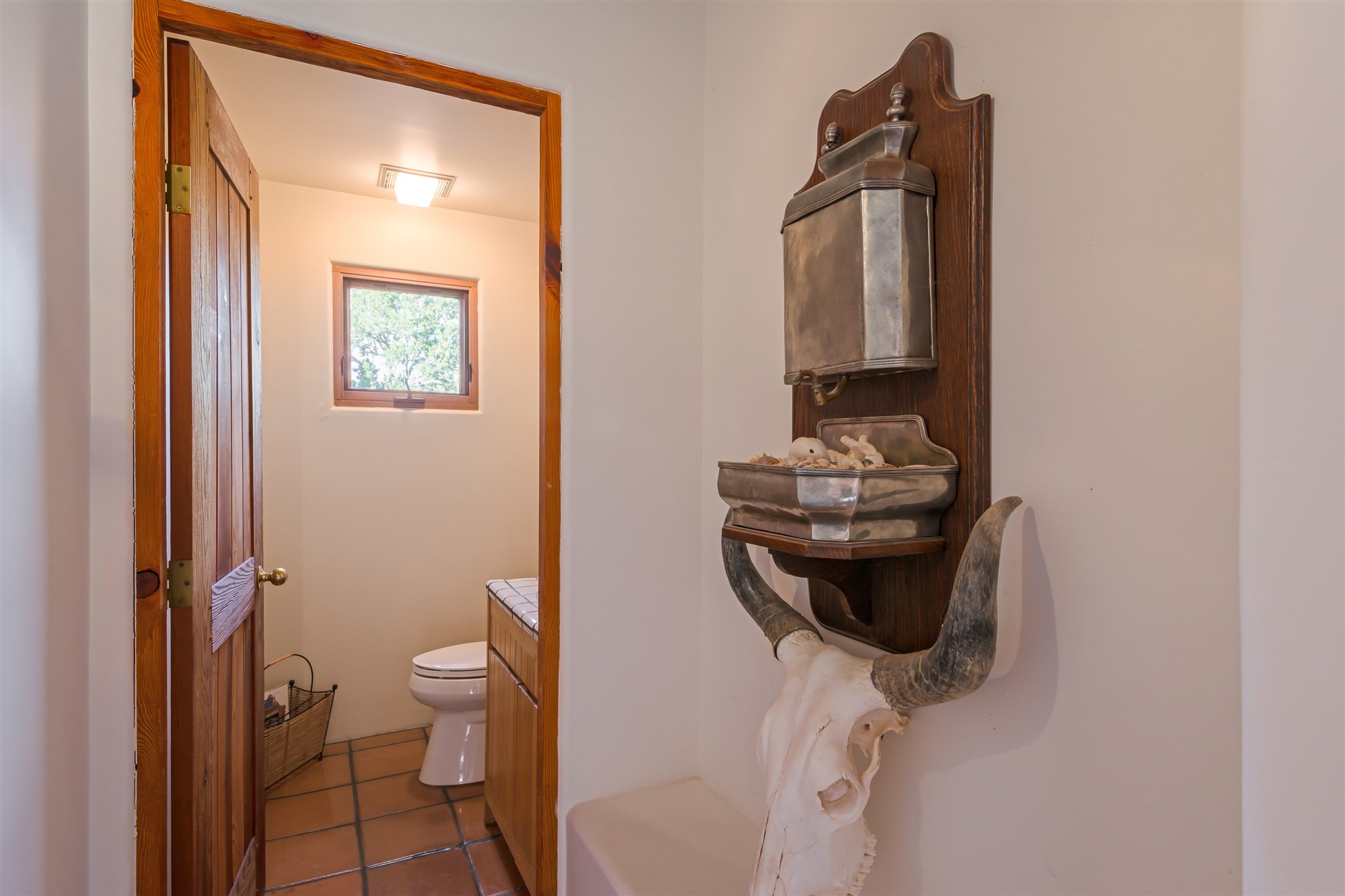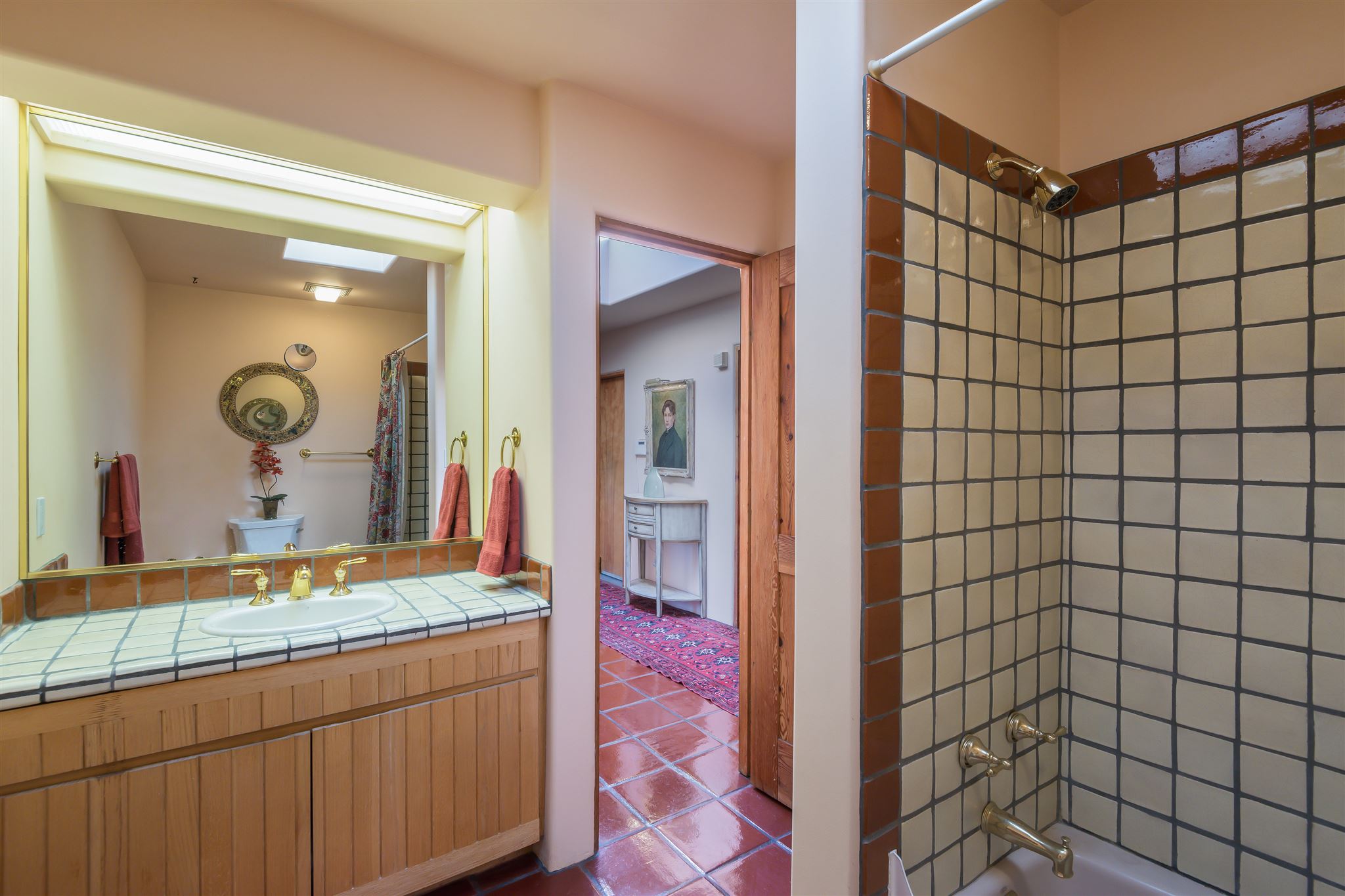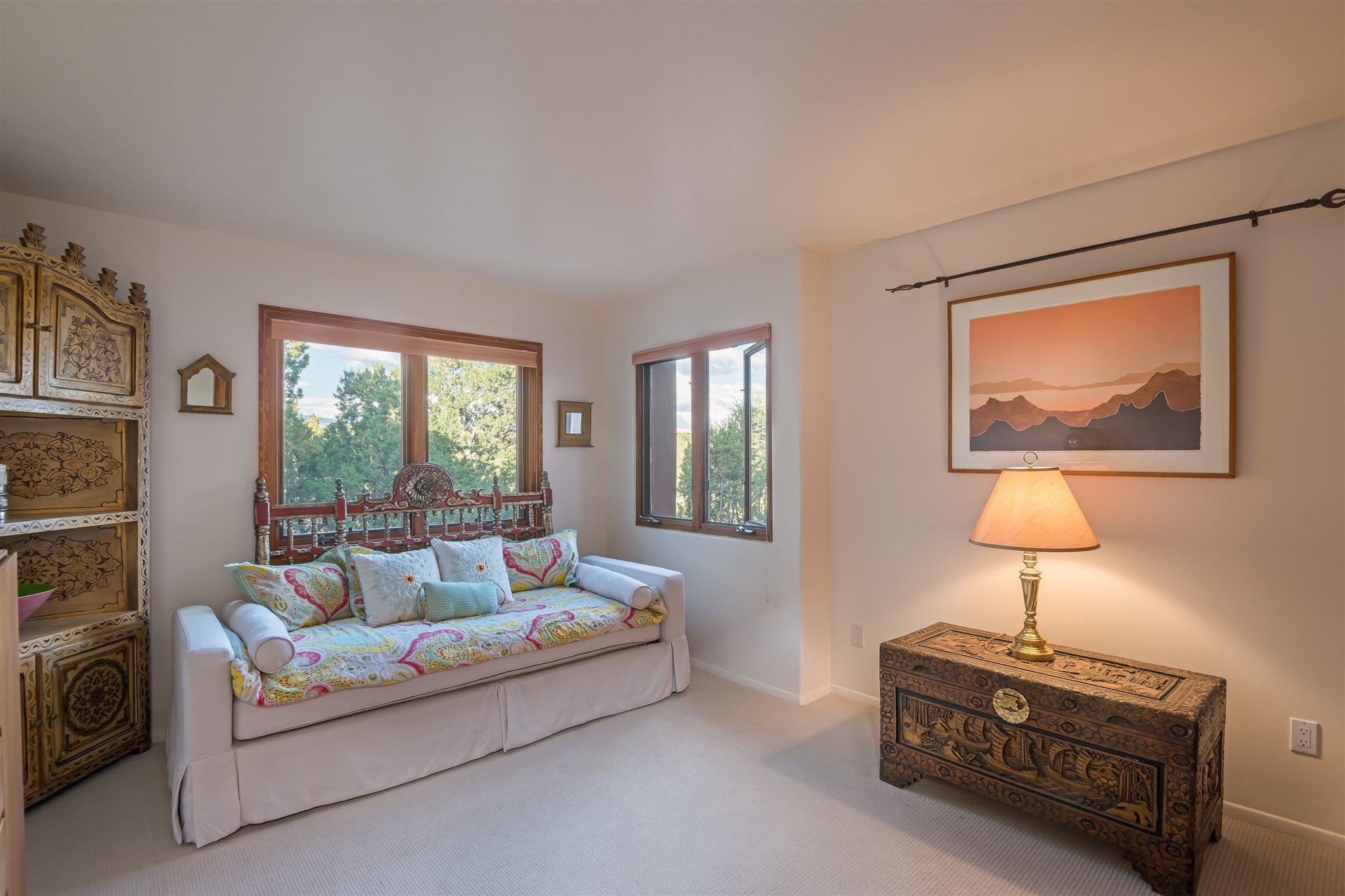 A beautiful perfectly sited custom built home in the Gated Community of Salva Tierra; only 15 minutes to Santa Fe and an easy commute to Los Alamos. The 3,346 sq. ft. updated home on an elevated 1.5 -Acre lot, has Spectacular Mountain and big sky views from most every window and outdoor portals/decks. Enter through the front door to an elegant open floor plan, to the right a large living room, with wood burning fireplace, lots of room for art and French doors opening out to a back deck. To your left a Chef's Kitchen, with marble countertops, custom appliances, breakfast bar, and cabinets galore. The adjoining casual dining space has a sliding glass door out to a private walled front portal. Just off the front entry and kitchen is a beautiful formal dining room. A wide hallway leads to a powder room, garage door entry, two guest rooms, laundry room, full hall bath, office/bedroom with a private entrance and a grand master-suite. This expansive inviting suite has a wood burning kiva, luxurious bathroom, with walk-in shower and wonderful soaking tub. Another mountain range viewing deck just off the master, a good-sized fenced side yard, with water feature, mature trees, plants and thoughtful landscaping completes this great home. Ready for lots of entertaining! There are a few interior steps, floor plan in documents.