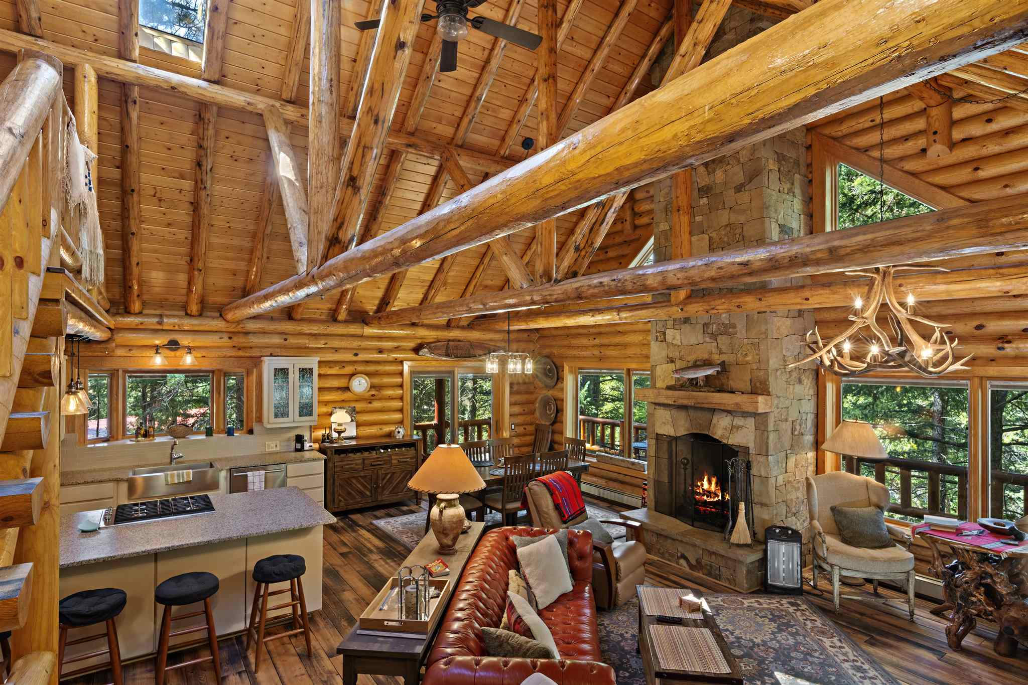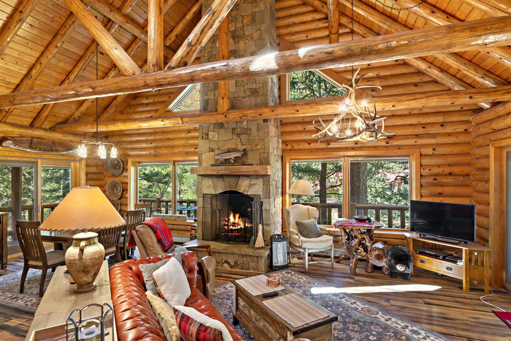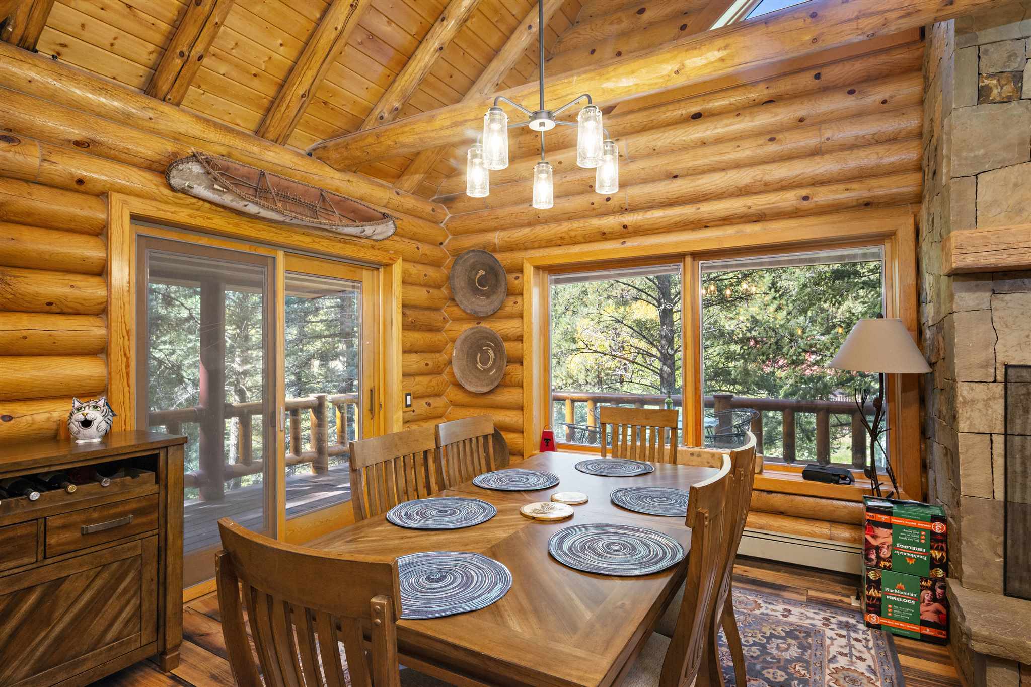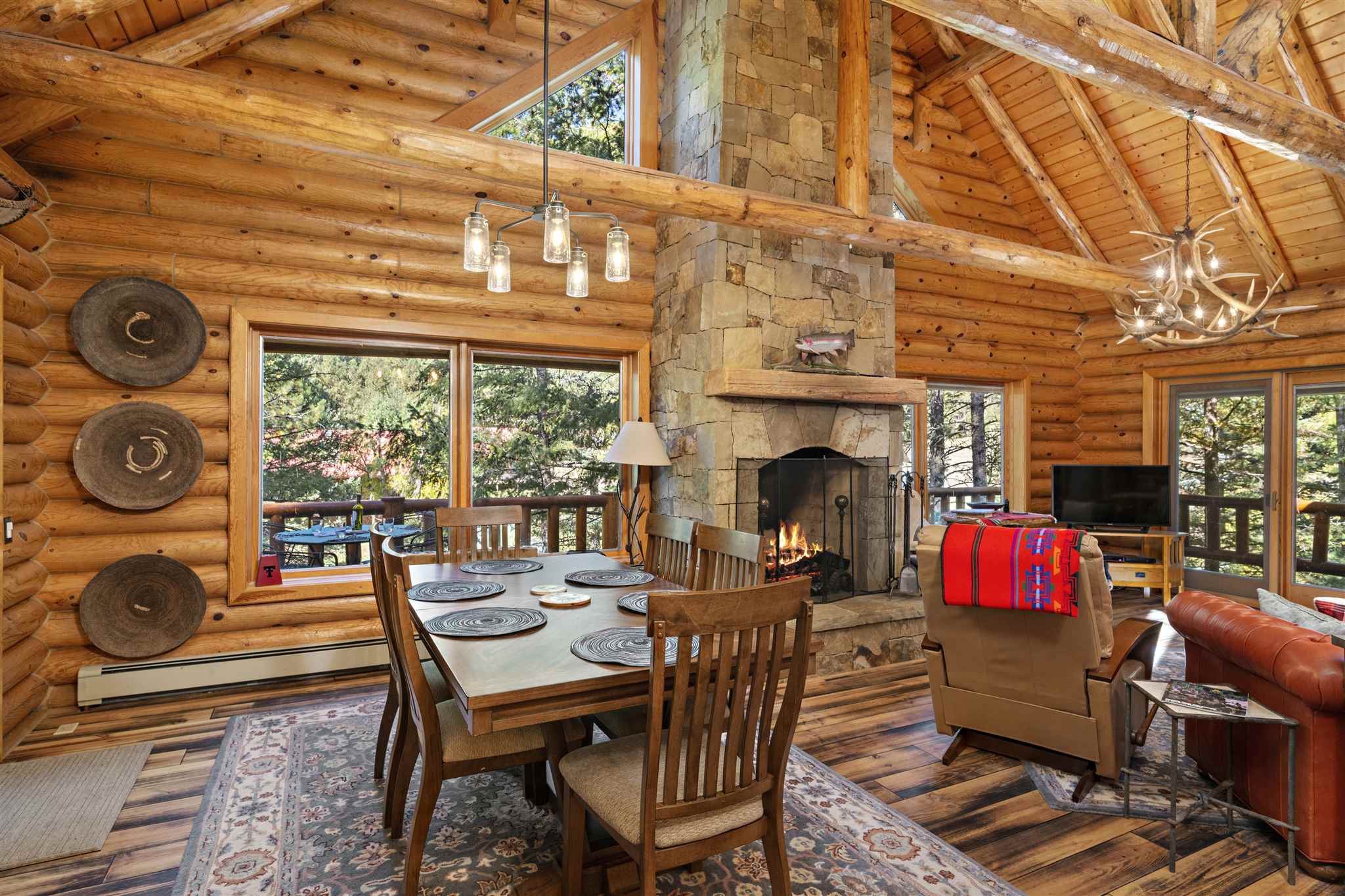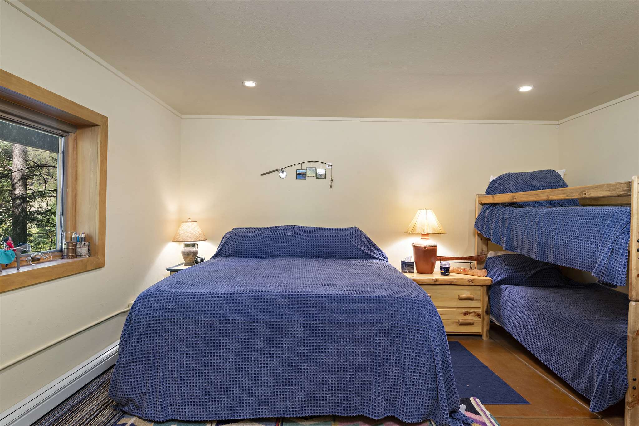 Rare offering of one of the most privately sited cabins in Tres and close proximity to the Santa Fe National Forest. This beautiful log cabin is perched above the river and tucked into the towering pines. Enjoy the sounds and sights of the mountains from within or from the covered and open wraparound deck. The main level features open concept dining, living and kitchen with a stone faced, wood-burning fireplace, spacious guest bedroom and three quarter bathroom. Upstairs is reserved for the master suite with a luxurious master bathroom and two small balconies to enjoy the crisp mountain air. The lower level, walk out basement features a bunk bedroom with a full bathroom, plus a fly fishing staging area, perfect for putting on waders and heading out to fish! Tres Lagunas offers excellent fly fishing access to owners and their guests, over one third of a mile of the Pecos River, 3 stocked ponds, on-site caretakers, all make for a wonderful retreat less than an hour from Santa Fe.
