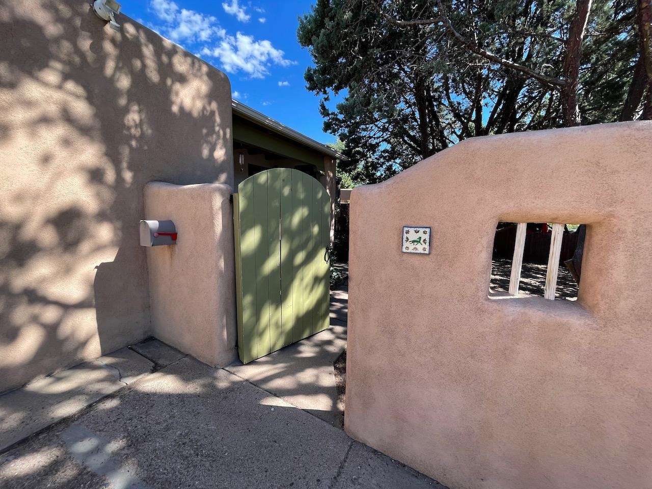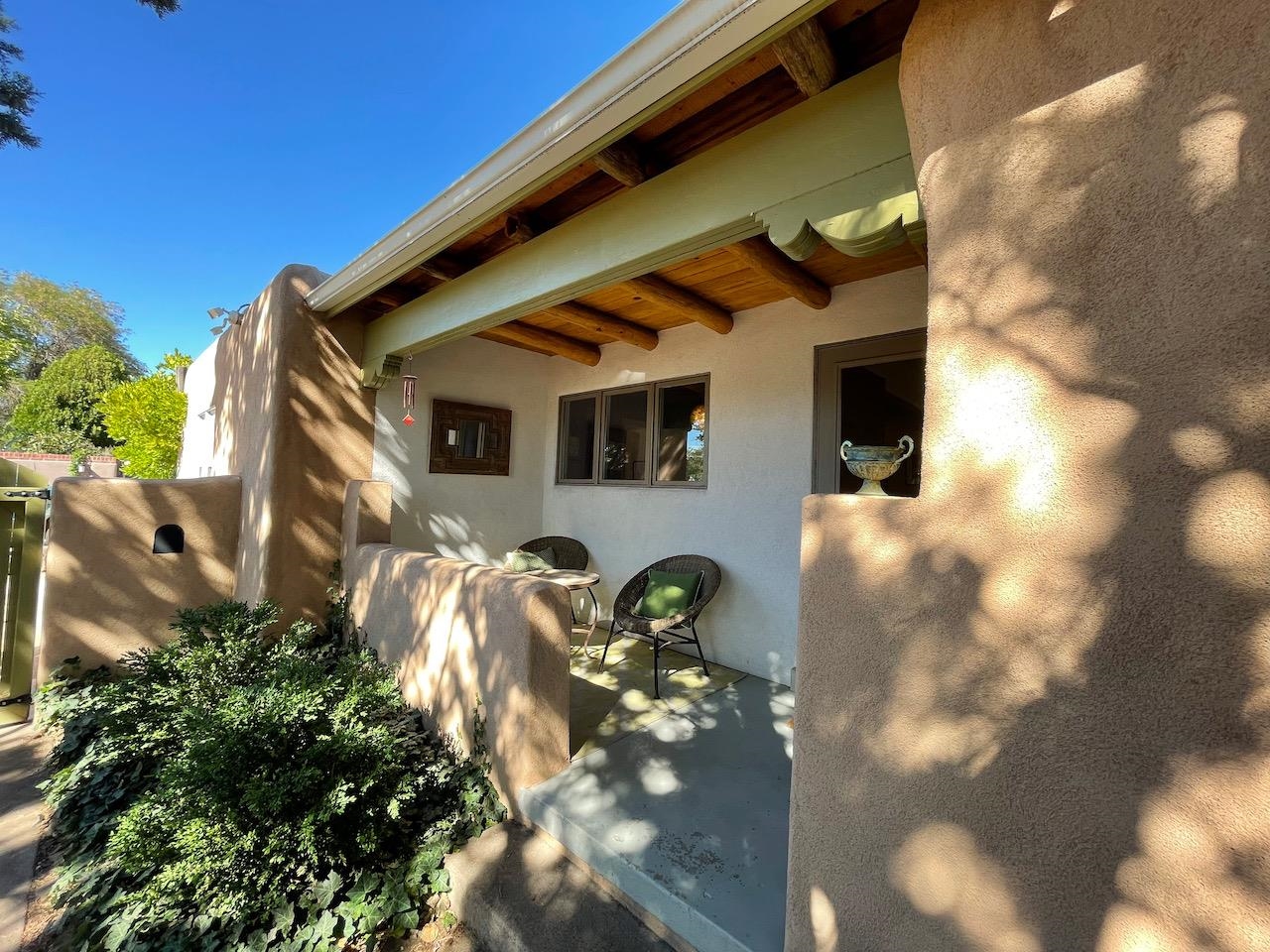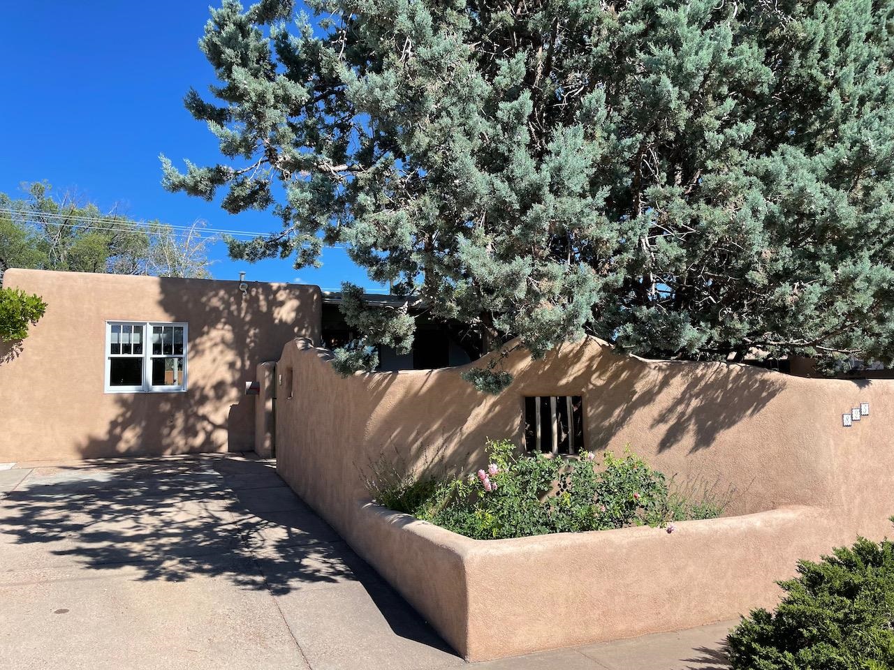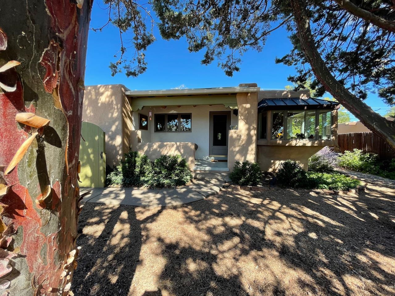 Five minutes to downtown, a few blocks from the dog park, and a short walk to the amenities of the Solana Center, this charming Stamm house has been lovingly cared for and updated. Enter the walled property through a side gate into a shaded enclave with two enormous Arizona cypress trees. The front porch is a cool and inviting spot for coffee. Within the open floor plan house are classic Stamm features, including gleaming wood floors, a corner kiva fireplace, and easy, practical flow from room to room. Enjoy the leafy view from the living room's bay window. Upgrades include Pella windows throughout, a 2018 silicon roof (with warranty), a newer furnace, stucco within ten years, and built-in bookcases. The large, light-filled den includes a half-bath and a laundry/utility closet; it opens to the rear brick patio, shaded by a wisteria arbor. The entire property has been fully landscaped by the current owner, a Master Gardener, with a sensitive blend of plantings, including many native to our region, for four seasons of texture and beauty. The ventilated storage unit is well-camouflaged by trees. Spacious off-street parking for two vehicles.