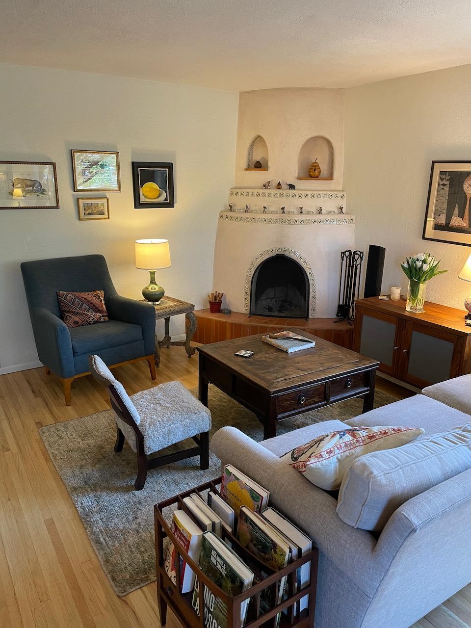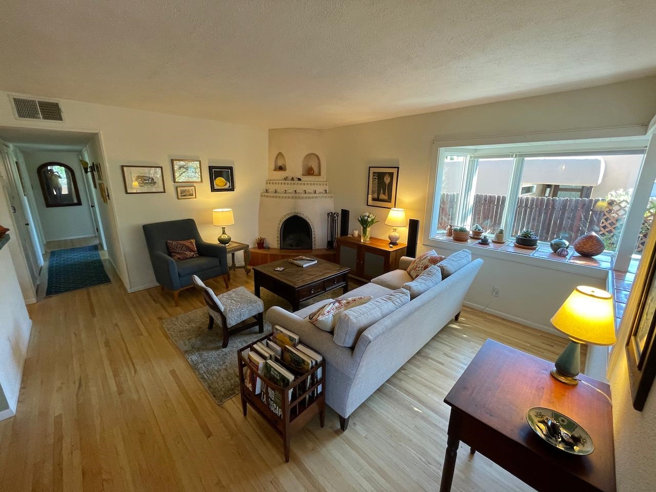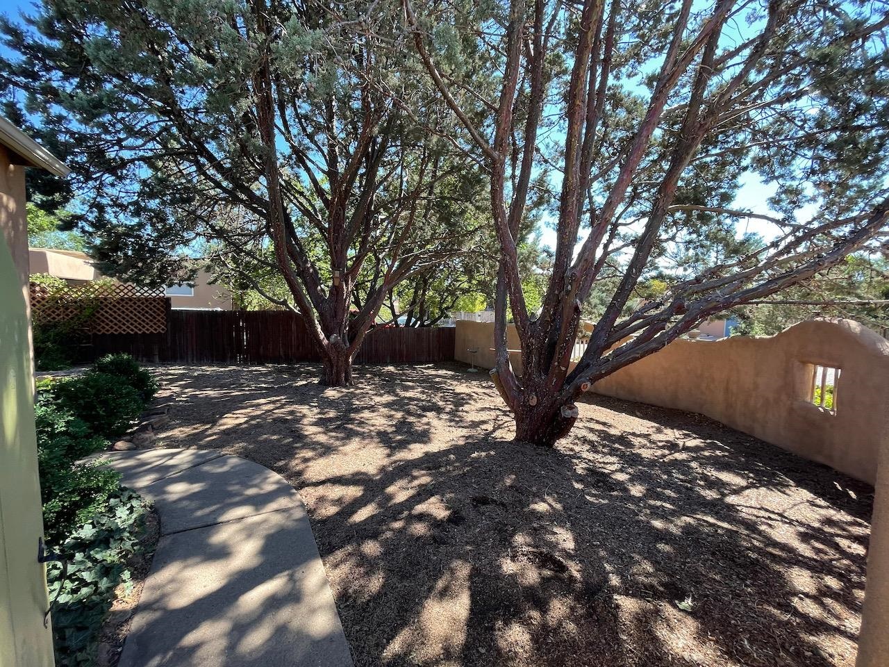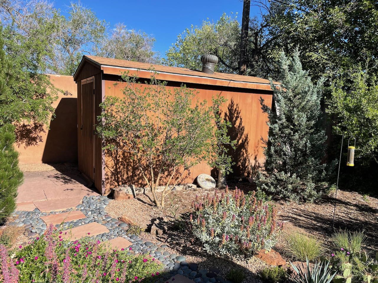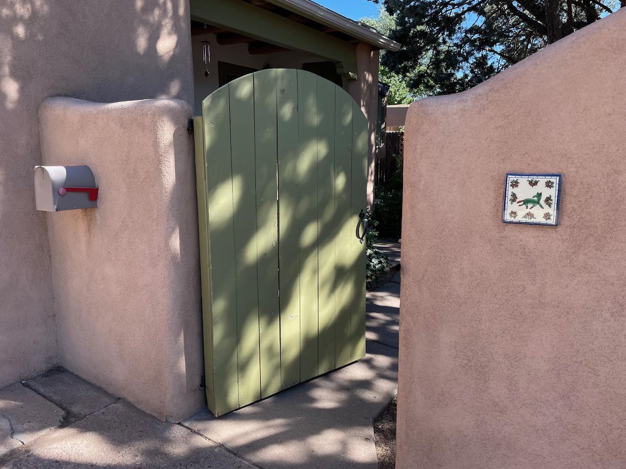 Five minutes to downtown, a few blocks from the dog park, and a short walk to the amenities of the Solana Center, this charming Stamm house has been lovingly cared for and updated. Enter the walled property through a side gate into a shaded enclave with two enormous Arizona cypress trees. The front porch is a cool and inviting spot for coffee. Within the open floor plan house are classic Stamm features, including gleaming wood floors, a corner kiva fireplace, and easy, practical flow from room to room. Enjoy the leafy view from the living room's bay window. Upgrades include Pella windows throughout, a 2018 silicon roof (with warranty), a newer furnace, stucco within ten years, and built-in bookcases. The large, light-filled den includes a half-bath and a laundry/utility closet; it opens to the rear brick patio, shaded by a wisteria arbor. The entire property has been fully landscaped by the current owner, a Master Gardener, with a sensitive blend of plantings, including many native to our region, for four seasons of texture and beauty. The ventilated storage unit is well-camouflaged by trees. Spacious off-street parking for two vehicles.