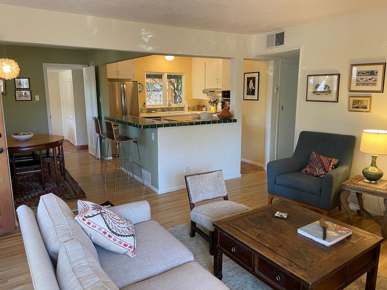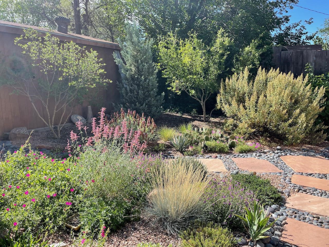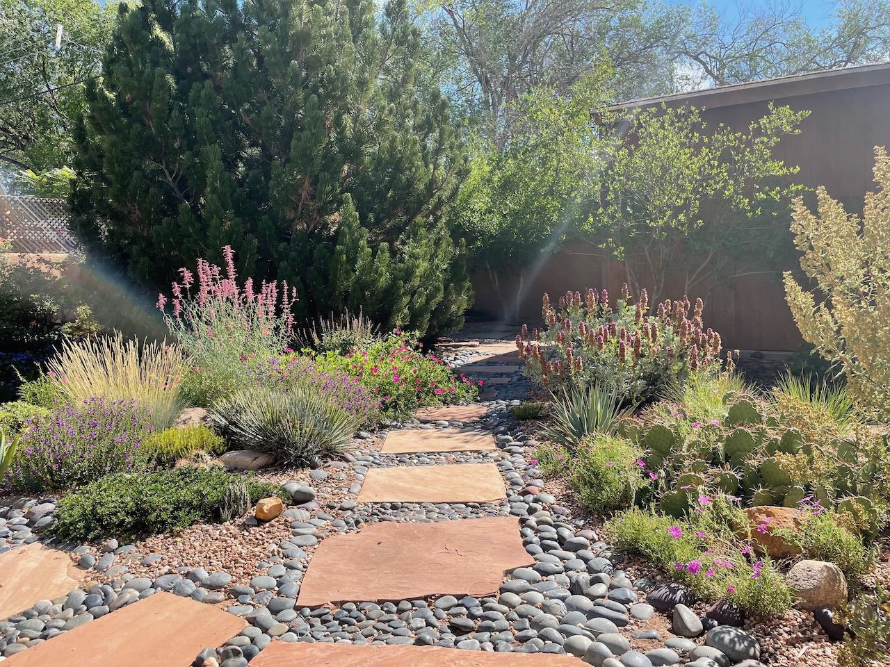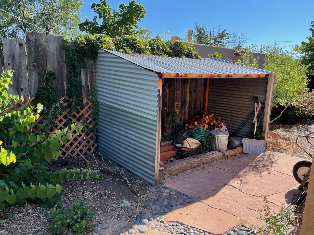 Five minutes to downtown, a few blocks from the dog park, and a short walk to the amenities of the Solana Center, this charming Stamm house has been lovingly cared for and updated. Enter the walled property through a side gate into a shaded enclave with two enormous Arizona cypress trees. The front porch is a cool and inviting spot for coffee. Within the open floor plan house are classic Stamm features, including gleaming wood floors, a corner kiva fireplace, and easy, practical flow from room to room. Enjoy the leafy view from the living room's bay window. Upgrades include Pella windows throughout, a 2018 silicon roof (with warranty), a newer furnace, stucco within ten years, and built-in bookcases. The large, light-filled den includes a half-bath and a laundry/utility closet; it opens to the rear brick patio, shaded by a wisteria arbor. The entire property has been fully landscaped by the current owner, a Master Gardener, with a sensitive blend of plantings, including many native to our region, for four seasons of texture and beauty. The ventilated storage unit is well-camouflaged by trees. Spacious off-street parking for two vehicles.