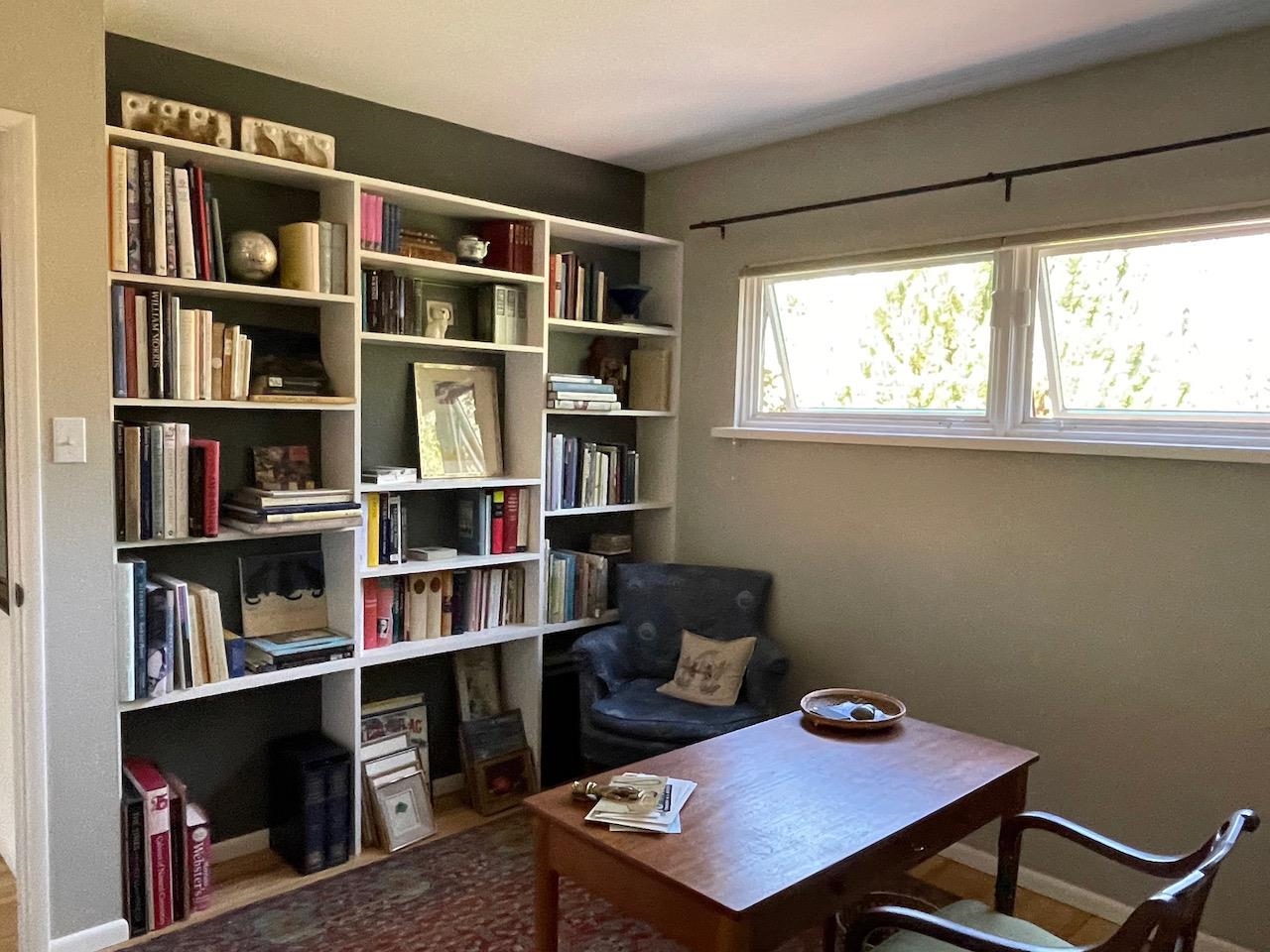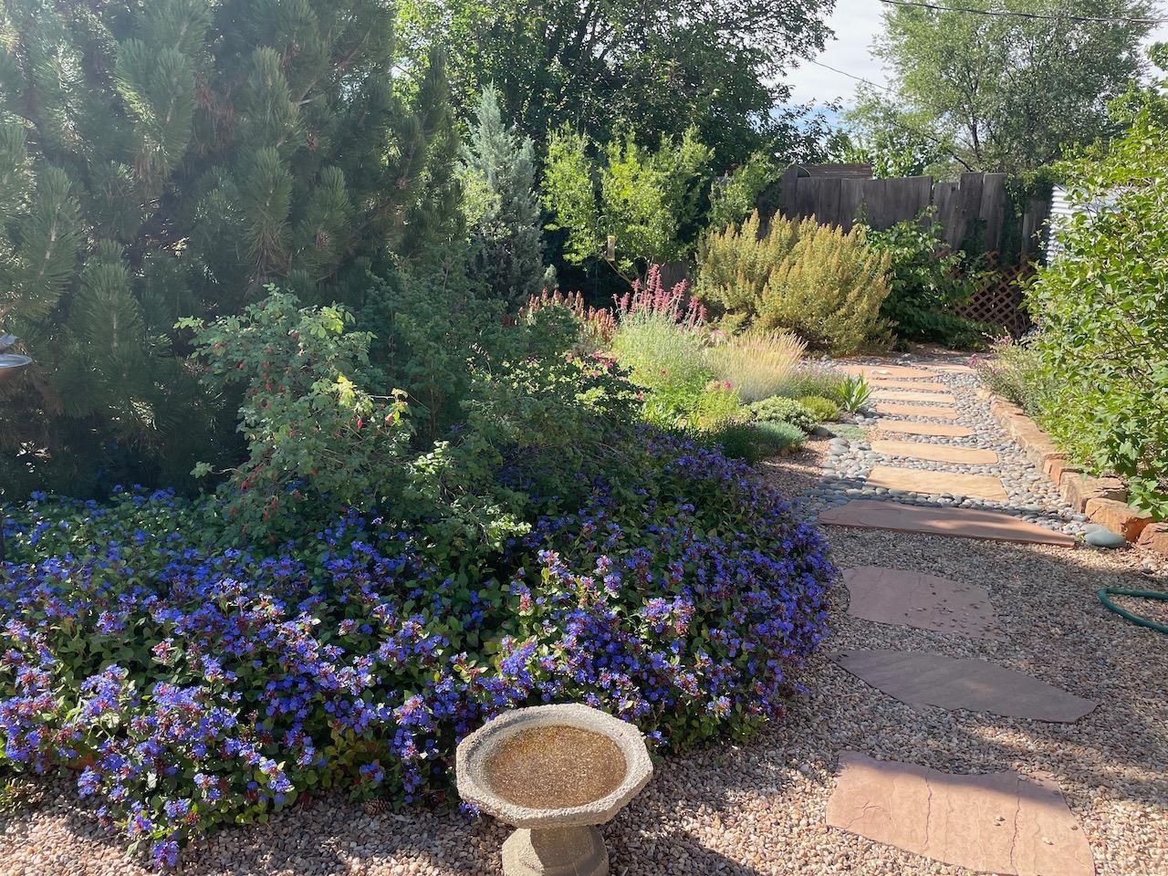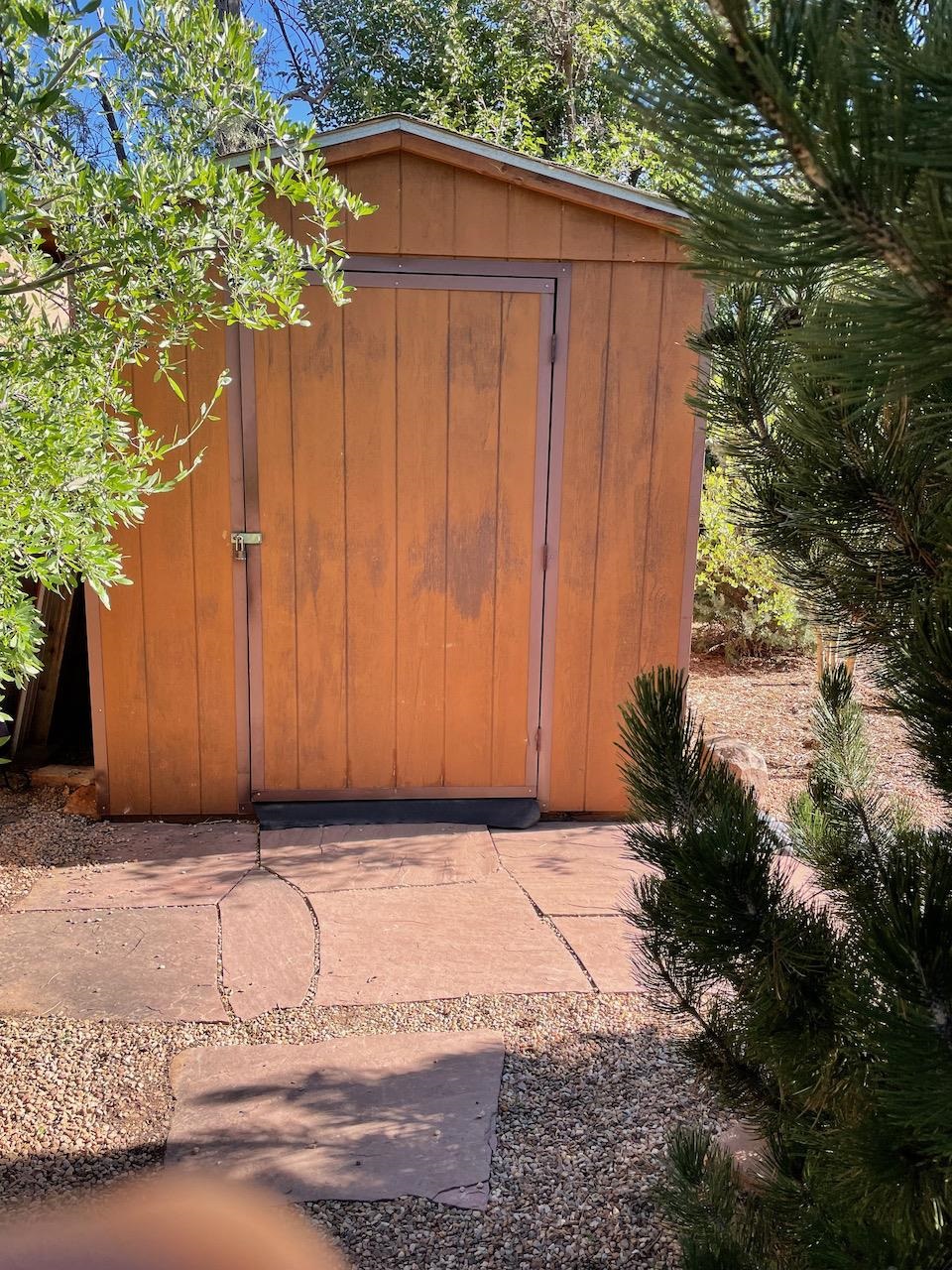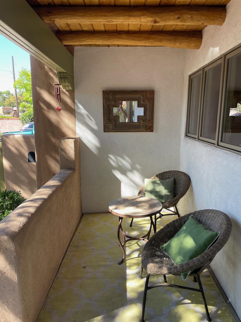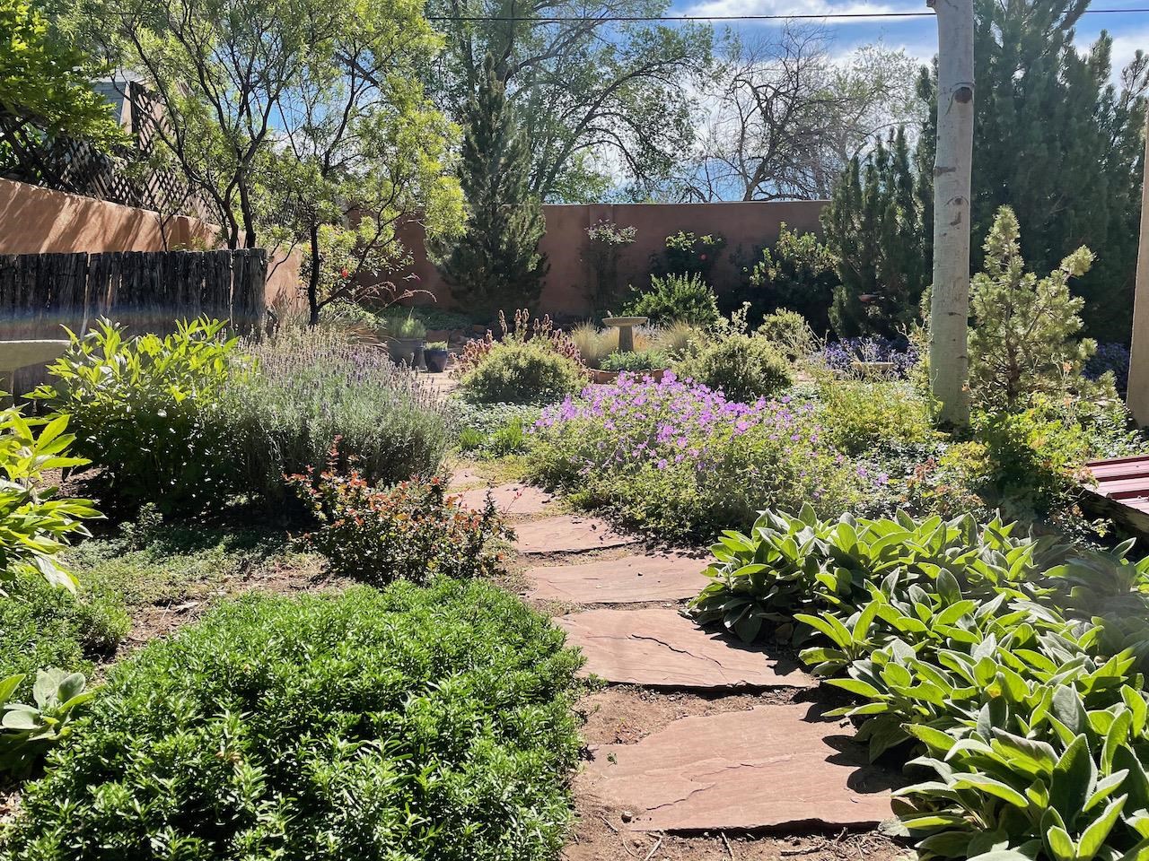 Five minutes to downtown, a few blocks from the dog park, and a short walk to the amenities of the Solana Center, this charming Stamm house has been lovingly cared for and updated. Enter the walled property through a side gate into a shaded enclave with two enormous Arizona cypress trees. The front porch is a cool and inviting spot for coffee. Within the open floor plan house are classic Stamm features, including gleaming wood floors, a corner kiva fireplace, and easy, practical flow from room to room. Enjoy the leafy view from the living room's bay window. Upgrades include Pella windows throughout, a 2018 silicon roof (with warranty), a newer furnace, stucco within ten years, and built-in bookcases. The large, light-filled den includes a half-bath and a laundry/utility closet; it opens to the rear brick patio, shaded by a wisteria arbor. The entire property has been fully landscaped by the current owner, a Master Gardener, with a sensitive blend of plantings, including many native to our region, for four seasons of texture and beauty. The ventilated storage unit is well-camouflaged by trees. Spacious off-street parking for two vehicles.