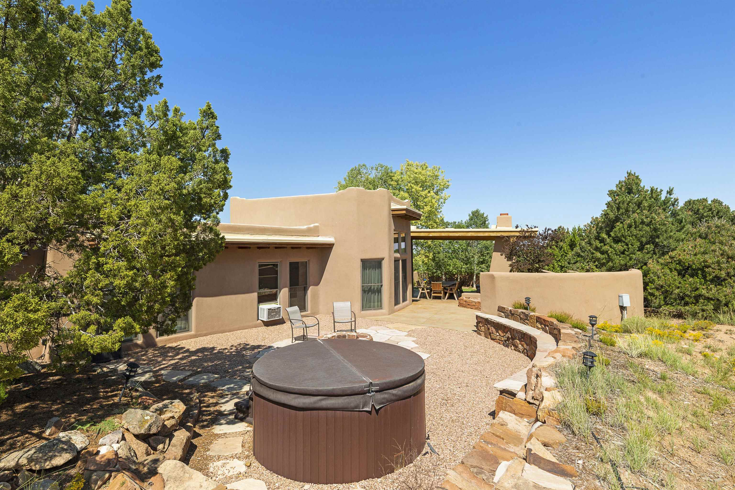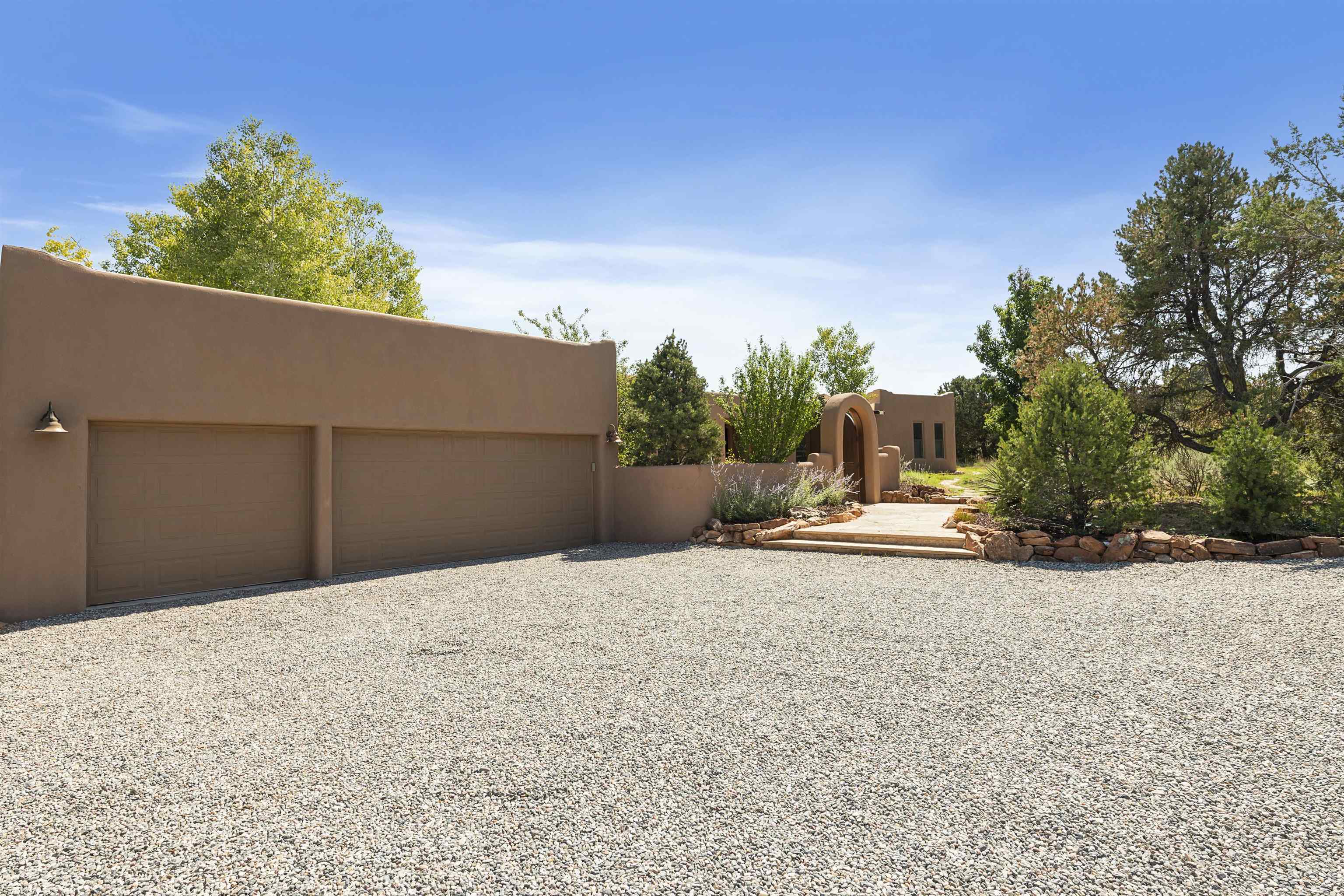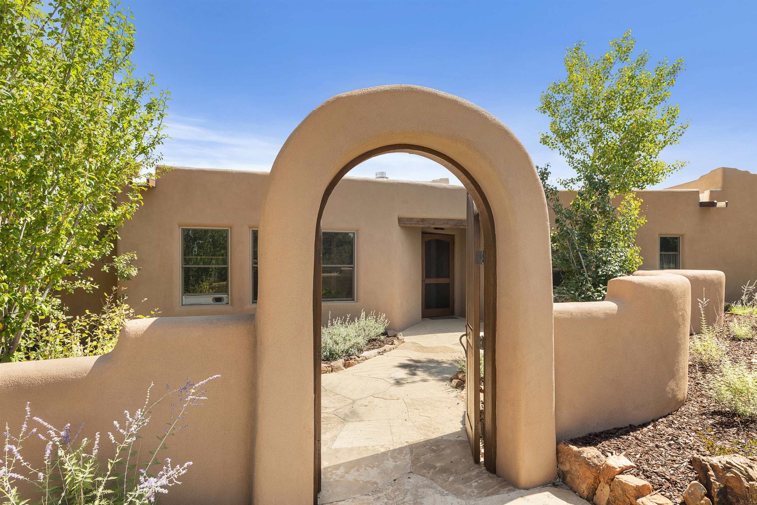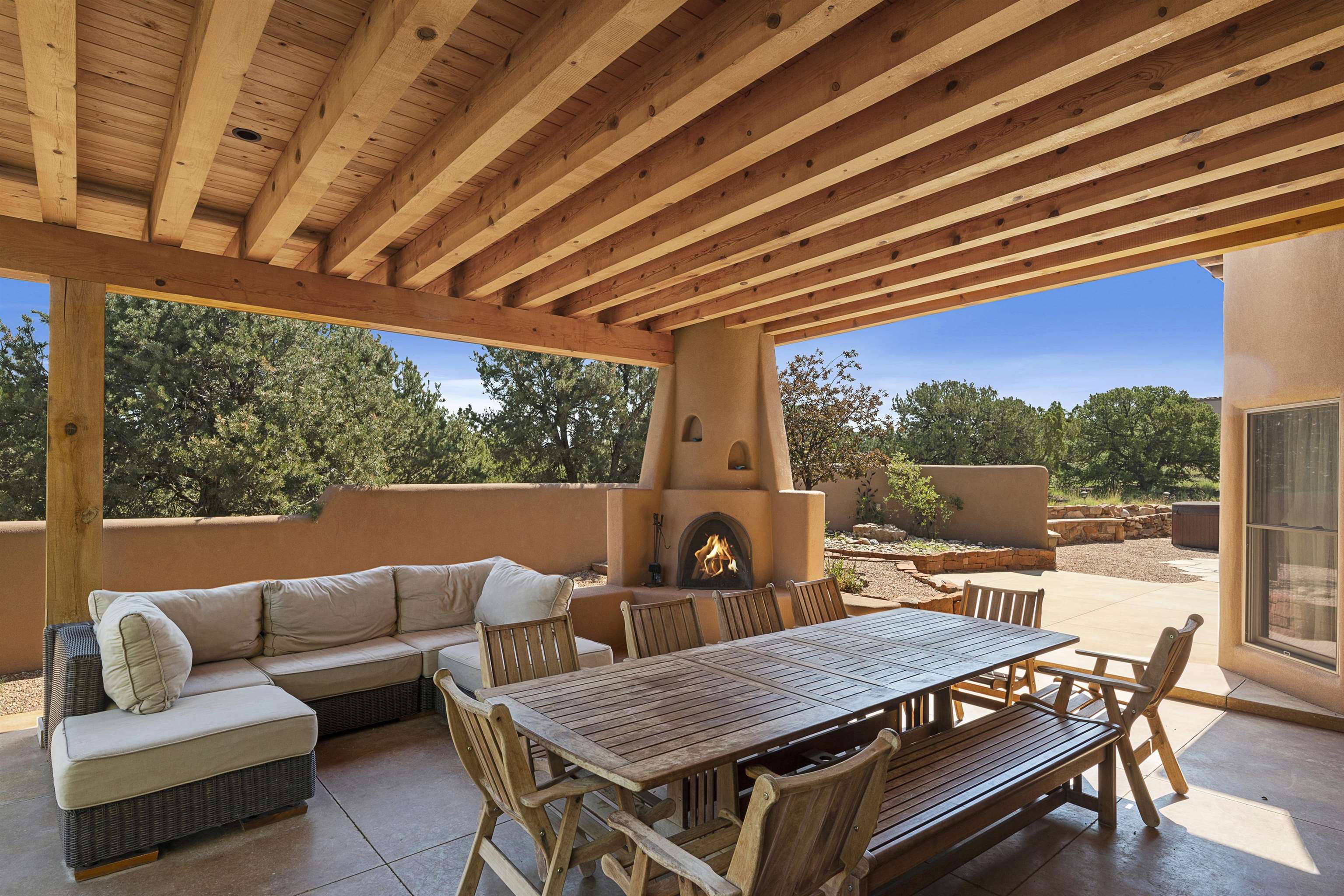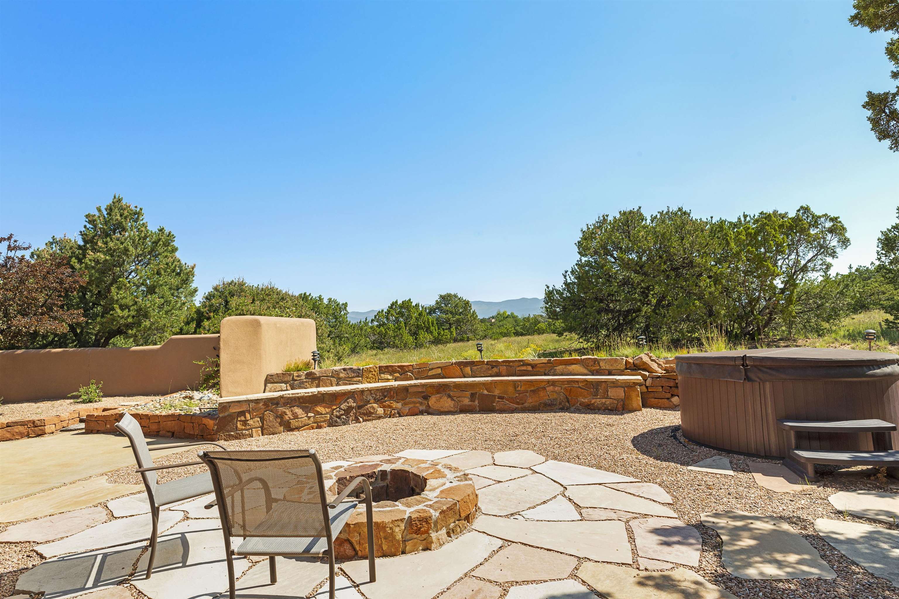 Oh so special home, with Sangre de Cristo & Jemez views, on 1.5 acres. Impressive updates & lavish upgrades: kitchen remodel with gorgeous cabinetry, copper farmhouse sink, Subzero, Wolf, Miele, Capital, & Scotsman appliances, + huge pantry. Remodeled bathrooms have double vanities, granite countertops, and stunning tile. Newer Pella windows, and custom alder interior doors & closet "barn" doors. Great Room with 12+' ceiling & kiva fireplace is enjoyed as a fabulous dining room. Living/Family room, with stacked stone fireplace detail & entertainment center cabinetry, provides a warm, informal ambiance. Marvelous outdoor living: walled, landscaped gardens, and a fantastic 24' x 24' living/dining Portal with kiva fireplace. A lovely flagstone terrace has a firepit & hot tub. 2021 TPO roof with transferable warranty. Beamed ceilings throughout.