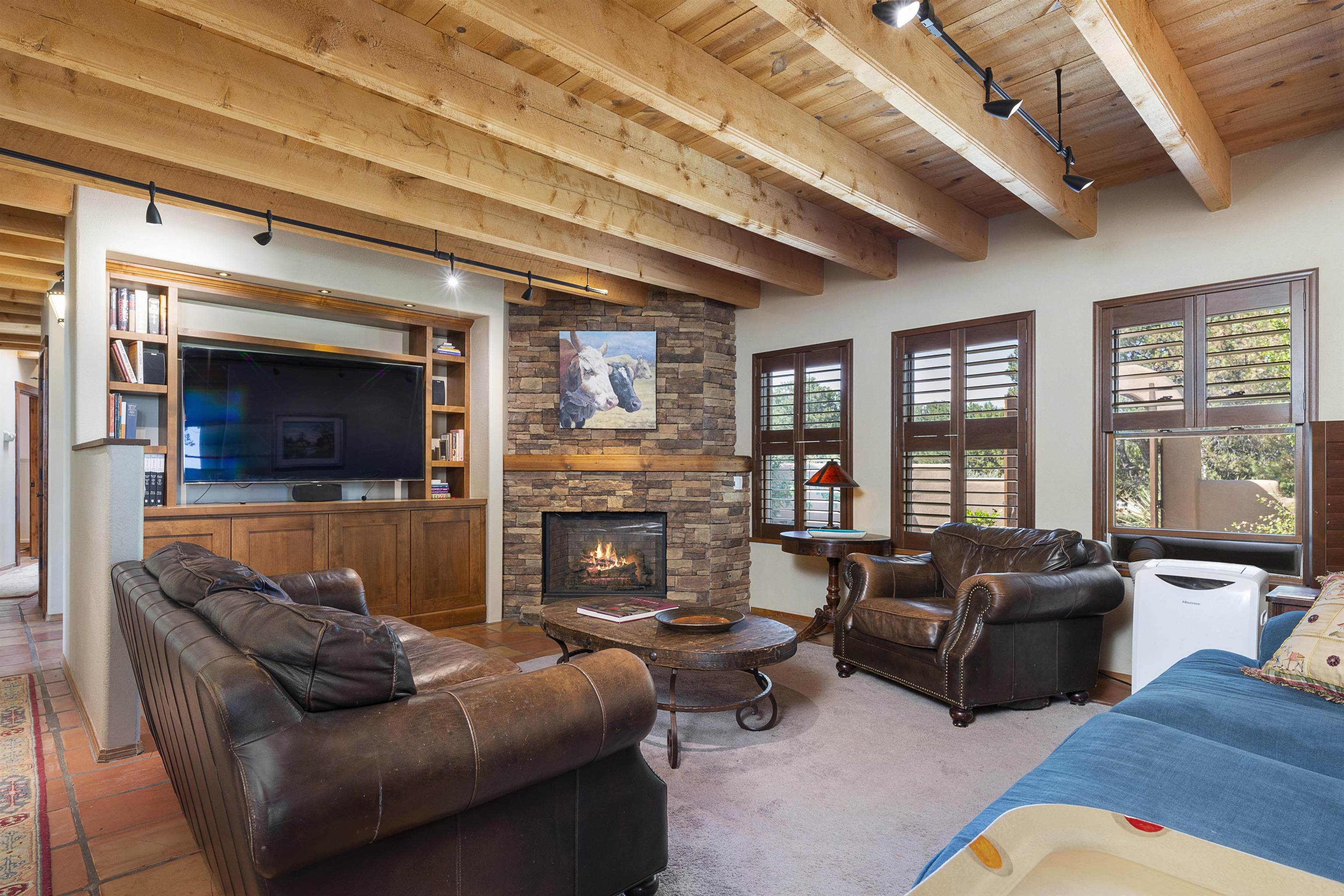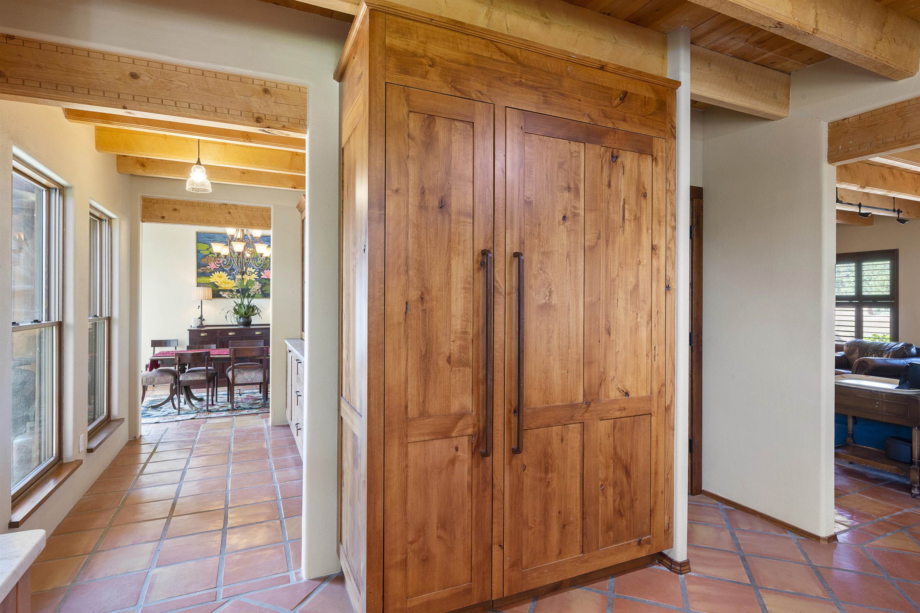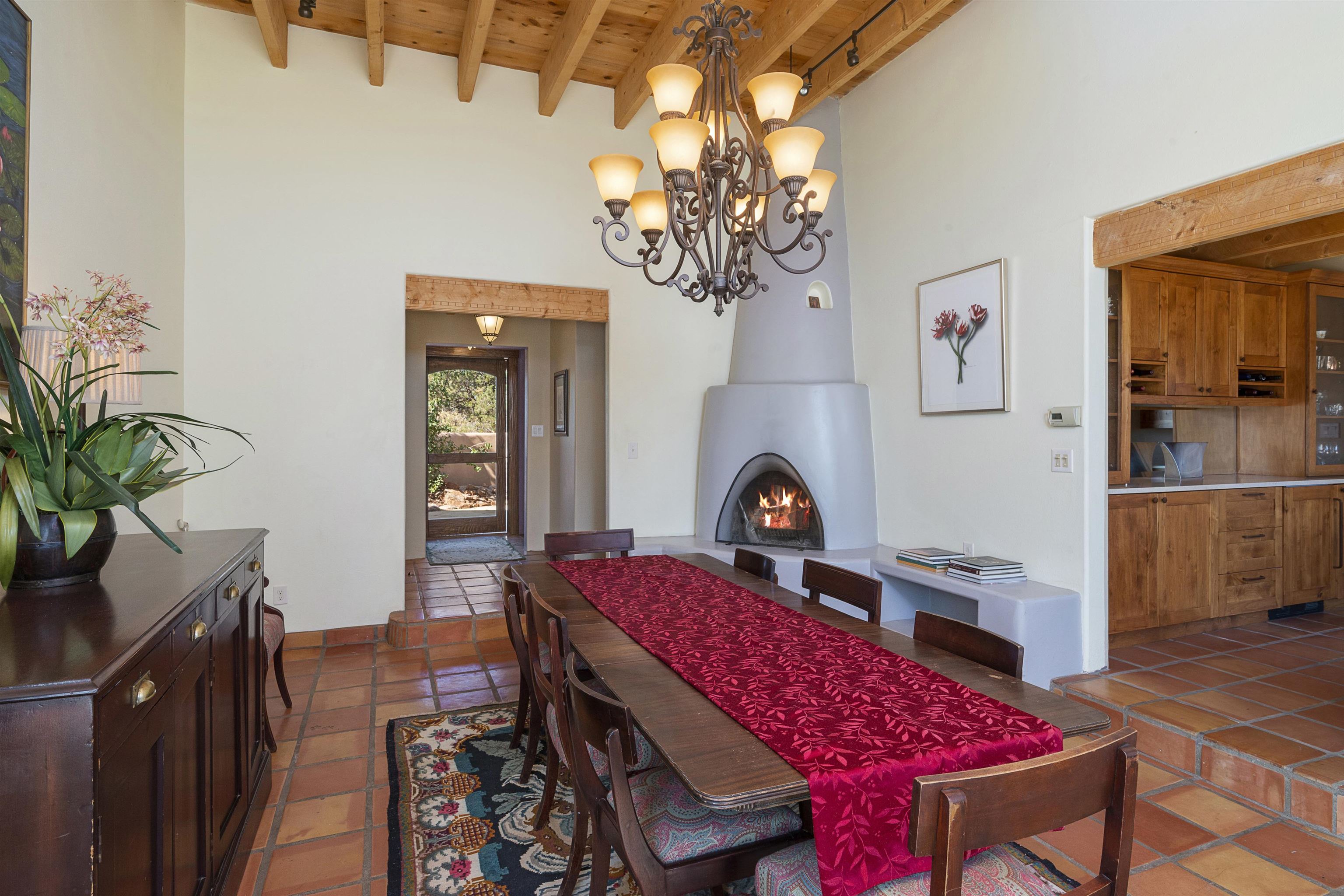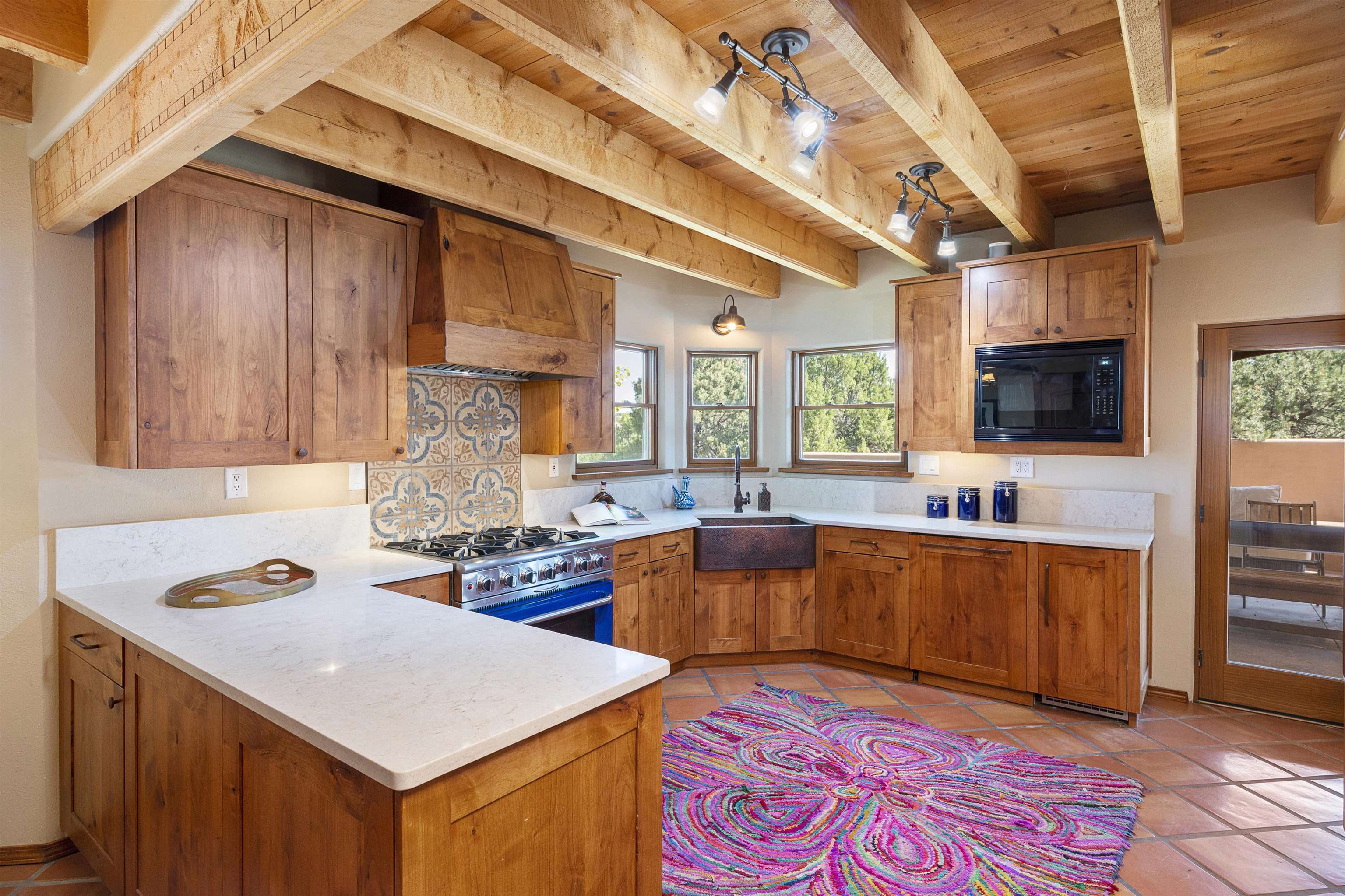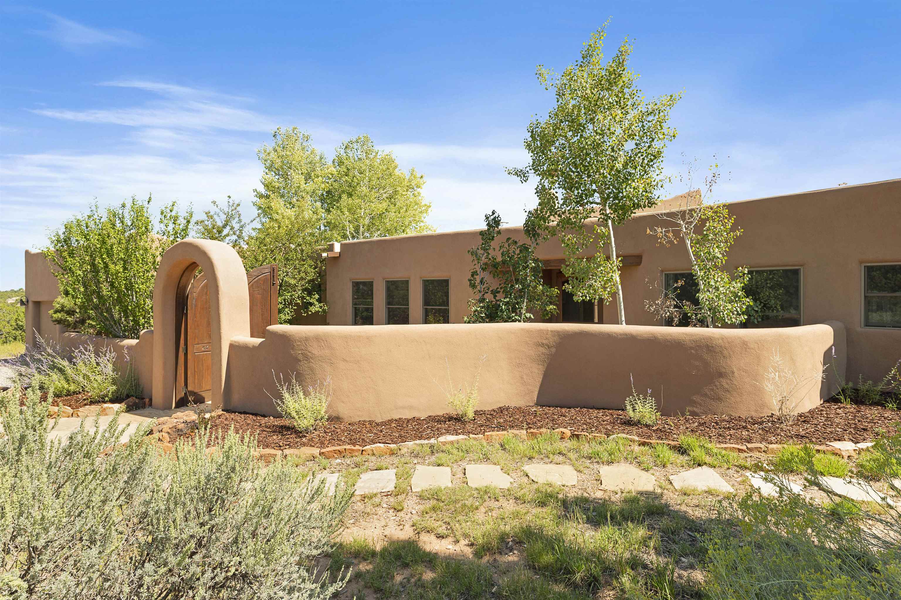 Oh so special home, with Sangre de Cristo & Jemez views, on 1.5 acres. Impressive updates & lavish upgrades: kitchen remodel with gorgeous cabinetry, copper farmhouse sink, Subzero, Wolf, Miele, Capital, & Scotsman appliances, + huge pantry. Remodeled bathrooms have double vanities, granite countertops, and stunning tile. Newer Pella windows, and custom alder interior doors & closet "barn" doors. Great Room with 12+' ceiling & kiva fireplace is enjoyed as a fabulous dining room. Living/Family room, with stacked stone fireplace detail & entertainment center cabinetry, provides a warm, informal ambiance. Marvelous outdoor living: walled, landscaped gardens, and a fantastic 24' x 24' living/dining Portal with kiva fireplace. A lovely flagstone terrace has a firepit & hot tub. 2021 TPO roof with transferable warranty. Beamed ceilings throughout.