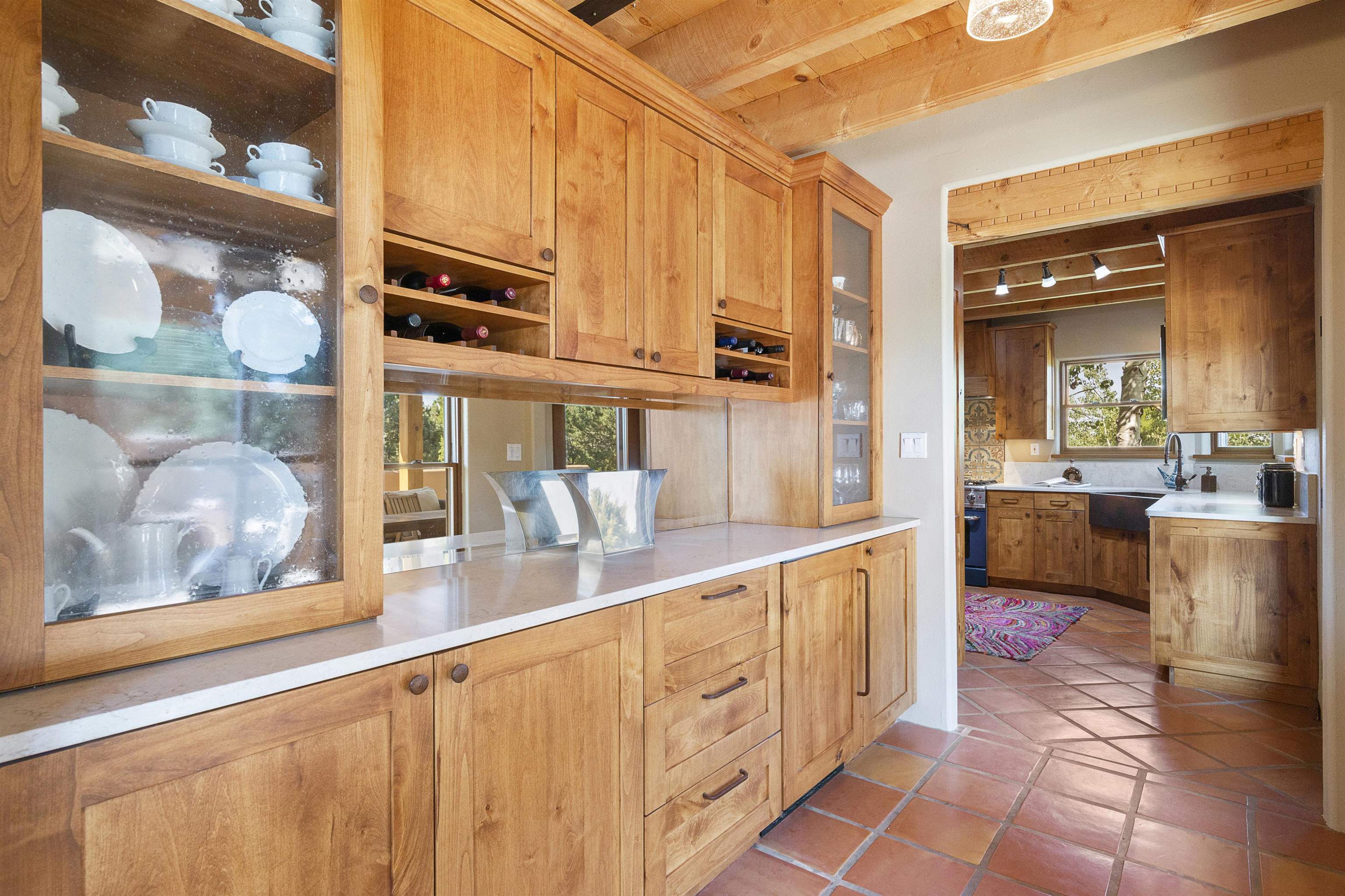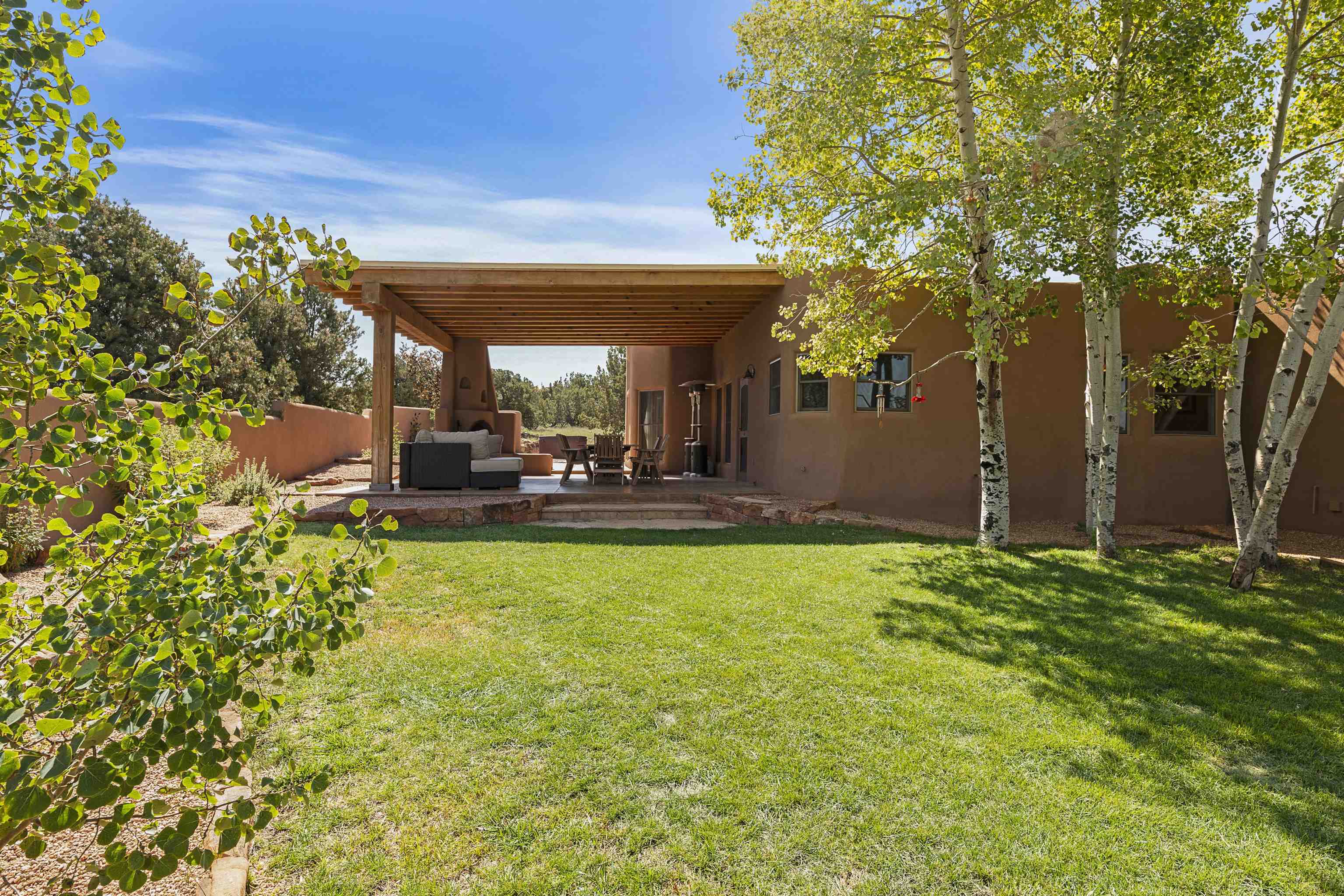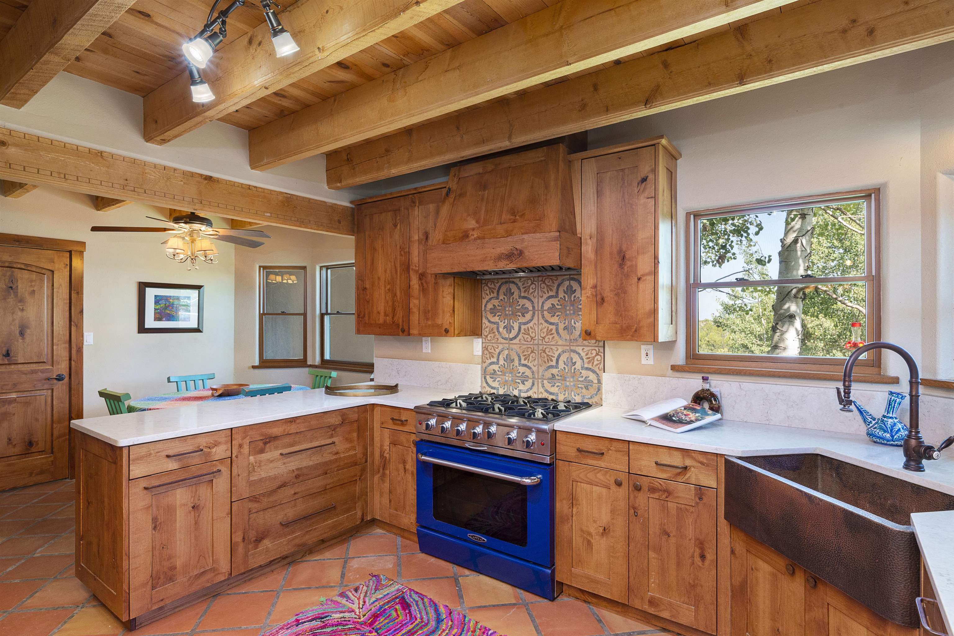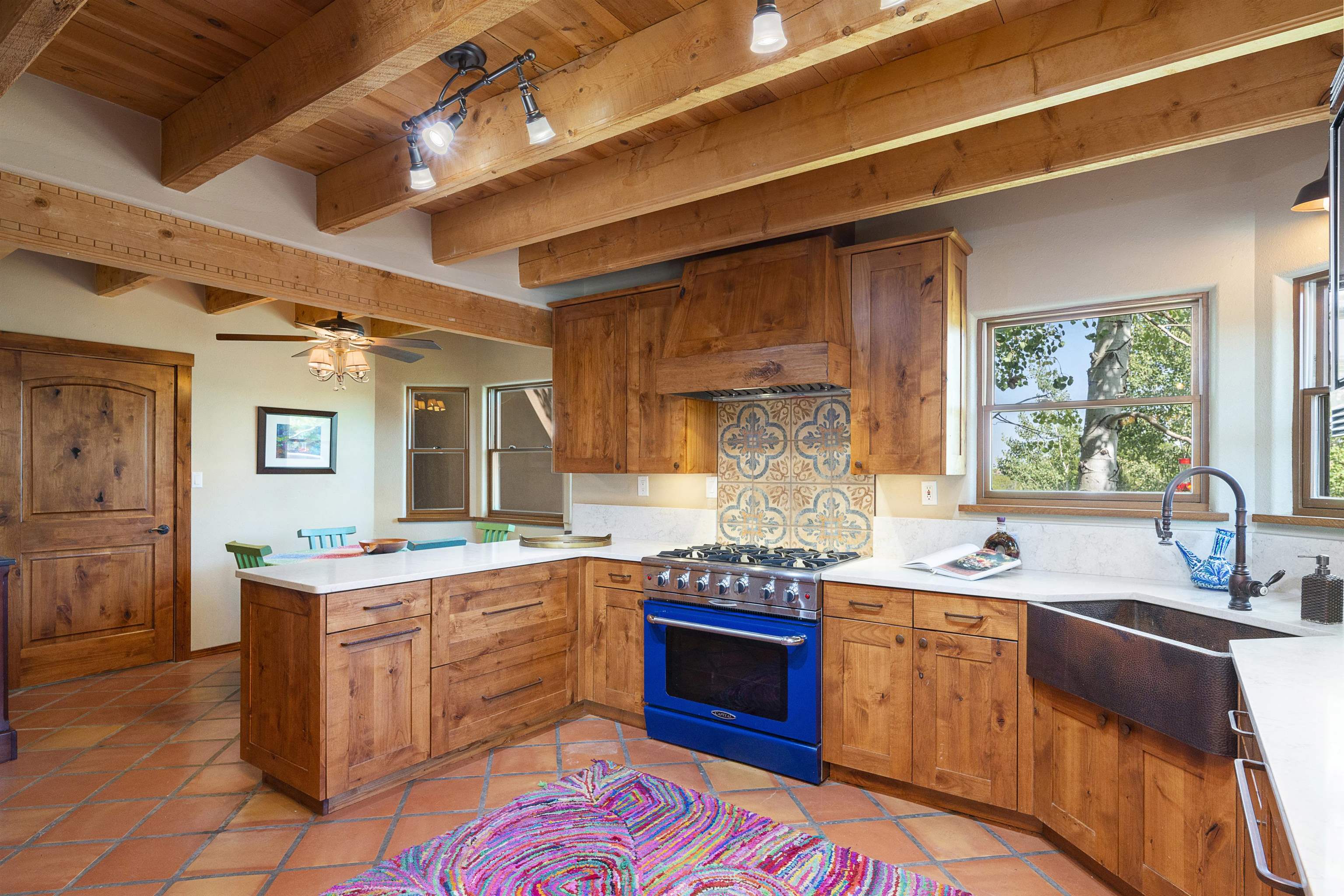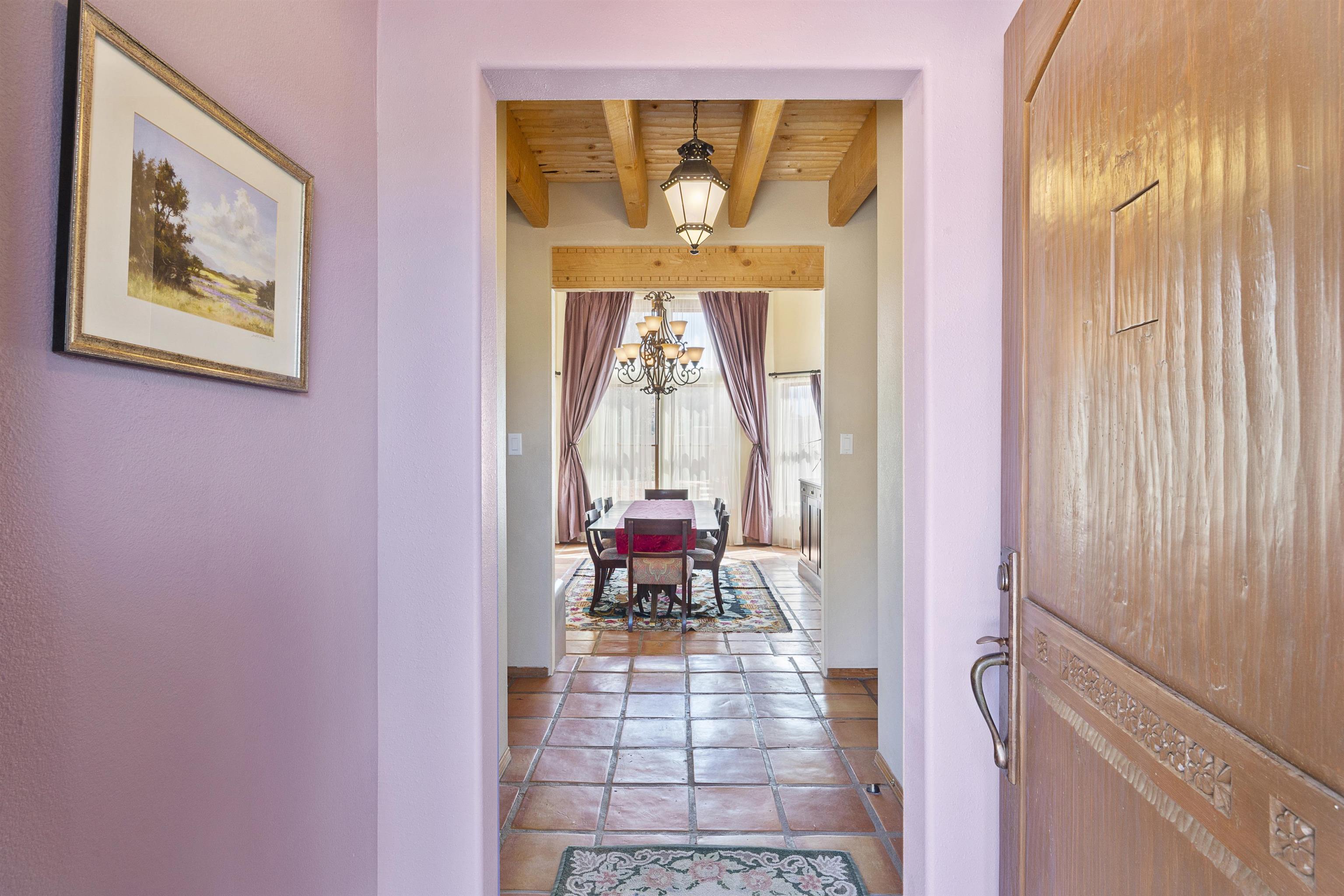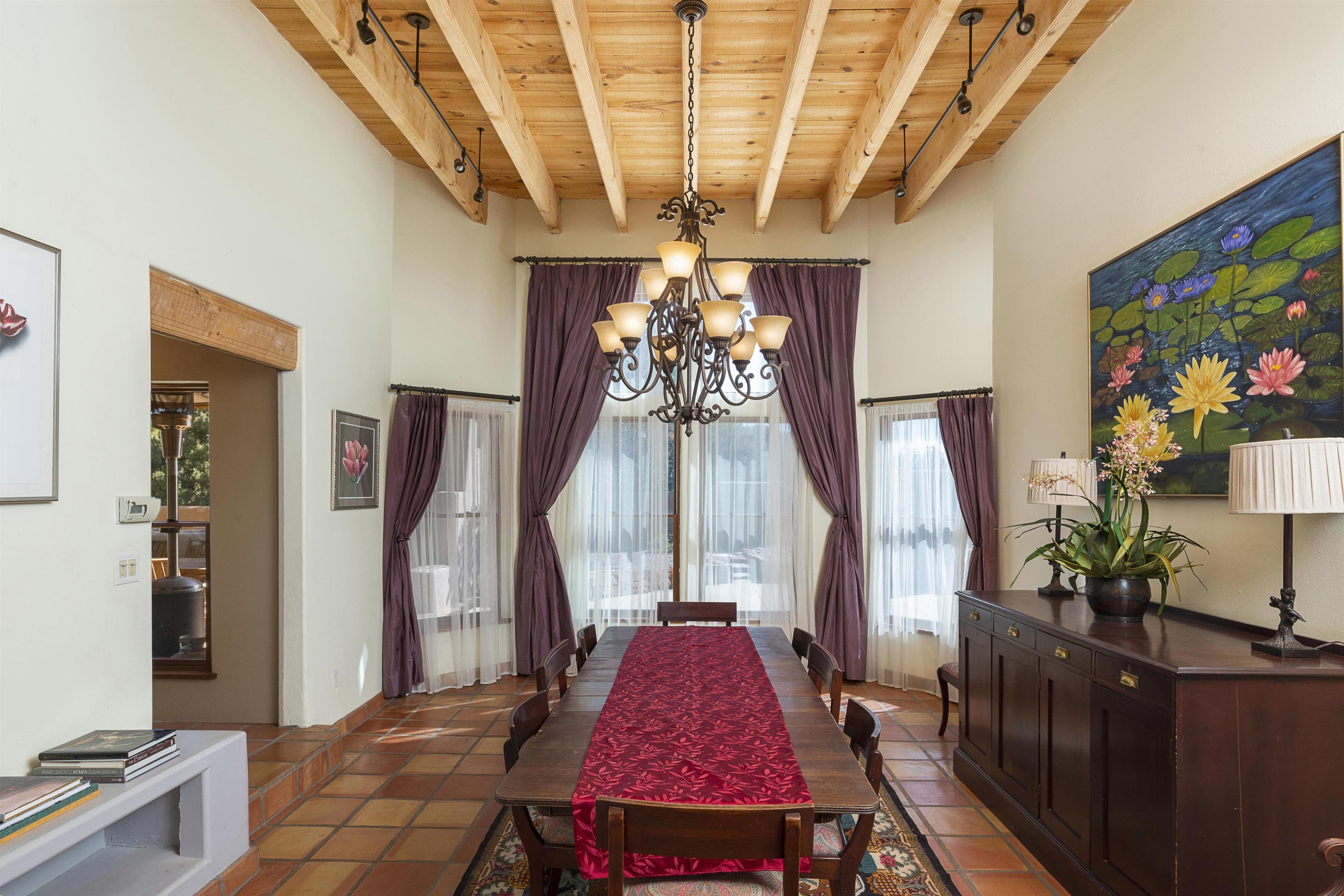 Oh so special home, with Sangre de Cristo & Jemez views, on 1.5 acres. Impressive updates & lavish upgrades: kitchen remodel with gorgeous cabinetry, copper farmhouse sink, Subzero, Wolf, Miele, Capital, & Scotsman appliances, + huge pantry. Remodeled bathrooms have double vanities, granite countertops, and stunning tile. Newer Pella windows, and custom alder interior doors & closet "barn" doors. Great Room with 12+' ceiling & kiva fireplace is enjoyed as a fabulous dining room. Living/Family room, with stacked stone fireplace detail & entertainment center cabinetry, provides a warm, informal ambiance. Marvelous outdoor living: walled, landscaped gardens, and a fantastic 24' x 24' living/dining Portal with kiva fireplace. A lovely flagstone terrace has a firepit & hot tub. 2021 TPO roof with transferable warranty. Beamed ceilings throughout.