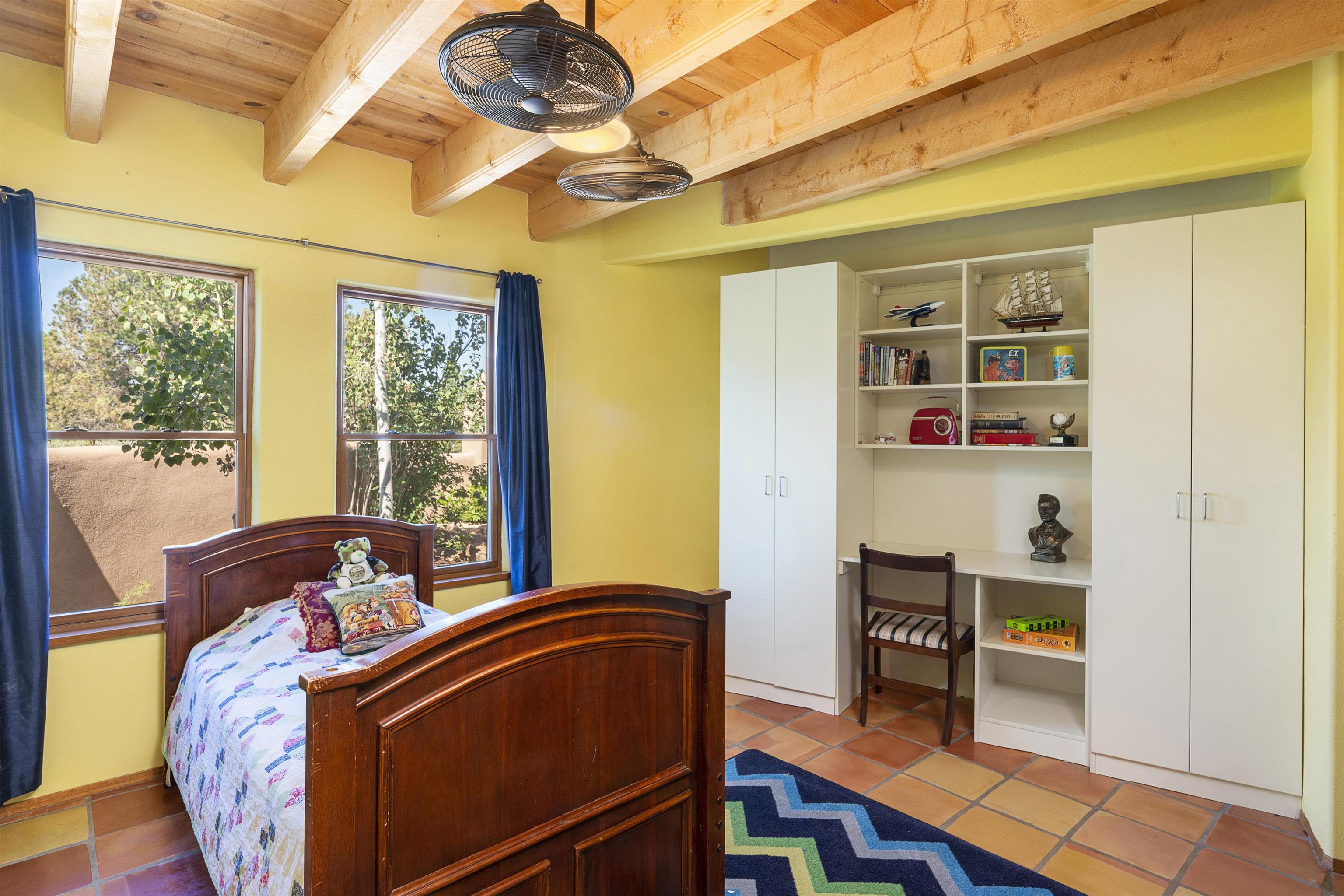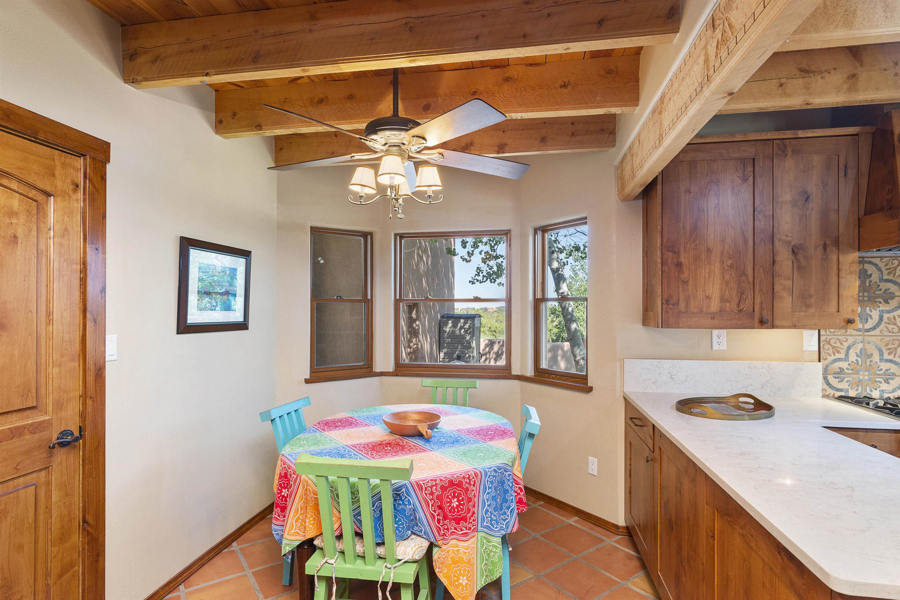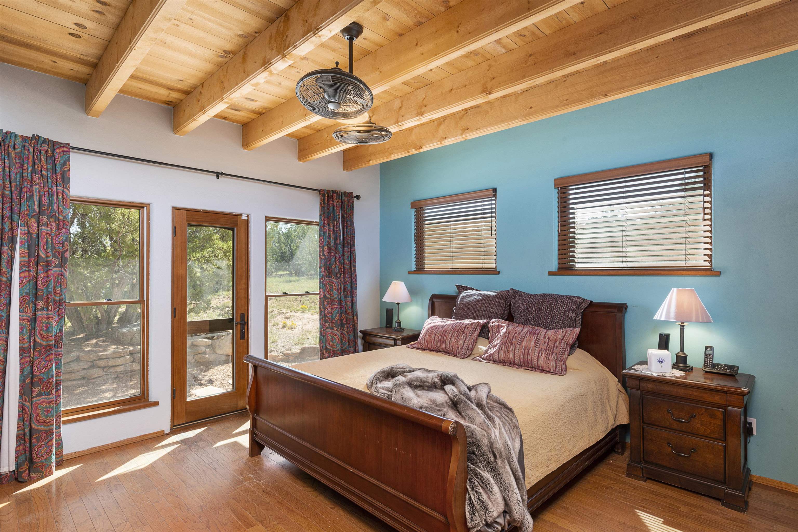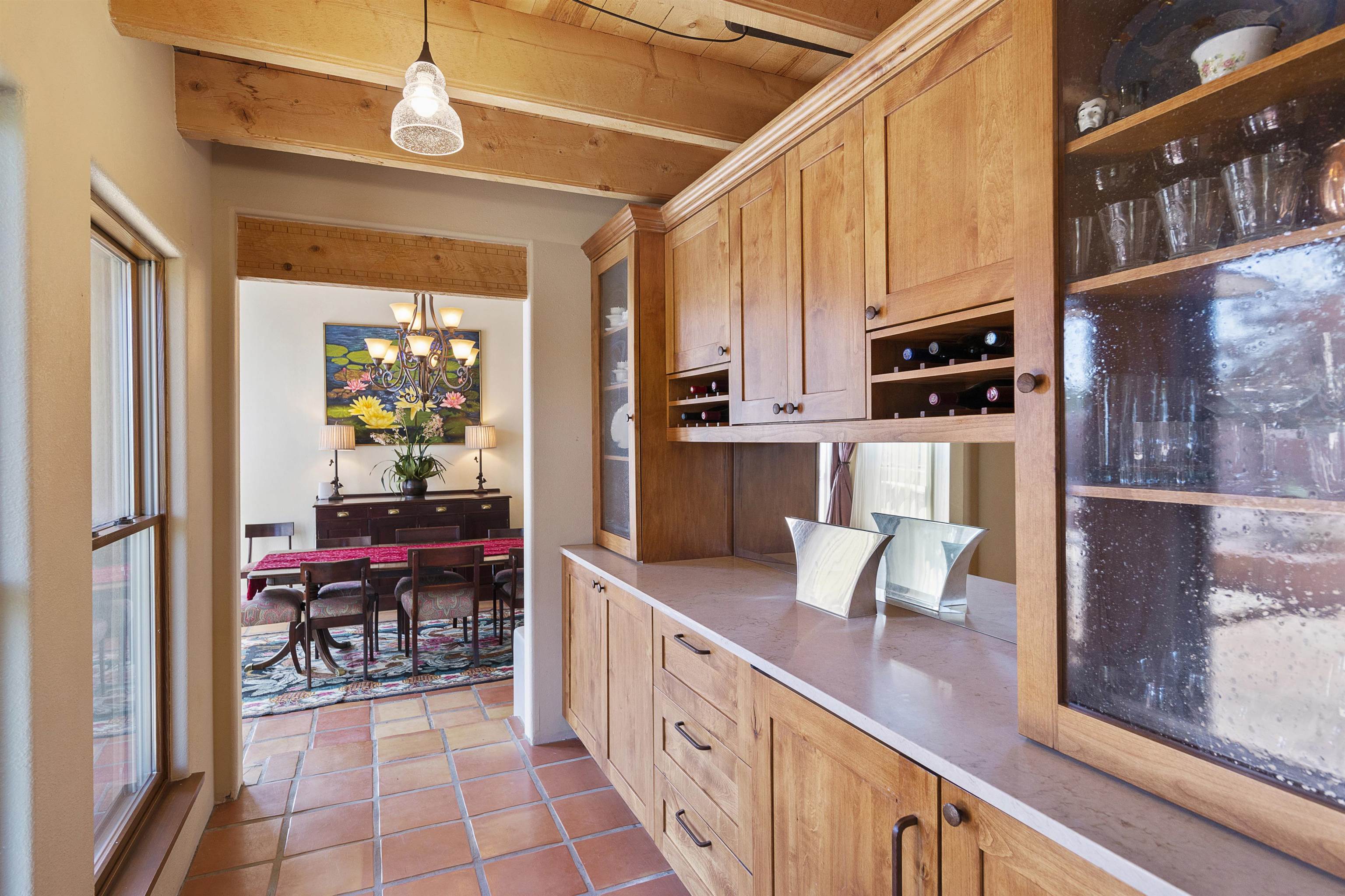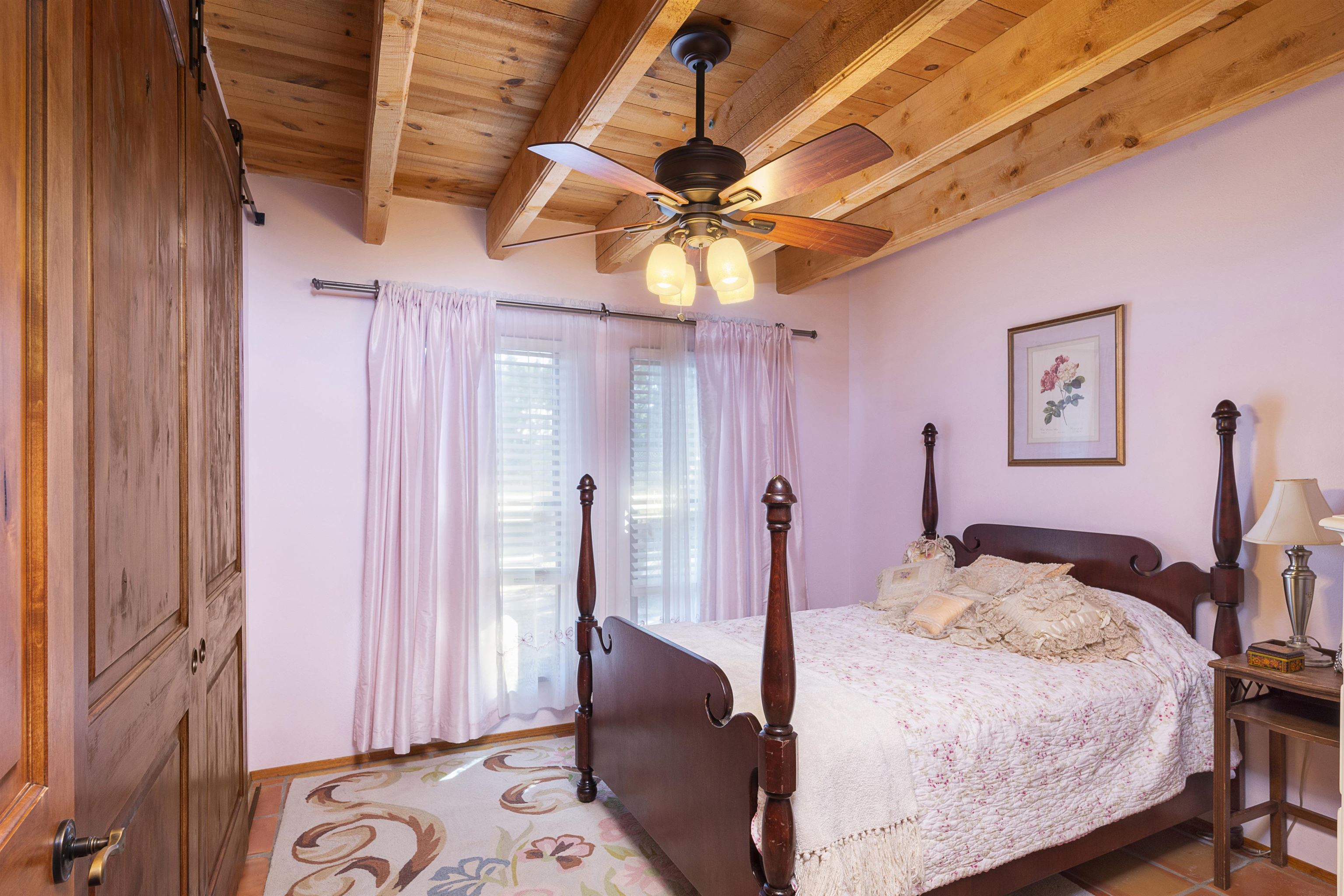 Oh so special home, with Sangre de Cristo & Jemez views, on 1.5 acres. Impressive updates & lavish upgrades: kitchen remodel with gorgeous cabinetry, copper farmhouse sink, Subzero, Wolf, Miele, Capital, & Scotsman appliances, + huge pantry. Remodeled bathrooms have double vanities, granite countertops, and stunning tile. Newer Pella windows, and custom alder interior doors & closet "barn" doors. Great Room with 12+' ceiling & kiva fireplace is enjoyed as a fabulous dining room. Living/Family room, with stacked stone fireplace detail & entertainment center cabinetry, provides a warm, informal ambiance. Marvelous outdoor living: walled, landscaped gardens, and a fantastic 24' x 24' living/dining Portal with kiva fireplace. A lovely flagstone terrace has a firepit & hot tub. 2021 TPO roof with transferable warranty. Beamed ceilings throughout.