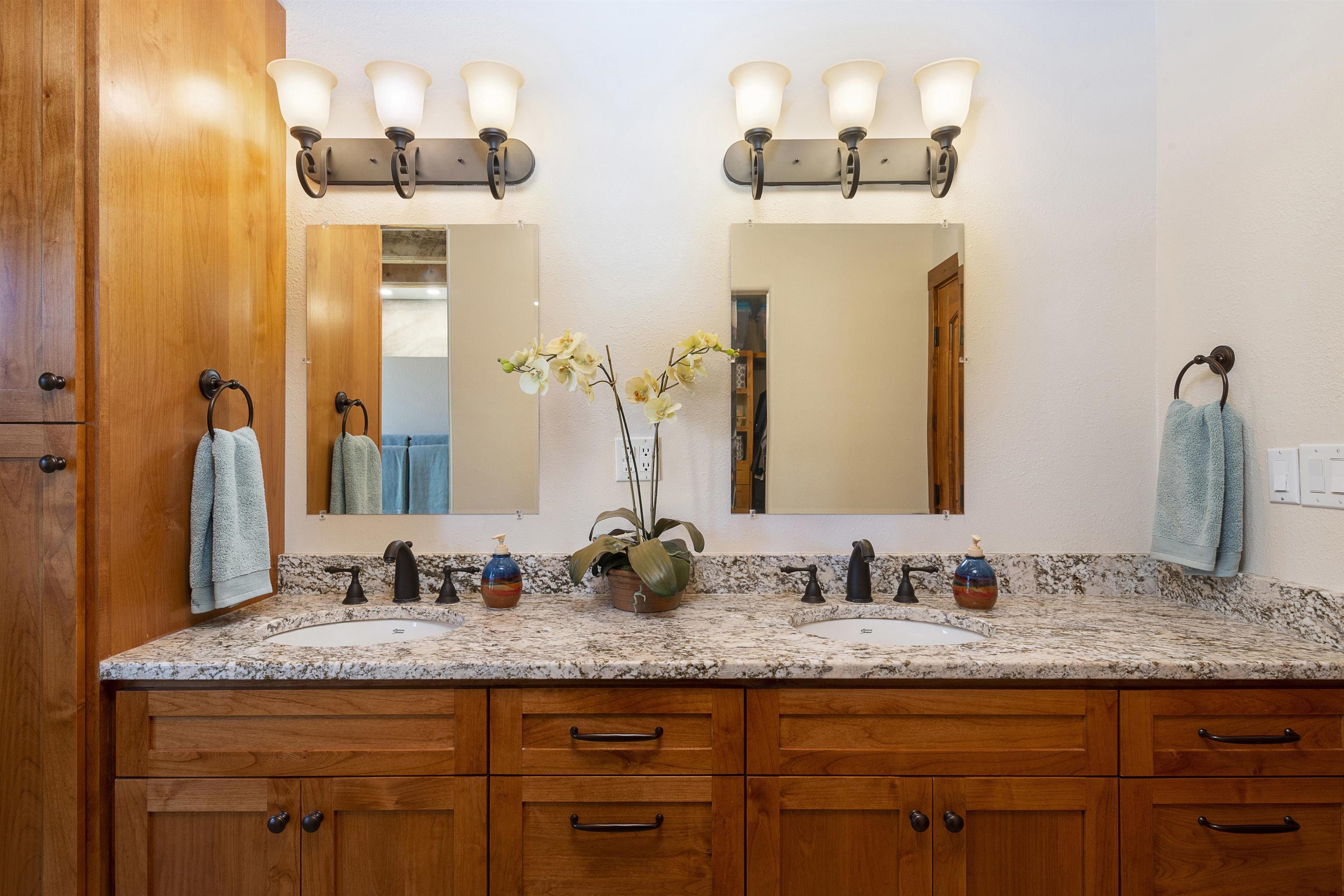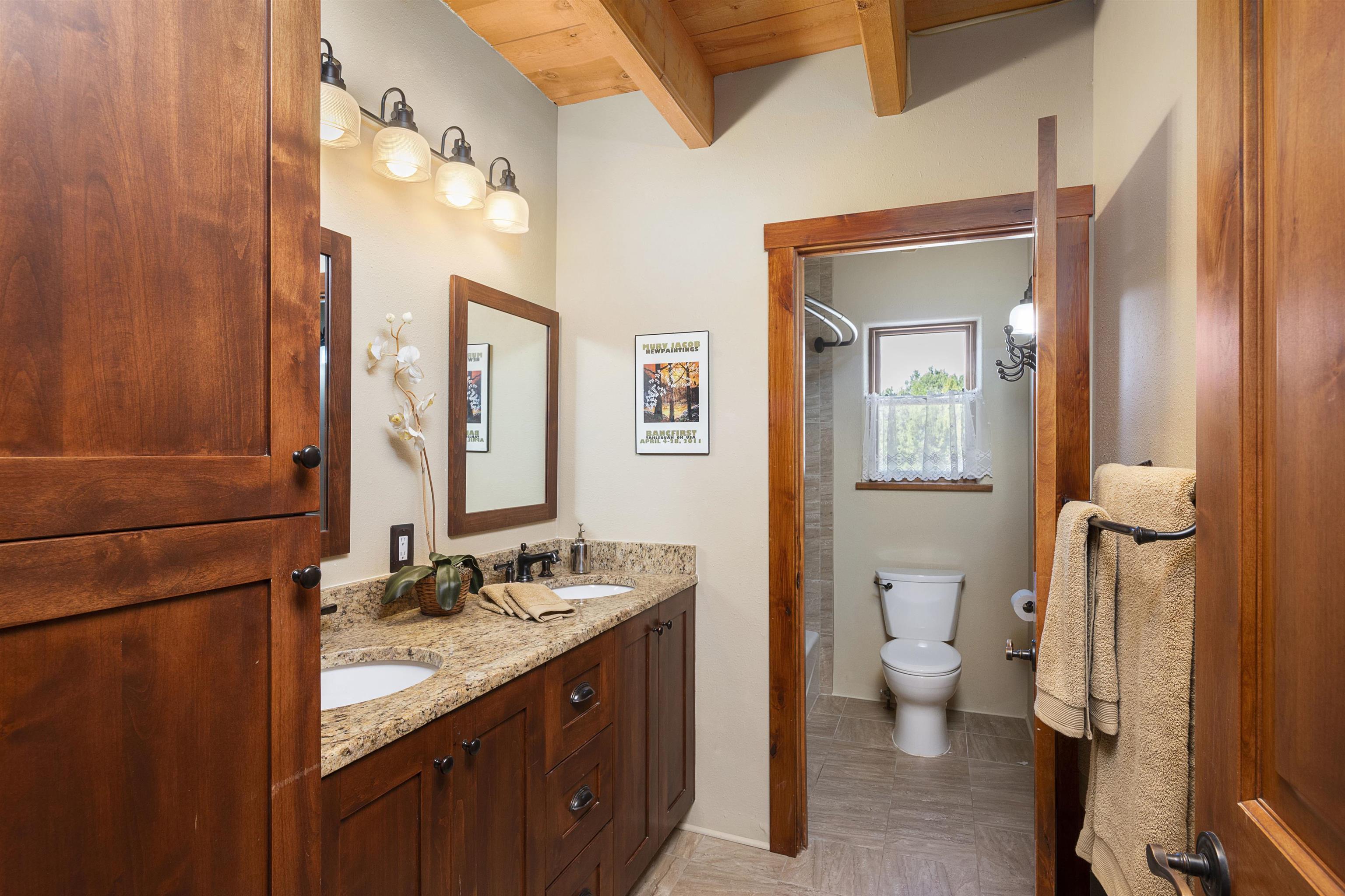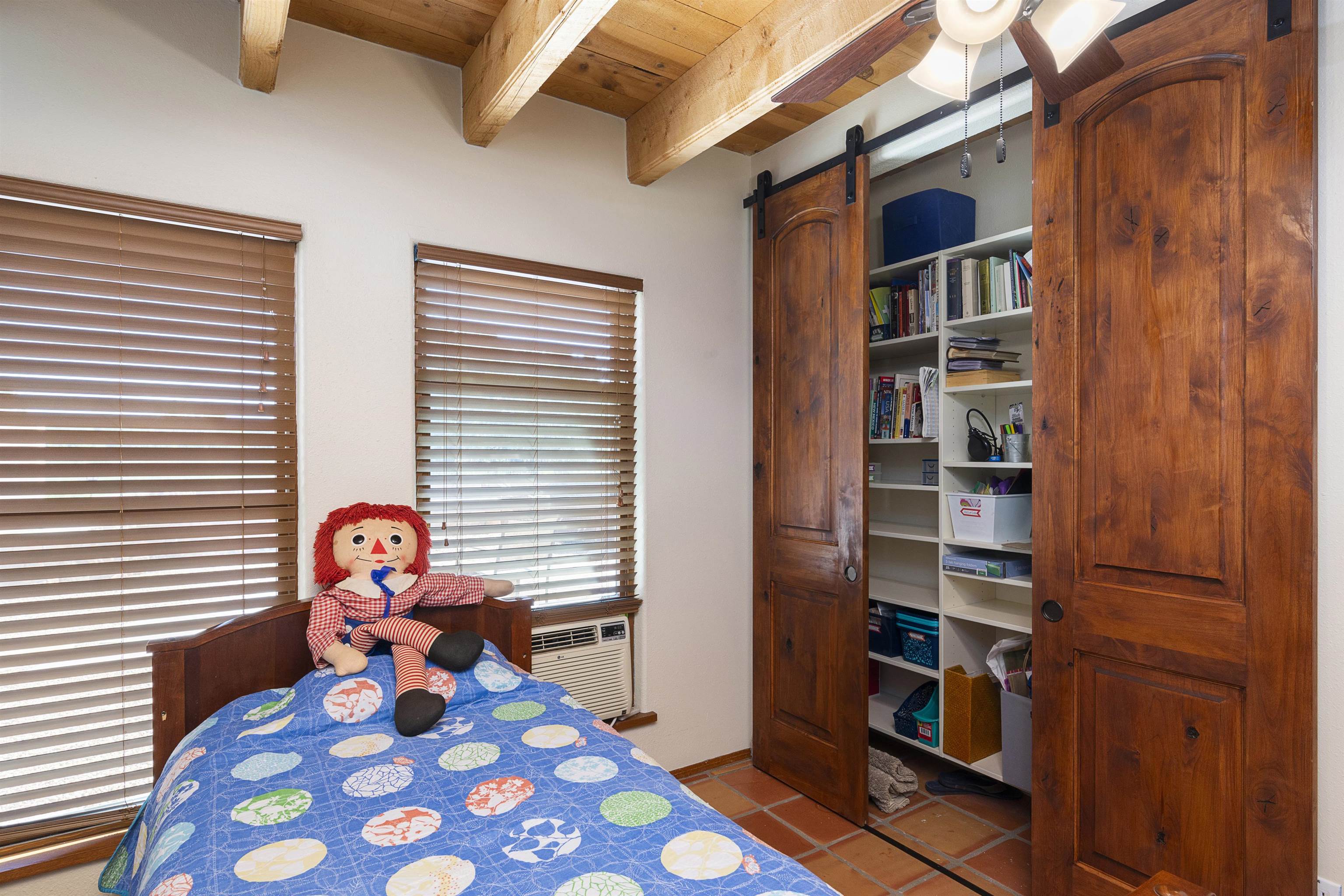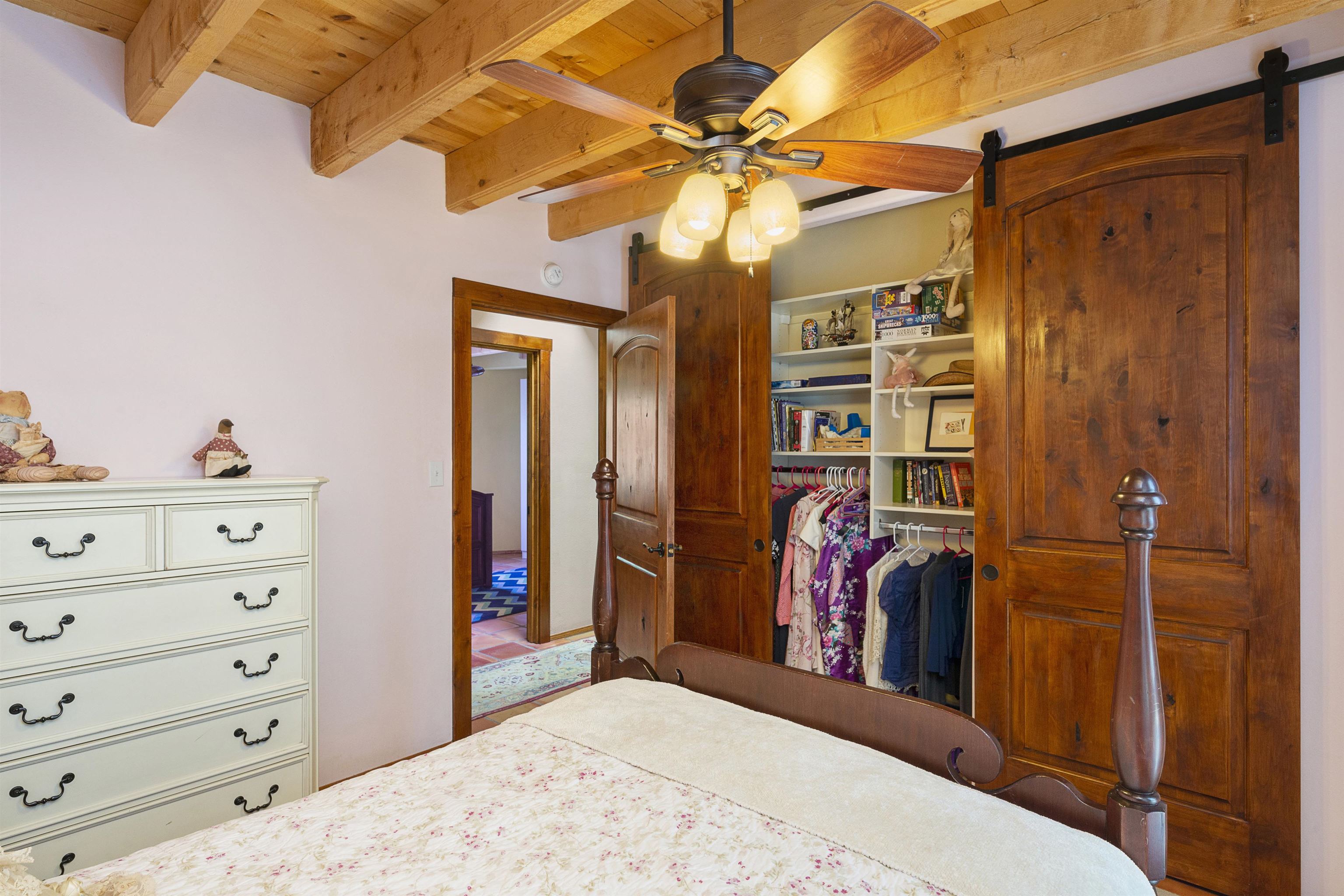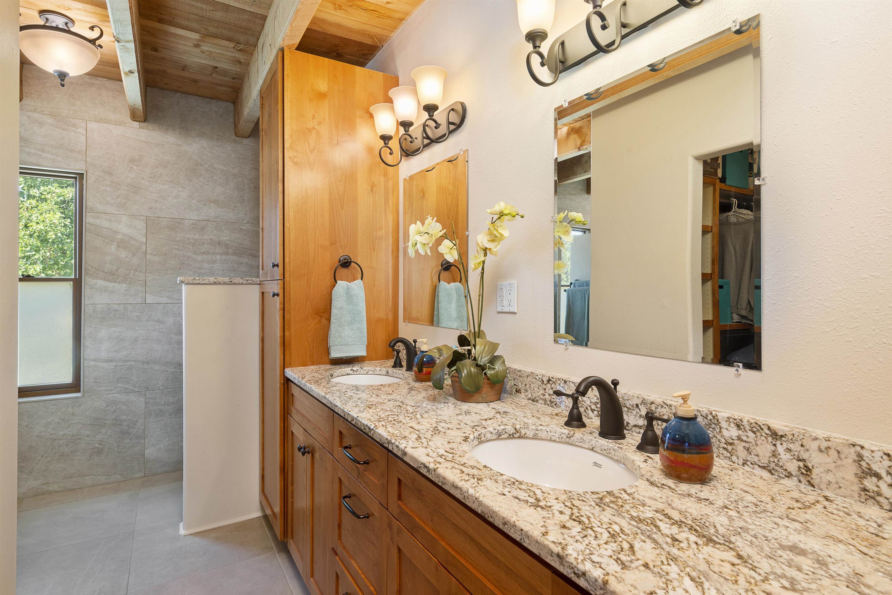 Oh so special home, with Sangre de Cristo & Jemez views, on 1.5 acres. Impressive updates & lavish upgrades: kitchen remodel with gorgeous cabinetry, copper farmhouse sink, Subzero, Wolf, Miele, Capital, & Scotsman appliances, + huge pantry. Remodeled bathrooms have double vanities, granite countertops, and stunning tile. Newer Pella windows, and custom alder interior doors & closet "barn" doors. Great Room with 12+' ceiling & kiva fireplace is enjoyed as a fabulous dining room. Living/Family room, with stacked stone fireplace detail & entertainment center cabinetry, provides a warm, informal ambiance. Marvelous outdoor living: walled, landscaped gardens, and a fantastic 24' x 24' living/dining Portal with kiva fireplace. A lovely flagstone terrace has a firepit & hot tub. 2021 TPO roof with transferable warranty. Beamed ceilings throughout.