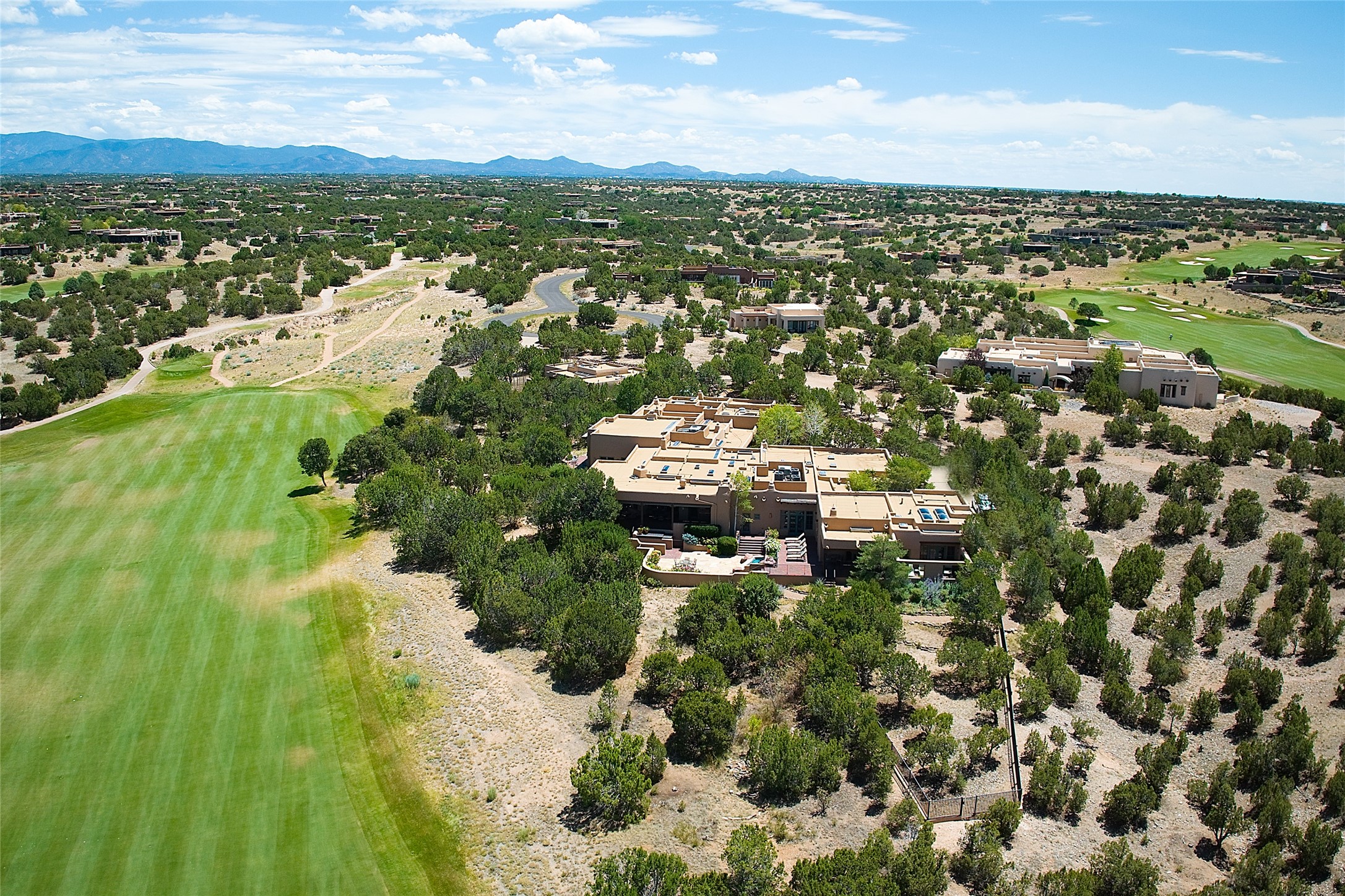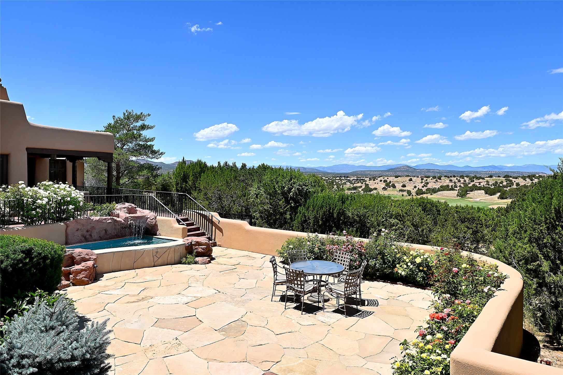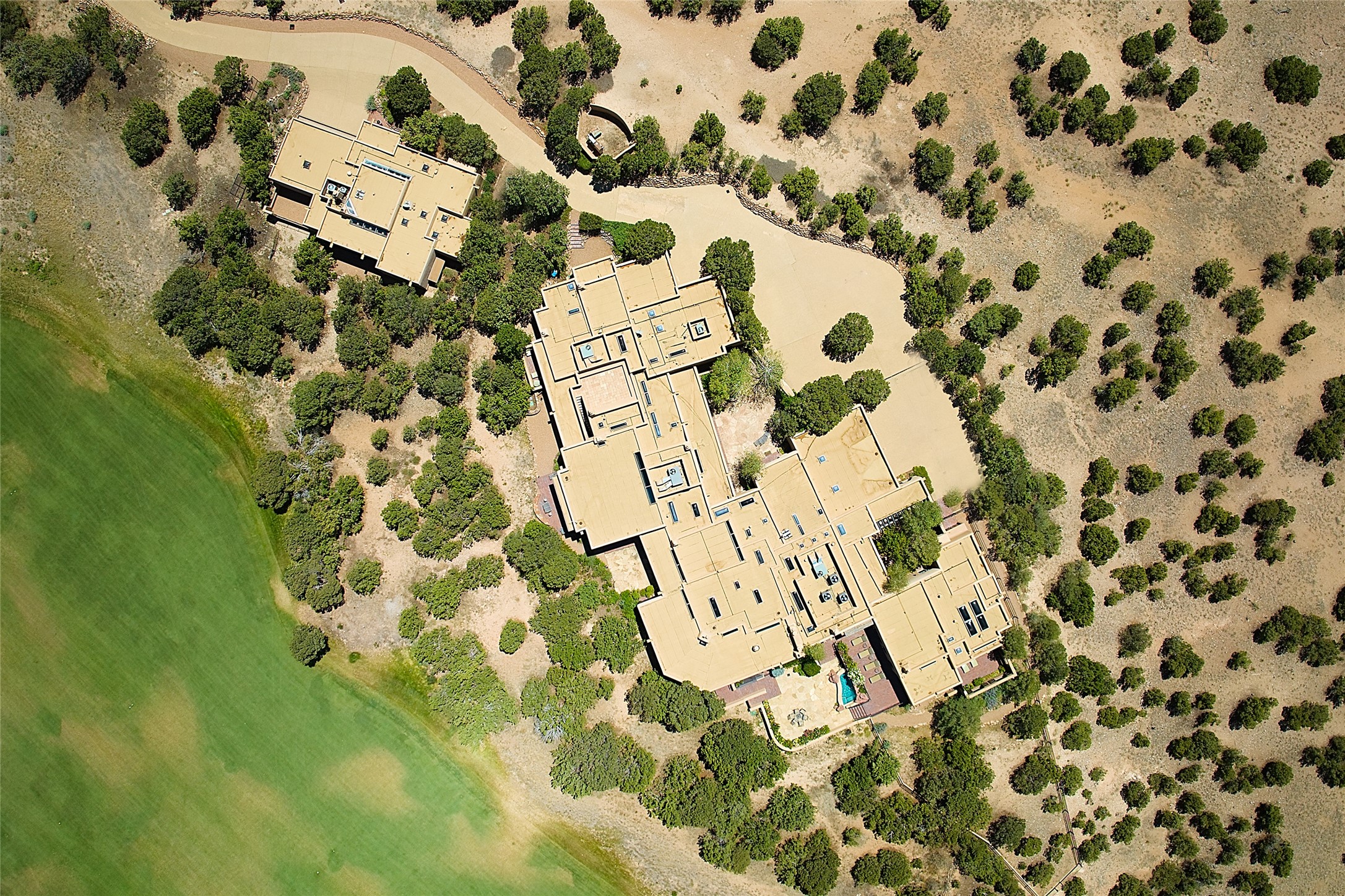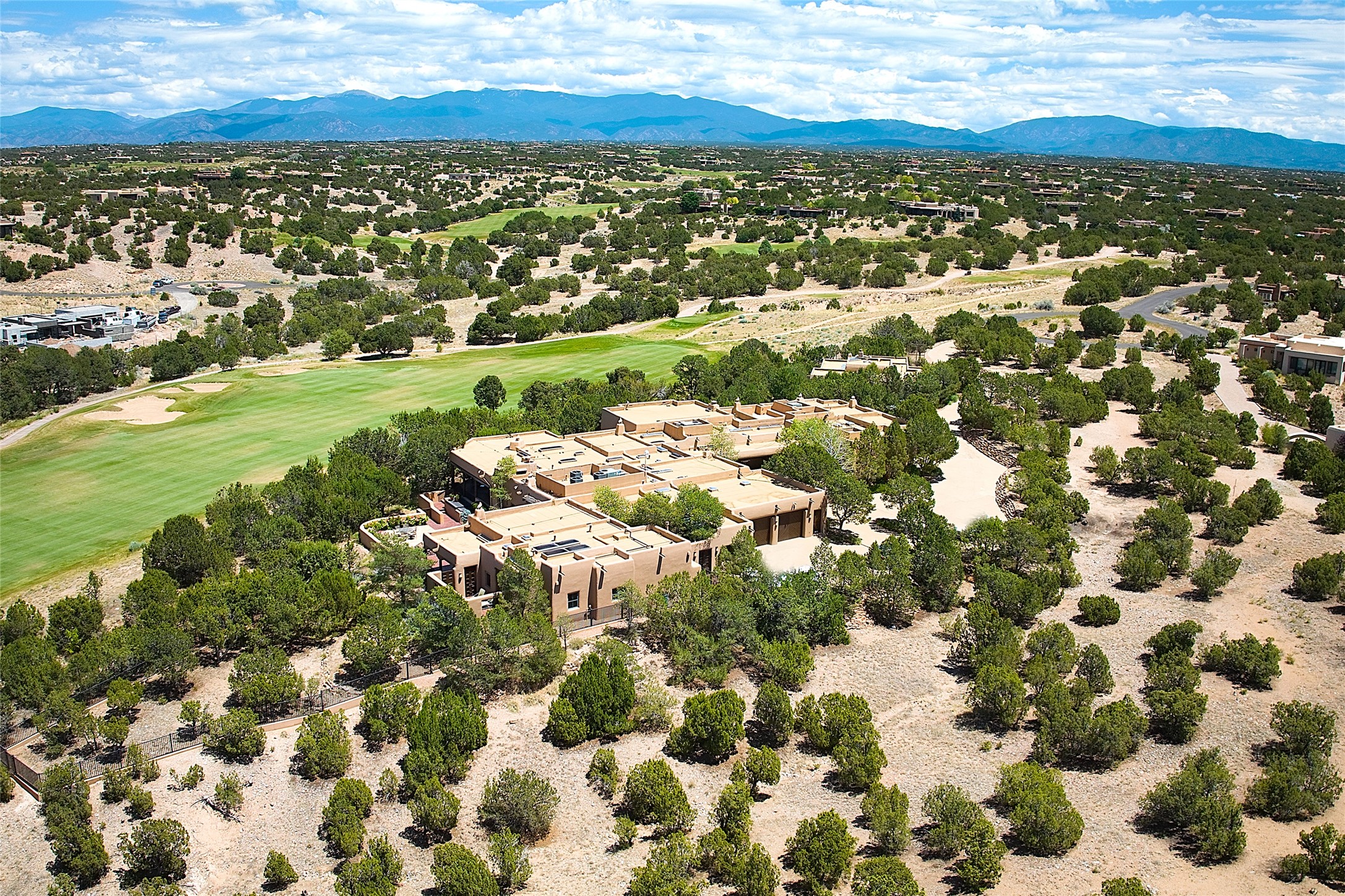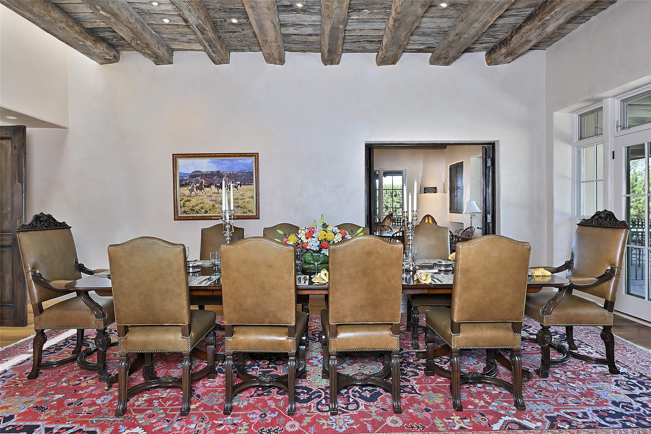 A majestic private getaway in the exclusive community of Las Campanas, the 5.05-acre estate known as Feliciana encompasses an impressive main residence of some 9,588 square feet and an inviting guesthouse of 1,800 square feet with two bedrooms, a great room and kitchen, and its own portal and garage. Equally ideal for grand entertaining and peaceful Santa Fe living, the residence is replete with timeless Southwestern details, including hardwood and brick floors; ceilings with dramatic vigas, beams, and latillas; skylights; bancos; lighted art nichos; and fireplaces in classical and traditional kiva styles. Highlights include a grand living room, formal and casual dining space, a wet bar, a charming kitchen with a butler's pantry and an outdoor grilling area, a secluded owner's suite, a guest wing with its own living area, a pet courtyard and bathing area, and two garages. Ideally sited on the 15th fairway of the Sunrise course, the property offers sweeping golf course, mountain, and sunset views. An array of patios and portales--along with an enviable roof deck--allow for outdoor celebration and relaxation. Mature pines, juniper, aspens, and rolling Southwestern terrain envelop the home, as do numerous outdoor living spaces--both covered and open-air. Mature pines, juniper, aspens, and rolling Southwestern terrain envelop the home, as do numerous outdoor living spaces--both covered and open-air.