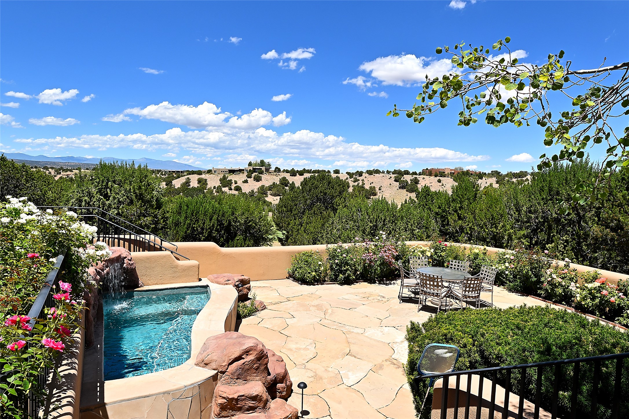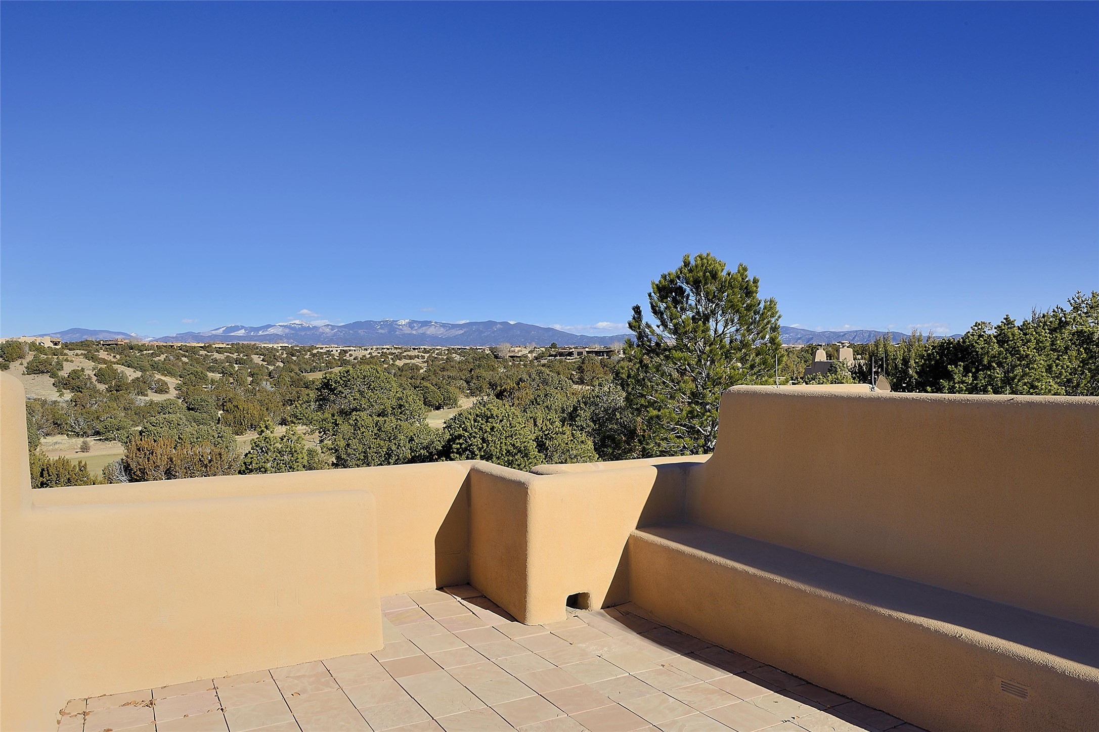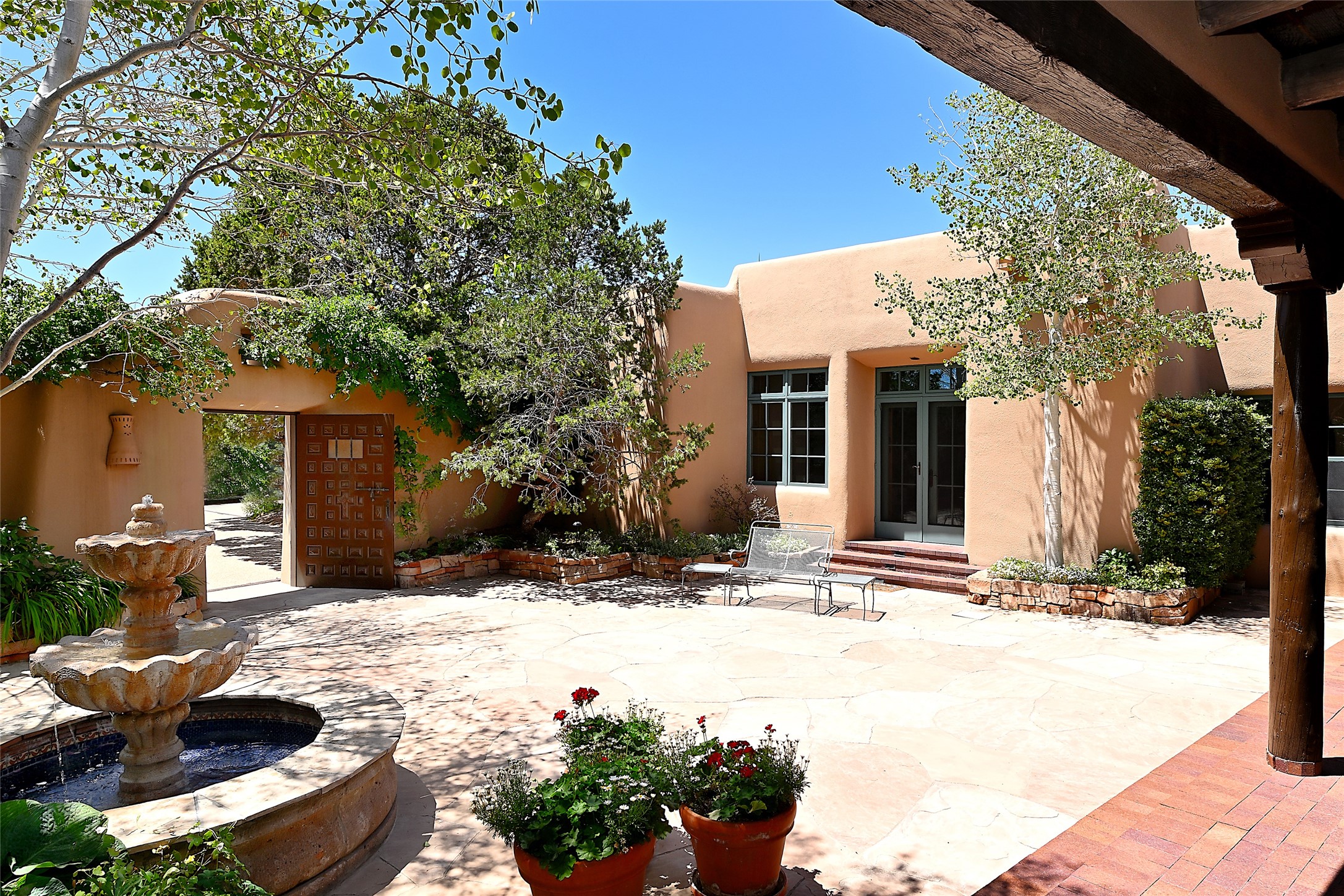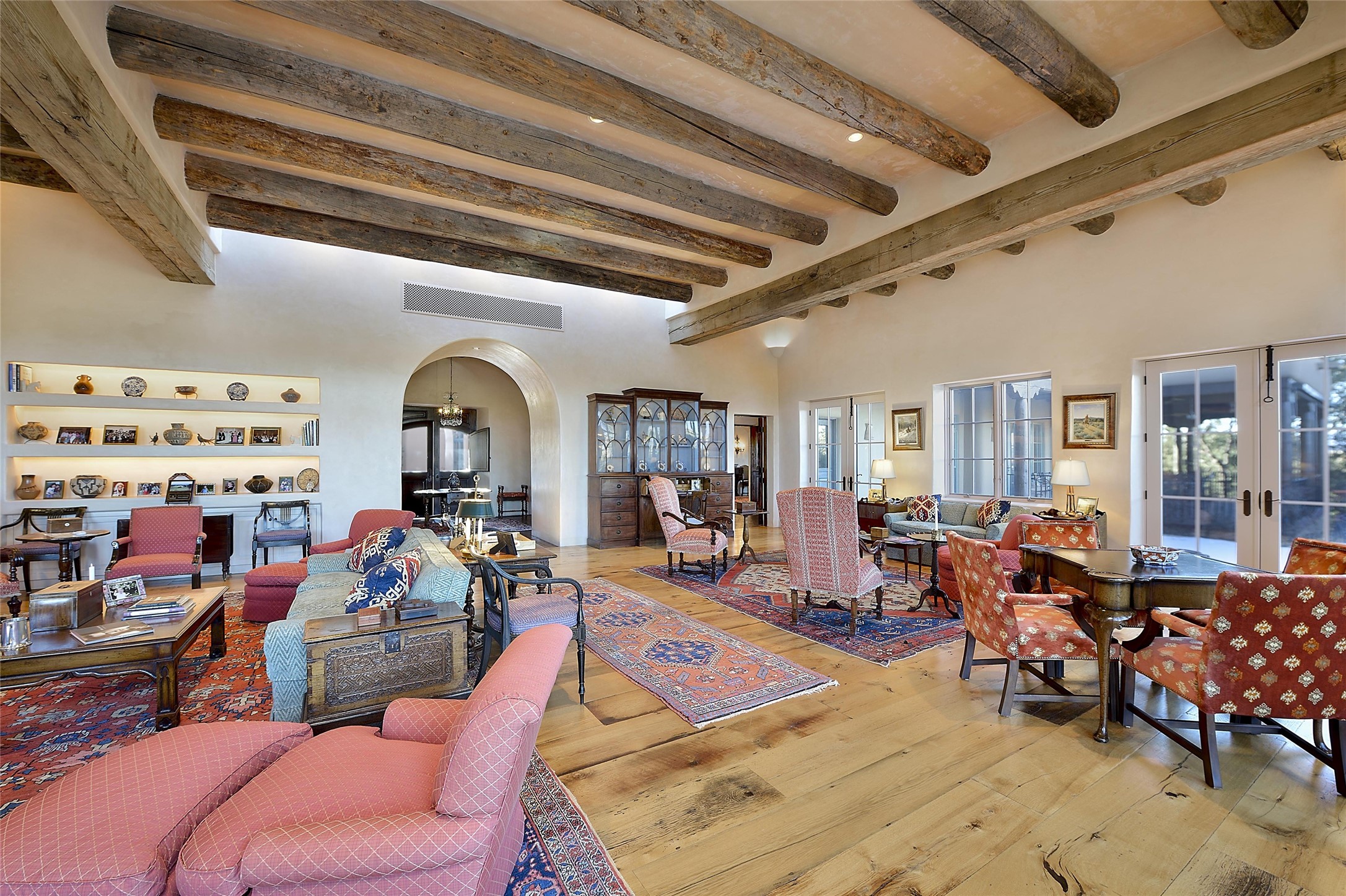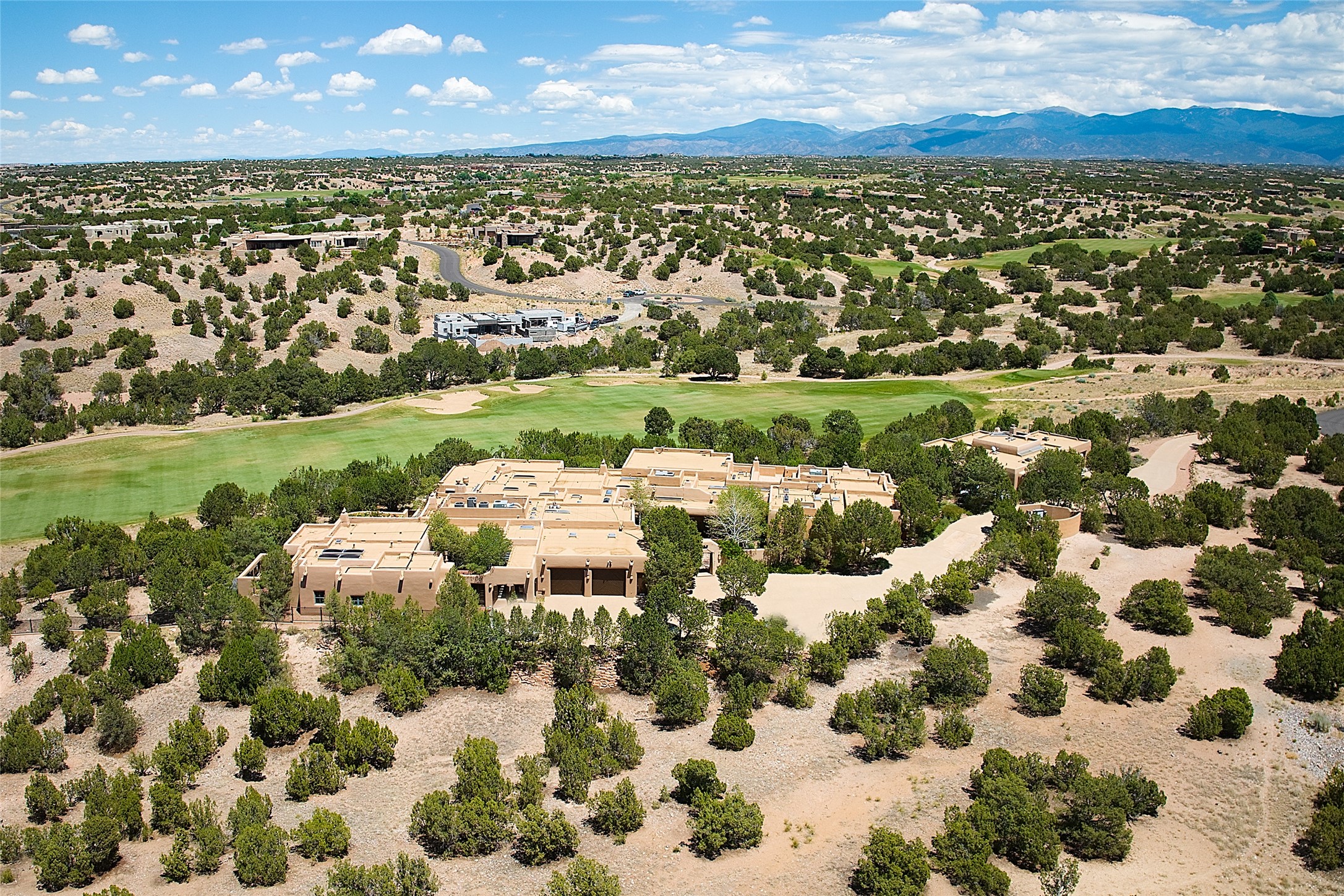 A majestic private getaway in the exclusive community of Las Campanas, the 5.05-acre estate known as Feliciana encompasses an impressive main residence of some 9,588 square feet and an inviting guesthouse of 1,800 square feet with two bedrooms, a great room and kitchen, and its own portal and garage. Equally ideal for grand entertaining and peaceful Santa Fe living, the residence is replete with timeless Southwestern details, including hardwood and brick floors; ceilings with dramatic vigas, beams, and latillas; skylights; bancos; lighted art nichos; and fireplaces in classical and traditional kiva styles. Highlights include a grand living room, formal and casual dining space, a wet bar, a charming kitchen with a butler's pantry and an outdoor grilling area, a secluded owner's suite, a guest wing with its own living area, a pet courtyard and bathing area, and two garages. Ideally sited on the 15th fairway of the Sunrise course, the property offers sweeping golf course, mountain, and sunset views. An array of patios and portales--along with an enviable roof deck--allow for outdoor celebration and relaxation. Mature pines, juniper, aspens, and rolling Southwestern terrain envelop the home, as do numerous outdoor living spaces--both covered and open-air. Mature pines, juniper, aspens, and rolling Southwestern terrain envelop the home, as do numerous outdoor living spaces--both covered and open-air.