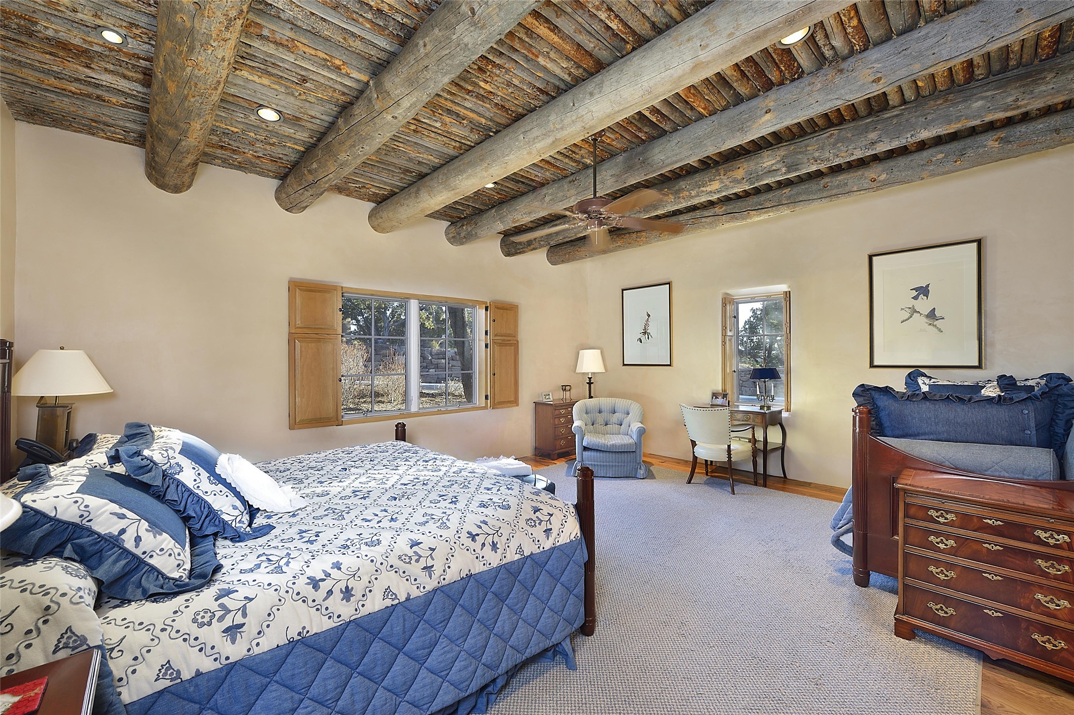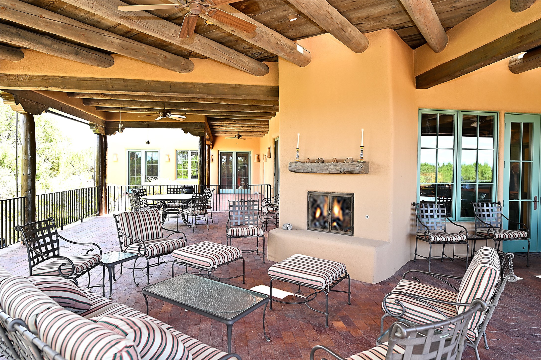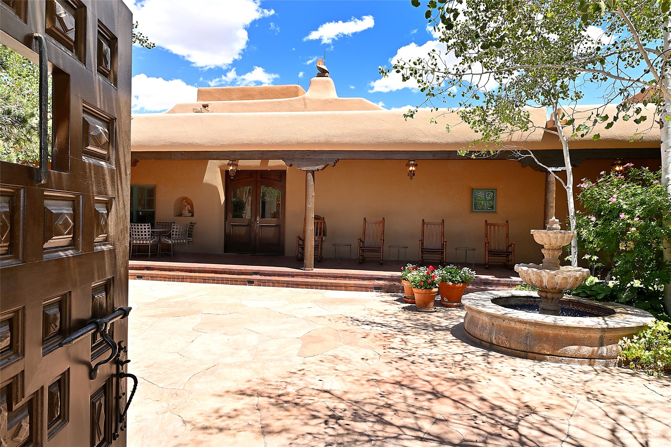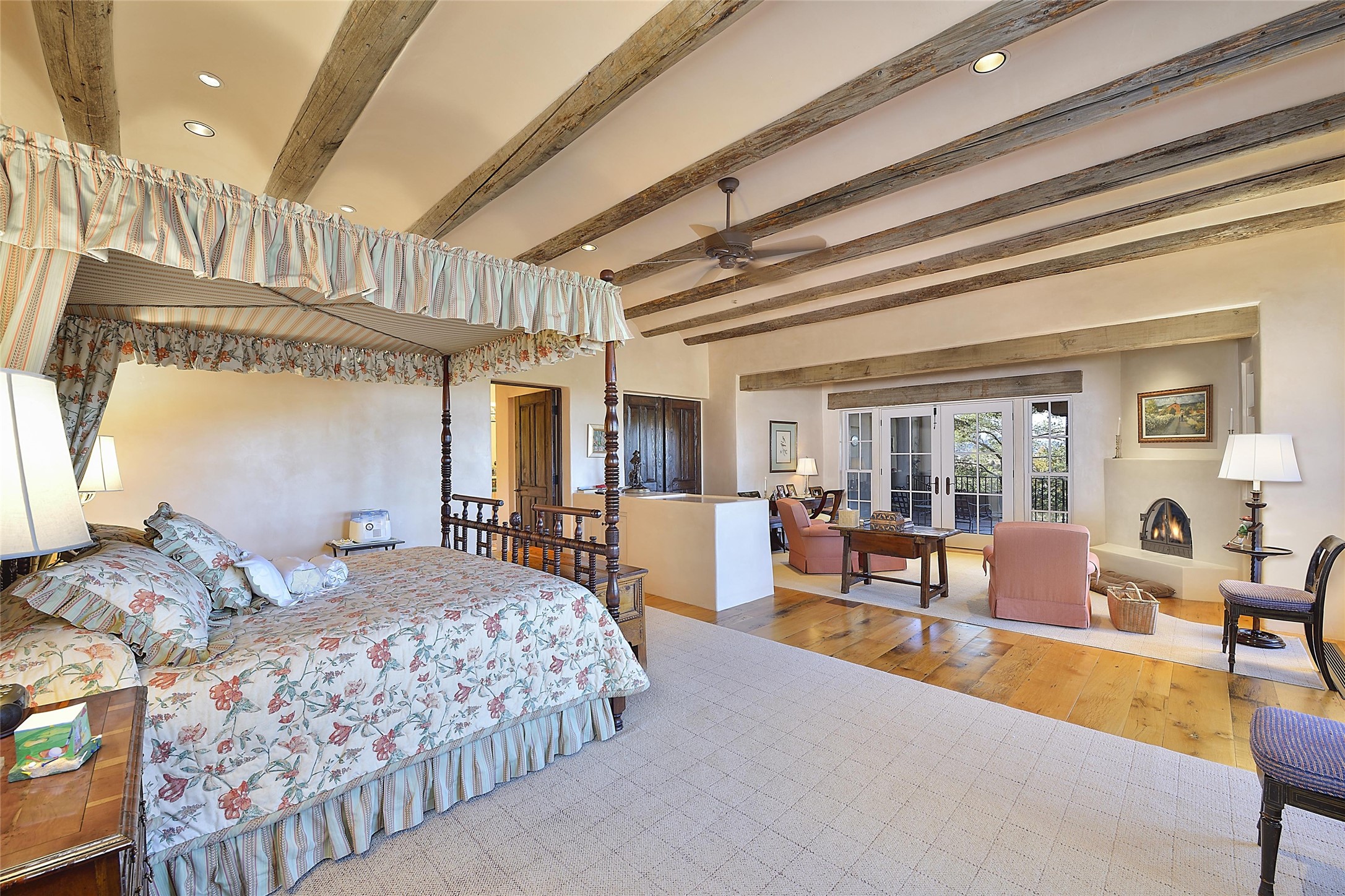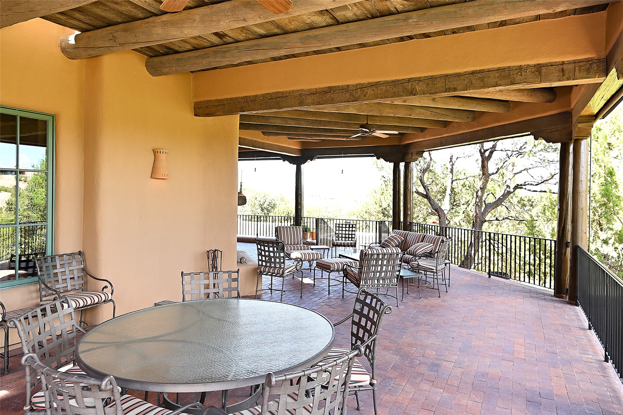 A majestic private getaway in the exclusive community of Las Campanas, the 5.05-acre estate known as Feliciana encompasses an impressive main residence of some 9,588 square feet and an inviting guesthouse of 1,800 square feet with two bedrooms, a great room and kitchen, and its own portal and garage. Equally ideal for grand entertaining and peaceful Santa Fe living, the residence is replete with timeless Southwestern details, including hardwood and brick floors; ceilings with dramatic vigas, beams, and latillas; skylights; bancos; lighted art nichos; and fireplaces in classical and traditional kiva styles. Highlights include a grand living room, formal and casual dining space, a wet bar, a charming kitchen with a butler's pantry and an outdoor grilling area, a secluded owner's suite, a guest wing with its own living area, a pet courtyard and bathing area, and two garages. Ideally sited on the 15th fairway of the Sunrise course, the property offers sweeping golf course, mountain, and sunset views. An array of patios and portales--along with an enviable roof deck--allow for outdoor celebration and relaxation. Mature pines, juniper, aspens, and rolling Southwestern terrain envelop the home, as do numerous outdoor living spaces--both covered and open-air. Mature pines, juniper, aspens, and rolling Southwestern terrain envelop the home, as do numerous outdoor living spaces--both covered and open-air.