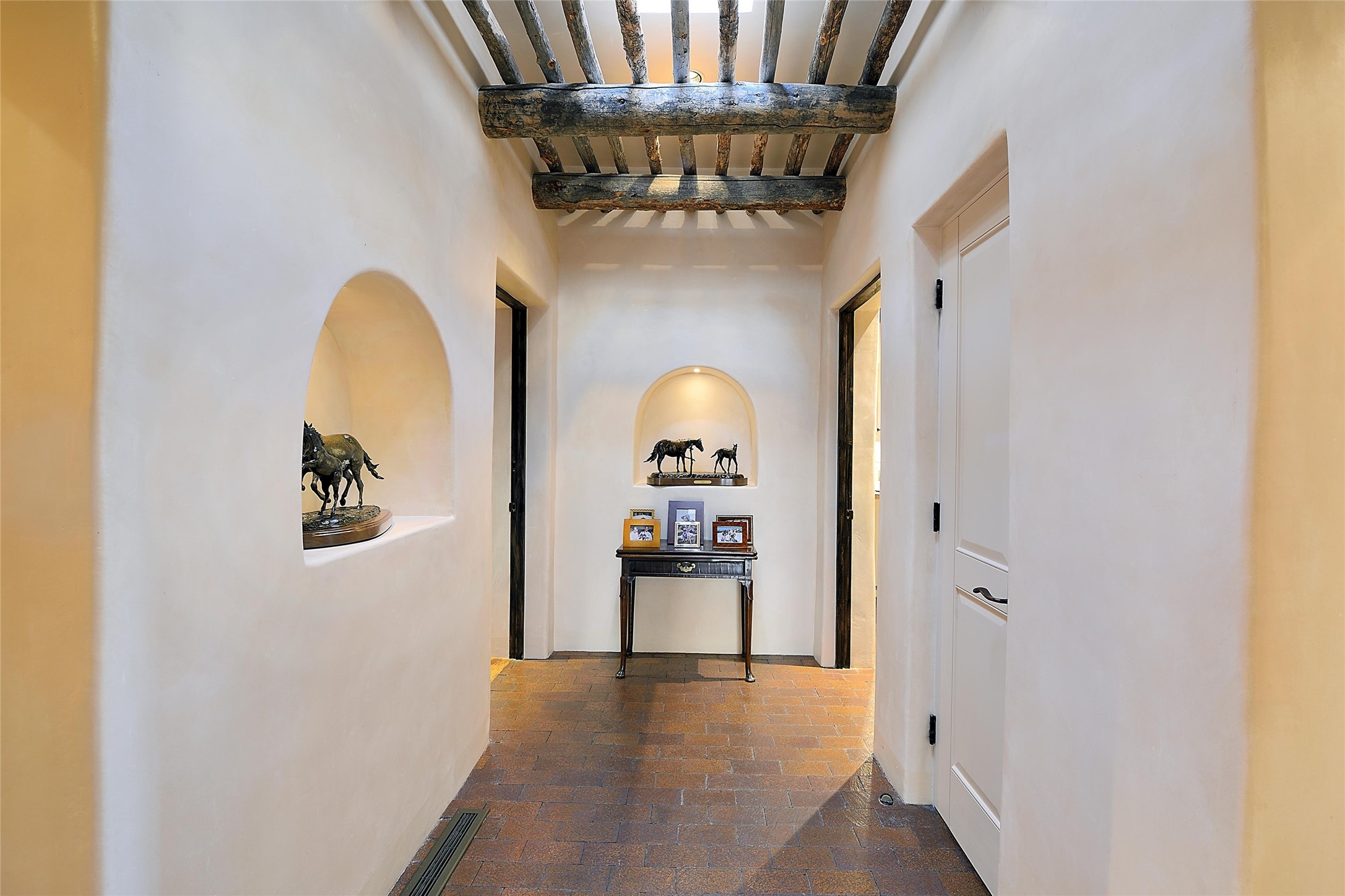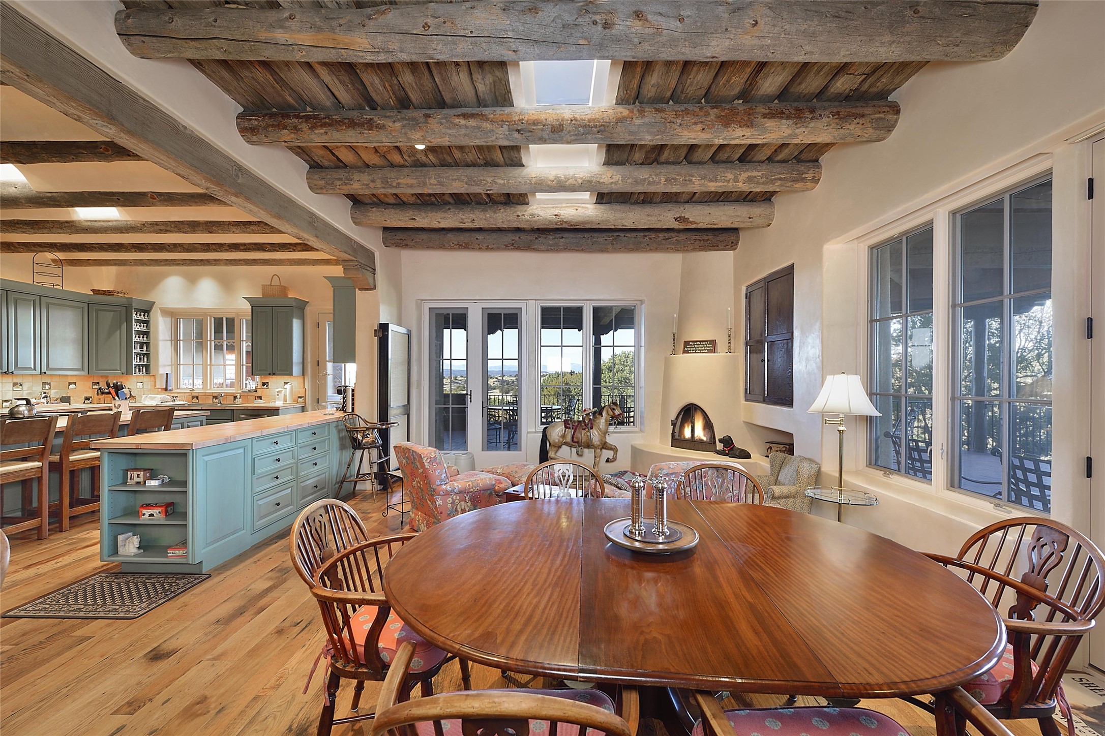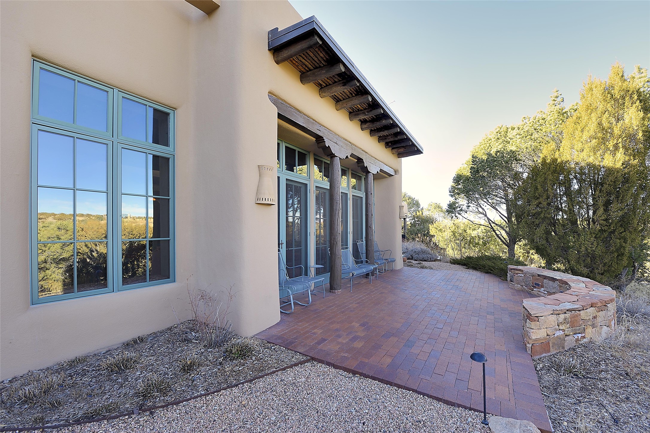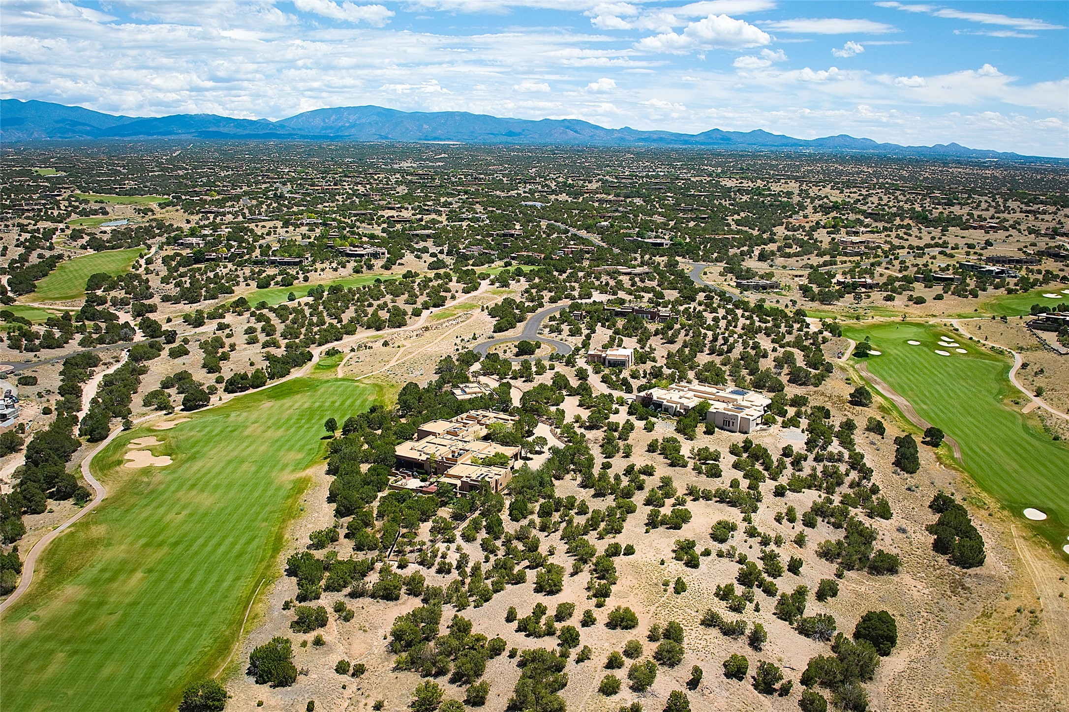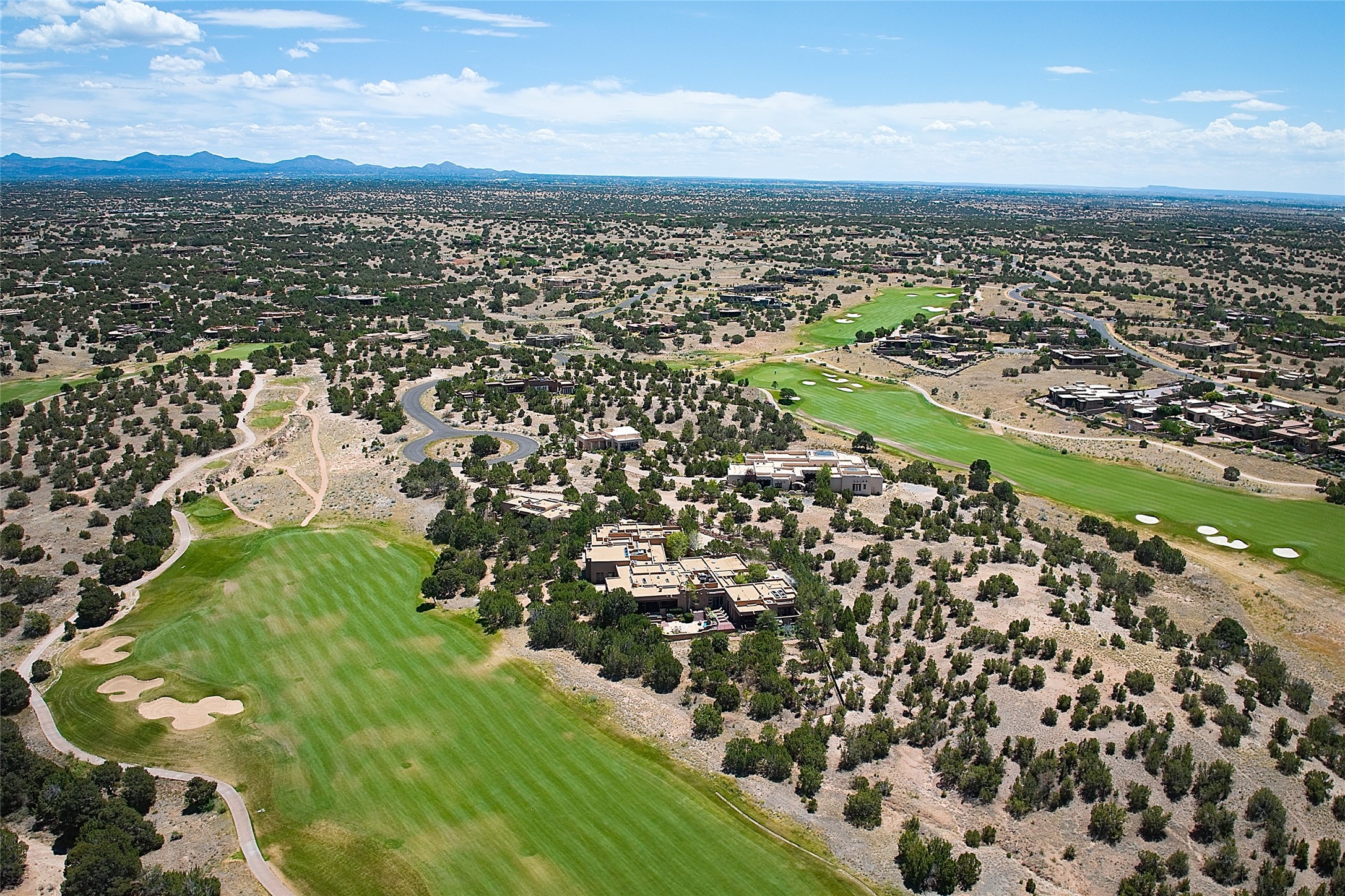 A majestic private getaway in the exclusive community of Las Campanas, the 5.05-acre estate known as Feliciana encompasses an impressive main residence of some 9,588 square feet and an inviting guesthouse of 1,800 square feet with two bedrooms, a great room and kitchen, and its own portal and garage. Equally ideal for grand entertaining and peaceful Santa Fe living, the residence is replete with timeless Southwestern details, including hardwood and brick floors; ceilings with dramatic vigas, beams, and latillas; skylights; bancos; lighted art nichos; and fireplaces in classical and traditional kiva styles. Highlights include a grand living room, formal and casual dining space, a wet bar, a charming kitchen with a butler's pantry and an outdoor grilling area, a secluded owner's suite, a guest wing with its own living area, a pet courtyard and bathing area, and two garages. Ideally sited on the 15th fairway of the Sunrise course, the property offers sweeping golf course, mountain, and sunset views. An array of patios and portales--along with an enviable roof deck--allow for outdoor celebration and relaxation. Mature pines, juniper, aspens, and rolling Southwestern terrain envelop the home, as do numerous outdoor living spaces--both covered and open-air. Mature pines, juniper, aspens, and rolling Southwestern terrain envelop the home, as do numerous outdoor living spaces--both covered and open-air.