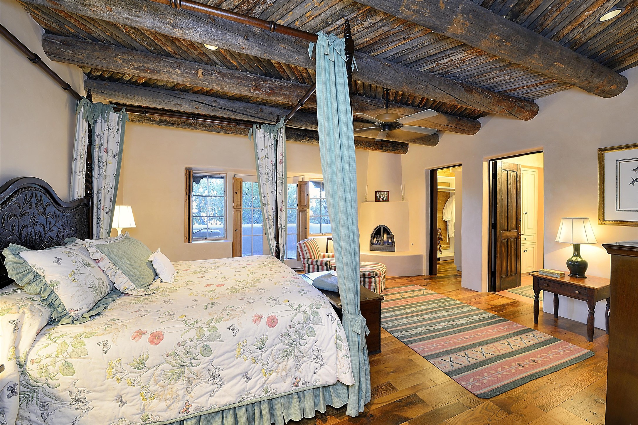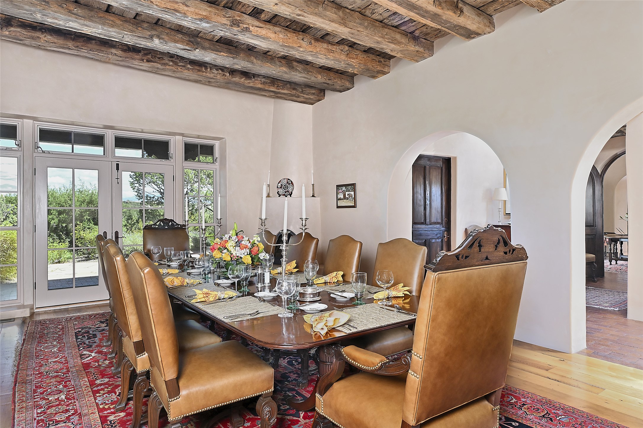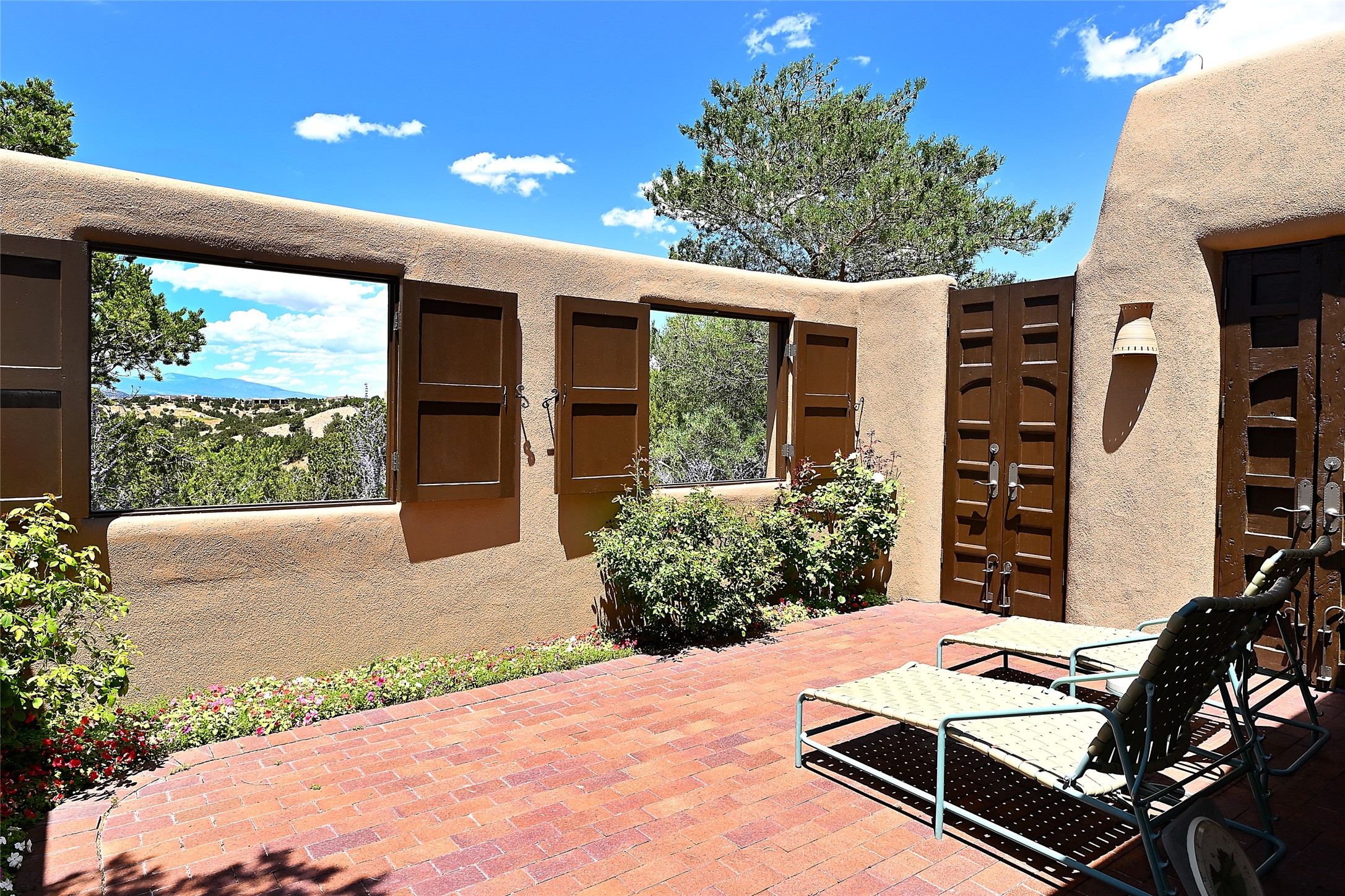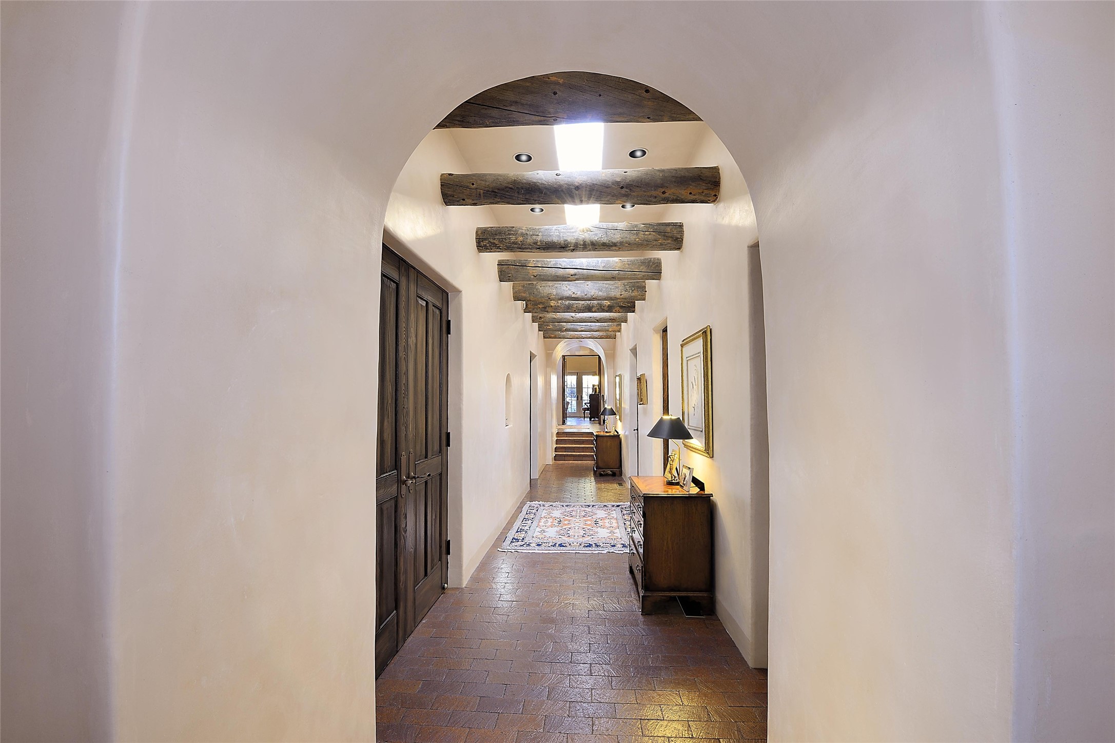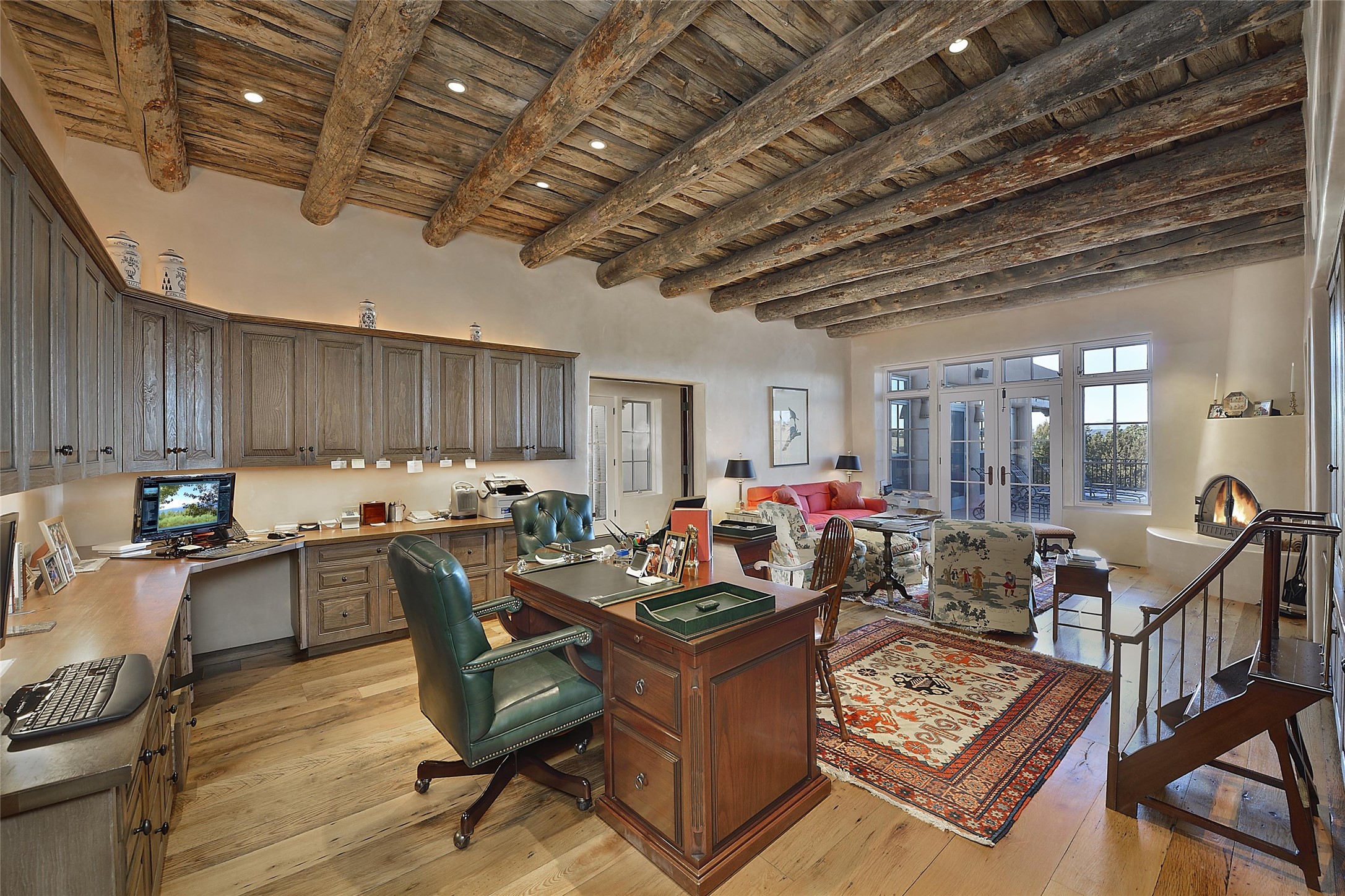 A majestic private getaway in the exclusive community of Las Campanas, the 5.05-acre estate known as Feliciana encompasses an impressive main residence of some 9,588 square feet and an inviting guesthouse of 1,800 square feet with two bedrooms, a great room and kitchen, and its own portal and garage. Equally ideal for grand entertaining and peaceful Santa Fe living, the residence is replete with timeless Southwestern details, including hardwood and brick floors; ceilings with dramatic vigas, beams, and latillas; skylights; bancos; lighted art nichos; and fireplaces in classical and traditional kiva styles. Highlights include a grand living room, formal and casual dining space, a wet bar, a charming kitchen with a butler's pantry and an outdoor grilling area, a secluded owner's suite, a guest wing with its own living area, a pet courtyard and bathing area, and two garages. Ideally sited on the 15th fairway of the Sunrise course, the property offers sweeping golf course, mountain, and sunset views. An array of patios and portales--along with an enviable roof deck--allow for outdoor celebration and relaxation. Mature pines, juniper, aspens, and rolling Southwestern terrain envelop the home, as do numerous outdoor living spaces--both covered and open-air. Mature pines, juniper, aspens, and rolling Southwestern terrain envelop the home, as do numerous outdoor living spaces--both covered and open-air.