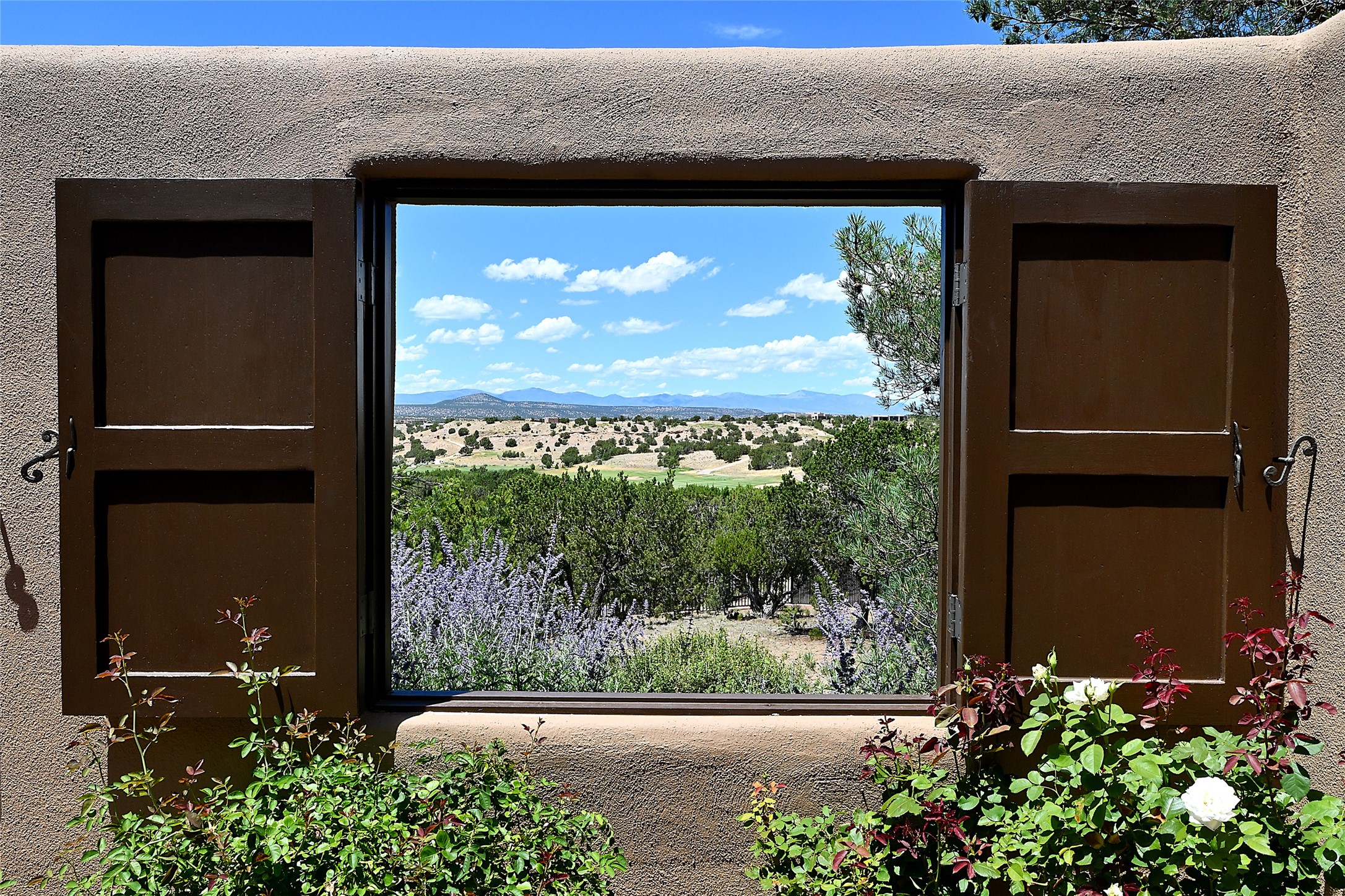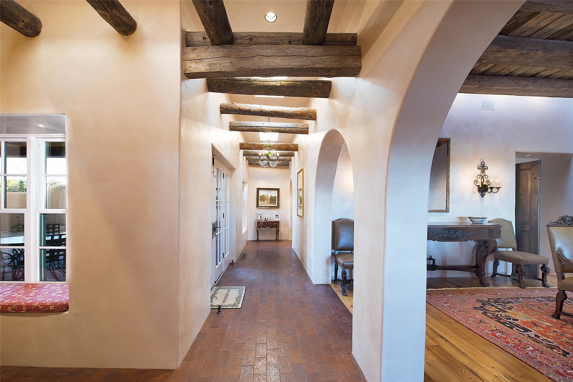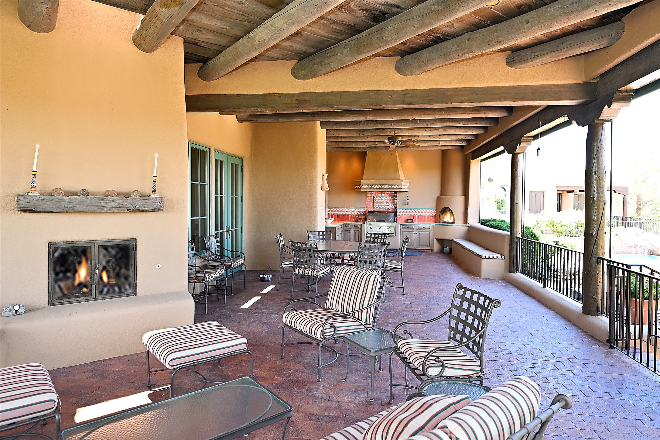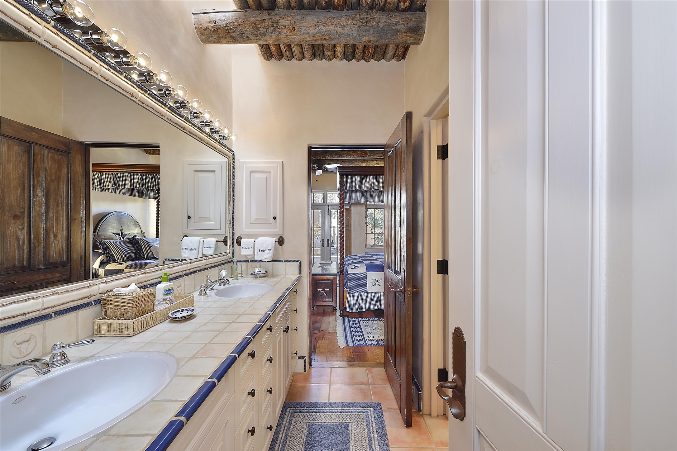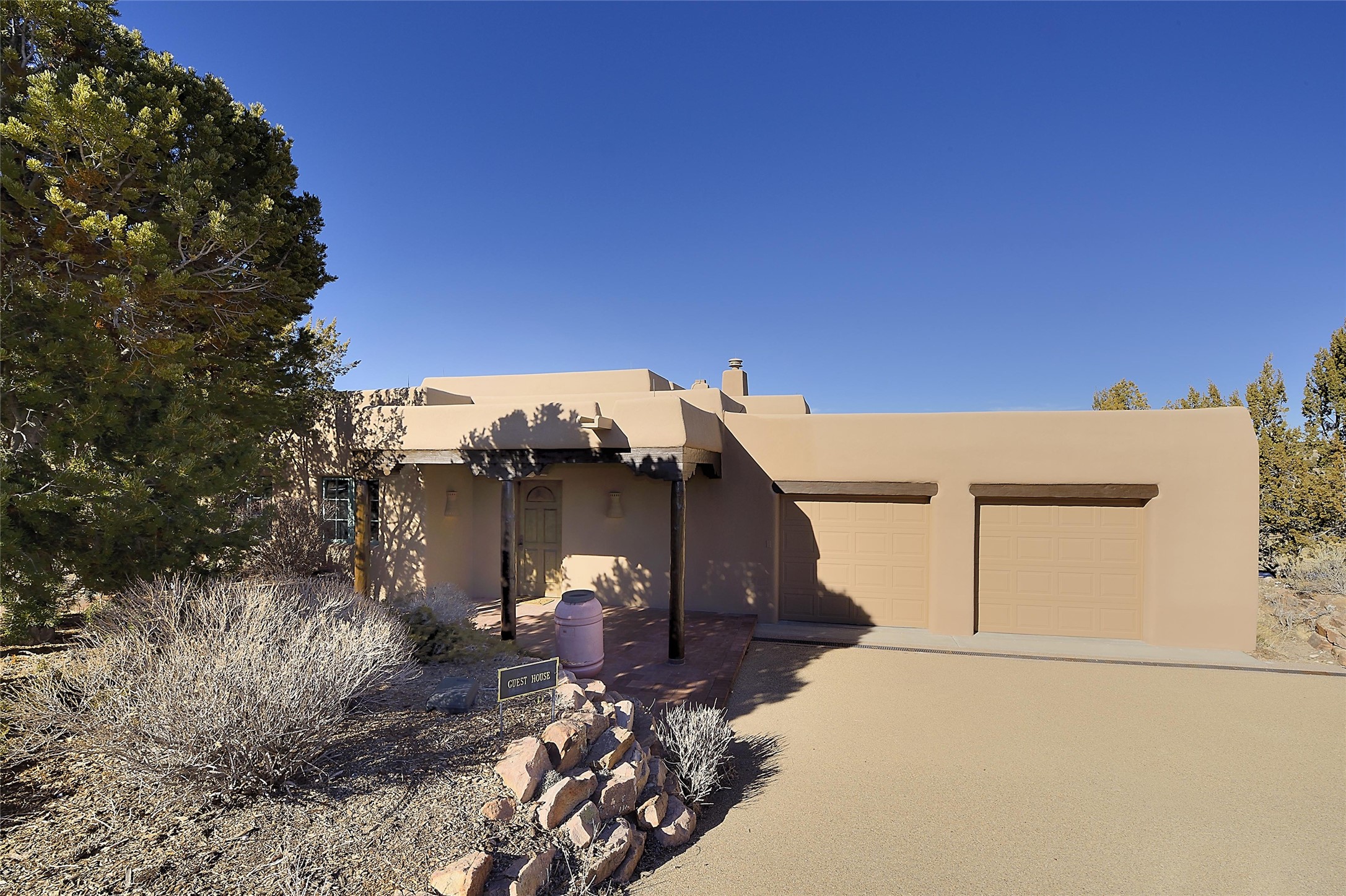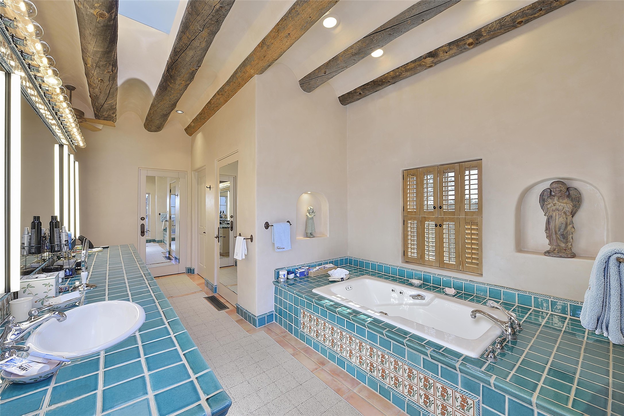 A majestic private getaway in the exclusive community of Las Campanas, the 5.05-acre estate known as Feliciana encompasses an impressive main residence of some 9,588 square feet and an inviting guesthouse of 1,800 square feet with two bedrooms, a great room and kitchen, and its own portal and garage. Equally ideal for grand entertaining and peaceful Santa Fe living, the residence is replete with timeless Southwestern details, including hardwood and brick floors; ceilings with dramatic vigas, beams, and latillas; skylights; bancos; lighted art nichos; and fireplaces in classical and traditional kiva styles. Highlights include a grand living room, formal and casual dining space, a wet bar, a charming kitchen with a butler's pantry and an outdoor grilling area, a secluded owner's suite, a guest wing with its own living area, a pet courtyard and bathing area, and two garages. Ideally sited on the 15th fairway of the Sunrise course, the property offers sweeping golf course, mountain, and sunset views. An array of patios and portales--along with an enviable roof deck--allow for outdoor celebration and relaxation. Mature pines, juniper, aspens, and rolling Southwestern terrain envelop the home, as do numerous outdoor living spaces--both covered and open-air. Mature pines, juniper, aspens, and rolling Southwestern terrain envelop the home, as do numerous outdoor living spaces--both covered and open-air.
