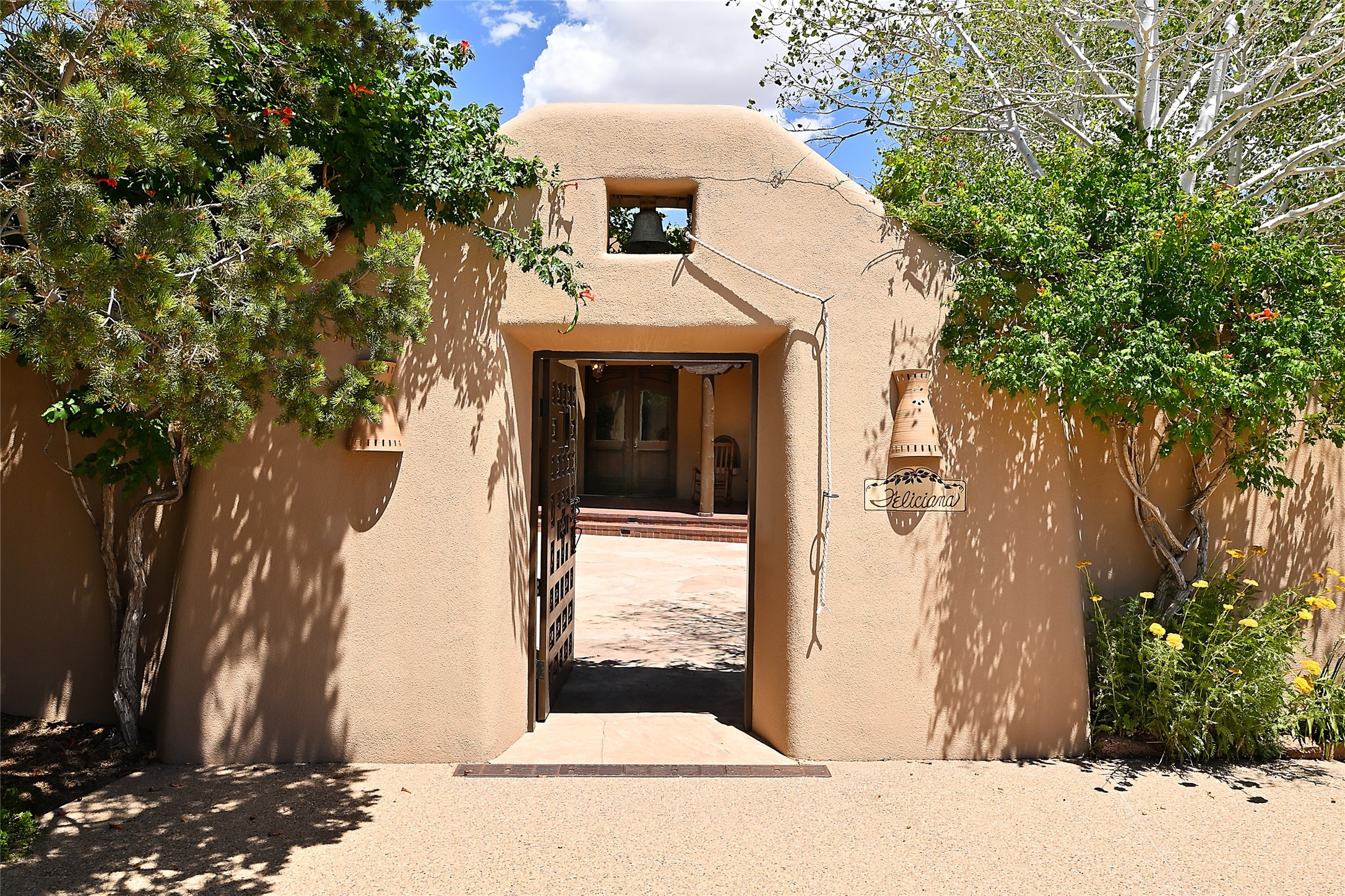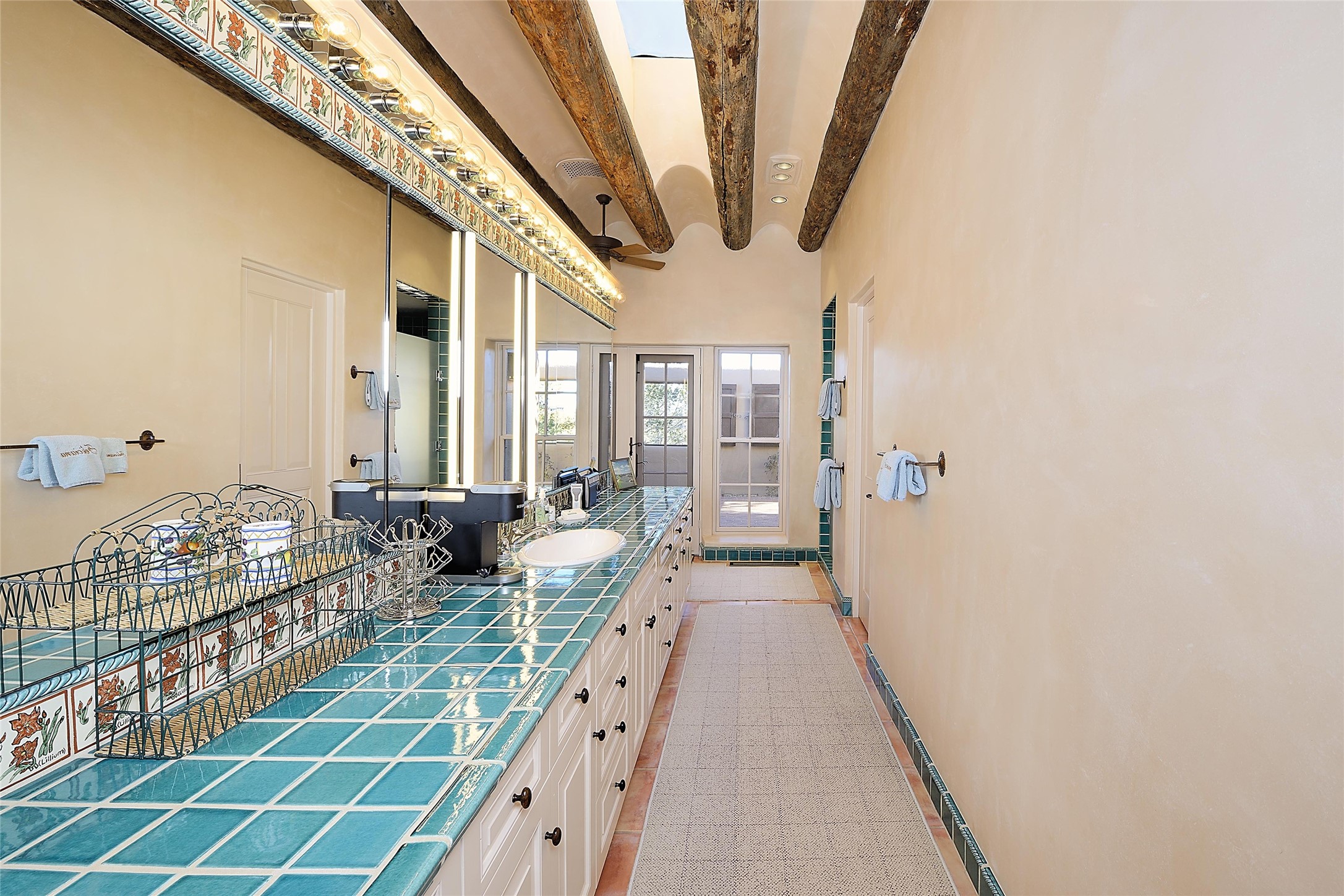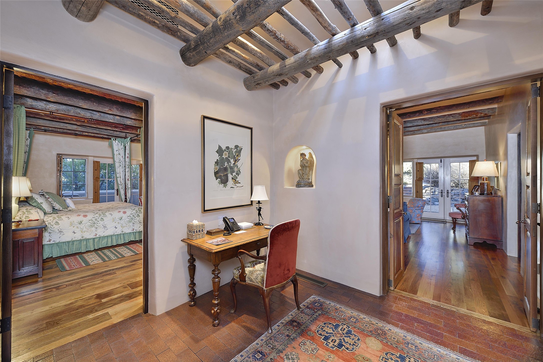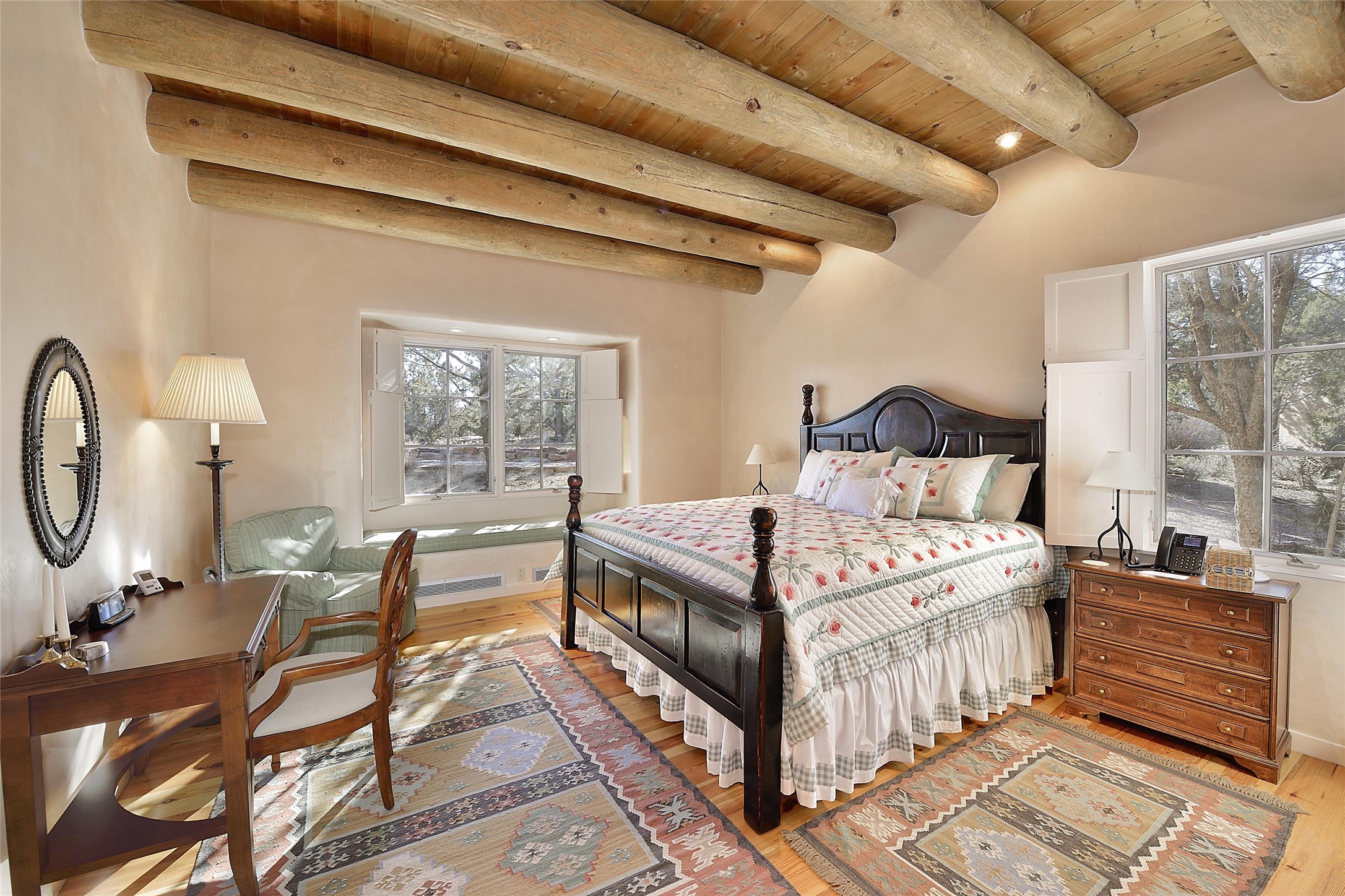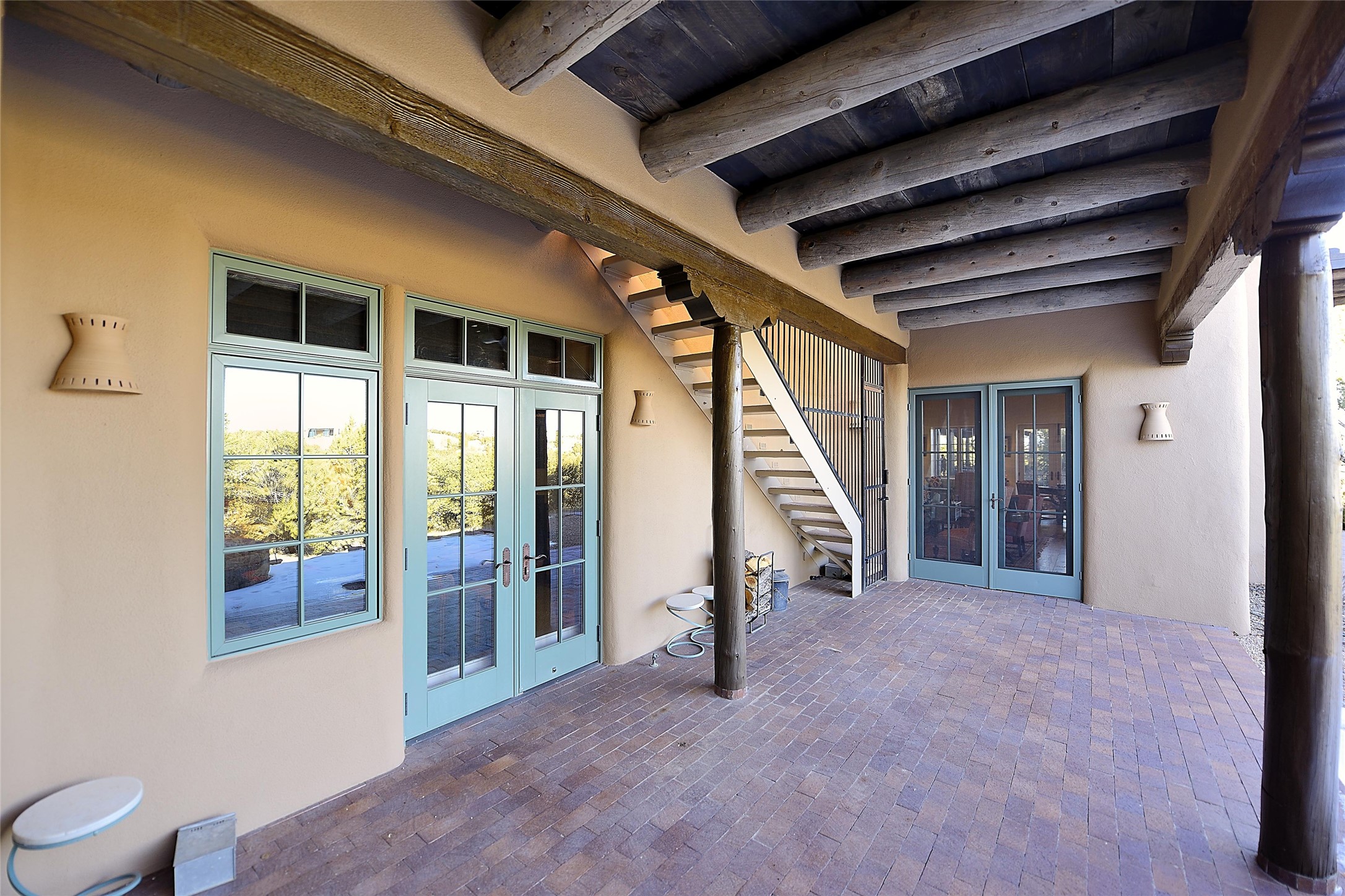 A majestic private getaway in the exclusive community of Las Campanas, the 5.05-acre estate known as Feliciana encompasses an impressive main residence of some 9,588 square feet and an inviting guesthouse of 1,800 square feet with two bedrooms, a great room and kitchen, and its own portal and garage. Equally ideal for grand entertaining and peaceful Santa Fe living, the residence is replete with timeless Southwestern details, including hardwood and brick floors; ceilings with dramatic vigas, beams, and latillas; skylights; bancos; lighted art nichos; and fireplaces in classical and traditional kiva styles. Highlights include a grand living room, formal and casual dining space, a wet bar, a charming kitchen with a butler's pantry and an outdoor grilling area, a secluded owner's suite, a guest wing with its own living area, a pet courtyard and bathing area, and two garages. Ideally sited on the 15th fairway of the Sunrise course, the property offers sweeping golf course, mountain, and sunset views. An array of patios and portales--along with an enviable roof deck--allow for outdoor celebration and relaxation. Mature pines, juniper, aspens, and rolling Southwestern terrain envelop the home, as do numerous outdoor living spaces--both covered and open-air. Mature pines, juniper, aspens, and rolling Southwestern terrain envelop the home, as do numerous outdoor living spaces--both covered and open-air.