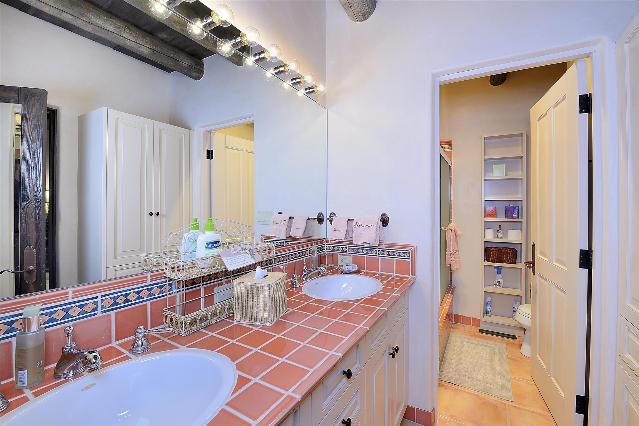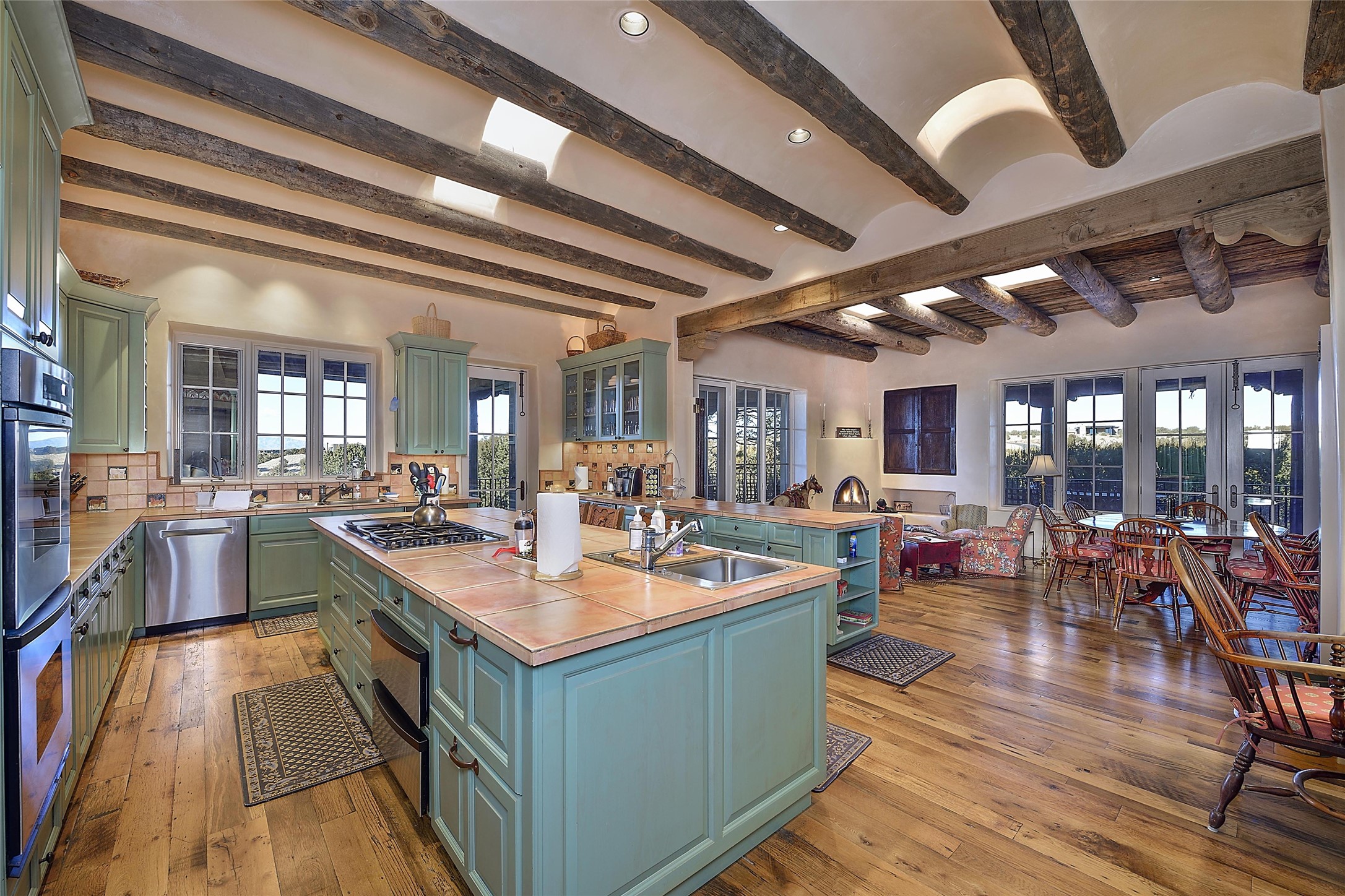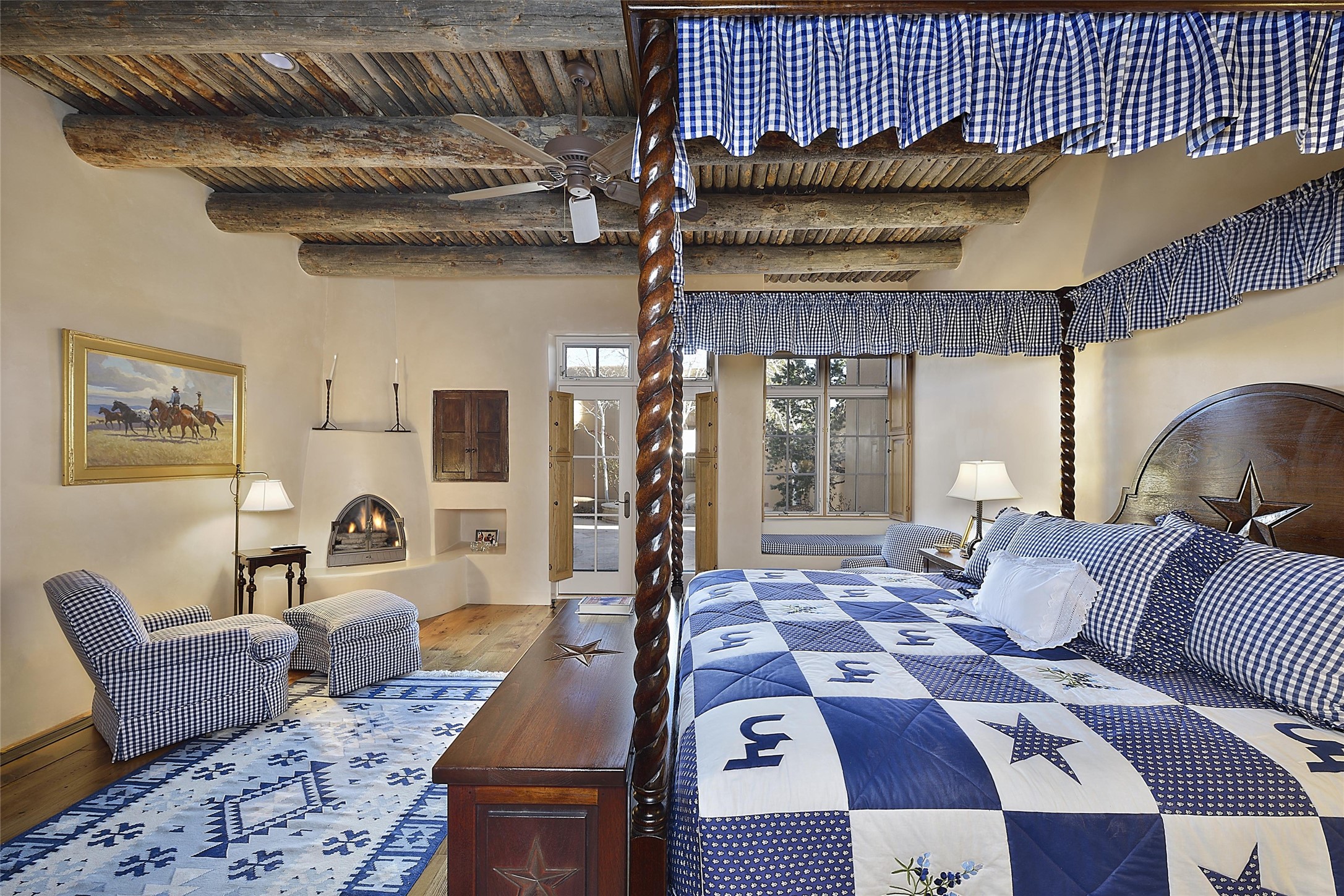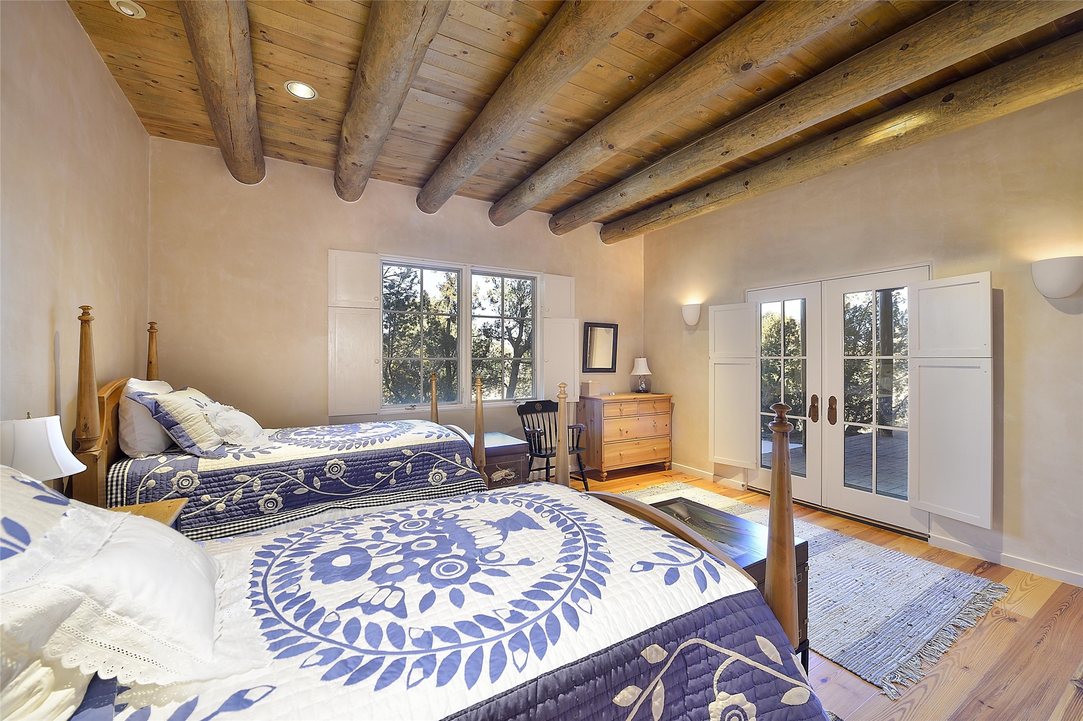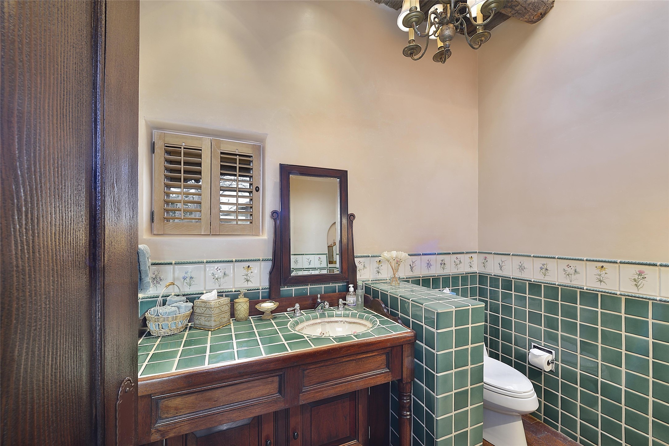 A majestic private getaway in the exclusive community of Las Campanas, the 5.05-acre estate known as Feliciana encompasses an impressive main residence of some 9,588 square feet and an inviting guesthouse of 1,800 square feet with two bedrooms, a great room and kitchen, and its own portal and garage. Equally ideal for grand entertaining and peaceful Santa Fe living, the residence is replete with timeless Southwestern details, including hardwood and brick floors; ceilings with dramatic vigas, beams, and latillas; skylights; bancos; lighted art nichos; and fireplaces in classical and traditional kiva styles. Highlights include a grand living room, formal and casual dining space, a wet bar, a charming kitchen with a butler's pantry and an outdoor grilling area, a secluded owner's suite, a guest wing with its own living area, a pet courtyard and bathing area, and two garages. Ideally sited on the 15th fairway of the Sunrise course, the property offers sweeping golf course, mountain, and sunset views. An array of patios and portales--along with an enviable roof deck--allow for outdoor celebration and relaxation. Mature pines, juniper, aspens, and rolling Southwestern terrain envelop the home, as do numerous outdoor living spaces--both covered and open-air. Mature pines, juniper, aspens, and rolling Southwestern terrain envelop the home, as do numerous outdoor living spaces--both covered and open-air.