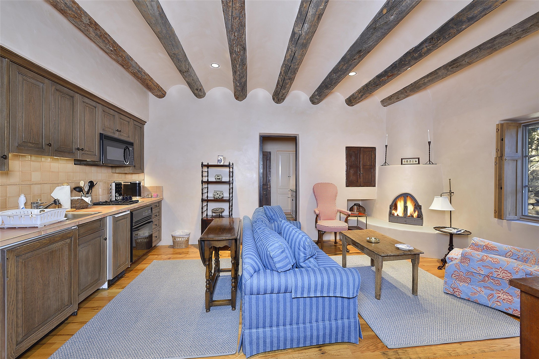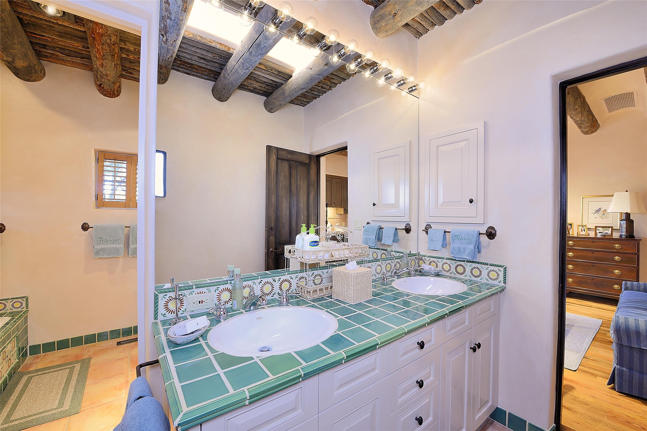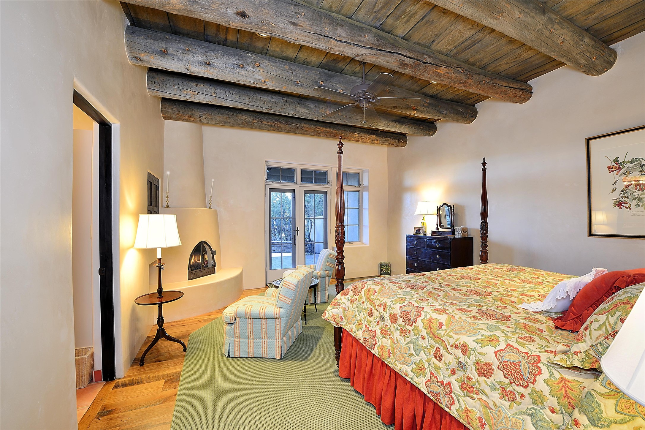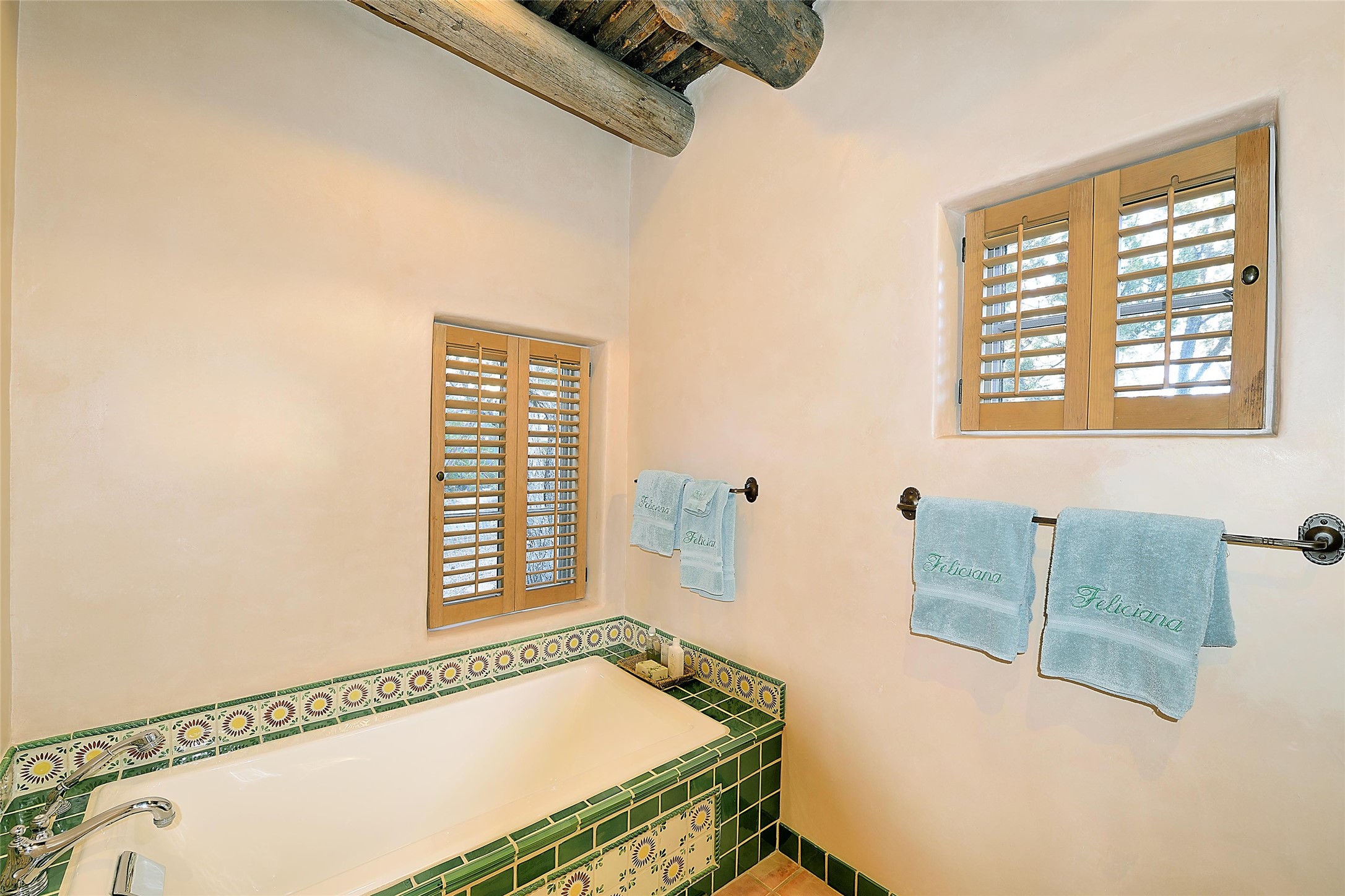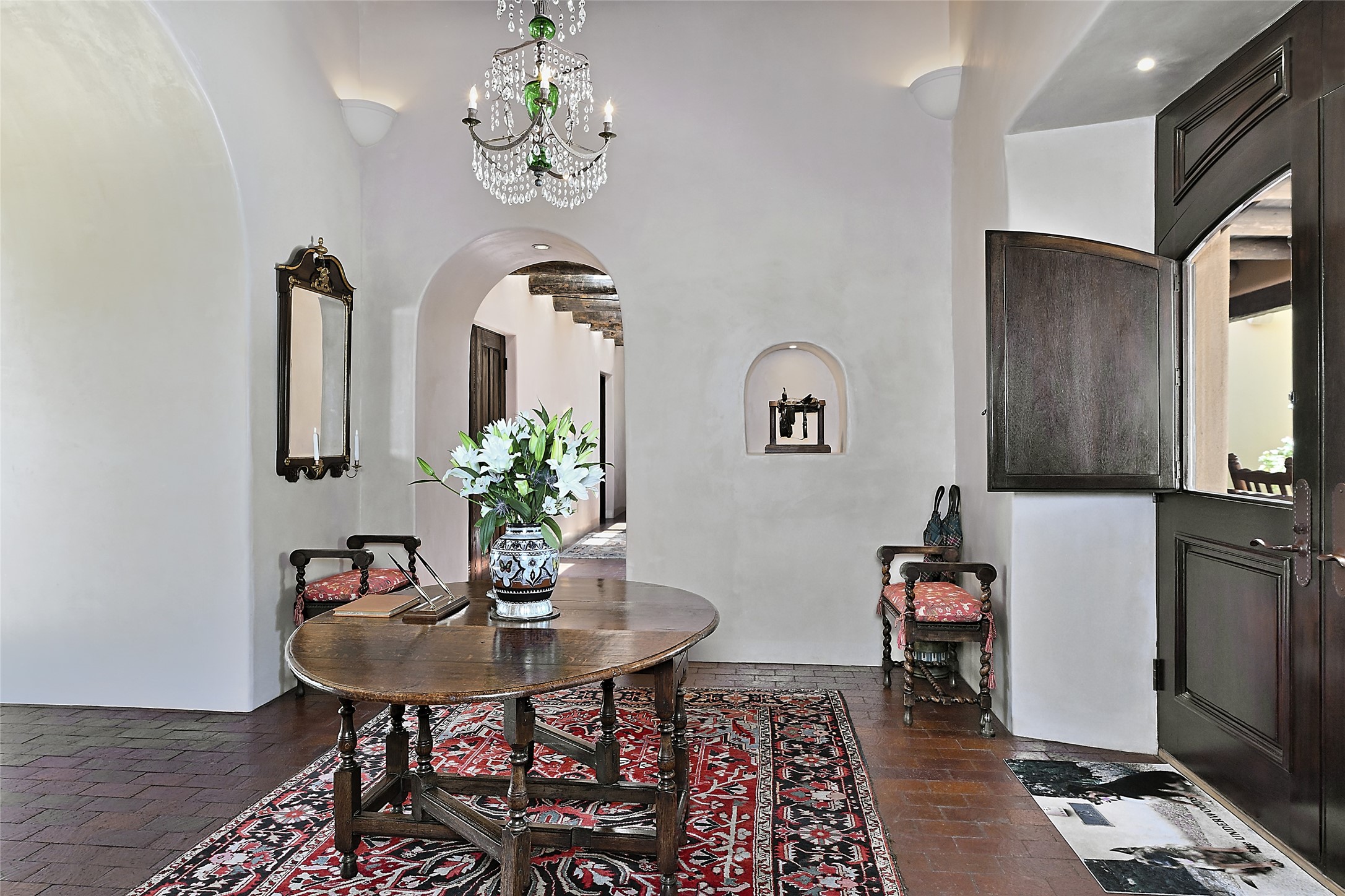 A majestic private getaway in the exclusive community of Las Campanas, the 5.05-acre estate known as Feliciana encompasses an impressive main residence of some 9,588 square feet and an inviting guesthouse of 1,800 square feet with two bedrooms, a great room and kitchen, and its own portal and garage. Equally ideal for grand entertaining and peaceful Santa Fe living, the residence is replete with timeless Southwestern details, including hardwood and brick floors; ceilings with dramatic vigas, beams, and latillas; skylights; bancos; lighted art nichos; and fireplaces in classical and traditional kiva styles. Highlights include a grand living room, formal and casual dining space, a wet bar, a charming kitchen with a butler's pantry and an outdoor grilling area, a secluded owner's suite, a guest wing with its own living area, a pet courtyard and bathing area, and two garages. Ideally sited on the 15th fairway of the Sunrise course, the property offers sweeping golf course, mountain, and sunset views. An array of patios and portales--along with an enviable roof deck--allow for outdoor celebration and relaxation. Mature pines, juniper, aspens, and rolling Southwestern terrain envelop the home, as do numerous outdoor living spaces--both covered and open-air. Mature pines, juniper, aspens, and rolling Southwestern terrain envelop the home, as do numerous outdoor living spaces--both covered and open-air.