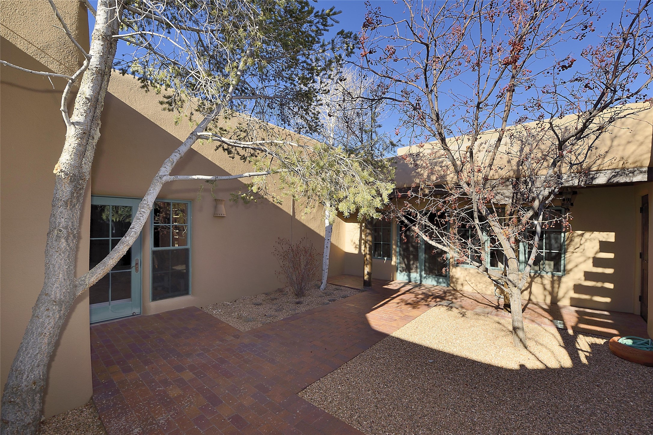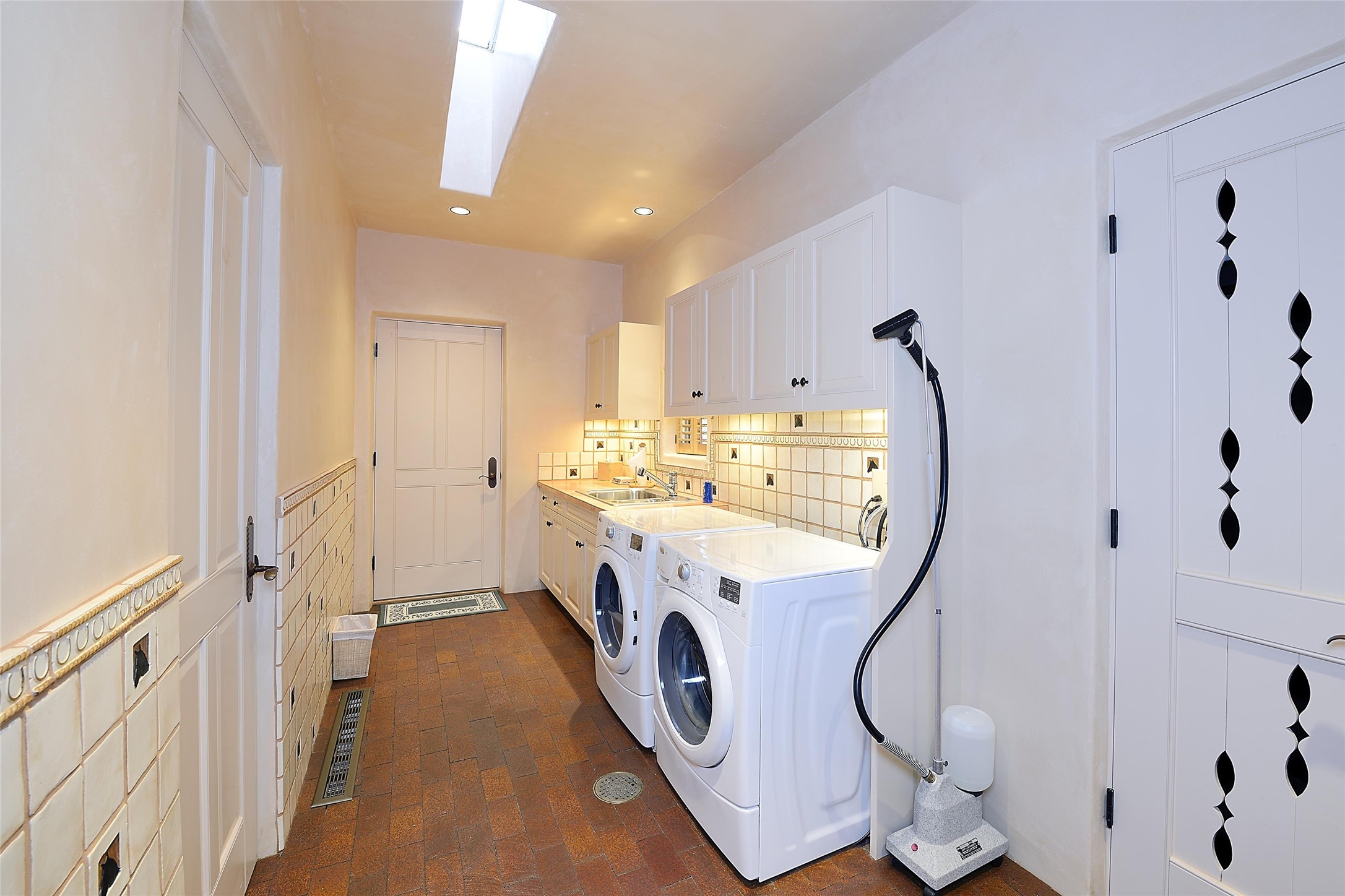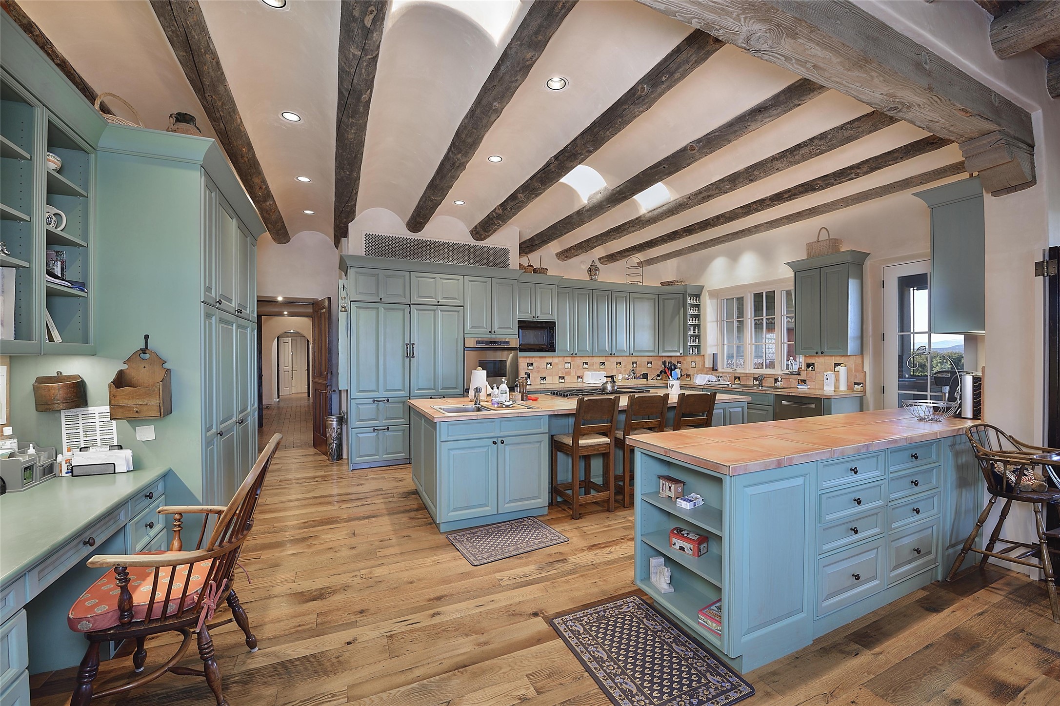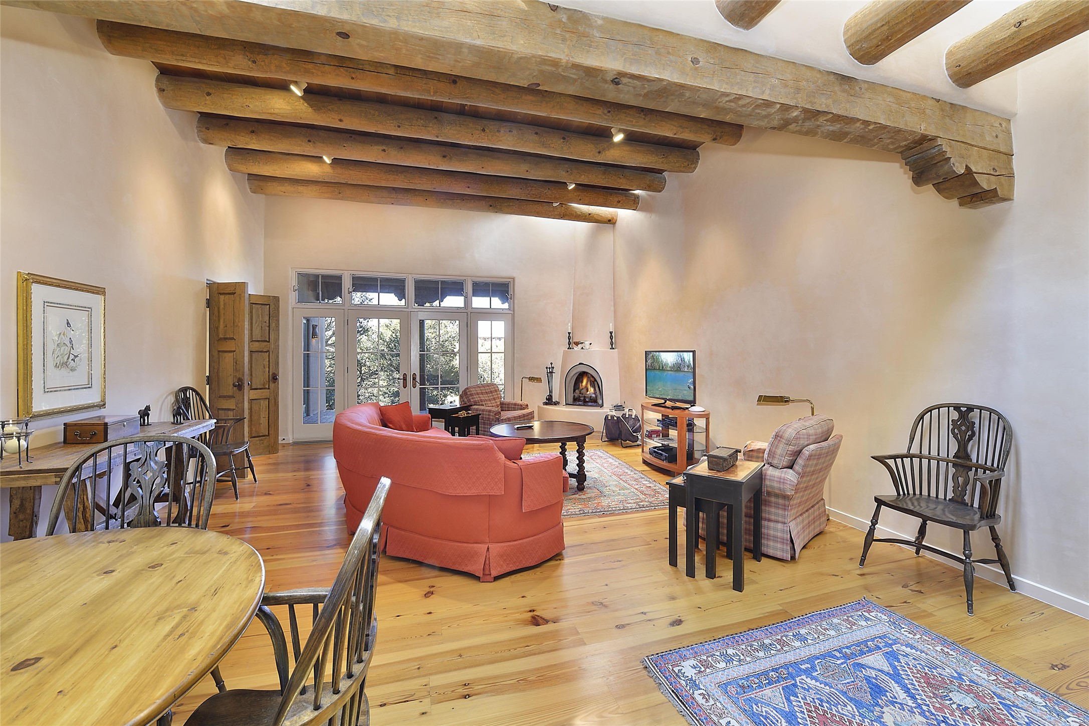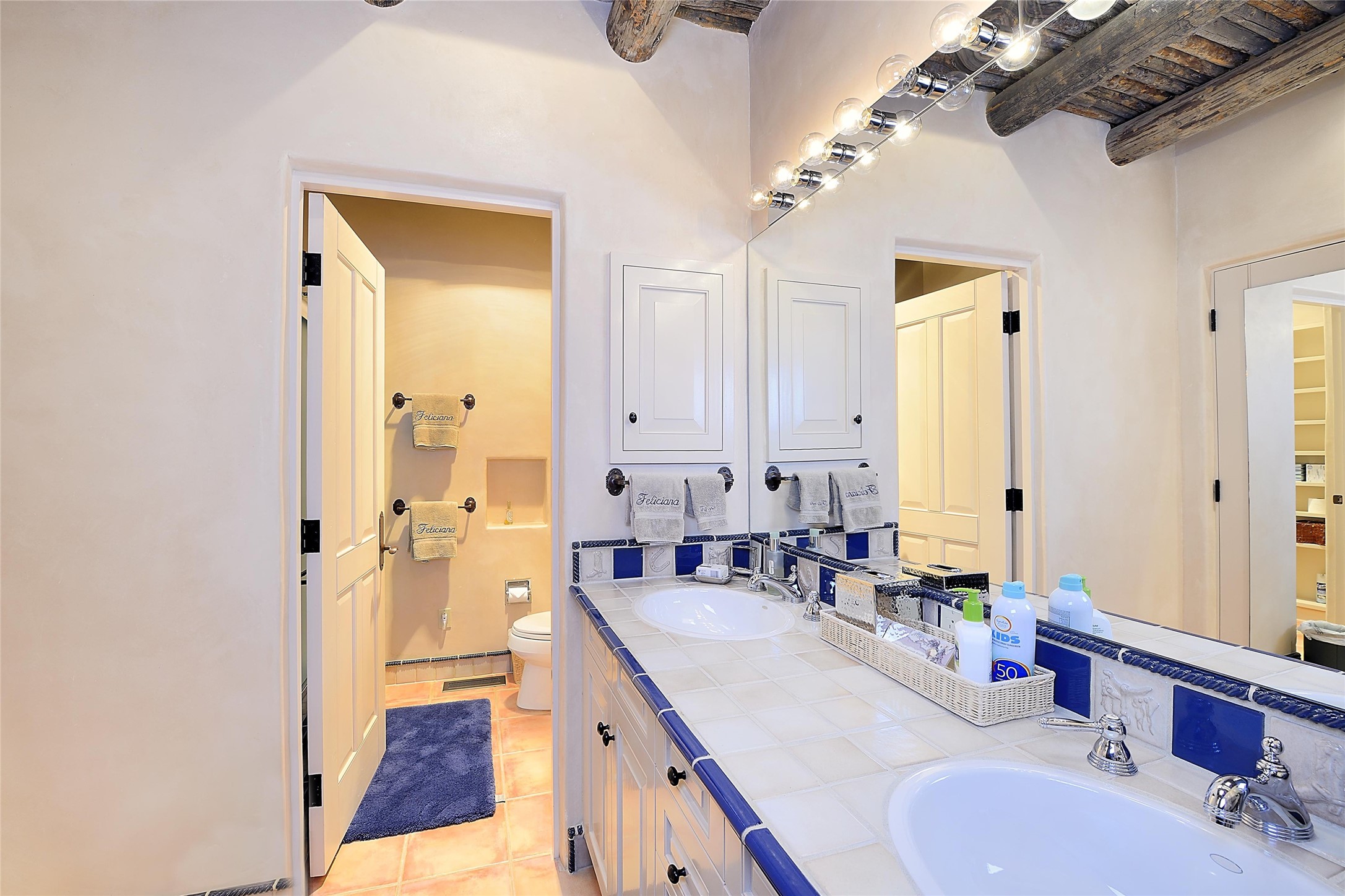 A majestic private getaway in the exclusive community of Las Campanas, the 5.05-acre estate known as Feliciana encompasses an impressive main residence of some 9,588 square feet and an inviting guesthouse of 1,800 square feet with two bedrooms, a great room and kitchen, and its own portal and garage. Equally ideal for grand entertaining and peaceful Santa Fe living, the residence is replete with timeless Southwestern details, including hardwood and brick floors; ceilings with dramatic vigas, beams, and latillas; skylights; bancos; lighted art nichos; and fireplaces in classical and traditional kiva styles. Highlights include a grand living room, formal and casual dining space, a wet bar, a charming kitchen with a butler's pantry and an outdoor grilling area, a secluded owner's suite, a guest wing with its own living area, a pet courtyard and bathing area, and two garages. Ideally sited on the 15th fairway of the Sunrise course, the property offers sweeping golf course, mountain, and sunset views. An array of patios and portales--along with an enviable roof deck--allow for outdoor celebration and relaxation. Mature pines, juniper, aspens, and rolling Southwestern terrain envelop the home, as do numerous outdoor living spaces--both covered and open-air. Mature pines, juniper, aspens, and rolling Southwestern terrain envelop the home, as do numerous outdoor living spaces--both covered and open-air.