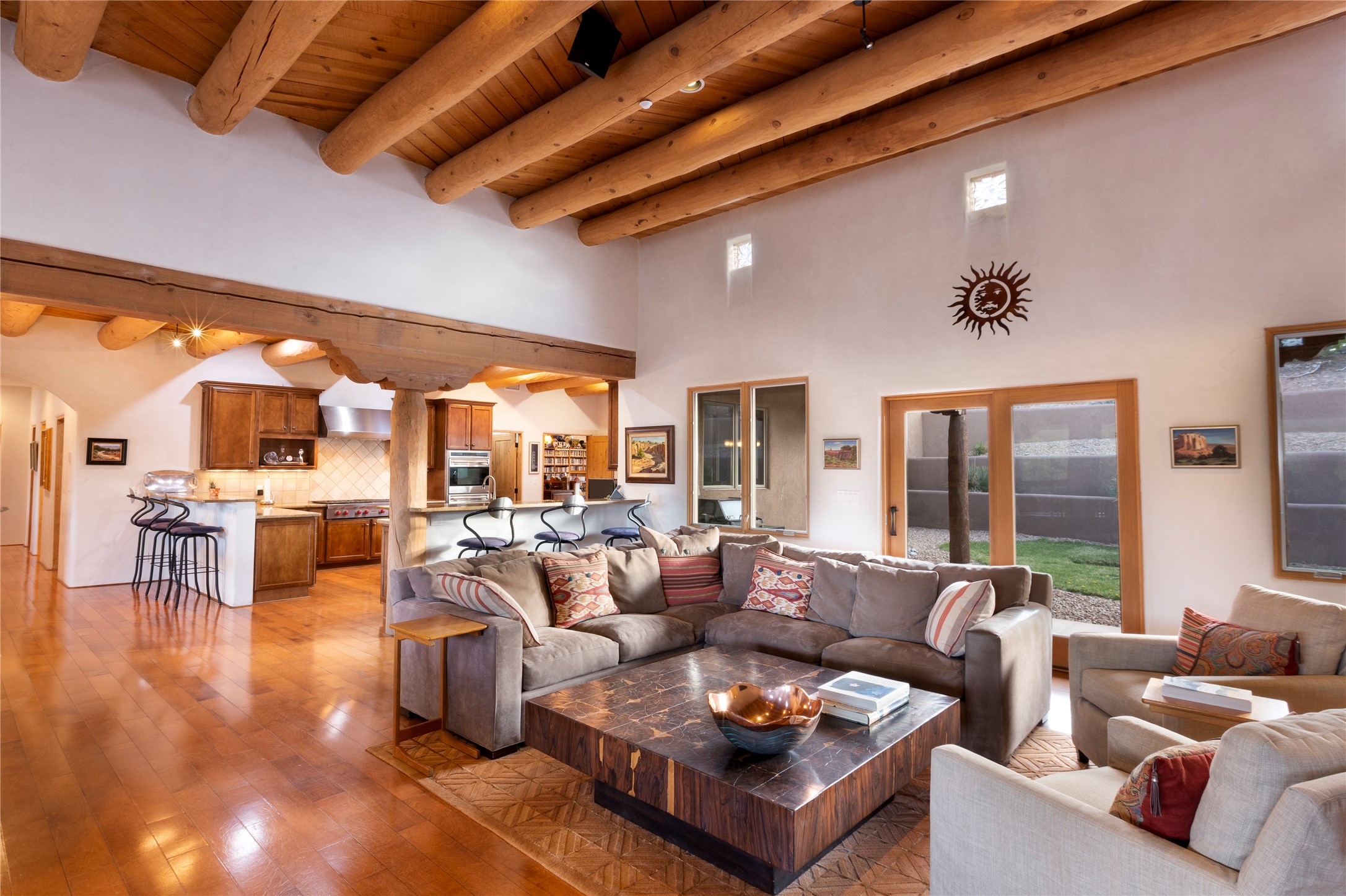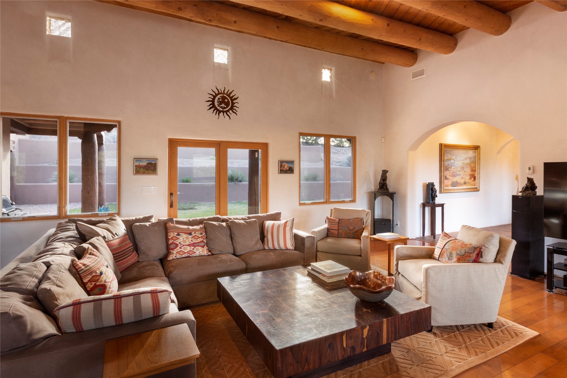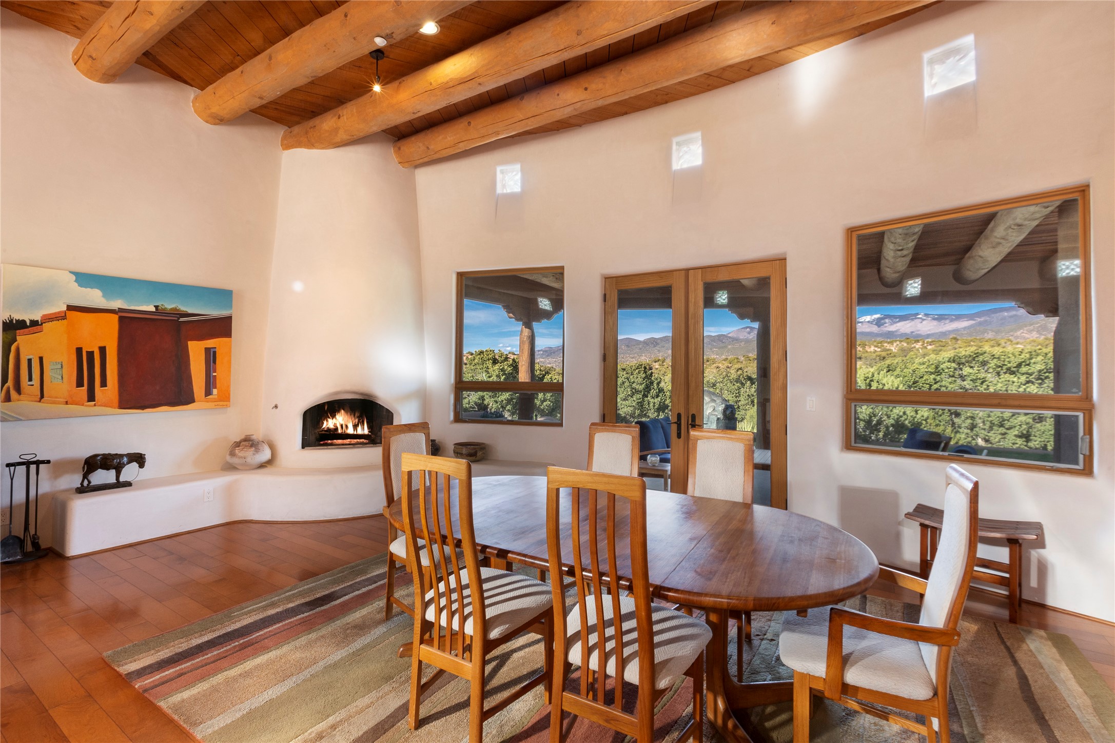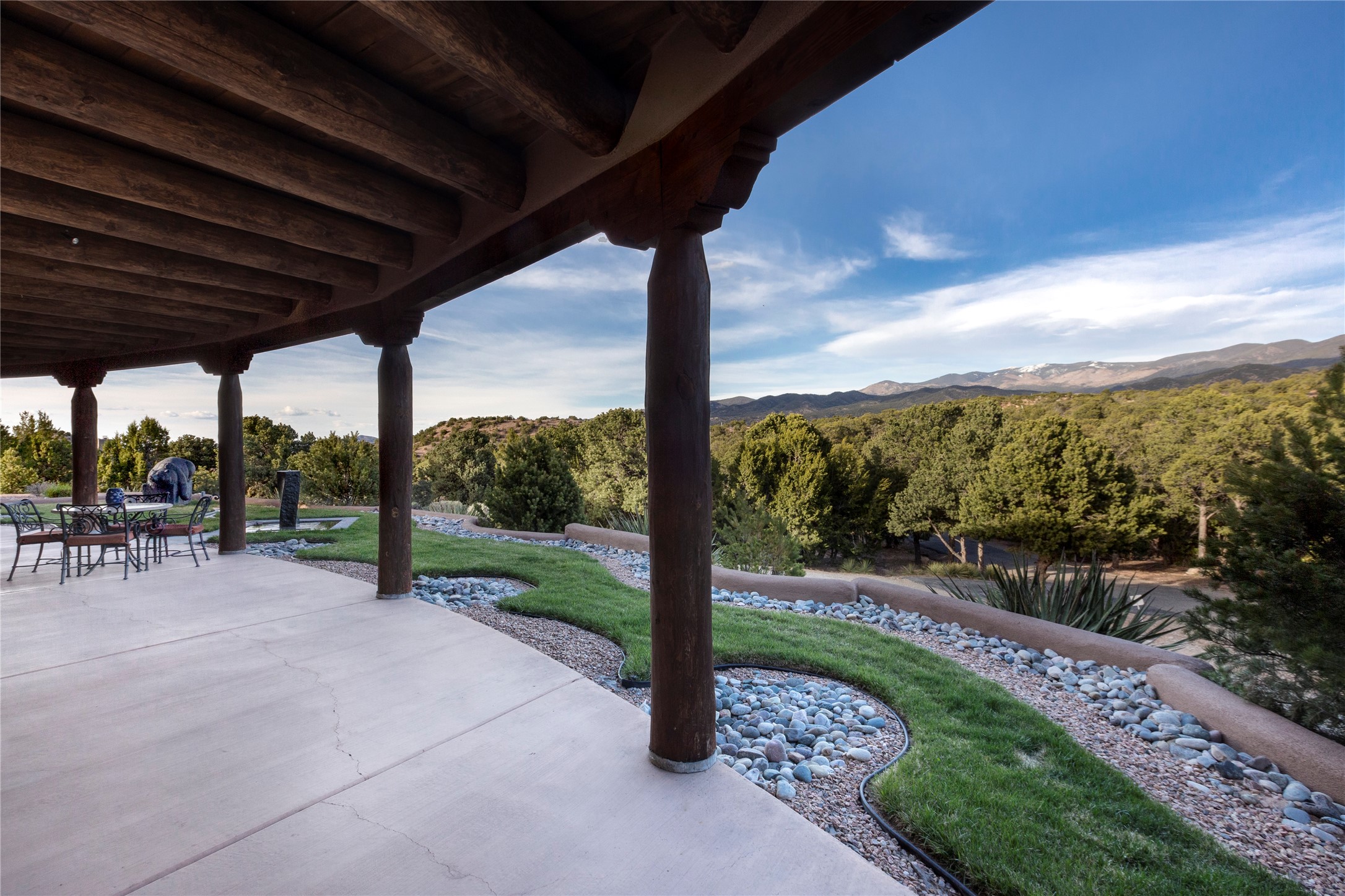 Buyers in this price range deserve a view of our wonderful mountains....but why bother with a house if the view doesn't make your heart stop? In this case, seeing is believing! Of course, it's also all about location: this tucked away subdivision is just 8 minutes to our Plaza and 5 minutes to the Opera: living here offers quiet and serenity plus proximity! When you drive past the gate you'll be wowed by the amazing mountain views, and the location of #59 promises the best of inspiring sunrises, spirit-raising Sangre de Cristo vistas, rosy reflected sunsets and clear moonlit evenings. The house, with 4400 sq ft, offers grand open spaces and private retreats, all single level with no steps to trip you up. Over 2000 sq ft of portals, which are so grand they are really outdoor living rooms, and with portals this size you can have parties for 2 or 20! The mountain views are always with you, both inside and outside! The cook's kitchen will be the envy of your friends with double ovens, subzero refrigerator and oversized wolf gas range...plus over 50' of granite counters - and a pantry of course. Beyond the kitchen you'll find the game room & bar, another ideal gathering space complete with pool table and kiva fireplace. Have you always wanted a wine room? this one will impress any oenophile. Your friends & family will love their generous guest rooms, completely en-suite with walk-in closets, plus private access to the portal. And then - main bedroom - you'll walk in and say "I could live in just this room"! This is a wonderful, spacious, private retreat, complete with its' own portal plus hot tub! Details abound with custom work such as over-sized vigas to support the large span of high ceilings and hand-crafted fireplaces so special they will make you smile. Viewing this house is a special introduction to a lovely home and spectacular - breath taking views! To own this house will make your life a daily pleasure! Why not experience Santa Fe at its' best?