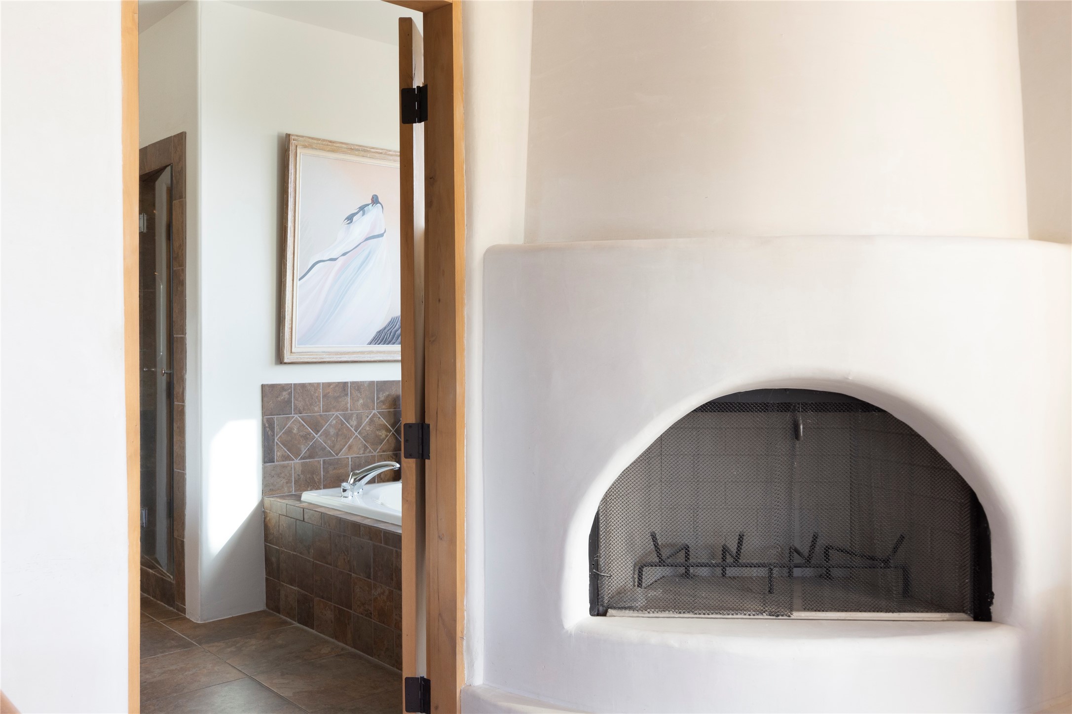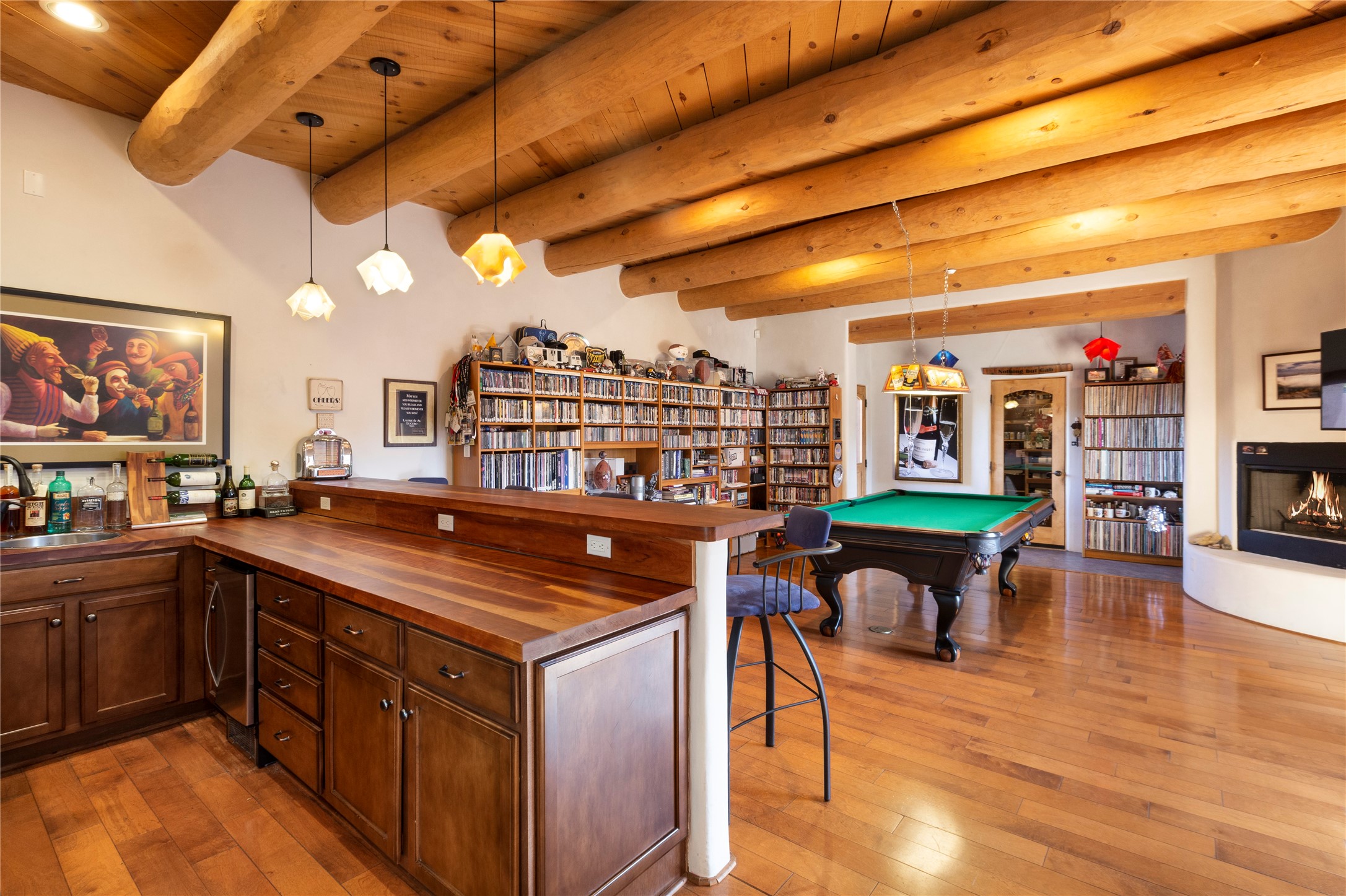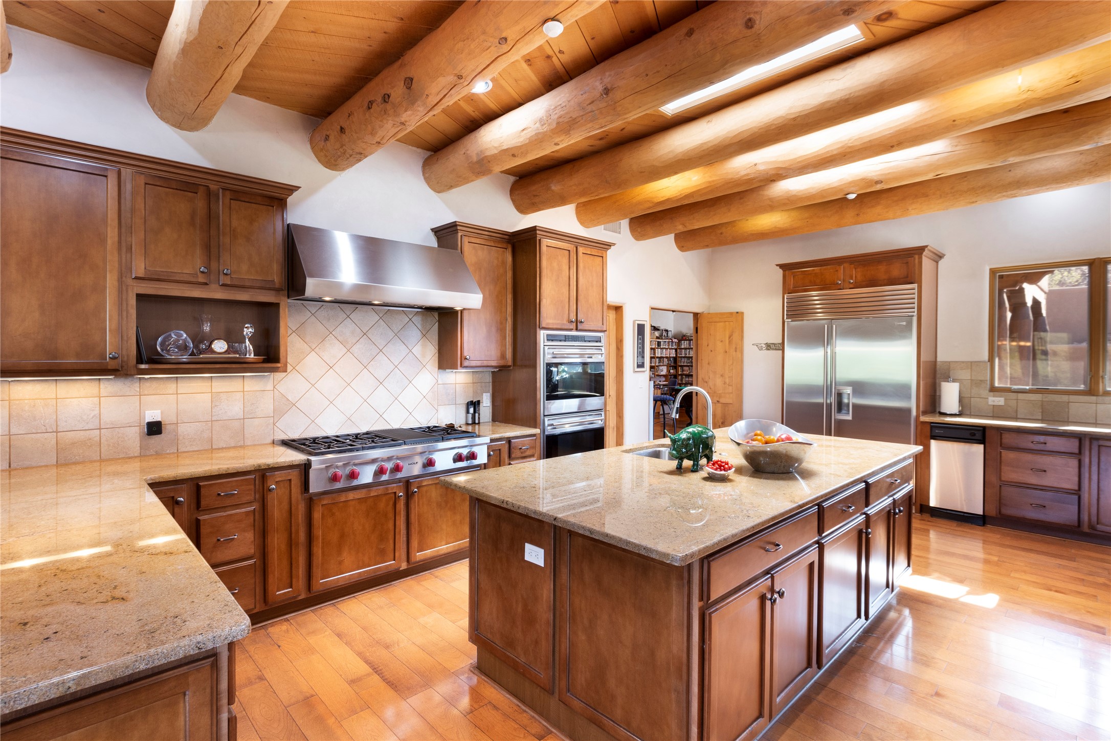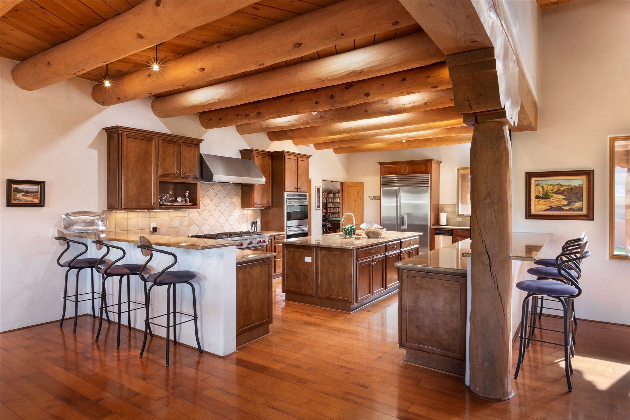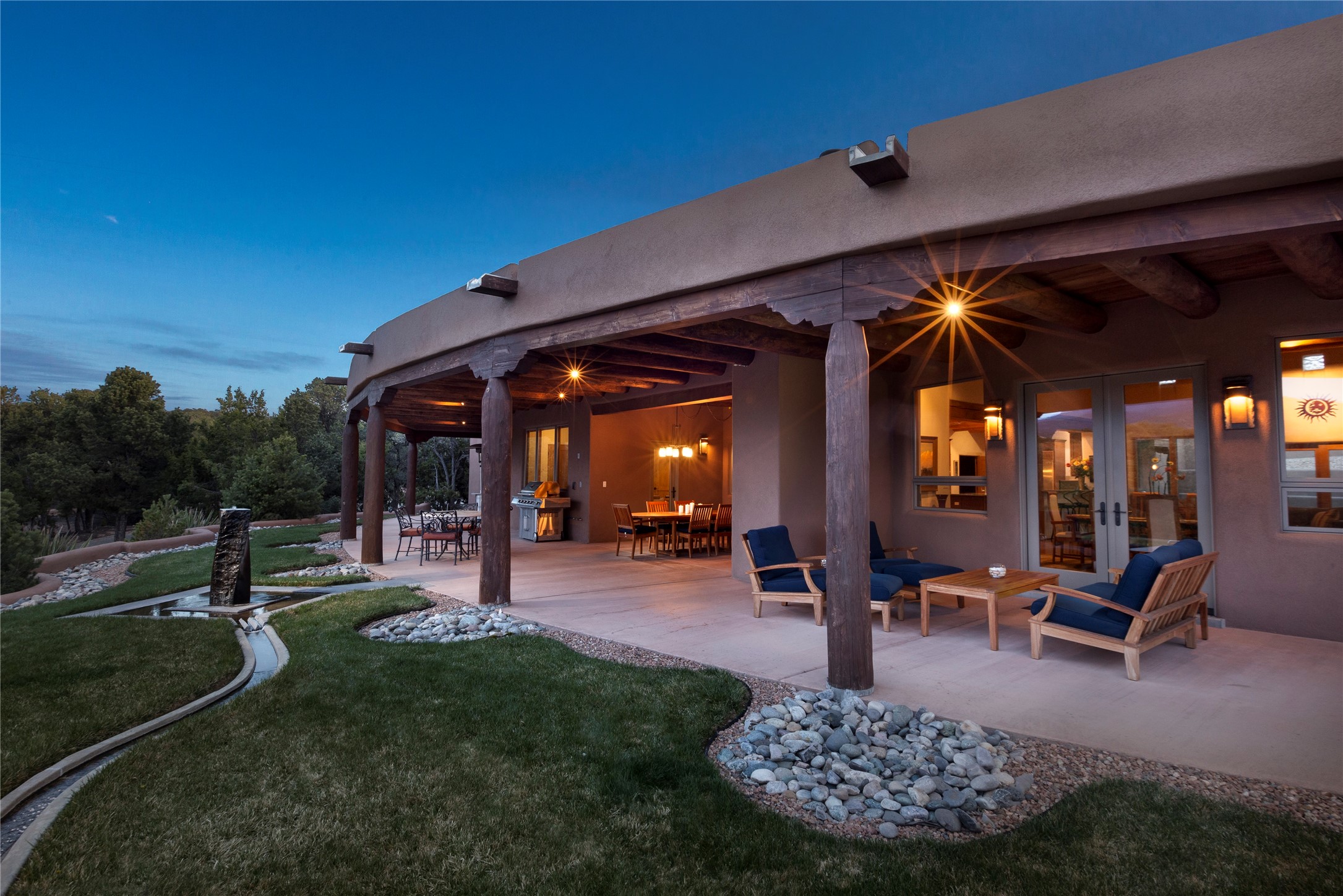 Buyers in this price range deserve a view of our wonderful mountains....but why bother with a house if the view doesn't make your heart stop? In this case, seeing is believing! Of course, it's also all about location: this tucked away subdivision is just 8 minutes to our Plaza and 5 minutes to the Opera: living here offers quiet and serenity plus proximity! When you drive past the gate you'll be wowed by the amazing mountain views, and the location of #59 promises the best of inspiring sunrises, spirit-raising Sangre de Cristo vistas, rosy reflected sunsets and clear moonlit evenings. The house, with 4400 sq ft, offers grand open spaces and private retreats, all single level with no steps to trip you up. Over 2000 sq ft of portals, which are so grand they are really outdoor living rooms, and with portals this size you can have parties for 2 or 20! The mountain views are always with you, both inside and outside! The cook's kitchen will be the envy of your friends with double ovens, subzero refrigerator and oversized wolf gas range...plus over 50' of granite counters - and a pantry of course. Beyond the kitchen you'll find the game room & bar, another ideal gathering space complete with pool table and kiva fireplace. Have you always wanted a wine room? this one will impress any oenophile. Your friends & family will love their generous guest rooms, completely en-suite with walk-in closets, plus private access to the portal. And then - main bedroom - you'll walk in and say "I could live in just this room"! This is a wonderful, spacious, private retreat, complete with its' own portal plus hot tub! Details abound with custom work such as over-sized vigas to support the large span of high ceilings and hand-crafted fireplaces so special they will make you smile. Viewing this house is a special introduction to a lovely home and spectacular - breath taking views! To own this house will make your life a daily pleasure! Why not experience Santa Fe at its' best?