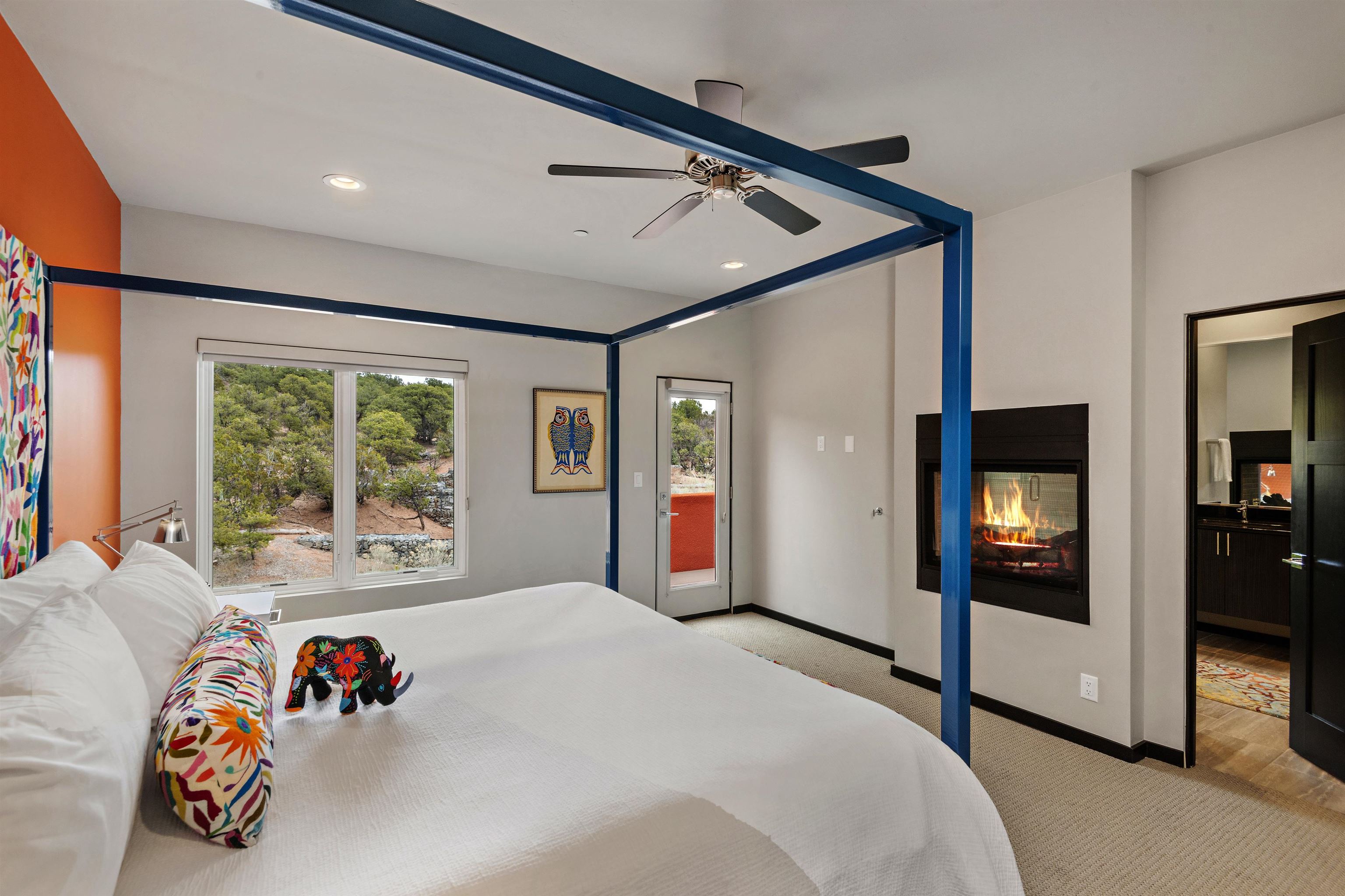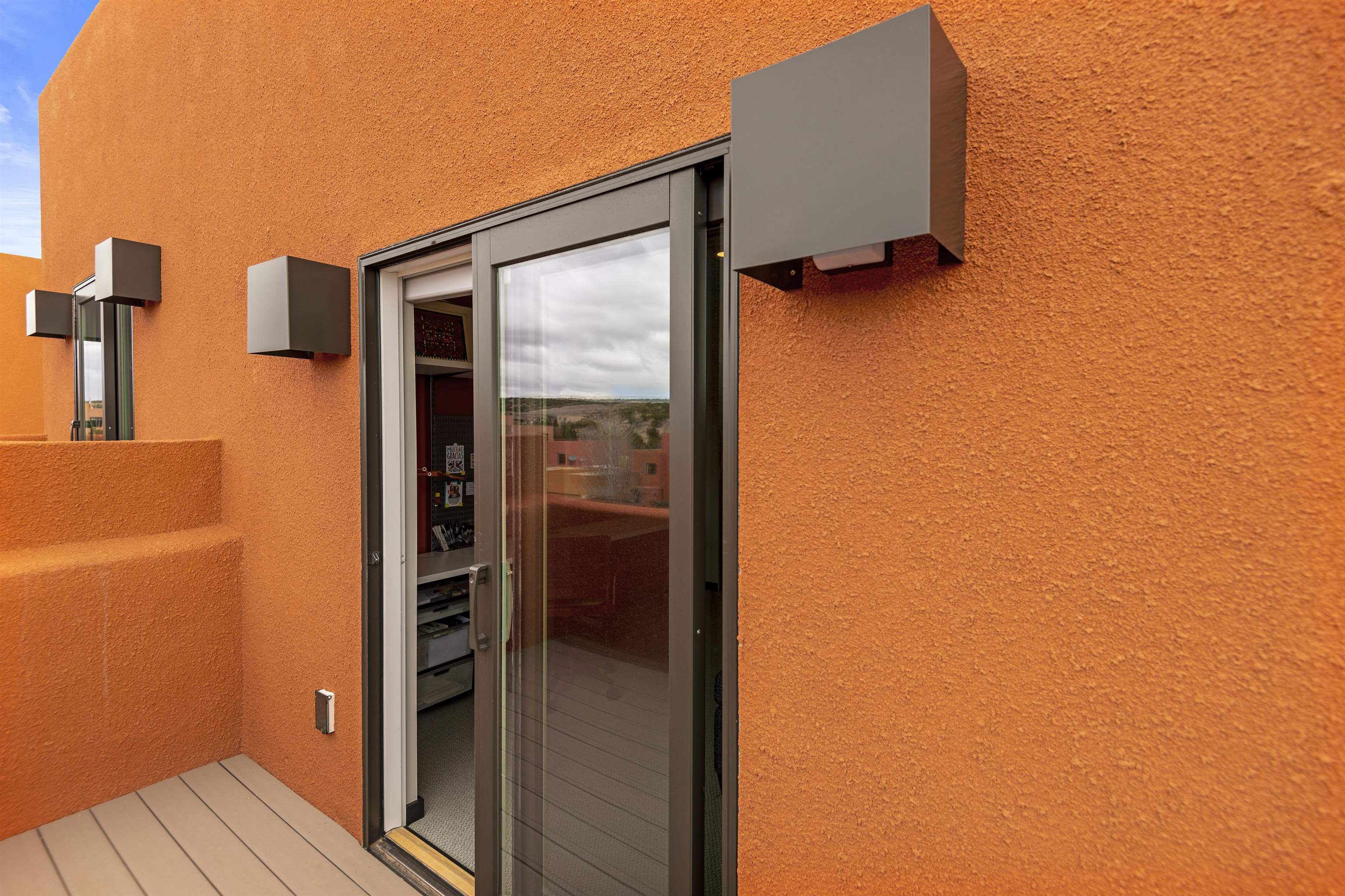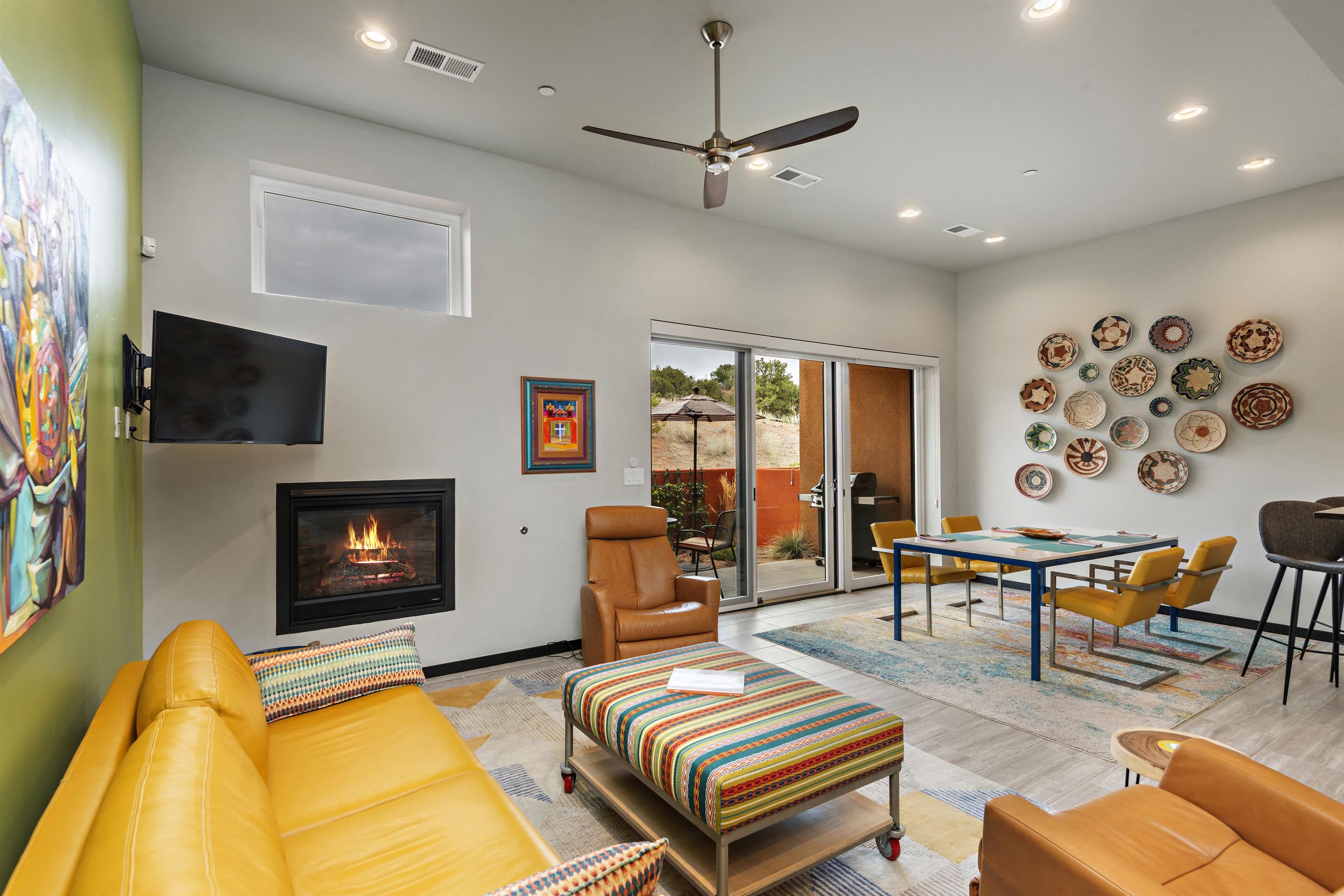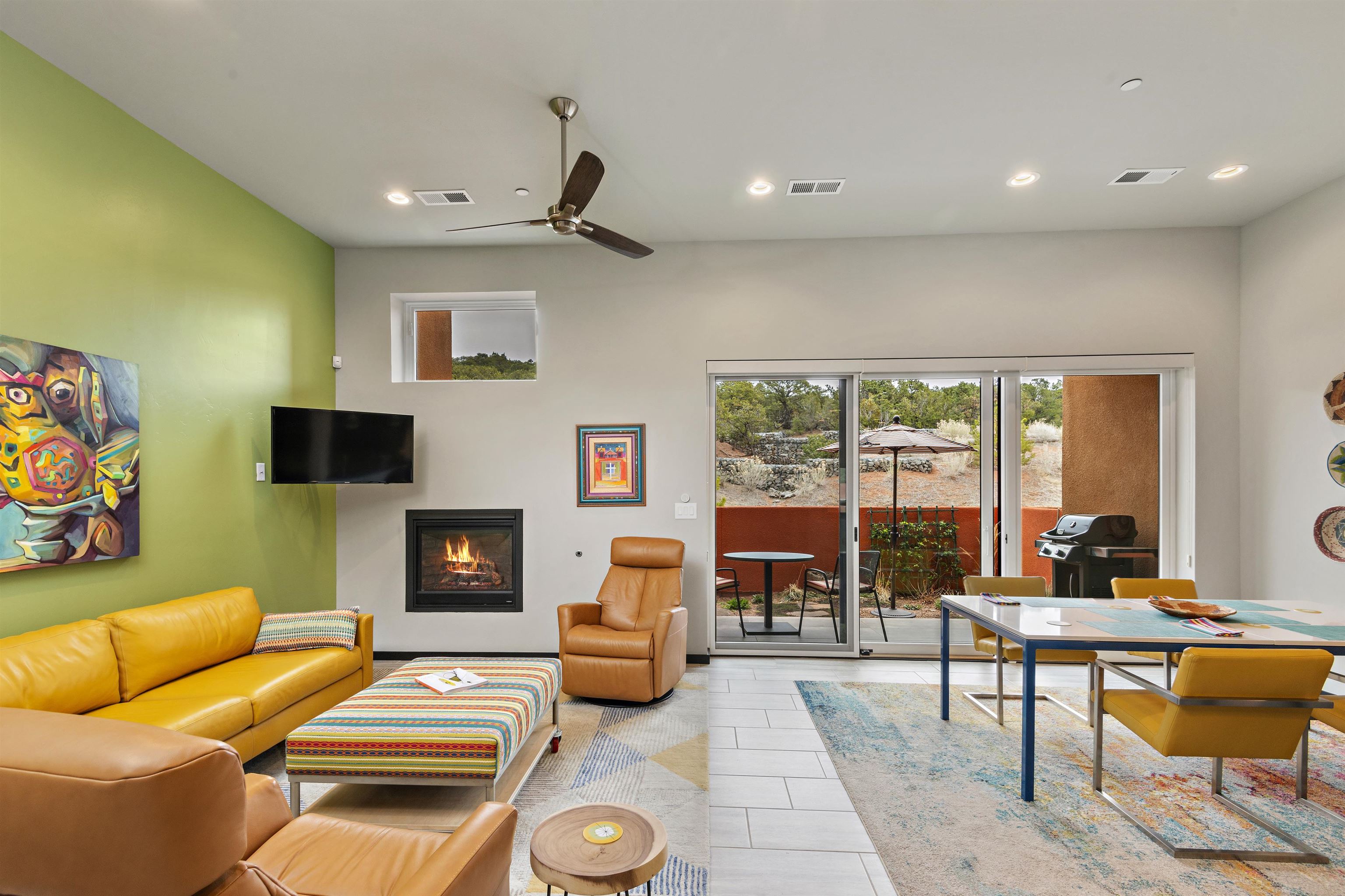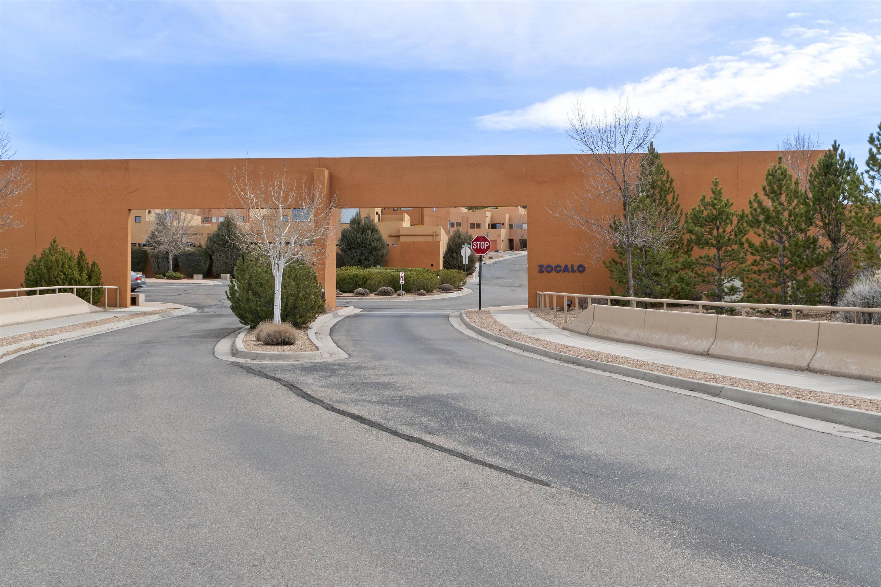 Smashing contemporary residence in the latest completed phase of desirable Zocalo condominium community. The dramatic living/dining area has soaring ceilings, a gas log fireplace, and accesses a lovely portal & landscaped walled garden. A handsome, well-appointed & equipped kitchen completes the main level. The upper level 2 bedrooms & 2 baths have excellent separation, including a gracious owner's suite with private deck & 2-sided gas log fireplace. Its sleek bathroom has a double vanity, deep soaking tub & separate shower. A generous, high-ceilinged lower level third bedroom with en suite bath is currently enjoyed as a media room/office. Owners significantly elevated their home with important improvements & luxury upgrades, including a Carrier 240,000 btu condenser, 2 LG ductless split systems for 3-zone temperature control, patio tilework, drip irrigation, Hunter Douglas window treatments throughout, a remote shade at the sliding patio door, 3 Araknis Indoor Wireless Access units on each level, 11 standard light & 2 fan switches replaced with Lutron dimmers & fan controls, 4 recessed lights installed in a guestroom, carpet replaced with superior grade & acoustical padding. List, that includes additional improvements is provided in MLS "Documents" section. Zocalo amenities include two gyms, an outdoor seasonal pool, community party room, and evening security patrol. Less than10 minutes to markets, restaurants, museums, shops, & Santa Fe's abundant cultural activities.