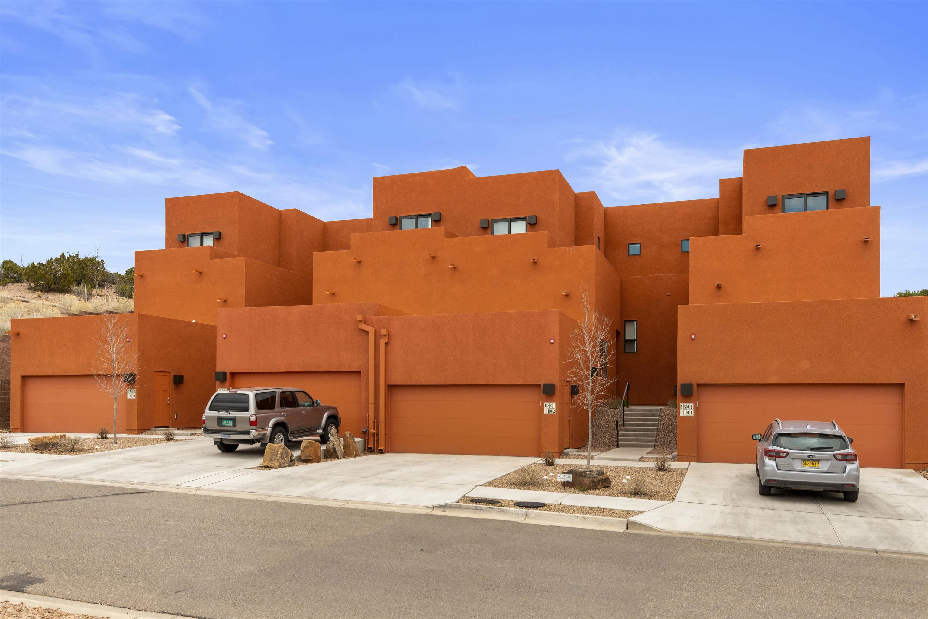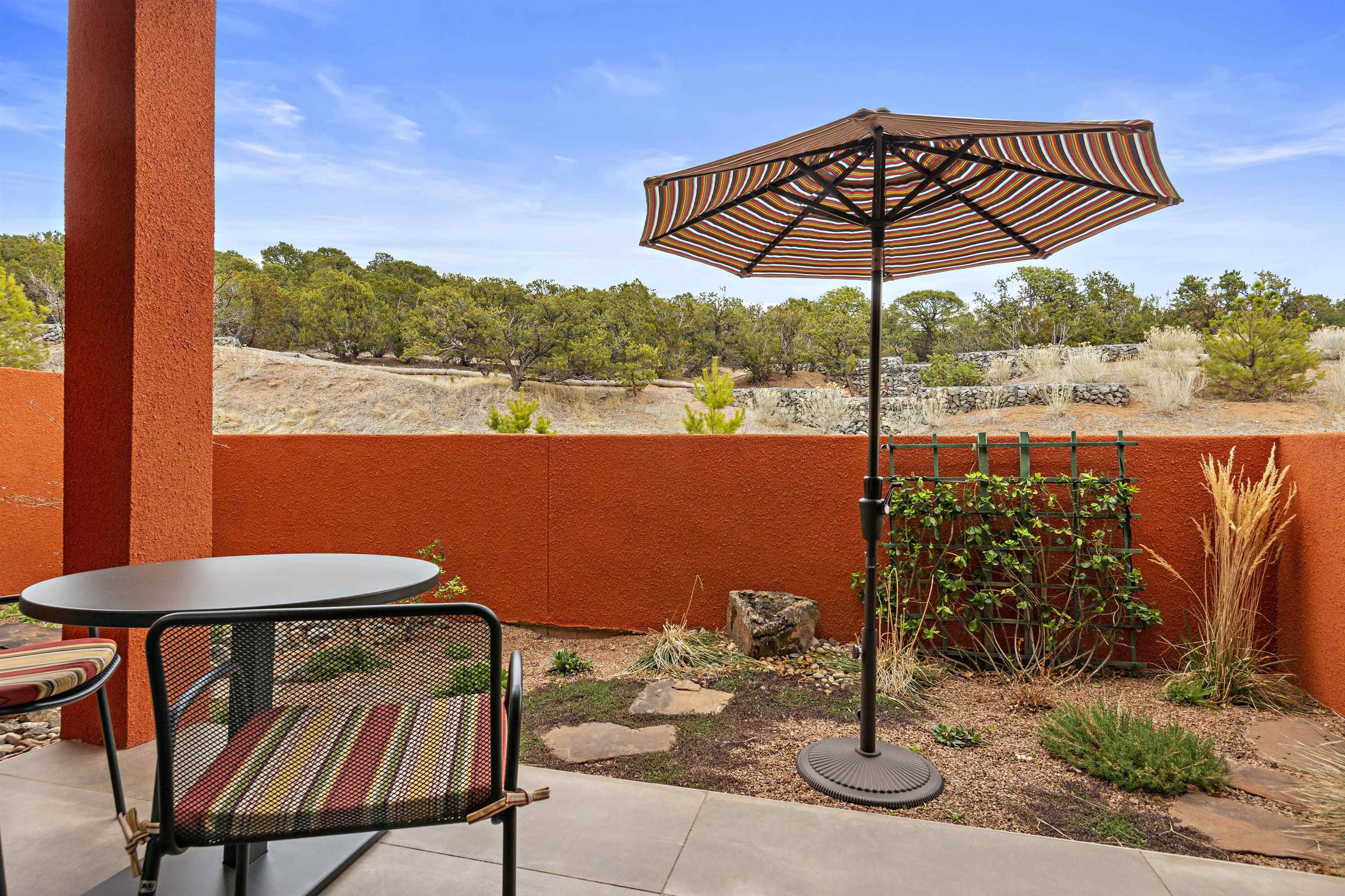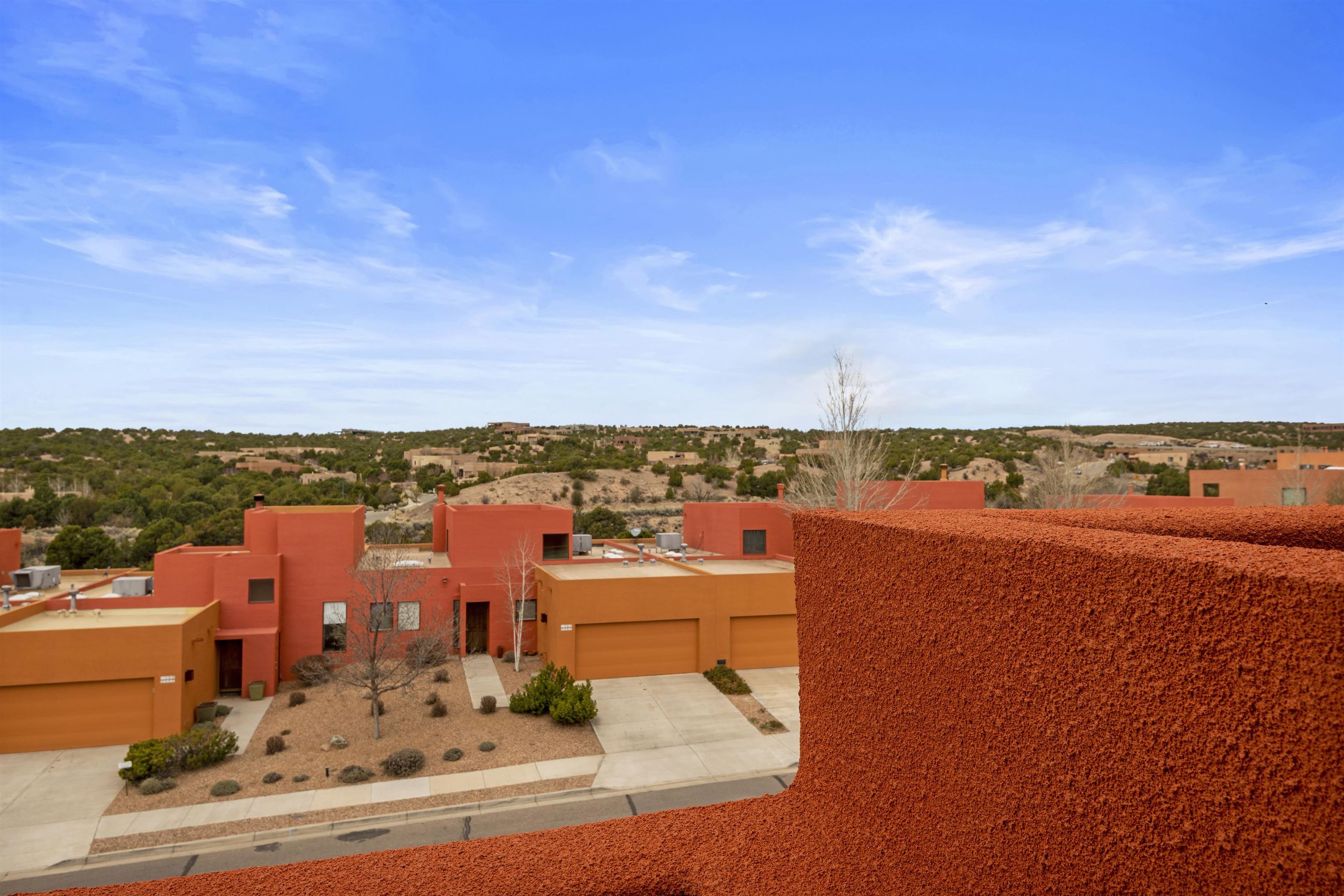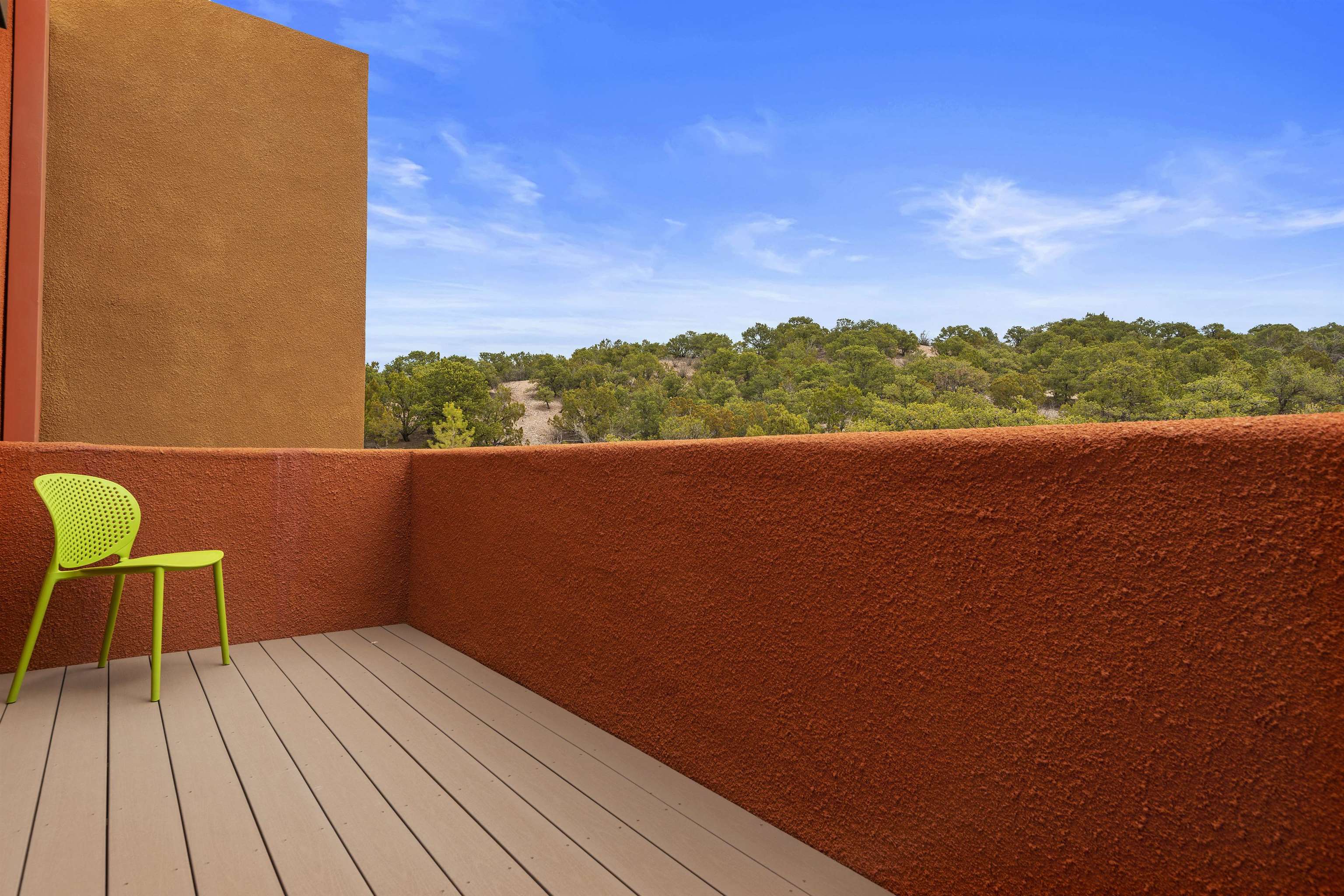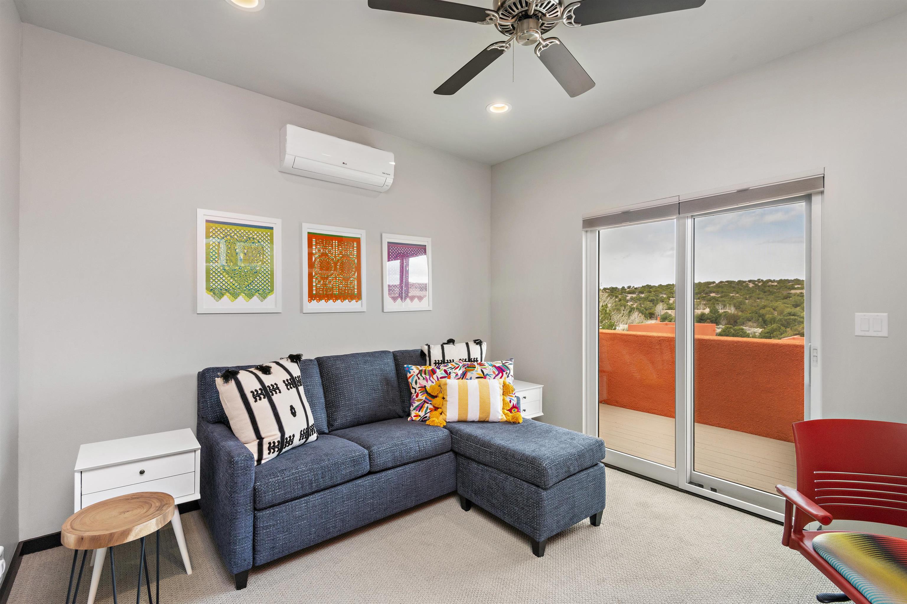 Smashing contemporary residence in the latest completed phase of desirable Zocalo condominium community. The dramatic living/dining area has soaring ceilings, a gas log fireplace, and accesses a lovely portal & landscaped walled garden. A handsome, well-appointed & equipped kitchen completes the main level. The upper level 2 bedrooms & 2 baths have excellent separation, including a gracious owner's suite with private deck & 2-sided gas log fireplace. Its sleek bathroom has a double vanity, deep soaking tub & separate shower. A generous, high-ceilinged lower level third bedroom with en suite bath is currently enjoyed as a media room/office. Owners significantly elevated their home with important improvements & luxury upgrades, including a Carrier 240,000 btu condenser, 2 LG ductless split systems for 3-zone temperature control, patio tilework, drip irrigation, Hunter Douglas window treatments throughout, a remote shade at the sliding patio door, 3 Araknis Indoor Wireless Access units on each level, 11 standard light & 2 fan switches replaced with Lutron dimmers & fan controls, 4 recessed lights installed in a guestroom, carpet replaced with superior grade & acoustical padding. List, that includes additional improvements is provided in MLS "Documents" section. Zocalo amenities include two gyms, an outdoor seasonal pool, community party room, and evening security patrol. Less than10 minutes to markets, restaurants, museums, shops, & Santa Fe's abundant cultural activities.