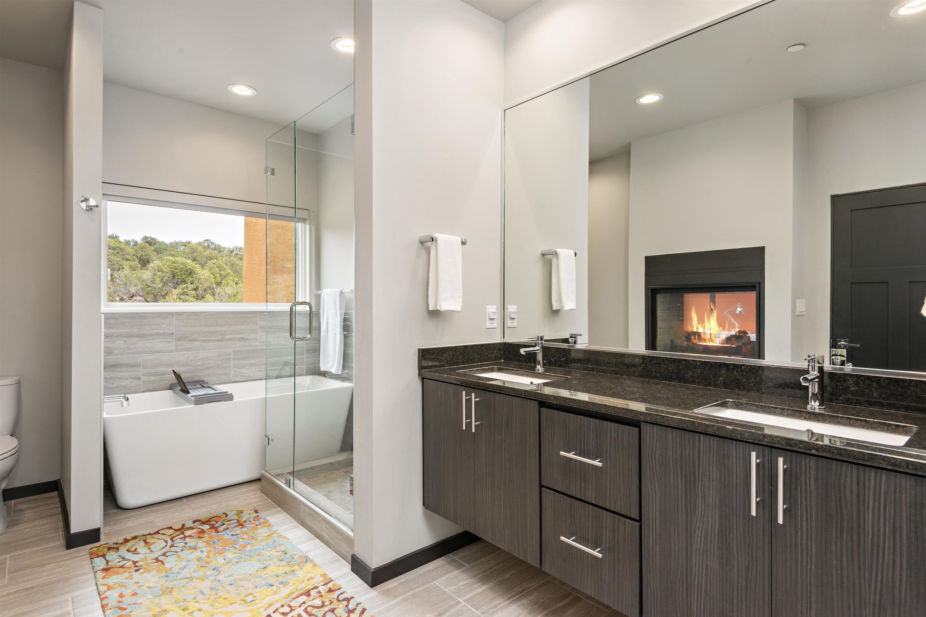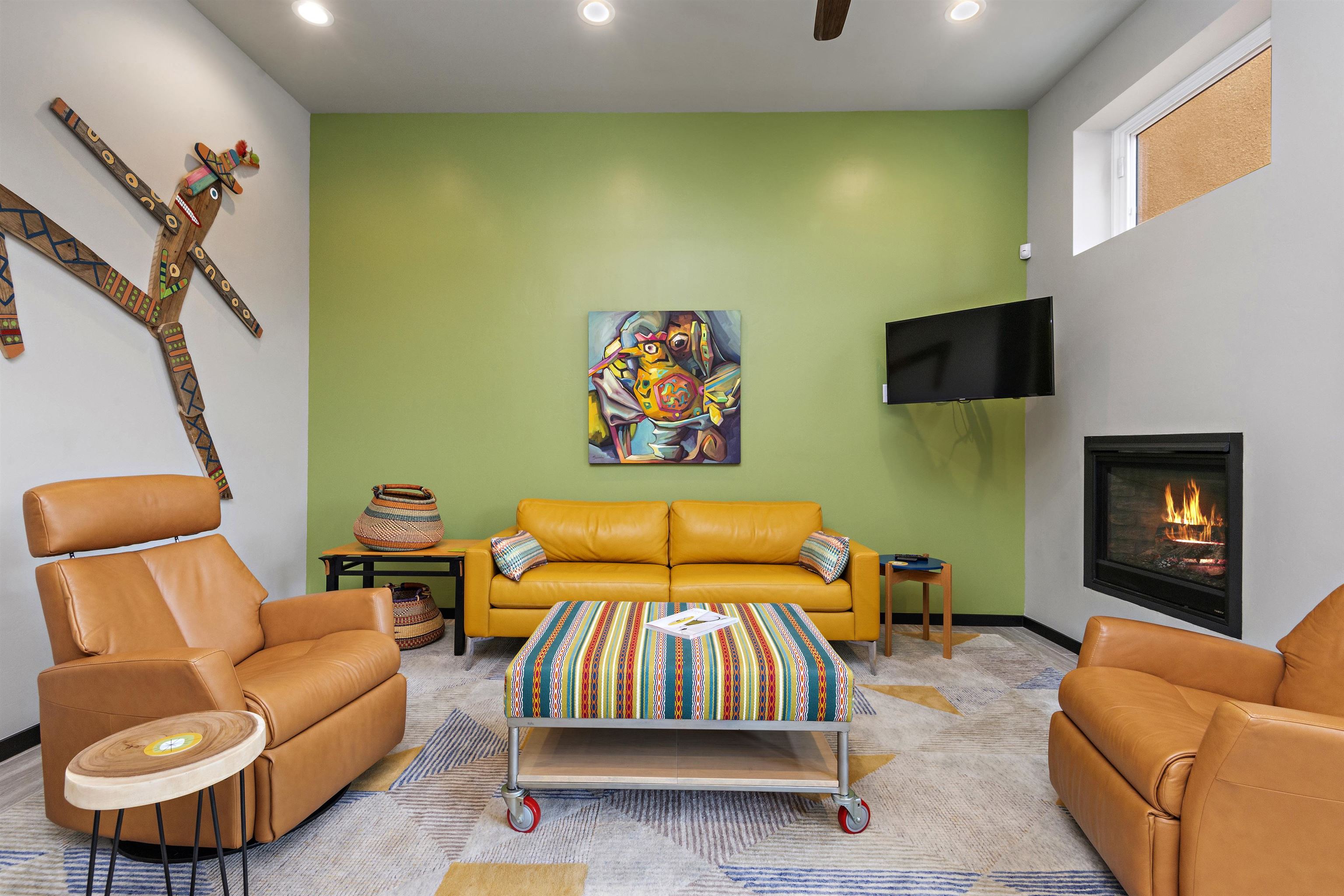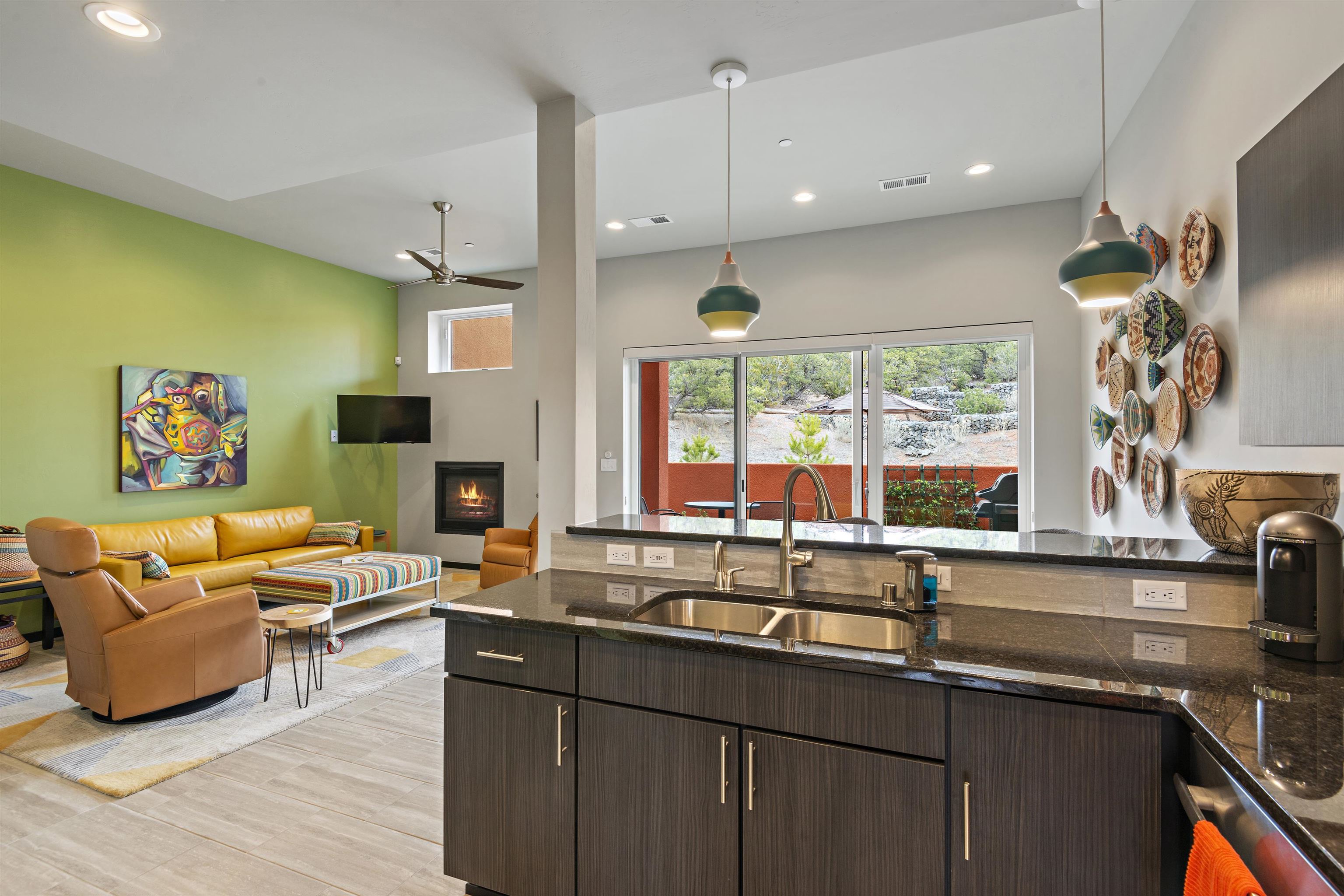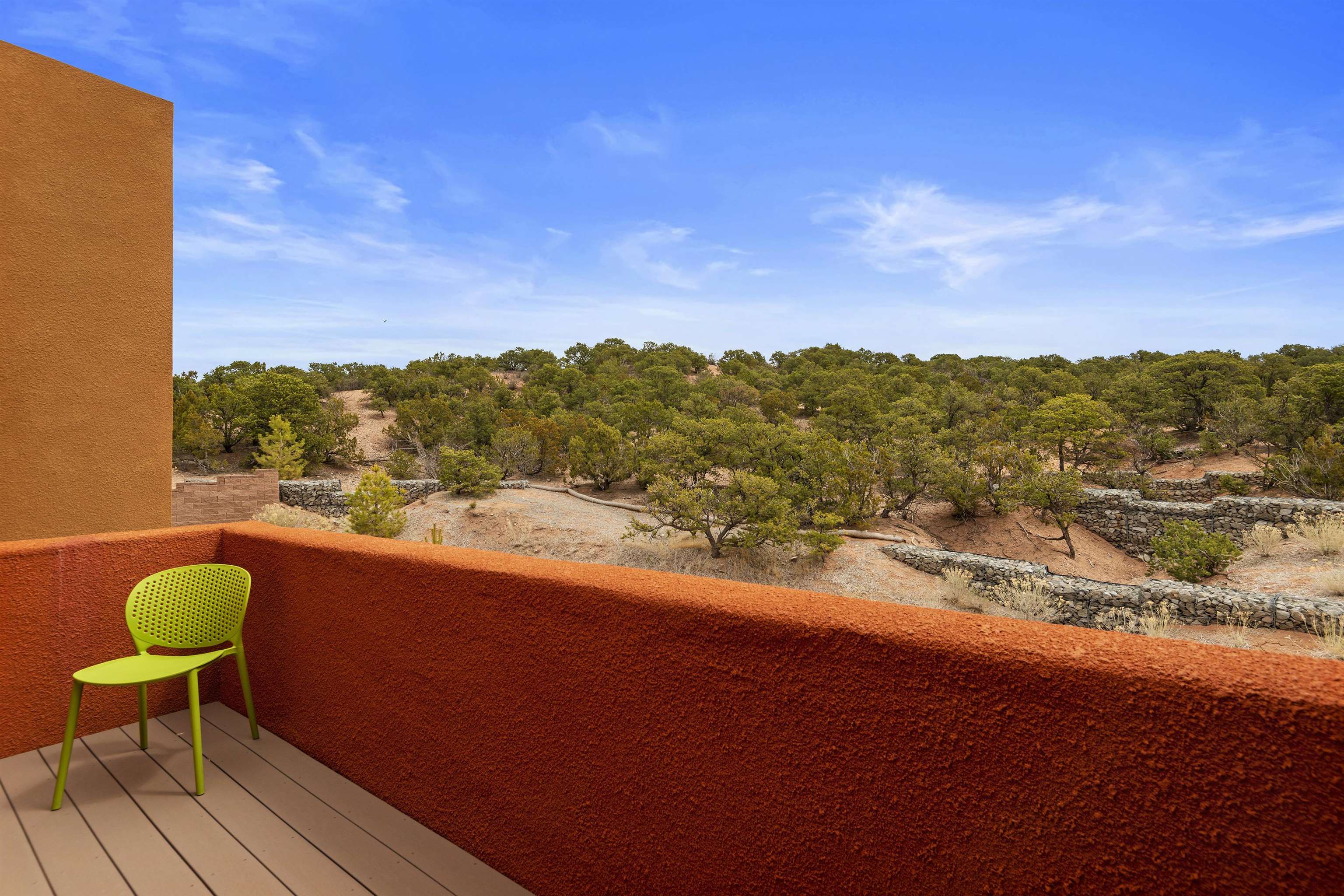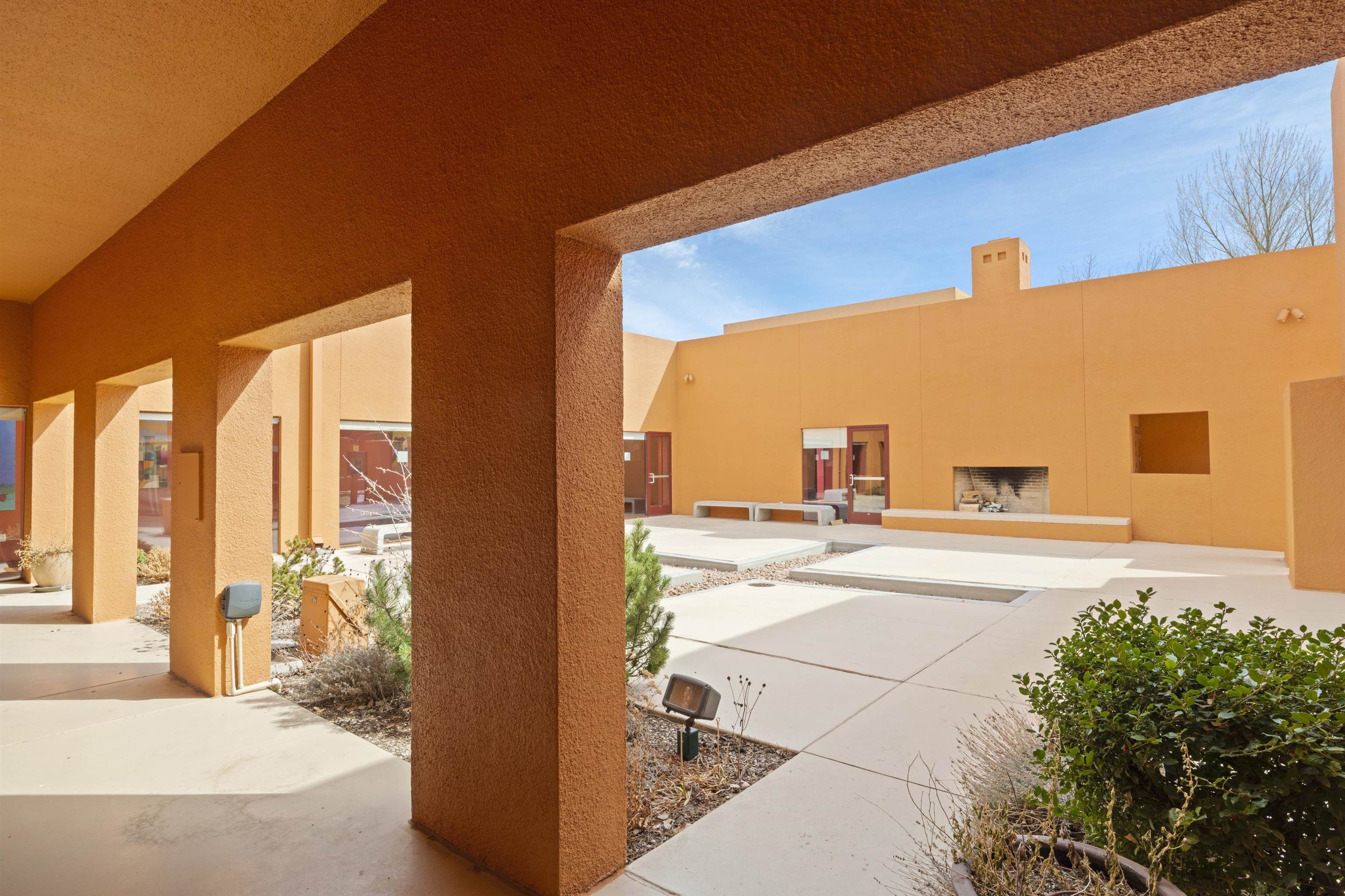Smashing contemporary residence in the latest completed phase of desirable Zocalo condominium community. The dramatic living/dining area has soaring ceilings, a gas log fireplace, and accesses a lovely portal & landscaped walled garden. A handsome, well-appointed & equipped kitchen completes the main level. The upper level 2 bedrooms & 2 baths have excellent separation, including a gracious owner's suite with private deck & 2-sided gas log fireplace. Its sleek bathroom has a double vanity, deep soaking tub & separate shower. A generous, high-ceilinged lower level third bedroom with en suite bath is currently enjoyed as a media room/office. Owners significantly elevated their home with important improvements & luxury upgrades, including a Carrier 240,000 btu condenser, 2 LG ductless split systems for 3-zone temperature control, patio tilework, drip irrigation, Hunter Douglas window treatments throughout, a remote shade at the sliding patio door, 3 Araknis Indoor Wireless Access units on each level, 11 standard light & 2 fan switches replaced with Lutron dimmers & fan controls, 4 recessed lights installed in a guestroom, carpet replaced with superior grade & acoustical padding. List, that includes additional improvements is provided in MLS "Documents" section. Zocalo amenities include two gyms, an outdoor seasonal pool, community party room, and evening security patrol. Less than10 minutes to markets, restaurants, museums, shops, & Santa Fe's abundant cultural activities.