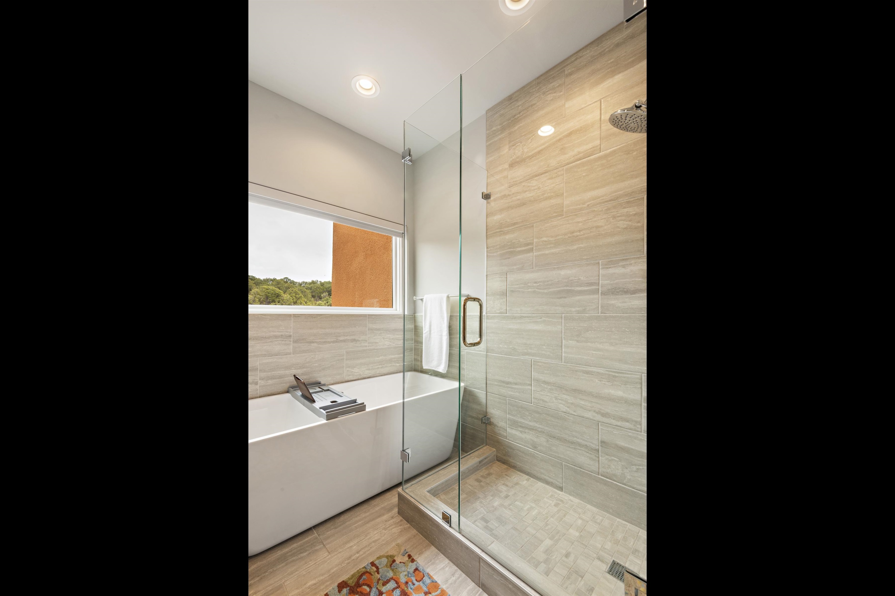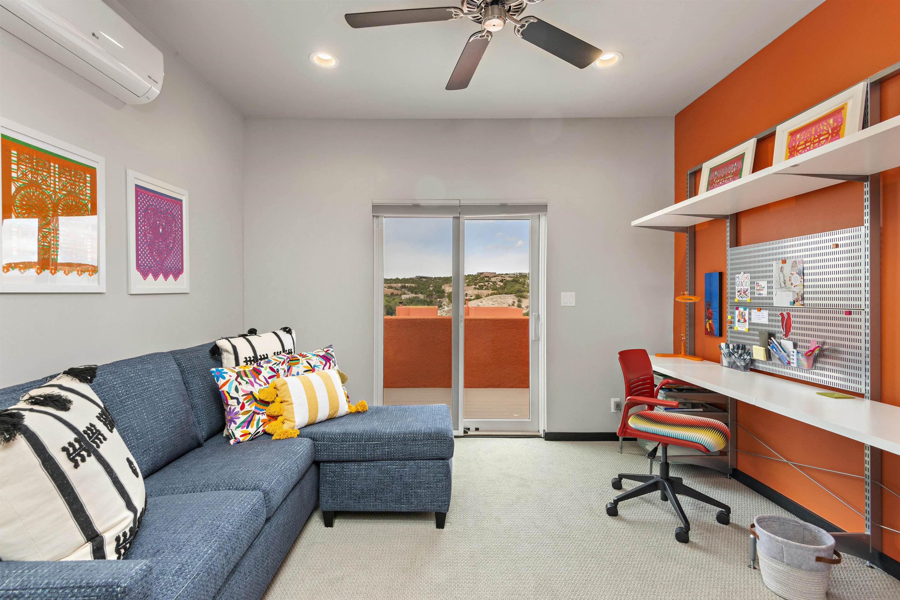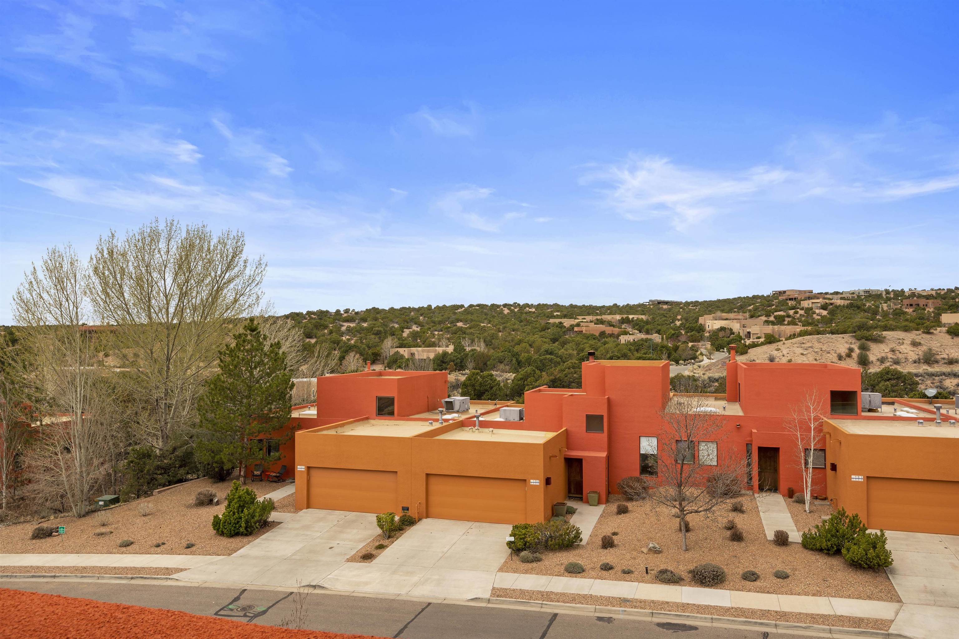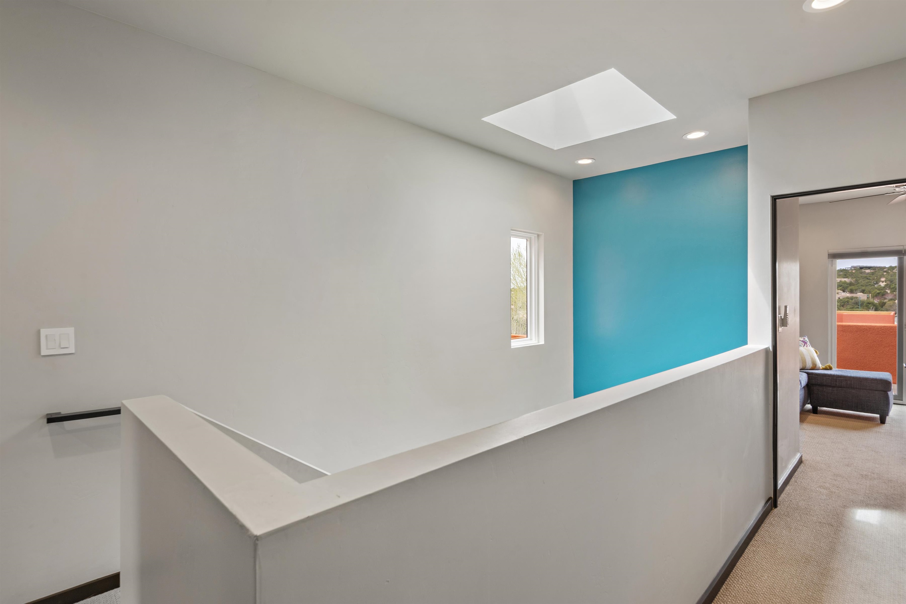 Smashing contemporary residence in the latest completed phase of desirable Zocalo condominium community. The dramatic living/dining area has soaring ceilings, a gas log fireplace, and accesses a lovely portal & landscaped walled garden. A handsome, well-appointed & equipped kitchen completes the main level. The upper level 2 bedrooms & 2 baths have excellent separation, including a gracious owner's suite with private deck & 2-sided gas log fireplace. Its sleek bathroom has a double vanity, deep soaking tub & separate shower. A generous, high-ceilinged lower level third bedroom with en suite bath is currently enjoyed as a media room/office. Owners significantly elevated their home with important improvements & luxury upgrades, including a Carrier 240,000 btu condenser, 2 LG ductless split systems for 3-zone temperature control, patio tilework, drip irrigation, Hunter Douglas window treatments throughout, a remote shade at the sliding patio door, 3 Araknis Indoor Wireless Access units on each level, 11 standard light & 2 fan switches replaced with Lutron dimmers & fan controls, 4 recessed lights installed in a guestroom, carpet replaced with superior grade & acoustical padding. List, that includes additional improvements is provided in MLS "Documents" section. Zocalo amenities include two gyms, an outdoor seasonal pool, community party room, and evening security patrol. Less than10 minutes to markets, restaurants, museums, shops, & Santa Fe's abundant cultural activities.