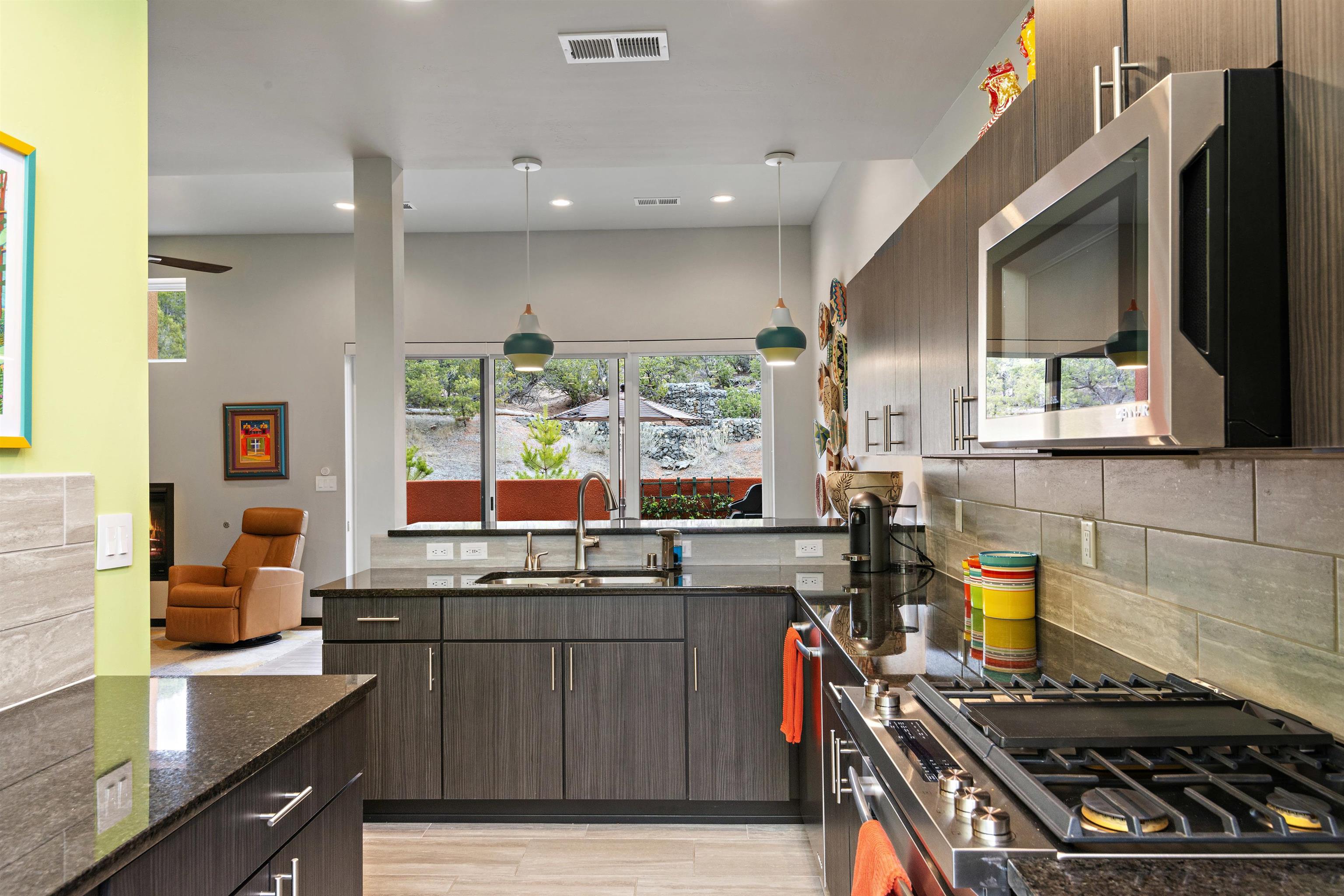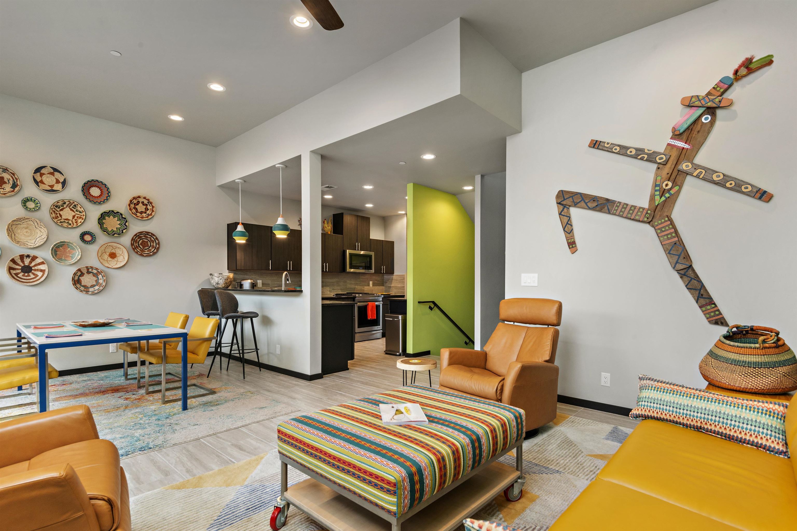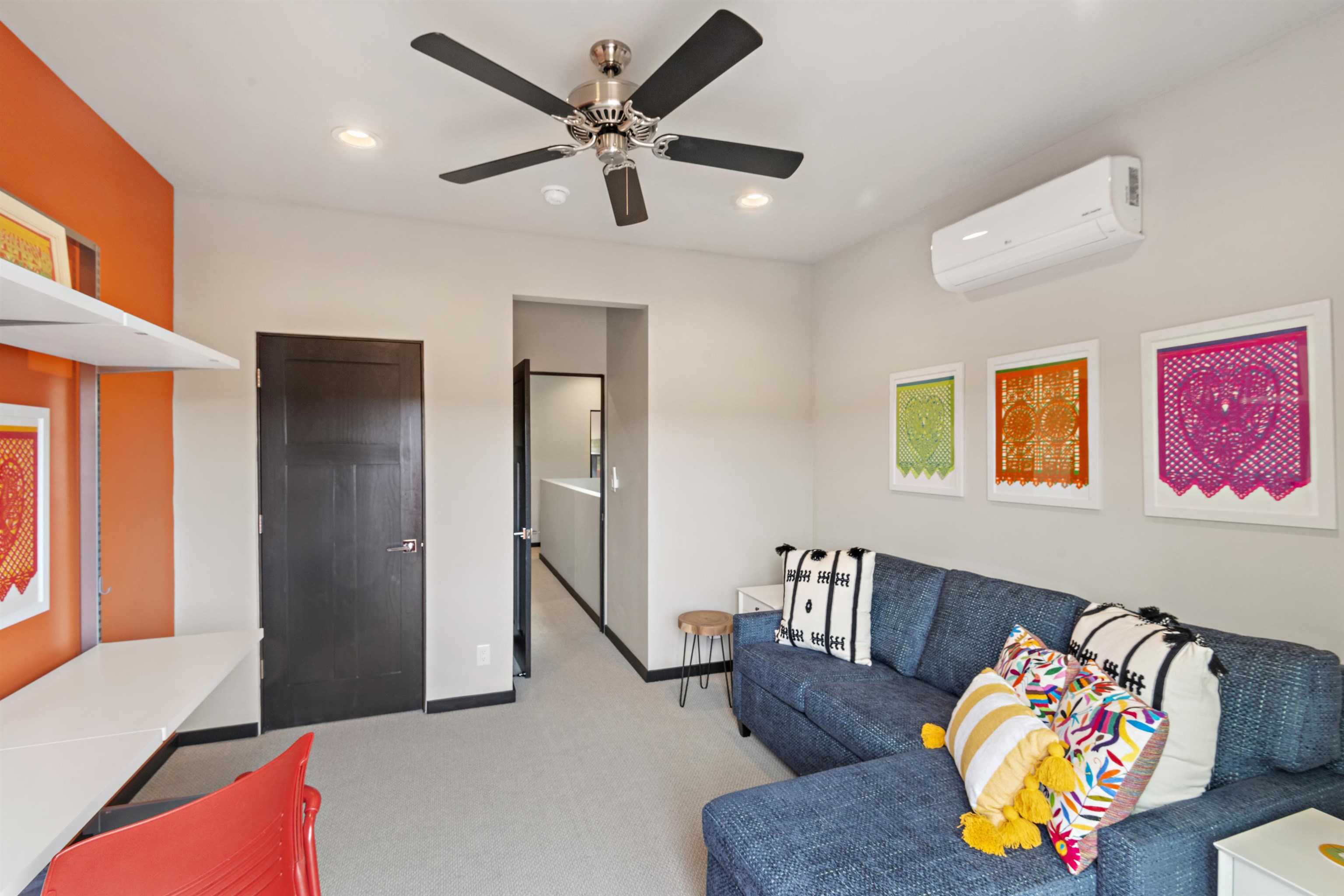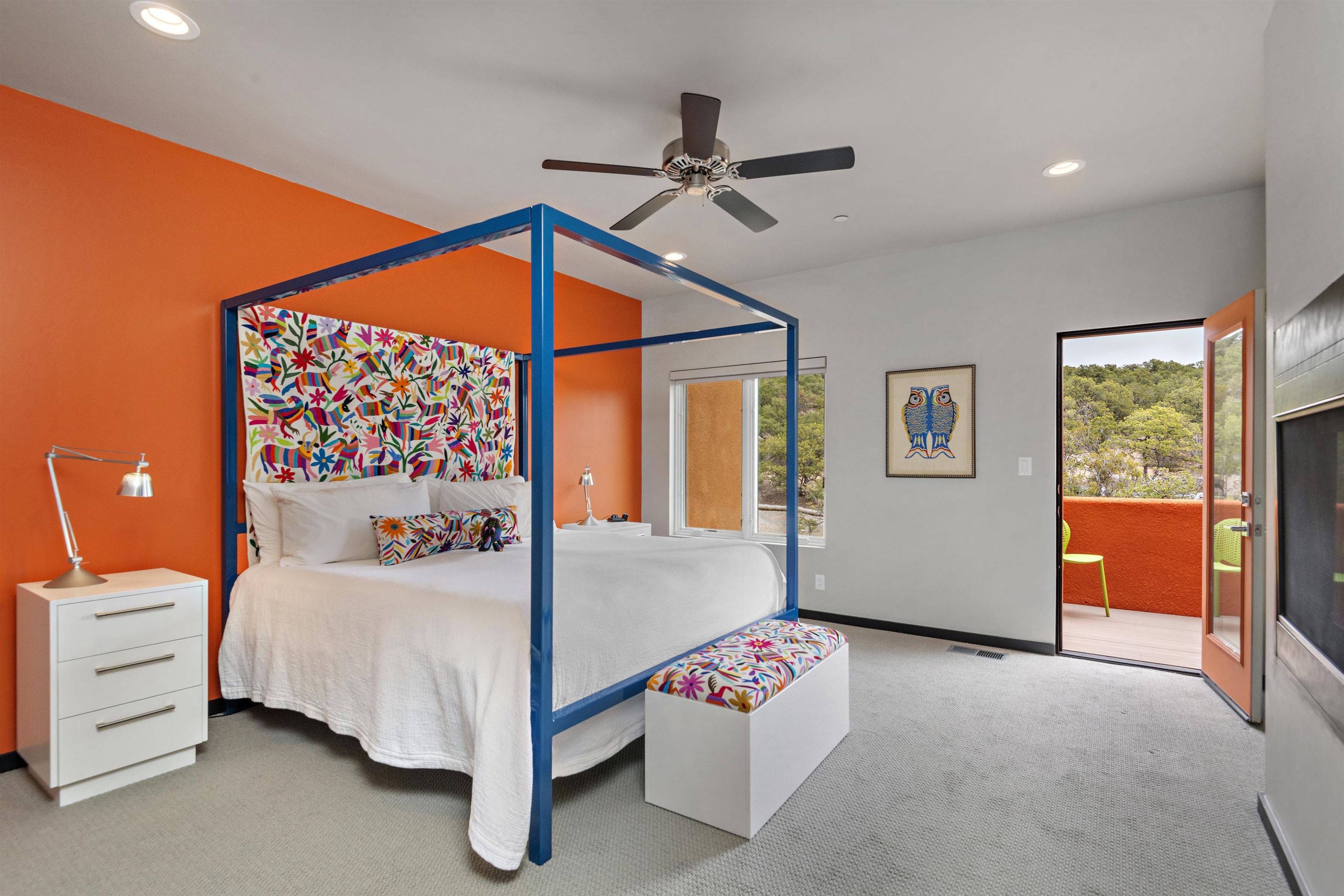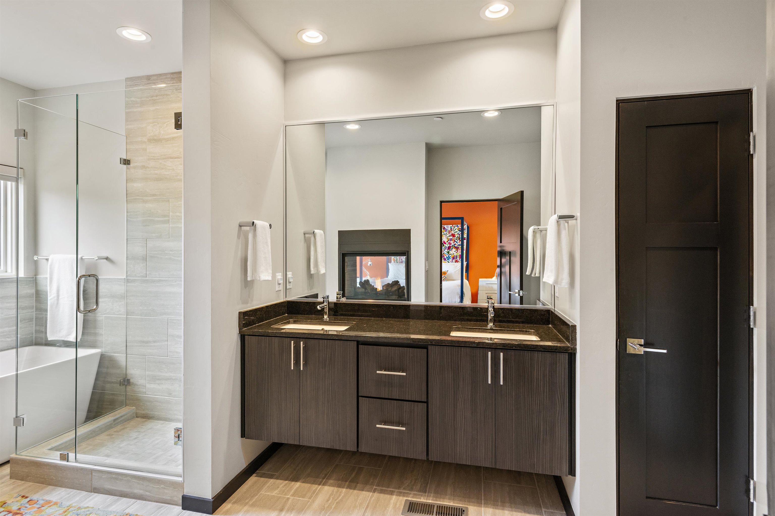 Smashing contemporary residence in the latest completed phase of desirable Zocalo condominium community. The dramatic living/dining area has soaring ceilings, a gas log fireplace, and accesses a lovely portal & landscaped walled garden. A handsome, well-appointed & equipped kitchen completes the main level. The upper level 2 bedrooms & 2 baths have excellent separation, including a gracious owner's suite with private deck & 2-sided gas log fireplace. Its sleek bathroom has a double vanity, deep soaking tub & separate shower. A generous, high-ceilinged lower level third bedroom with en suite bath is currently enjoyed as a media room/office. Owners significantly elevated their home with important improvements & luxury upgrades, including a Carrier 240,000 btu condenser, 2 LG ductless split systems for 3-zone temperature control, patio tilework, drip irrigation, Hunter Douglas window treatments throughout, a remote shade at the sliding patio door, 3 Araknis Indoor Wireless Access units on each level, 11 standard light & 2 fan switches replaced with Lutron dimmers & fan controls, 4 recessed lights installed in a guestroom, carpet replaced with superior grade & acoustical padding. List, that includes additional improvements is provided in MLS "Documents" section. Zocalo amenities include two gyms, an outdoor seasonal pool, community party room, and evening security patrol. Less than10 minutes to markets, restaurants, museums, shops, & Santa Fe's abundant cultural activities.