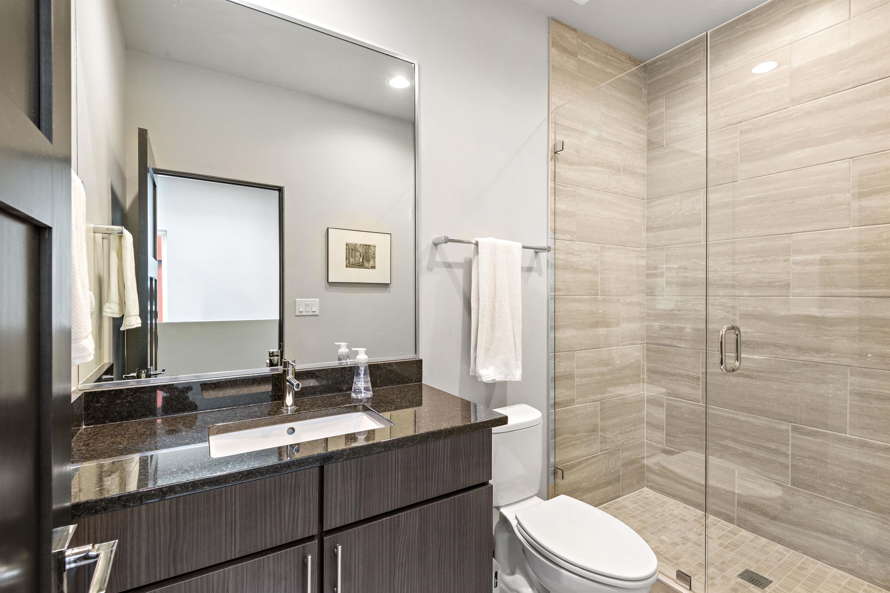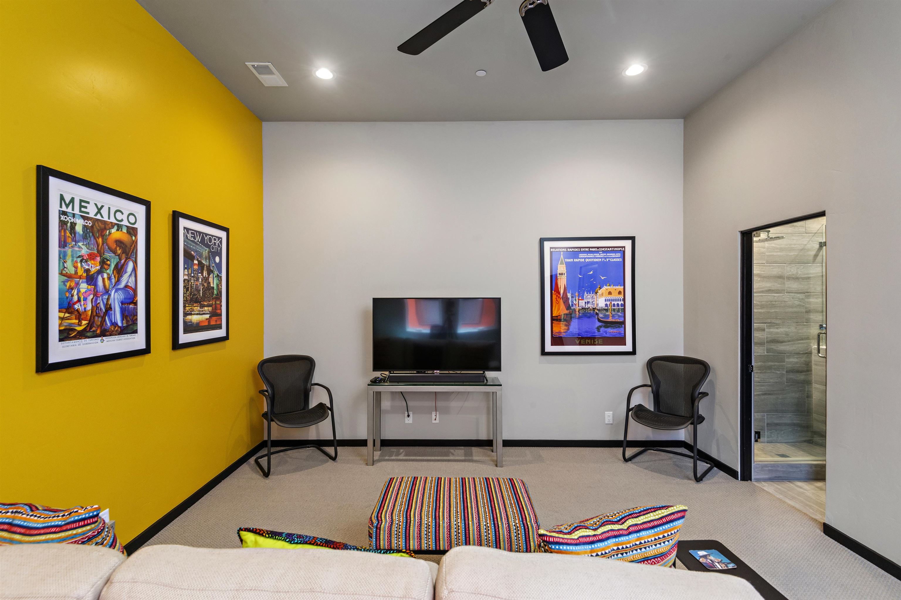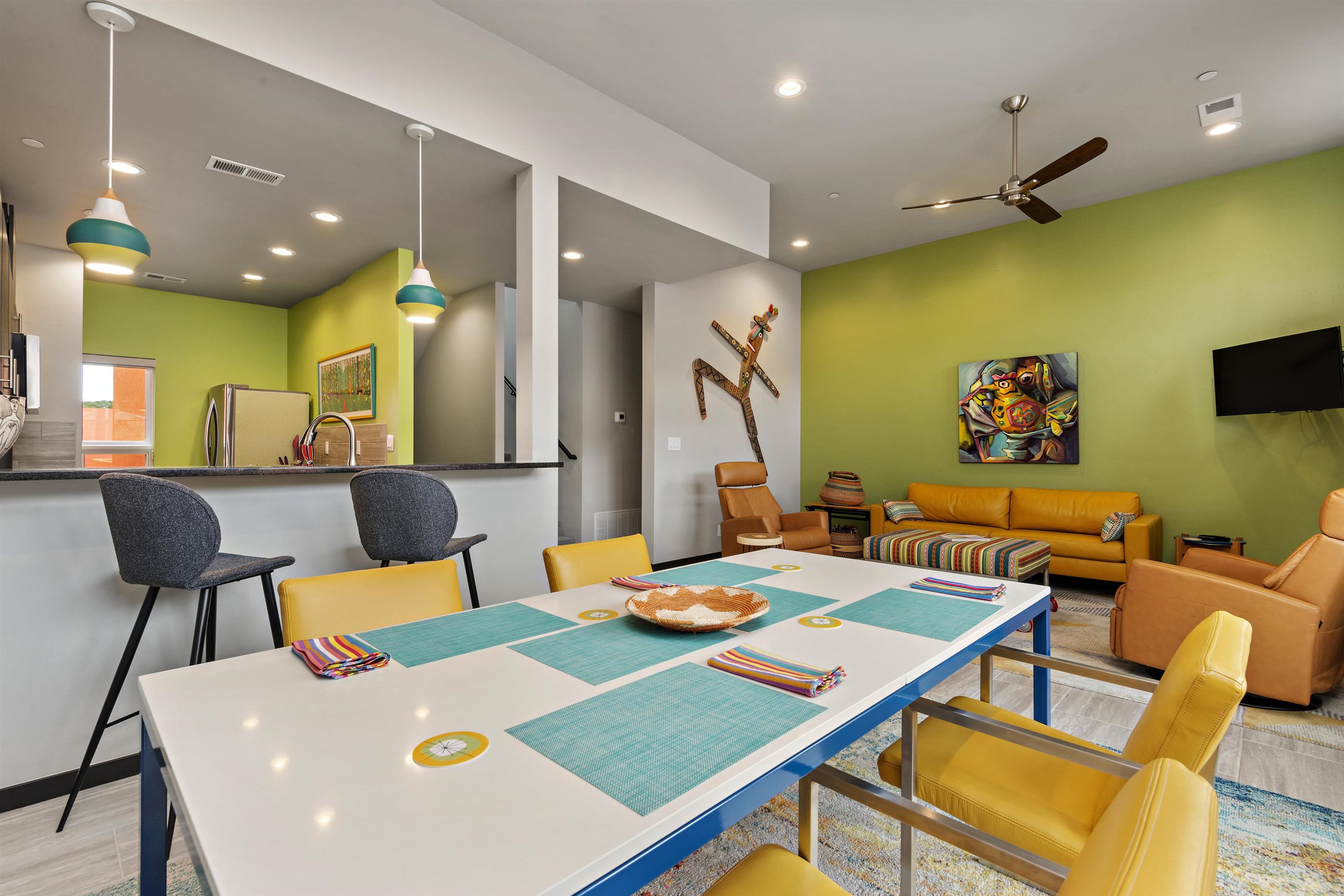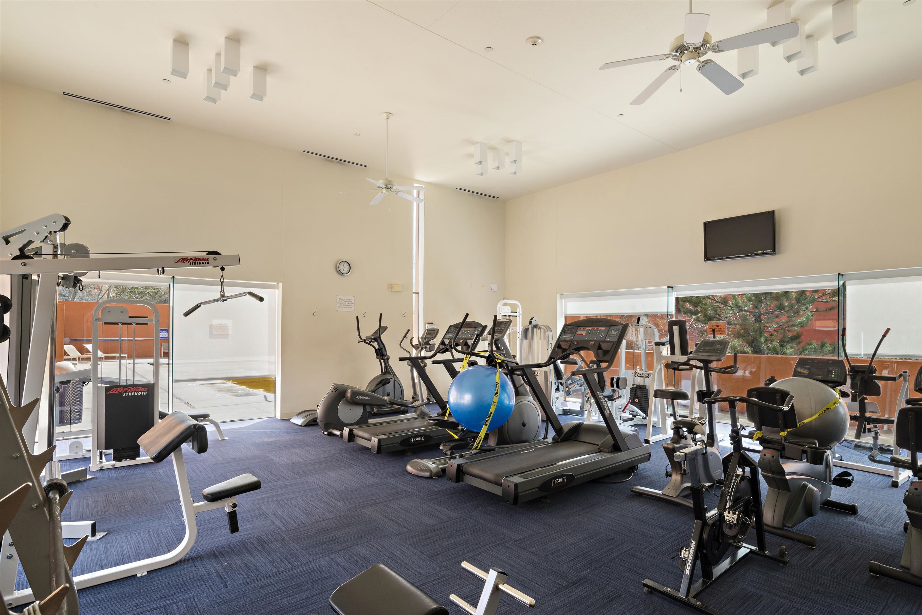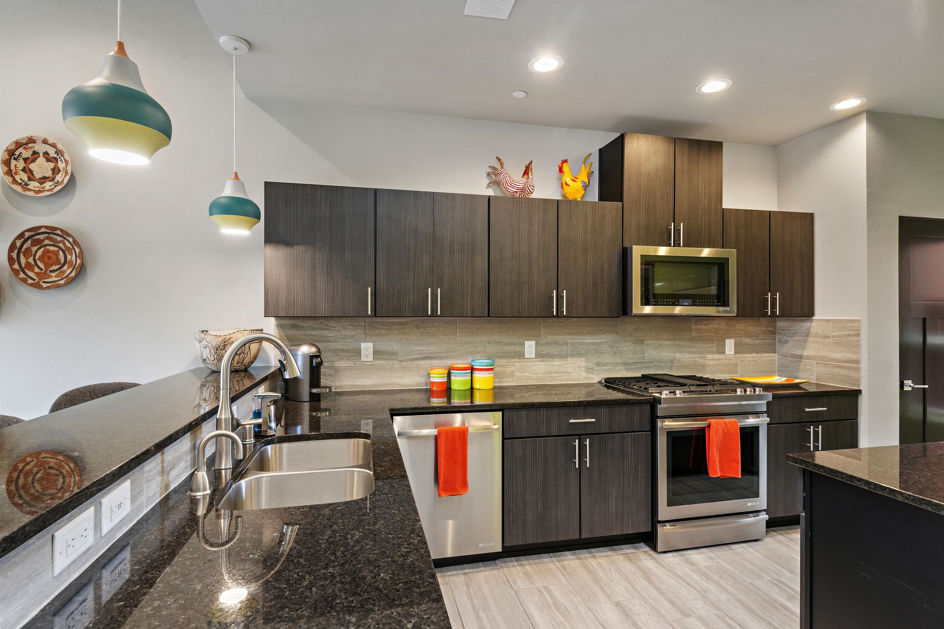 Smashing contemporary residence in the latest completed phase of desirable Zocalo condominium community. The dramatic living/dining area has soaring ceilings, a gas log fireplace, and accesses a lovely portal & landscaped walled garden. A handsome, well-appointed & equipped kitchen completes the main level. The upper level 2 bedrooms & 2 baths have excellent separation, including a gracious owner's suite with private deck & 2-sided gas log fireplace. Its sleek bathroom has a double vanity, deep soaking tub & separate shower. A generous, high-ceilinged lower level third bedroom with en suite bath is currently enjoyed as a media room/office. Owners significantly elevated their home with important improvements & luxury upgrades, including a Carrier 240,000 btu condenser, 2 LG ductless split systems for 3-zone temperature control, patio tilework, drip irrigation, Hunter Douglas window treatments throughout, a remote shade at the sliding patio door, 3 Araknis Indoor Wireless Access units on each level, 11 standard light & 2 fan switches replaced with Lutron dimmers & fan controls, 4 recessed lights installed in a guestroom, carpet replaced with superior grade & acoustical padding. List, that includes additional improvements is provided in MLS "Documents" section. Zocalo amenities include two gyms, an outdoor seasonal pool, community party room, and evening security patrol. Less than10 minutes to markets, restaurants, museums, shops, & Santa Fe's abundant cultural activities.