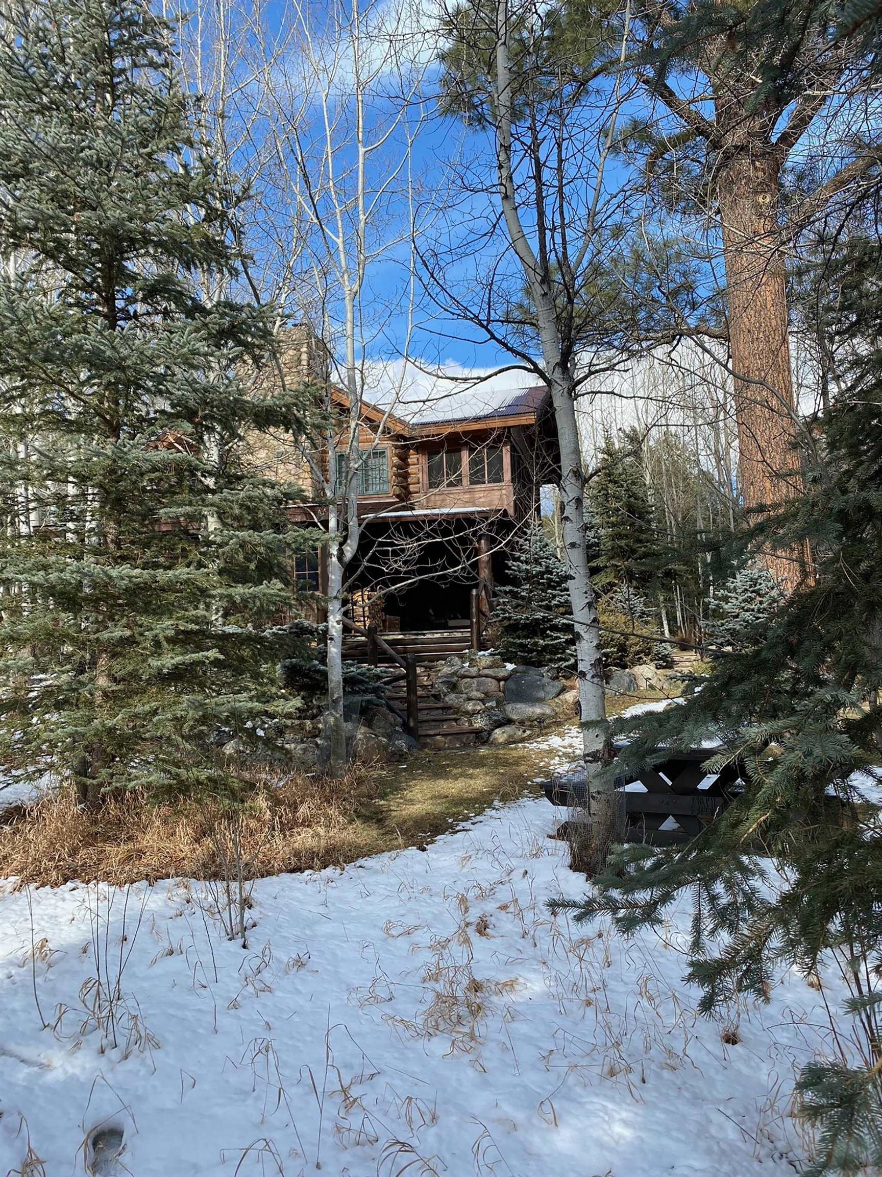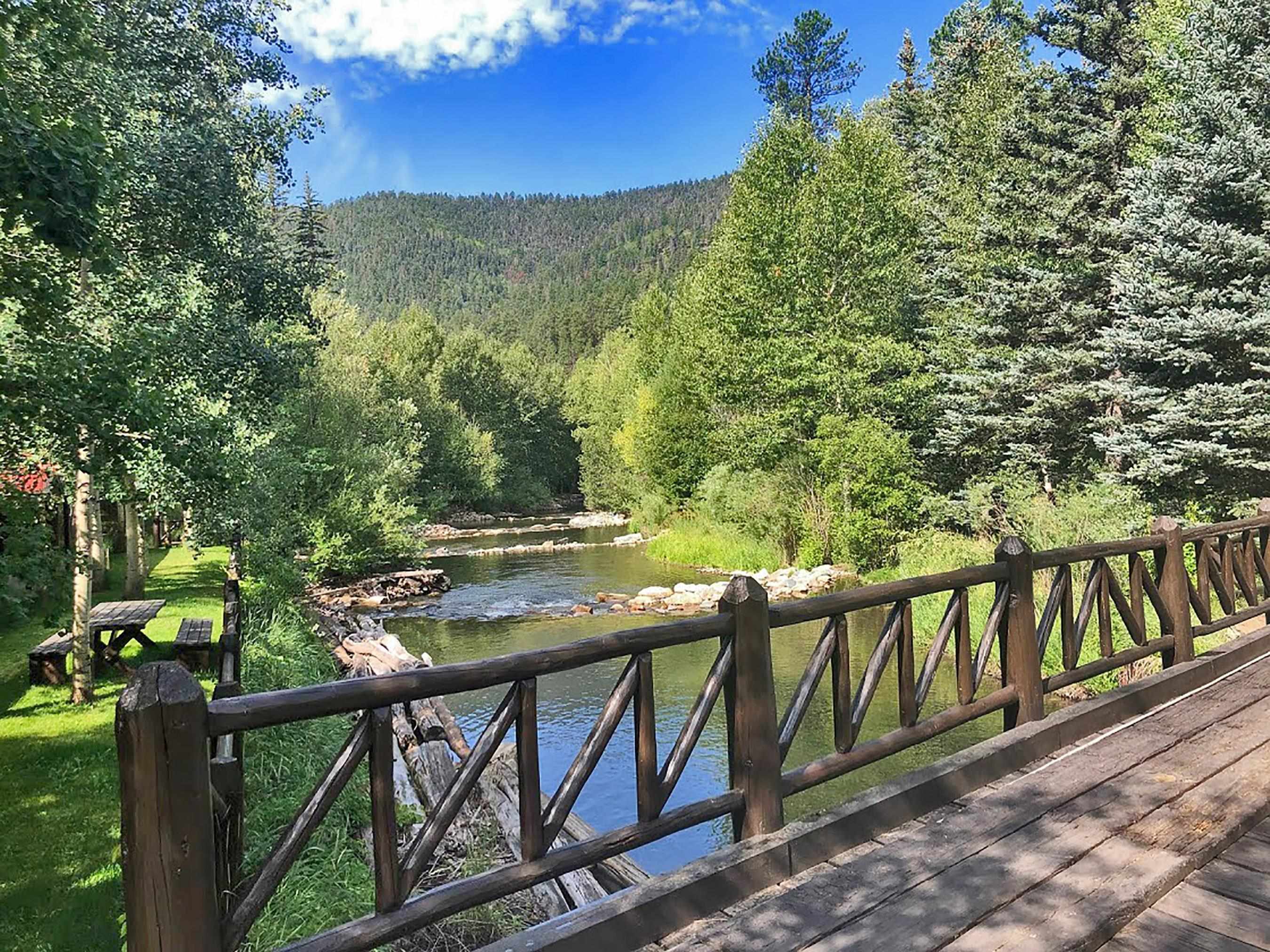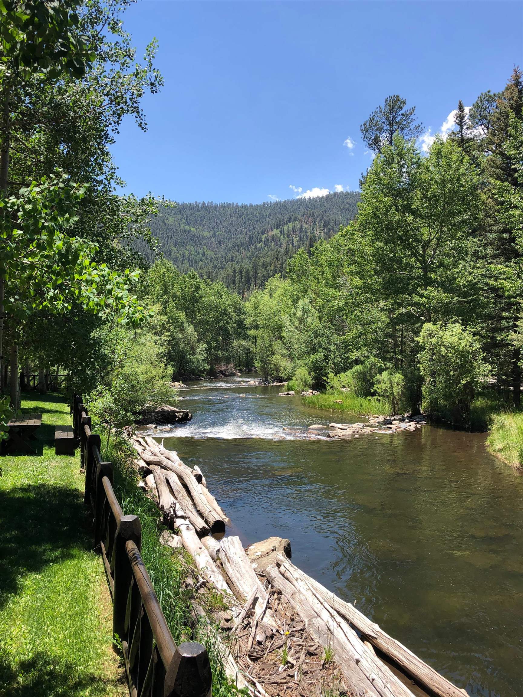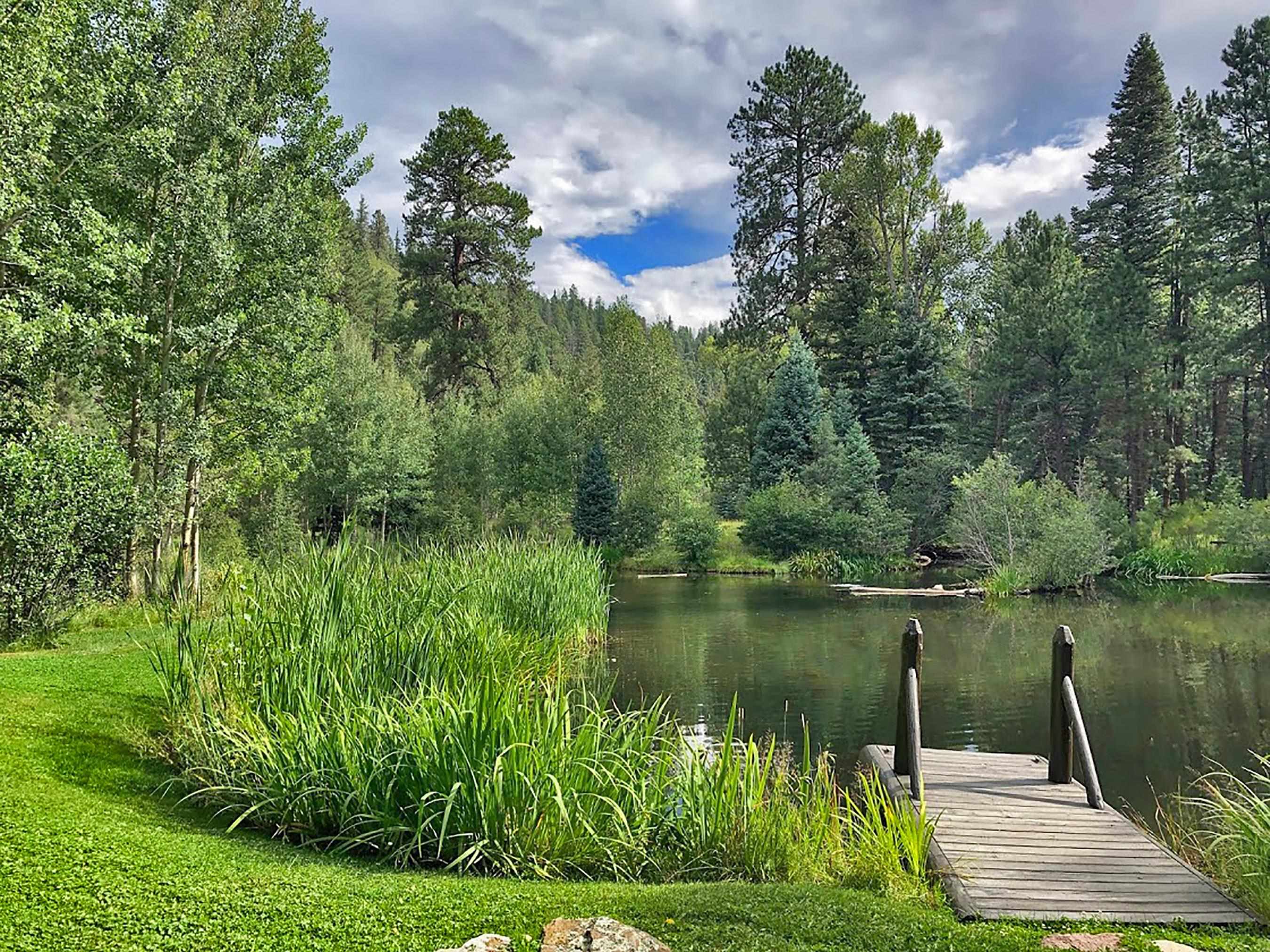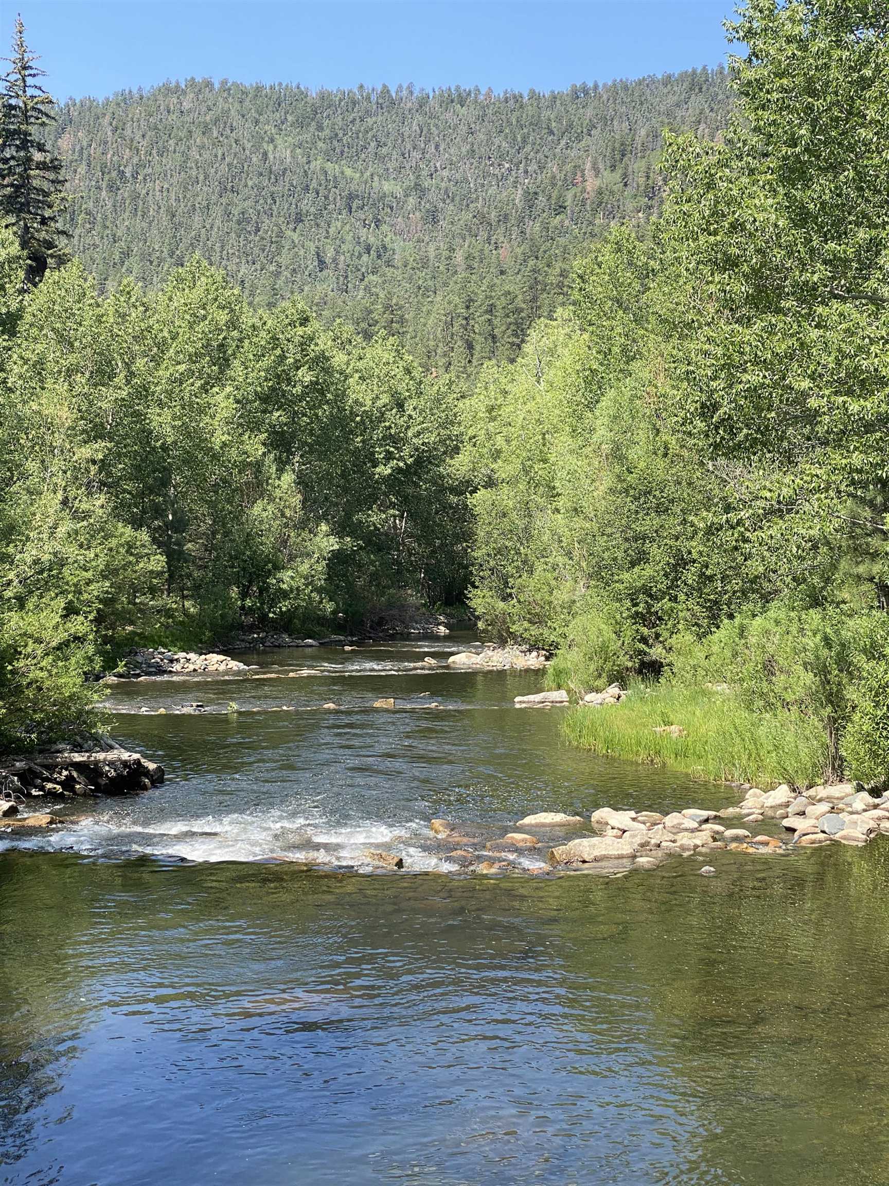 Amid the greenery and tall trees surrounding the legendary Pecos River, this trout lodge is a stylishly rustic getaway. A quintessential mountain cabin, it offers four bedrooms and baths, living and dining rooms, a game room, a breezy wraparound porch, and an upper-level screened porch. The carefully designed aesthetic brings to mind the stylings of Ralph Lauren and features soaring ceilings with sturdy beams and vigas, hardwood floors, and river rock fireplaces. Picturesque views of the iconic setting delight from nearly every vantage point year-round. The property-more than 27 private, fully fenced acres-borders national forest and includes a fishing center with a guest apartment, a caretaker's cabin, and a 2-car garage plus carport. The magnificent live water trout habitat, representing an investment of over $1MM, includes an acequia that feeds a pond that drains into spawning beds. Colorful flowers spring up in the warmer months, while deer and a wide variety of birds visit the land.