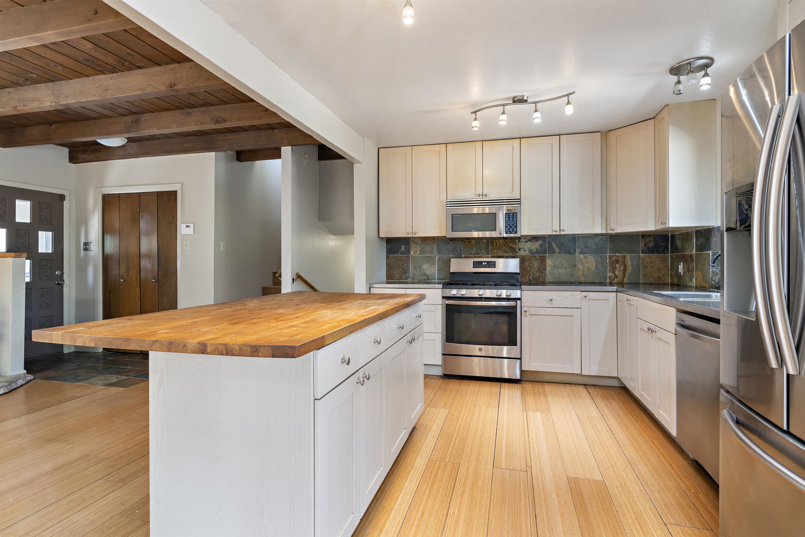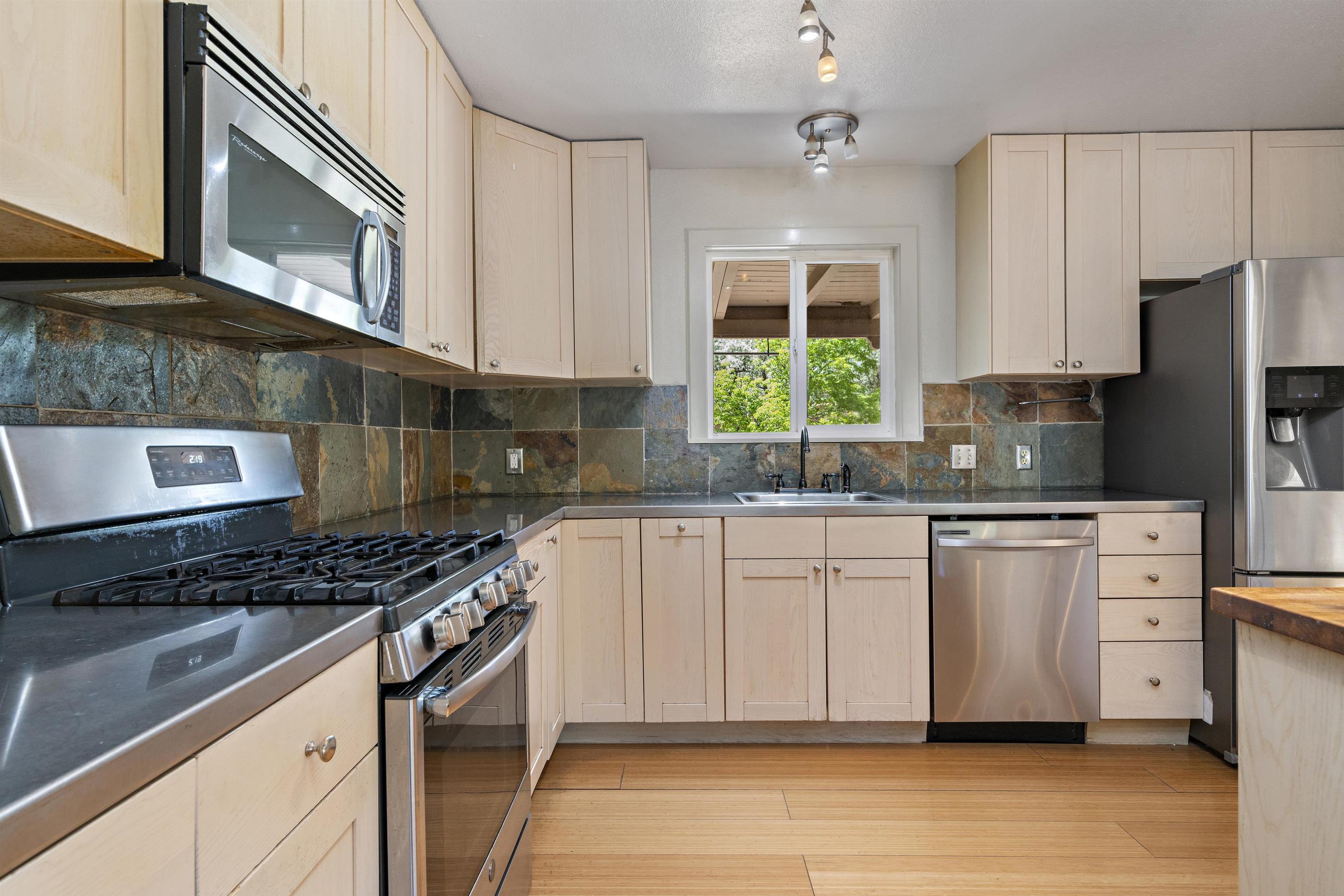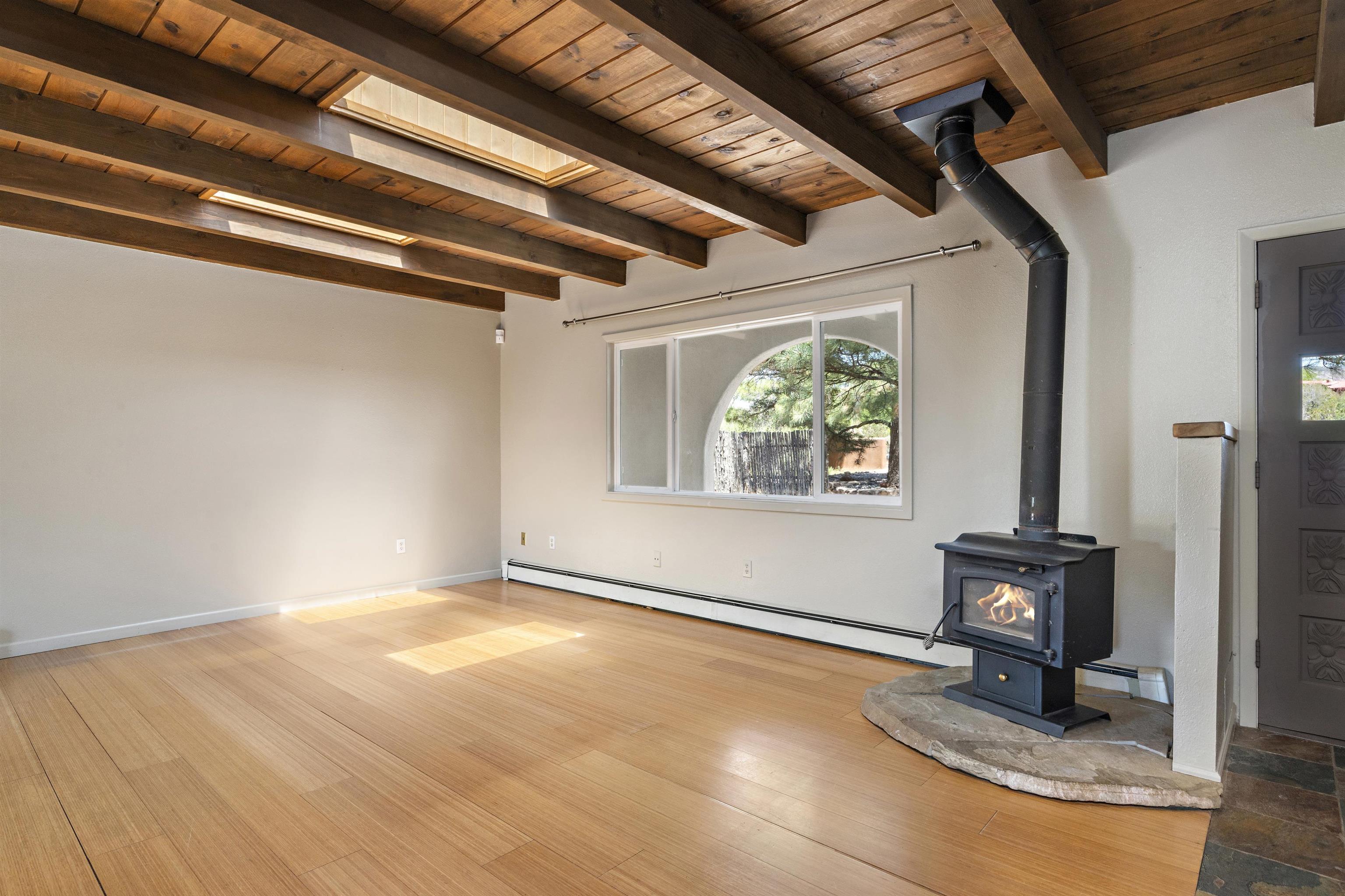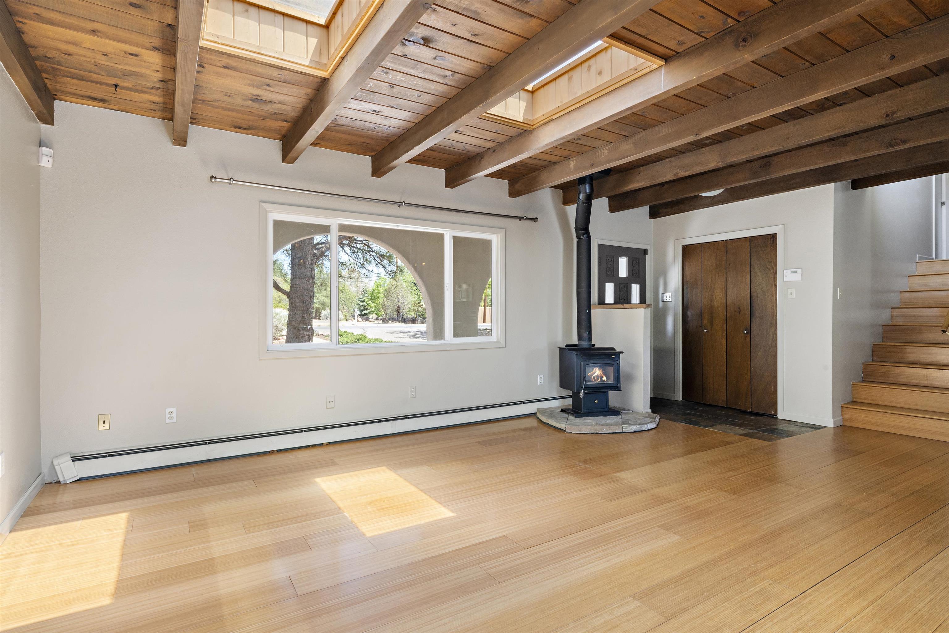 Centrally located tri-level home in close proximity to Rose Park, Hospital, shopping and schools, with a large fenced yard and a variety of mature trees: Aspen, Cherry, Apricot, Apple and Ponderosa Pines. Recently stuccoed, this 3 bedroom house also has a generous-sized office space, or 4th bedroom, with an adjoining bath. Tastefully updated open kitchen with stainless appliances, stainless countertops, and an island that is open to the living and dining space, with a wood burning stove, and direct access to a covered portal and landscaped backyard. Primary bedroom has 2 closets, full bath and a large "Trex" deck. Ground-level media room with a wood-burning fireplace and oak flooring adjoins a sunroom with brick floor. Abundant storage place, and a fantastic floor plan, with a large storage shed in the backyard, this attractive home offers great livability at a terrific location. $25,000 worth of recent improvements: roof, stucco, deck, carpeting, etc.