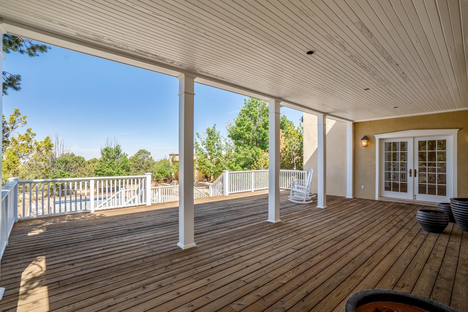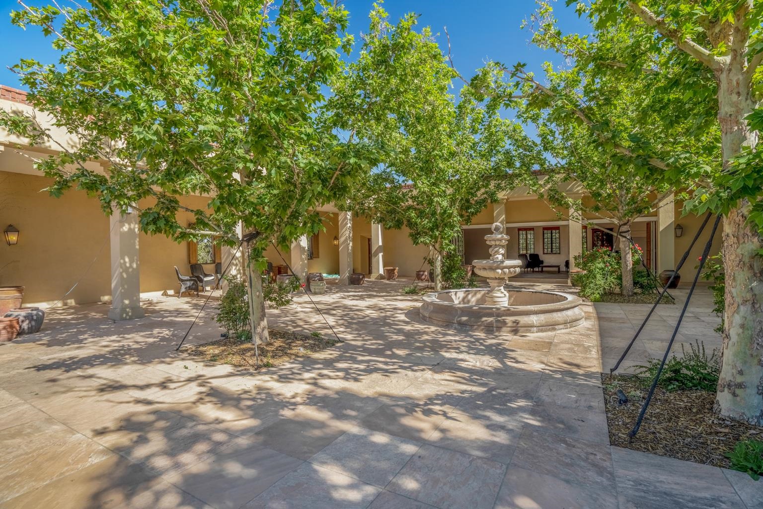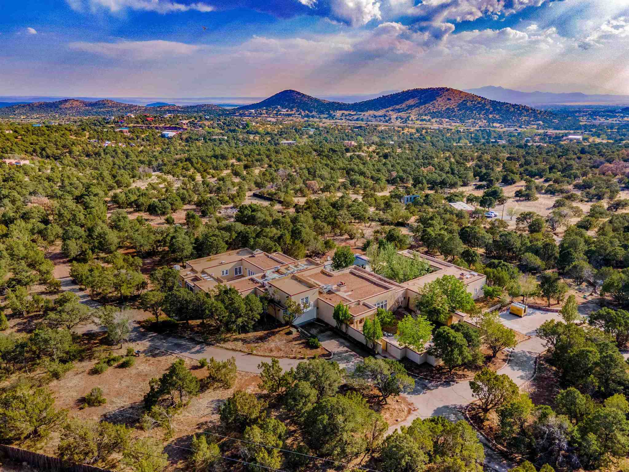 Welcome home to Casa Vistas de Apache. Nestled behind its own gated and walled entrance, This elegant and discerning home was built with only the finest materials. The art gallery entry and living areas are adorned with Mahogany wood doors and slate tile. The Den and library floors are Walnut. This home sits on ten juniper and pinon tree-covered acres consisting of two separately deeded 5-acre parcels, each with its own well, just twenty minutes south of the Historic Santa Fe Plaza. Unlike many homes of this stature in the Santa Fe area, there are no covenants, restrictions, or Hoa, meaning you can do as you wish with the land and home. This home is your own private estate behind your own gate. There are three courtyards with almost 9000 square feet of sandstone tile patio for entertaining poolside or simply enjoying the southwestern sun. The New Mexico sunset views from the library deck are indescribably vibrant and will leave you breathless. The main home features two bedrooms plus other living quarters over the garage that could be perfect for a live-in nanny, in-laws, or simply another guest space, making it a three-bedroom. The pool house, with its fold-away wall of windows to the patio, is an open floor plan primarily for entertaining but may also be used as a separate studio or living space. With something for everyone, see what living at Casa Vistas de Apache may have to offer you.