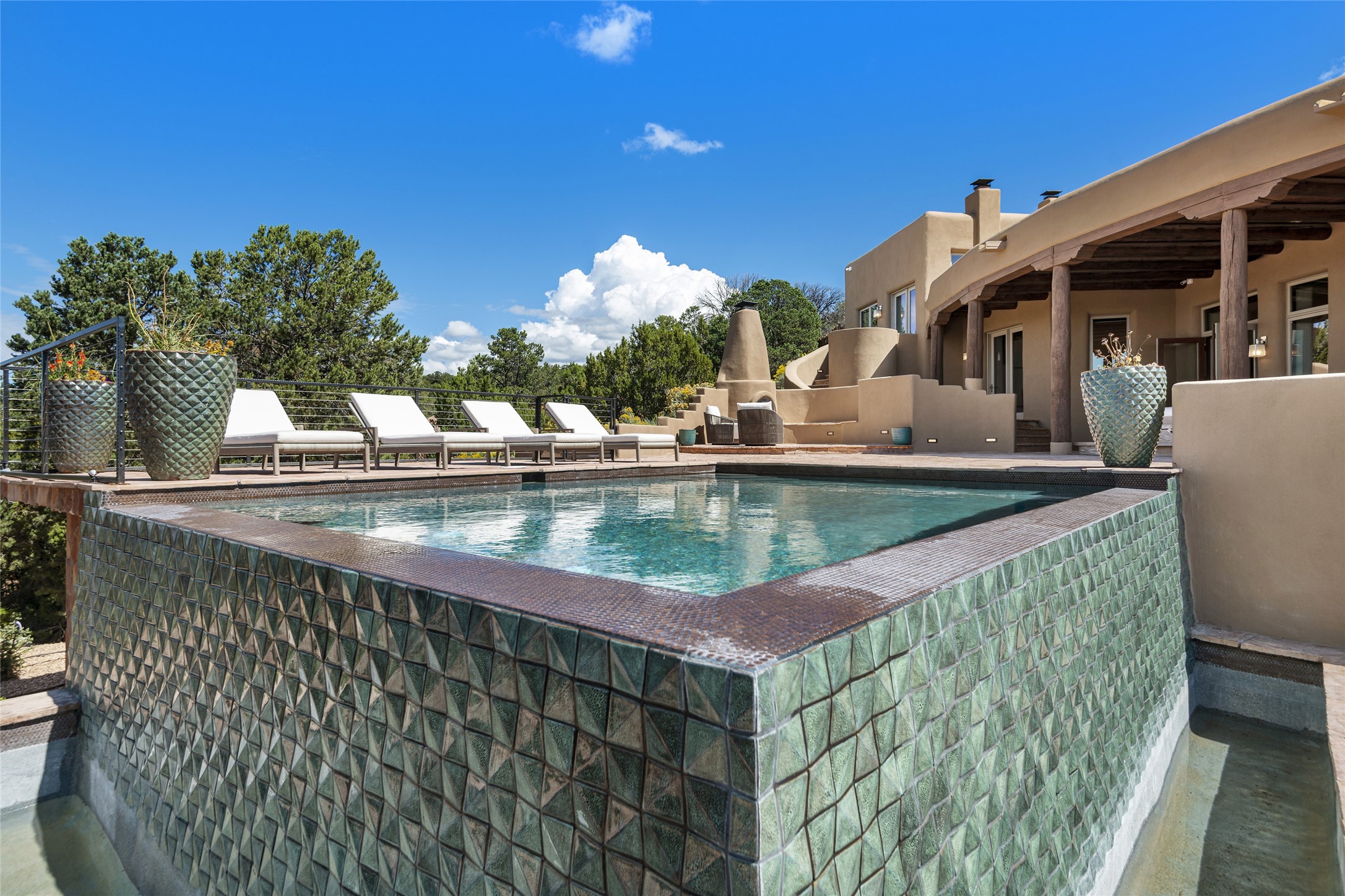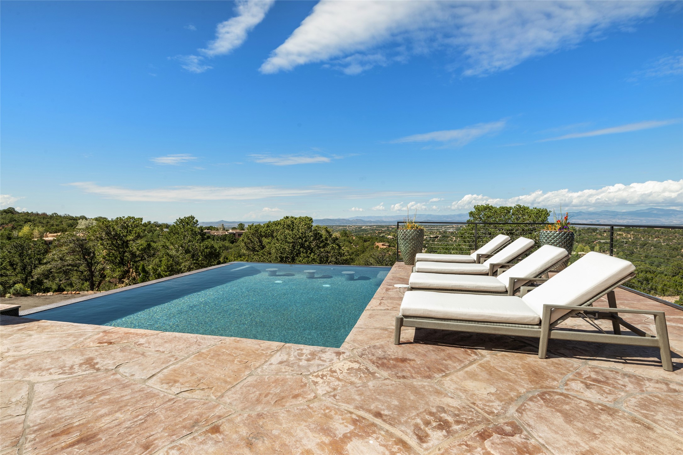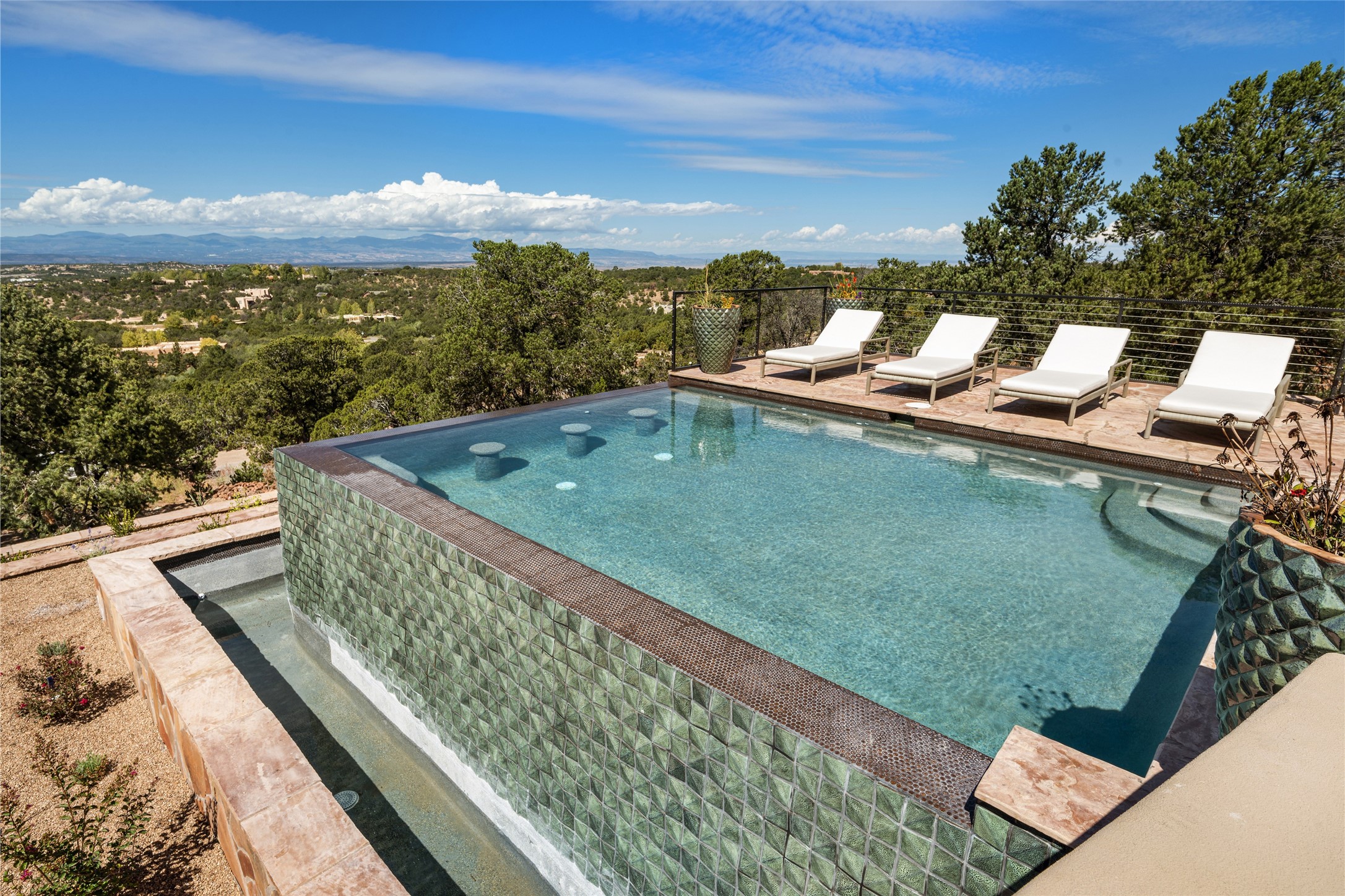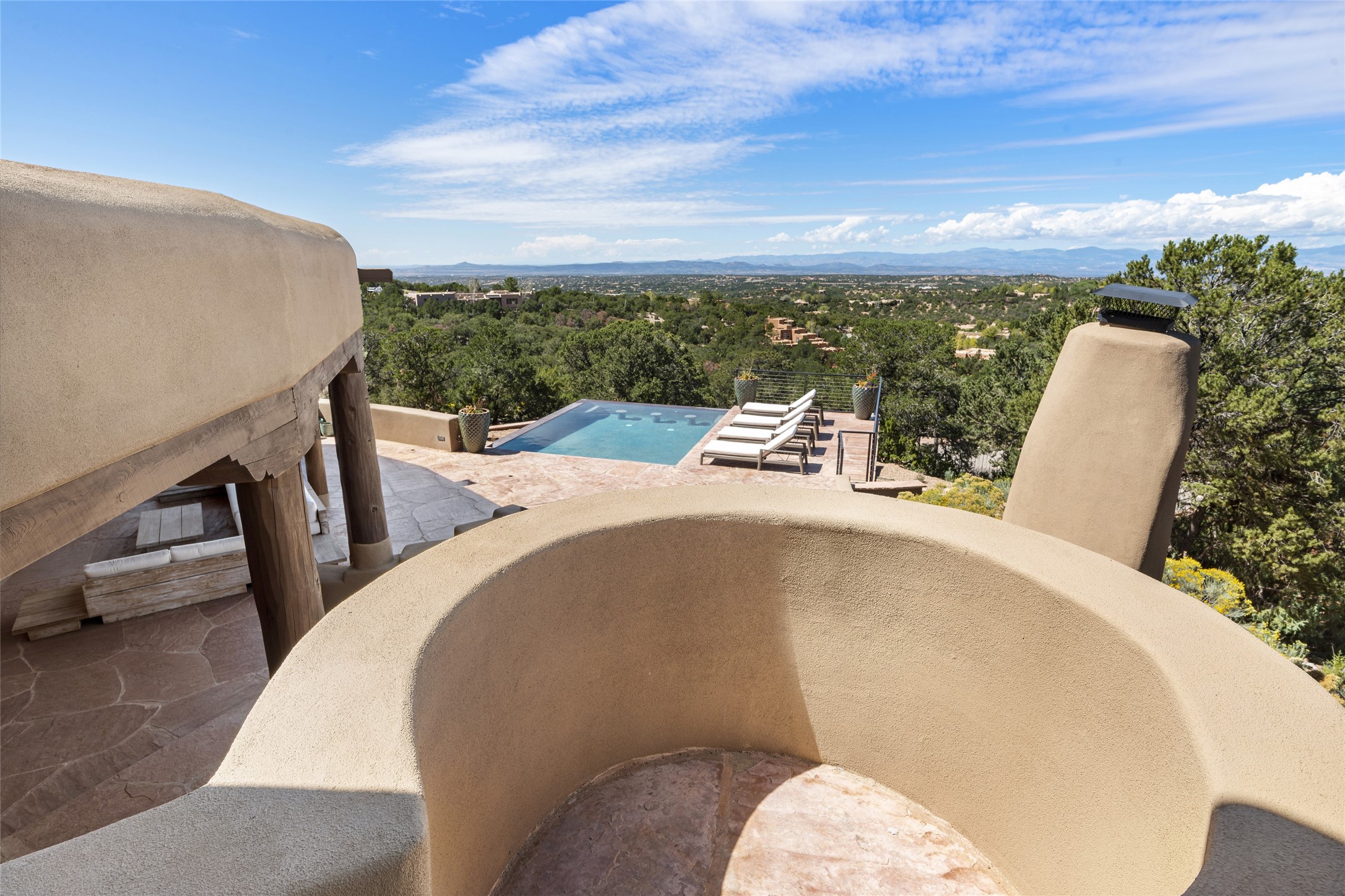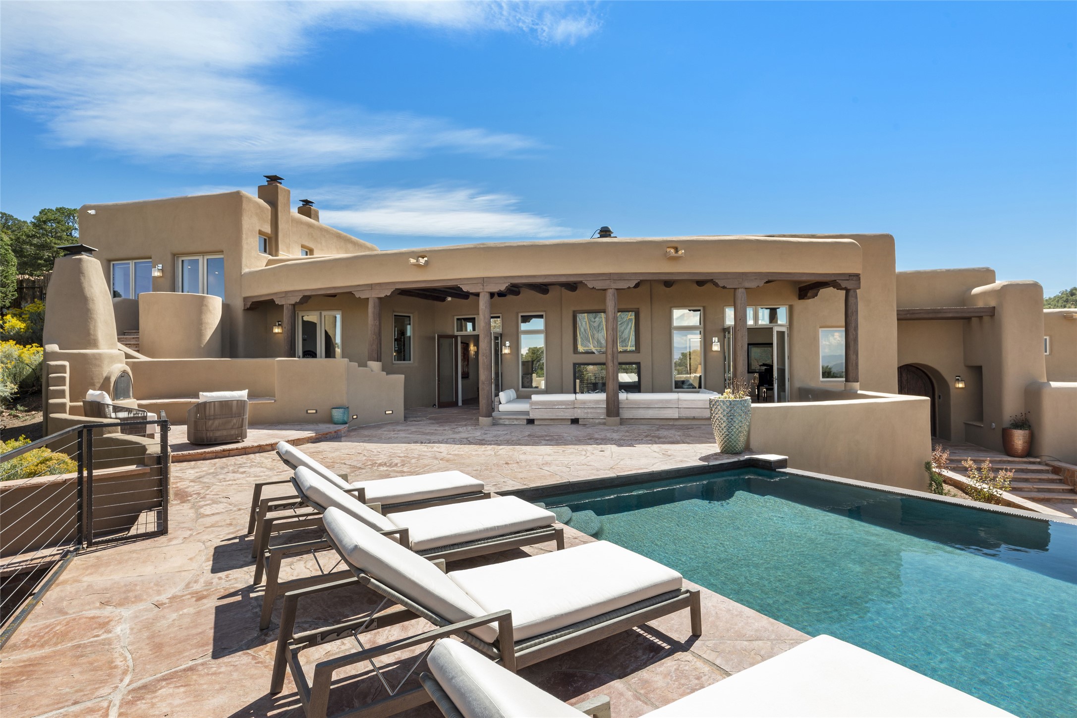 Masterpiece! Gutted to the studs, reimagined to the highest standards and blending a cosmopolitan twist with Santa Fe softness, the resulting 5B/6B home is unique and breathtaking. High above a landscape that stretches for miles, this exceptional multi-level home that hugs the hillside features premiere finishes and customizations throughout. Within the gated entry, the drive leads to a sea-green reflective tile wall framing an infinity pool. The 6,540 square foot floor plan is contained in a classic Pueblo exterior. A great room fashioned for large gatherings centers around a see-through frameless fireplace flanked by windows with views to the patio, infinity pool and western landscape. The kitchen, designed to facilitate large groups with a massive center island, also accommodates more intimate gatherings with counter seating. Custom cabinets, a large wet bar, high-end appliances and a wine room leave nothing to be desired. An interior courtyard is the perfect setting for smaller groups or household gatherings. A private media room with built-in bookshelves and fireplace adjuncts the Primary Suite as well as an oversized bath with double vanities and artisan tile walls. Three guest bedroom suites (two with sitting rooms) are positioned for ultimate privacy opposite the Primary wing. Other features include a heated garage with attached room that can be used as another guest room, exercise room or office, a Butler's pantry and beautifully landscaped backyard.