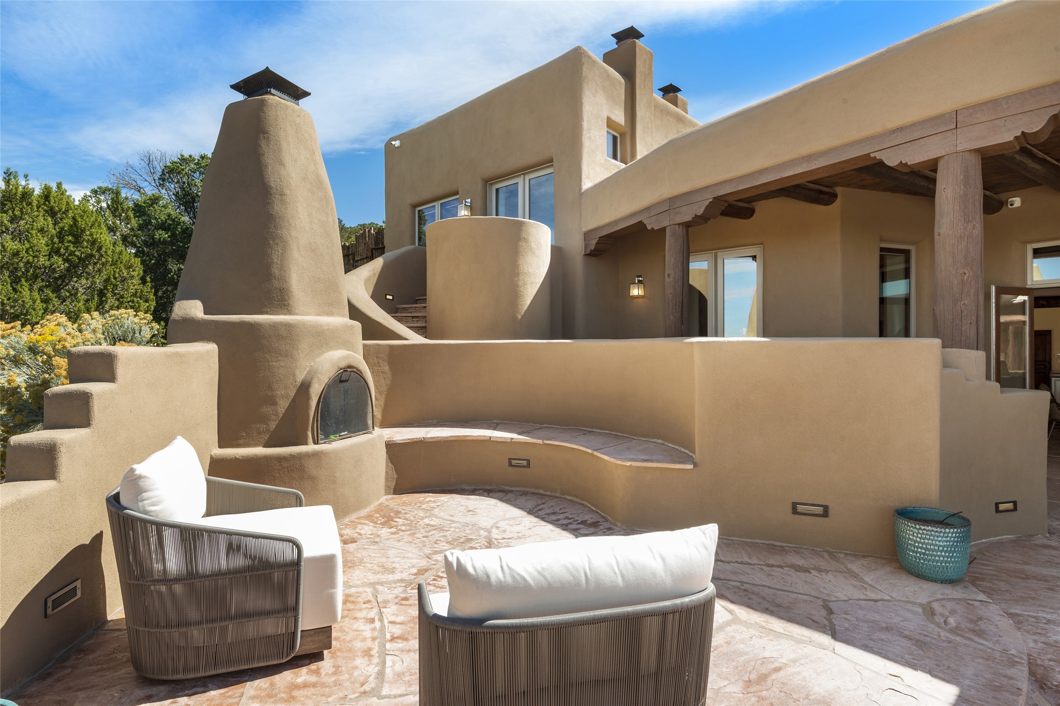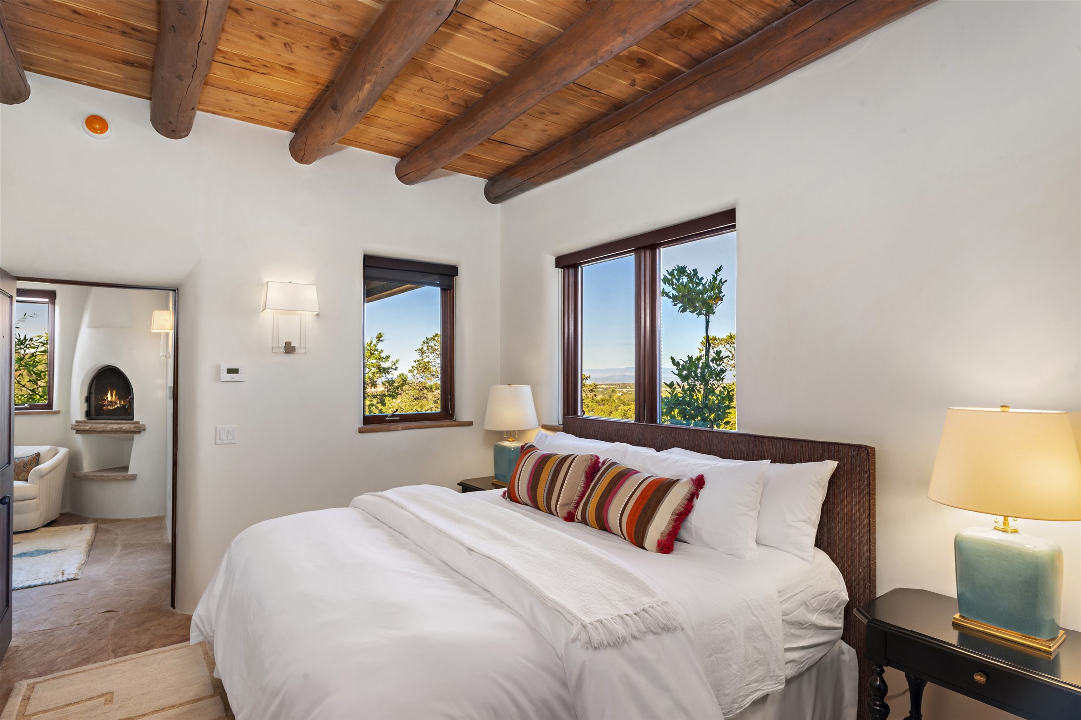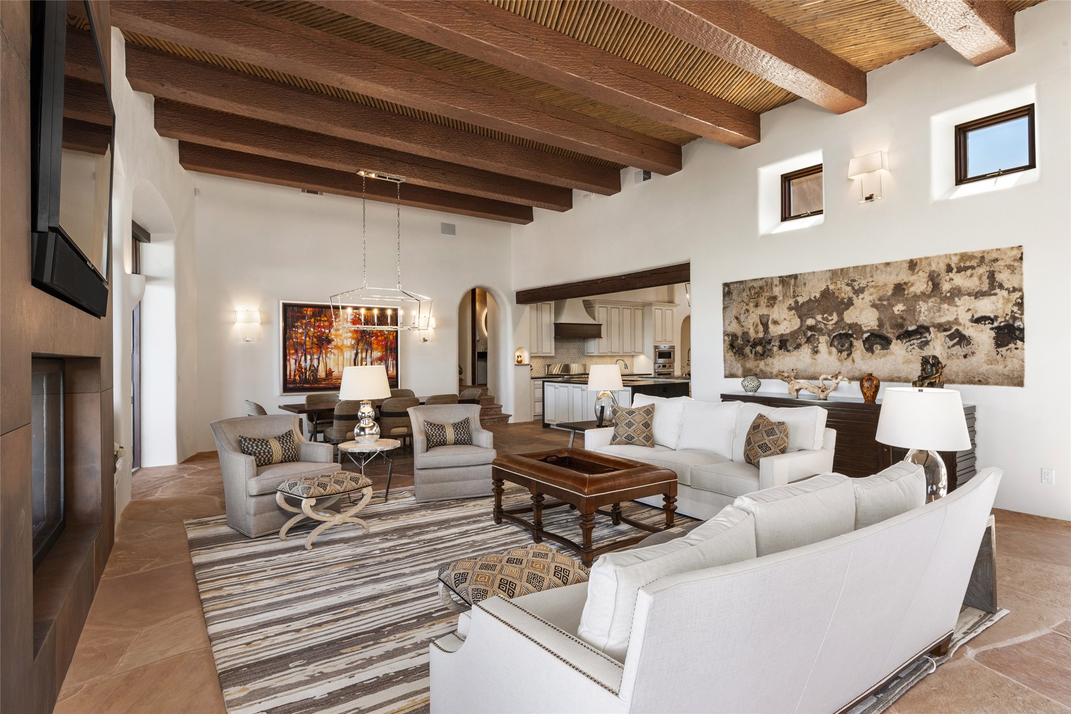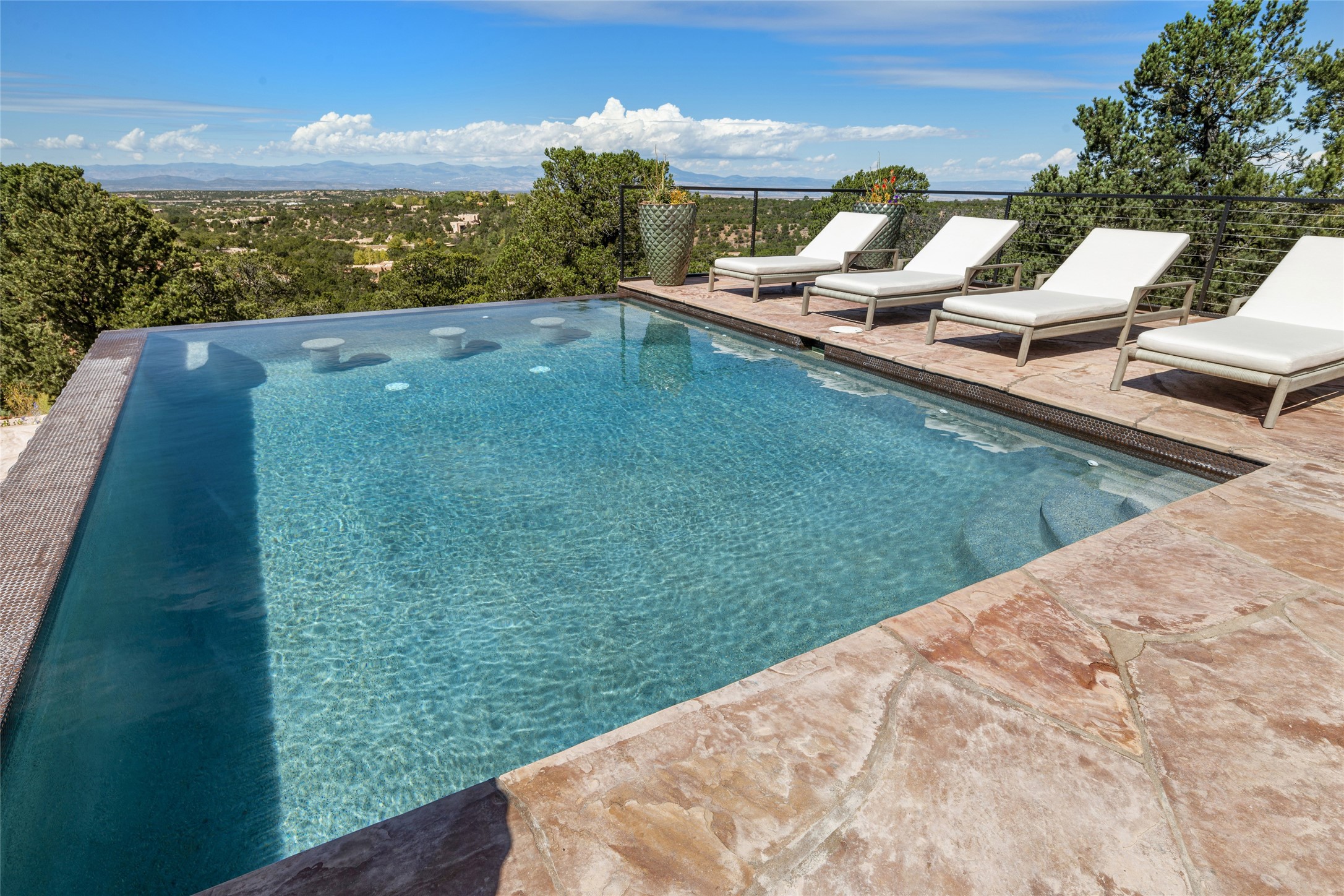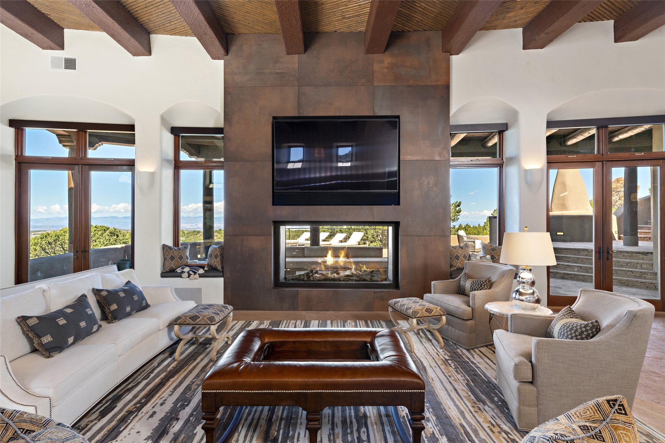 Masterpiece! Gutted to the studs, reimagined to the highest standards and blending a cosmopolitan twist with Santa Fe softness, the resulting 5B/6B home is unique and breathtaking. High above a landscape that stretches for miles, this exceptional multi-level home that hugs the hillside features premiere finishes and customizations throughout. Within the gated entry, the drive leads to a sea-green reflective tile wall framing an infinity pool. The 6,540 square foot floor plan is contained in a classic Pueblo exterior. A great room fashioned for large gatherings centers around a see-through frameless fireplace flanked by windows with views to the patio, infinity pool and western landscape. The kitchen, designed to facilitate large groups with a massive center island, also accommodates more intimate gatherings with counter seating. Custom cabinets, a large wet bar, high-end appliances and a wine room leave nothing to be desired. An interior courtyard is the perfect setting for smaller groups or household gatherings. A private media room with built-in bookshelves and fireplace adjuncts the Primary Suite as well as an oversized bath with double vanities and artisan tile walls. Three guest bedroom suites (two with sitting rooms) are positioned for ultimate privacy opposite the Primary wing. Other features include a heated garage with attached room that can be used as another guest room, exercise room or office, a Butler's pantry and beautifully landscaped backyard.