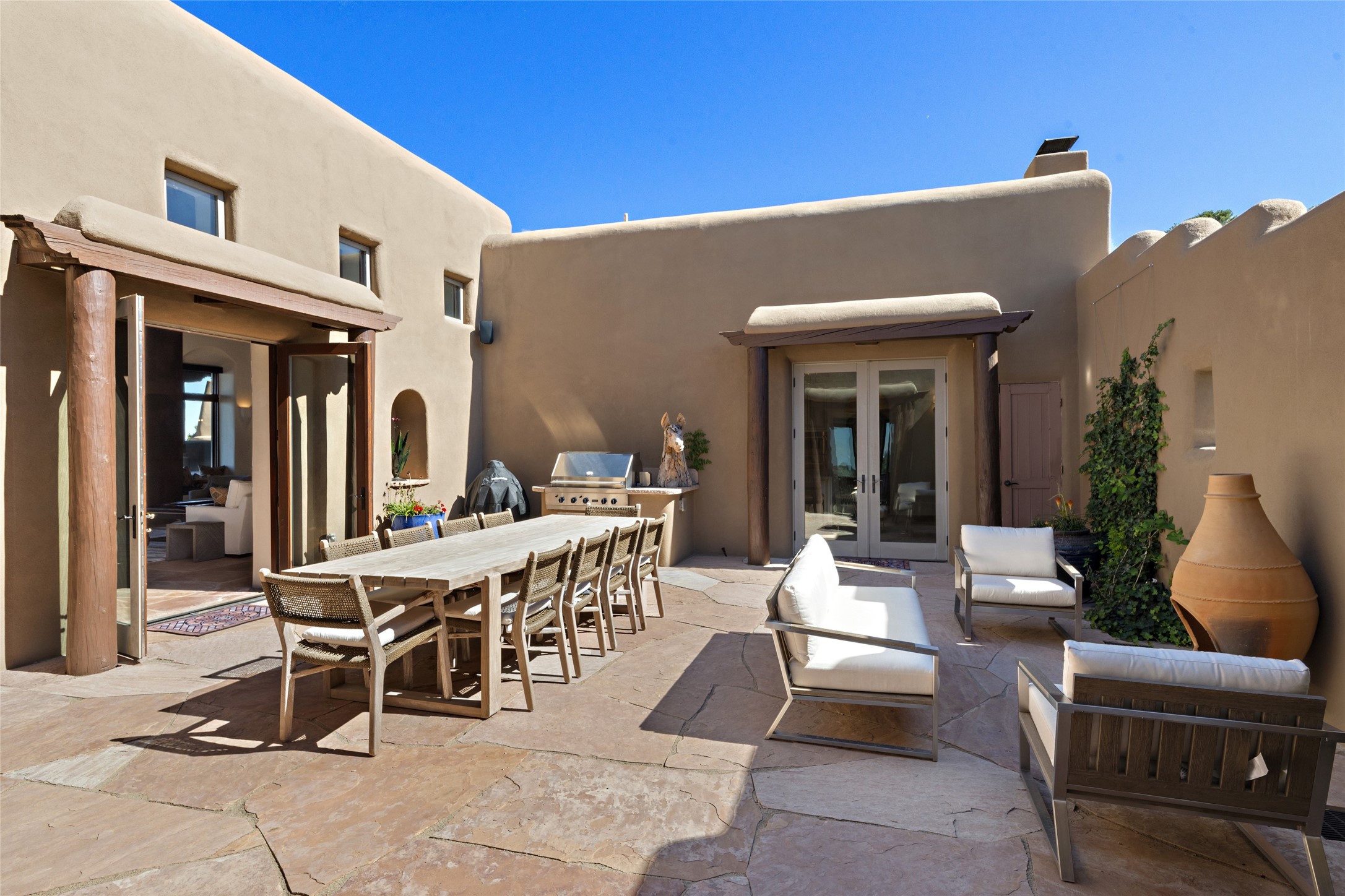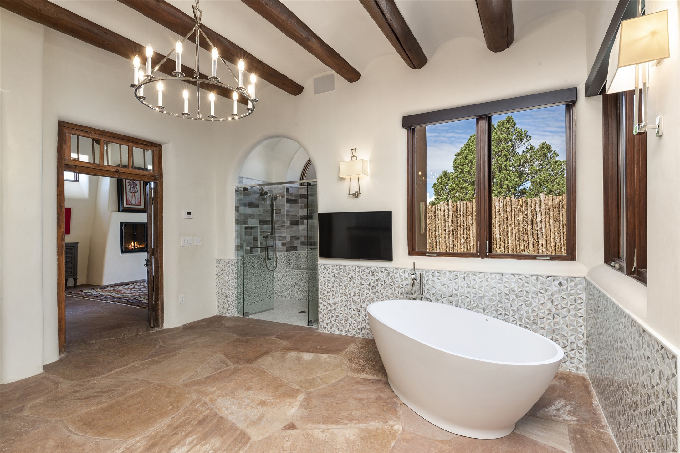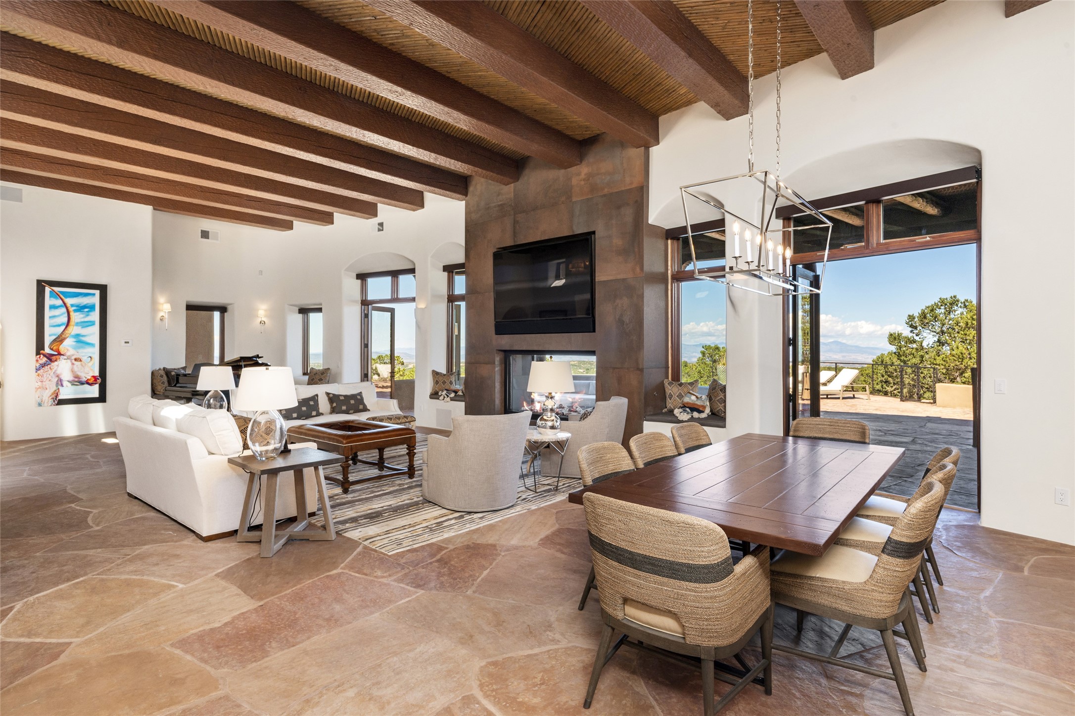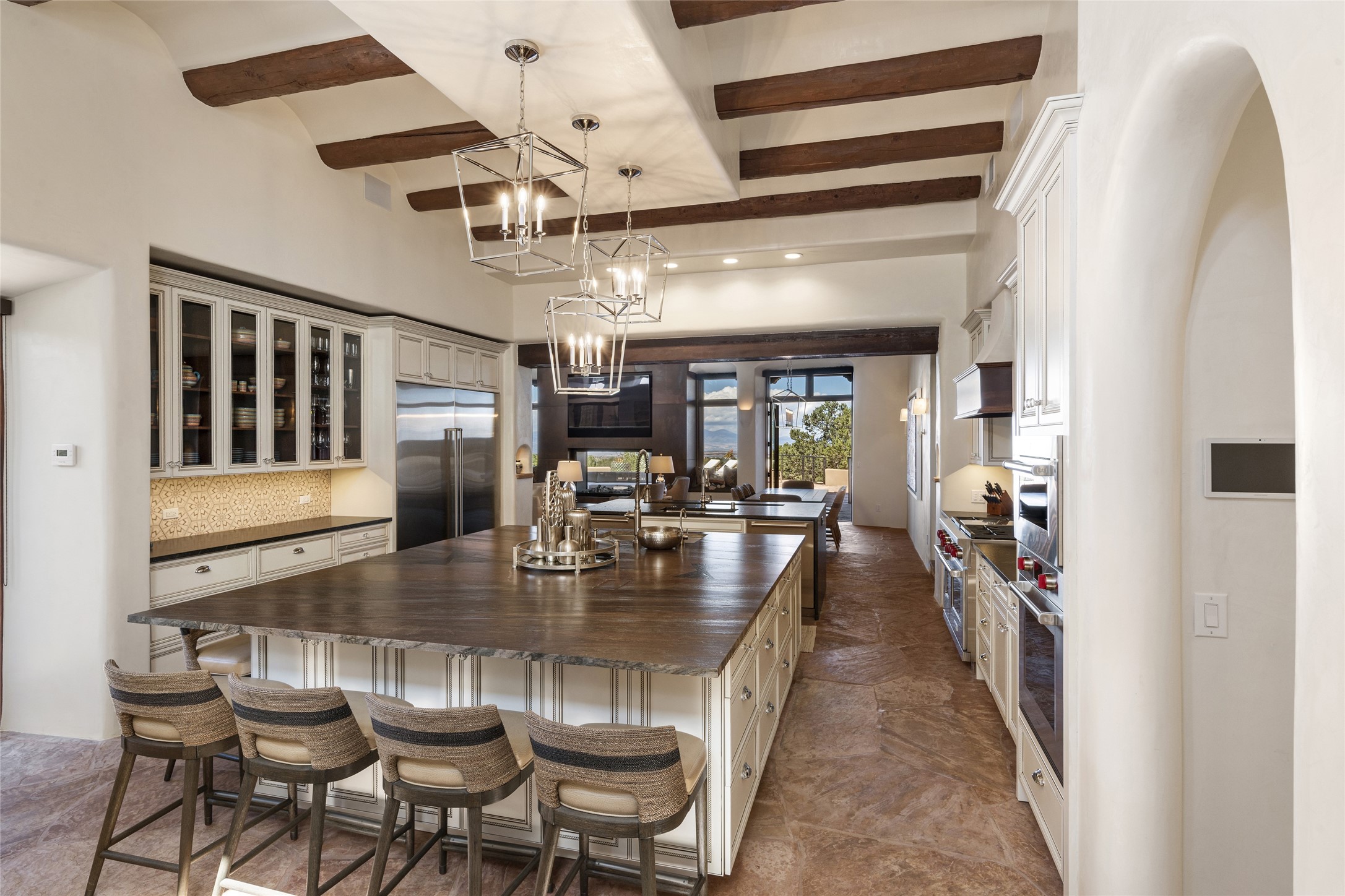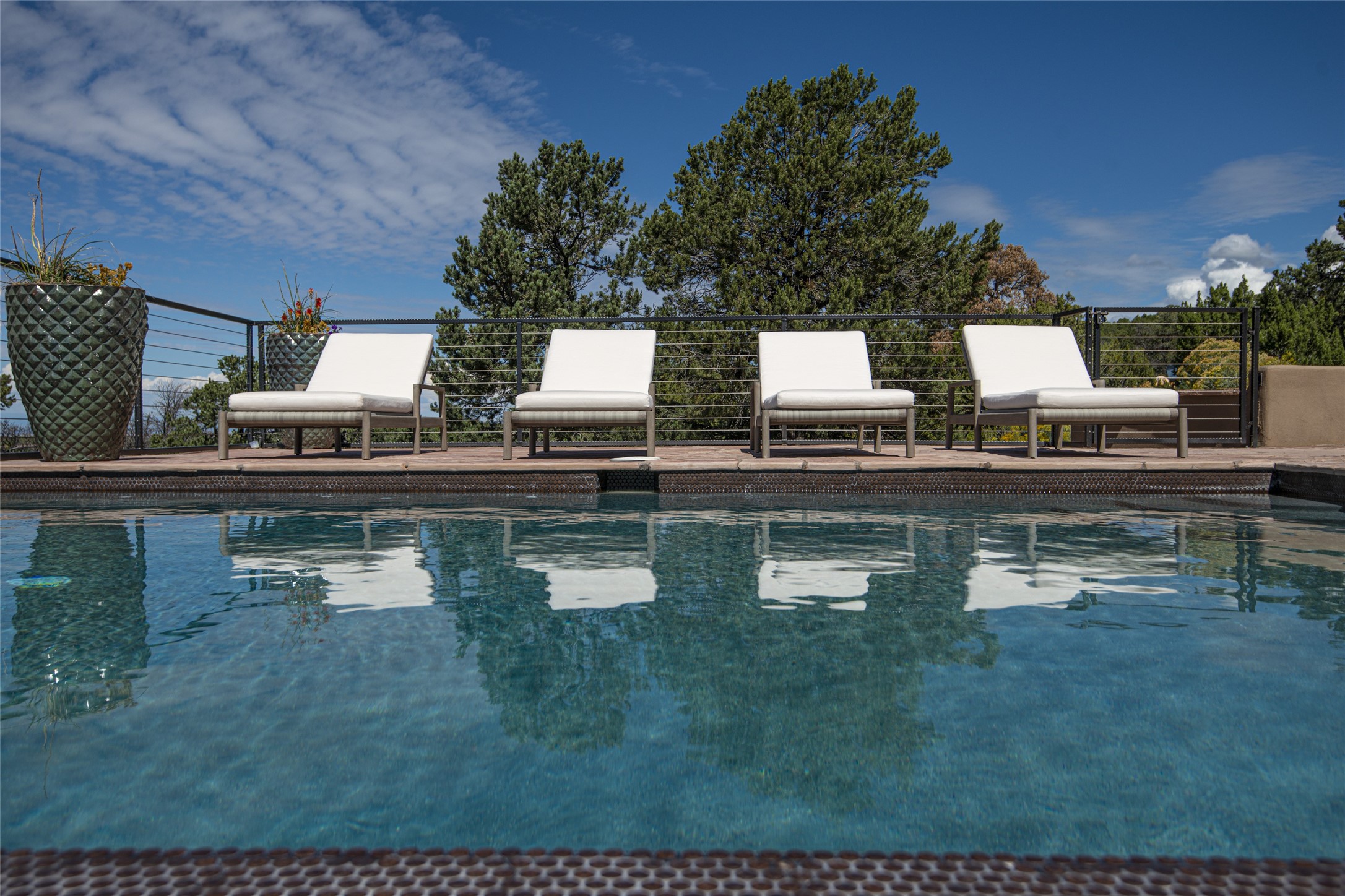 Masterpiece! Gutted to the studs, reimagined to the highest standards and blending a cosmopolitan twist with Santa Fe softness, the resulting 5B/6B home is unique and breathtaking. High above a landscape that stretches for miles, this exceptional multi-level home that hugs the hillside features premiere finishes and customizations throughout. Within the gated entry, the drive leads to a sea-green reflective tile wall framing an infinity pool. The 6,540 square foot floor plan is contained in a classic Pueblo exterior. A great room fashioned for large gatherings centers around a see-through frameless fireplace flanked by windows with views to the patio, infinity pool and western landscape. The kitchen, designed to facilitate large groups with a massive center island, also accommodates more intimate gatherings with counter seating. Custom cabinets, a large wet bar, high-end appliances and a wine room leave nothing to be desired. An interior courtyard is the perfect setting for smaller groups or household gatherings. A private media room with built-in bookshelves and fireplace adjuncts the Primary Suite as well as an oversized bath with double vanities and artisan tile walls. Three guest bedroom suites (two with sitting rooms) are positioned for ultimate privacy opposite the Primary wing. Other features include a heated garage with attached room that can be used as another guest room, exercise room or office, a Butler's pantry and beautifully landscaped backyard.