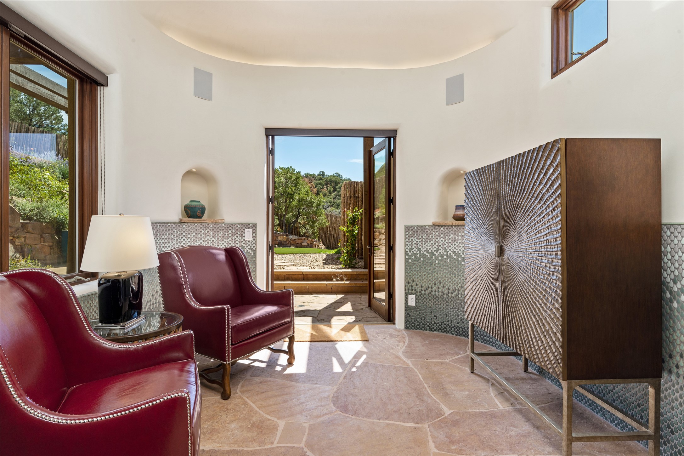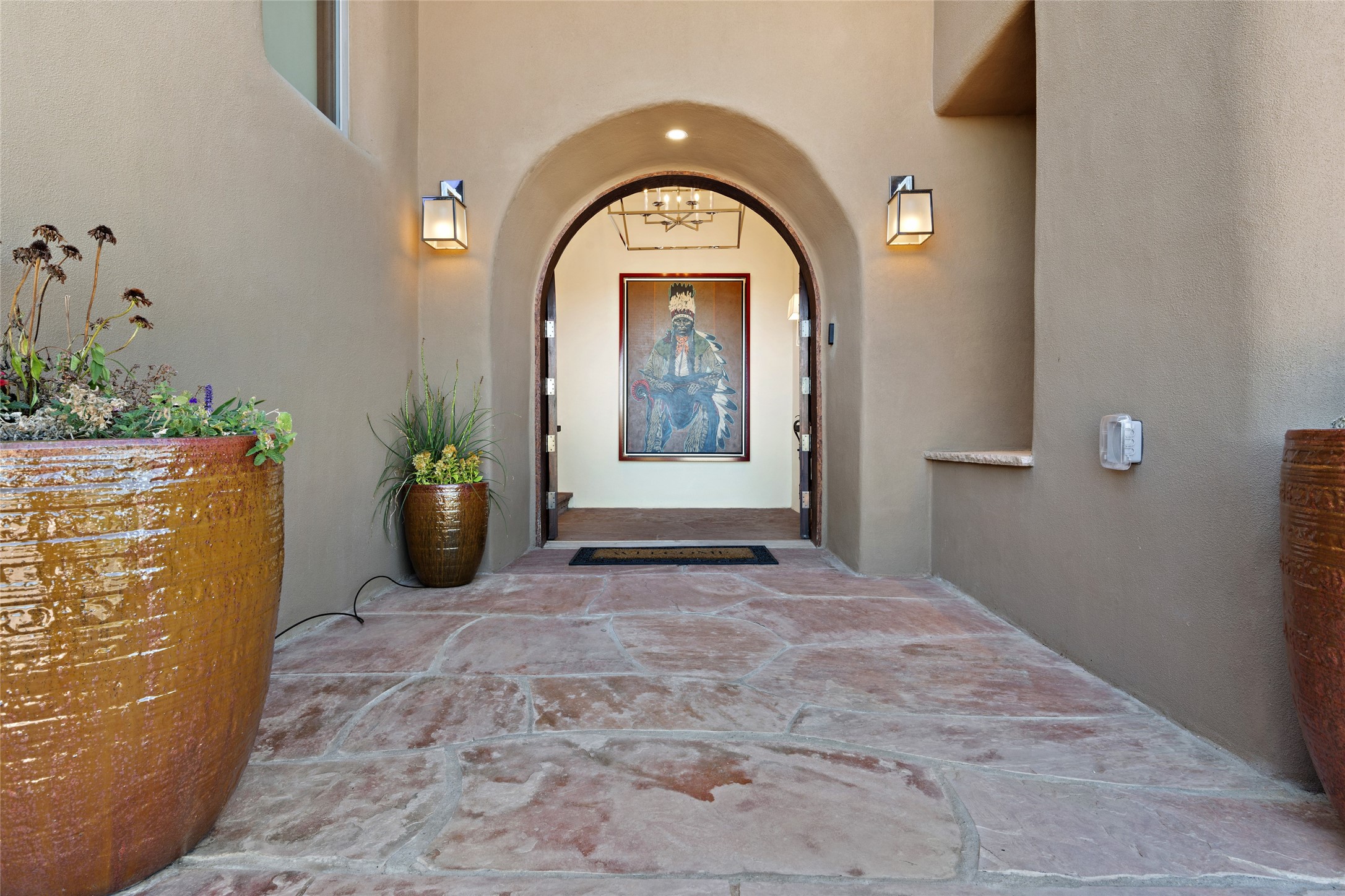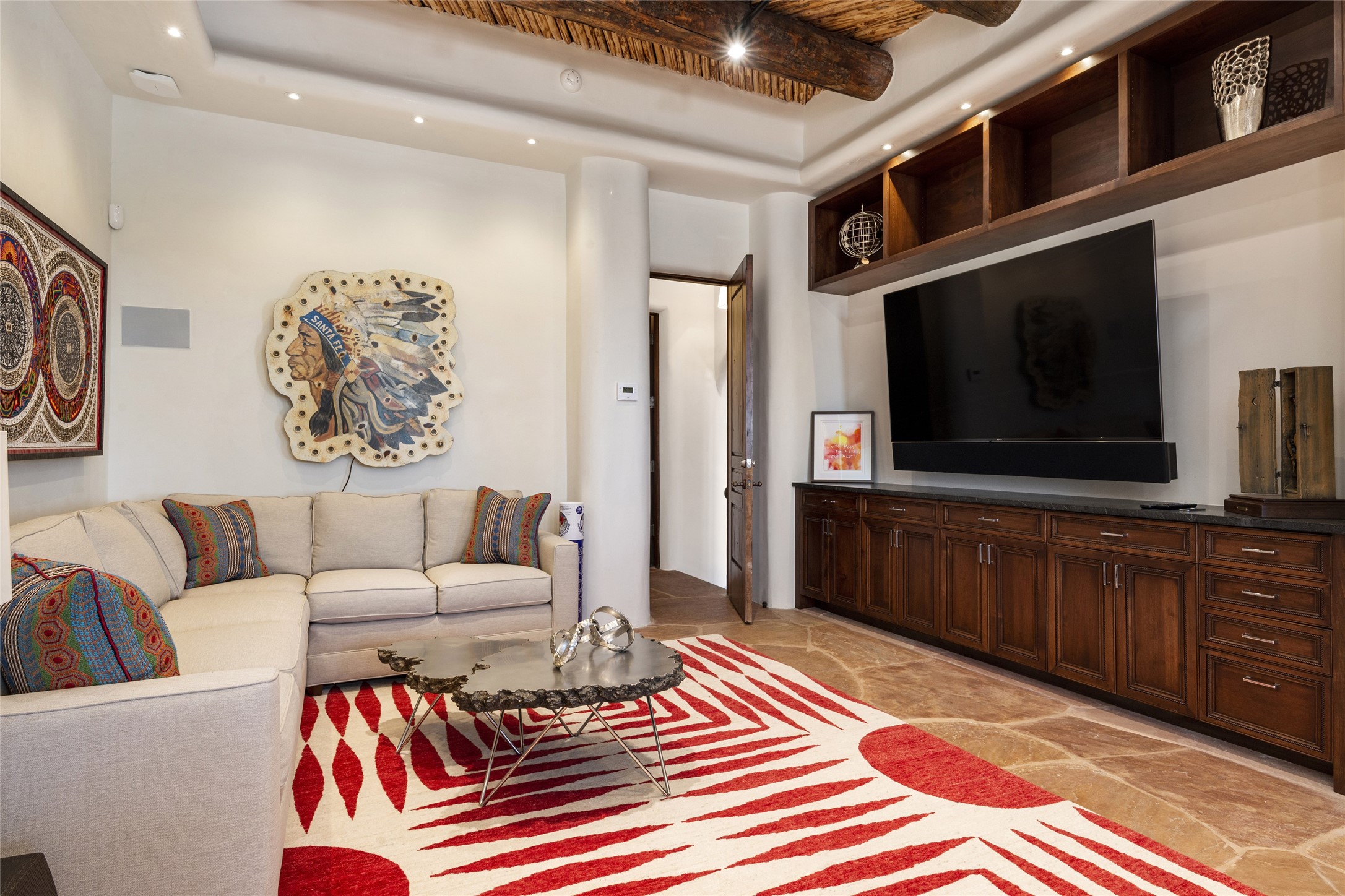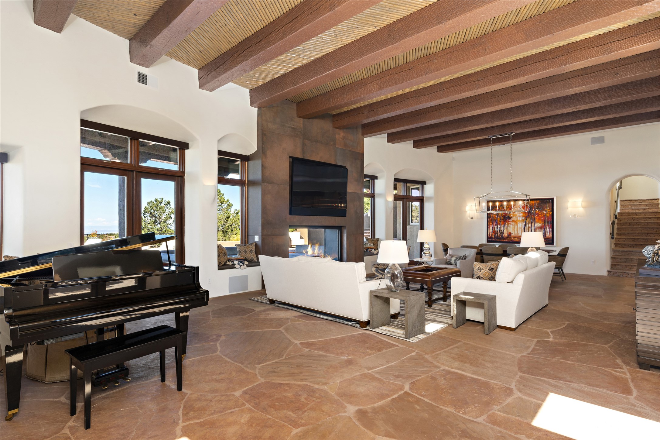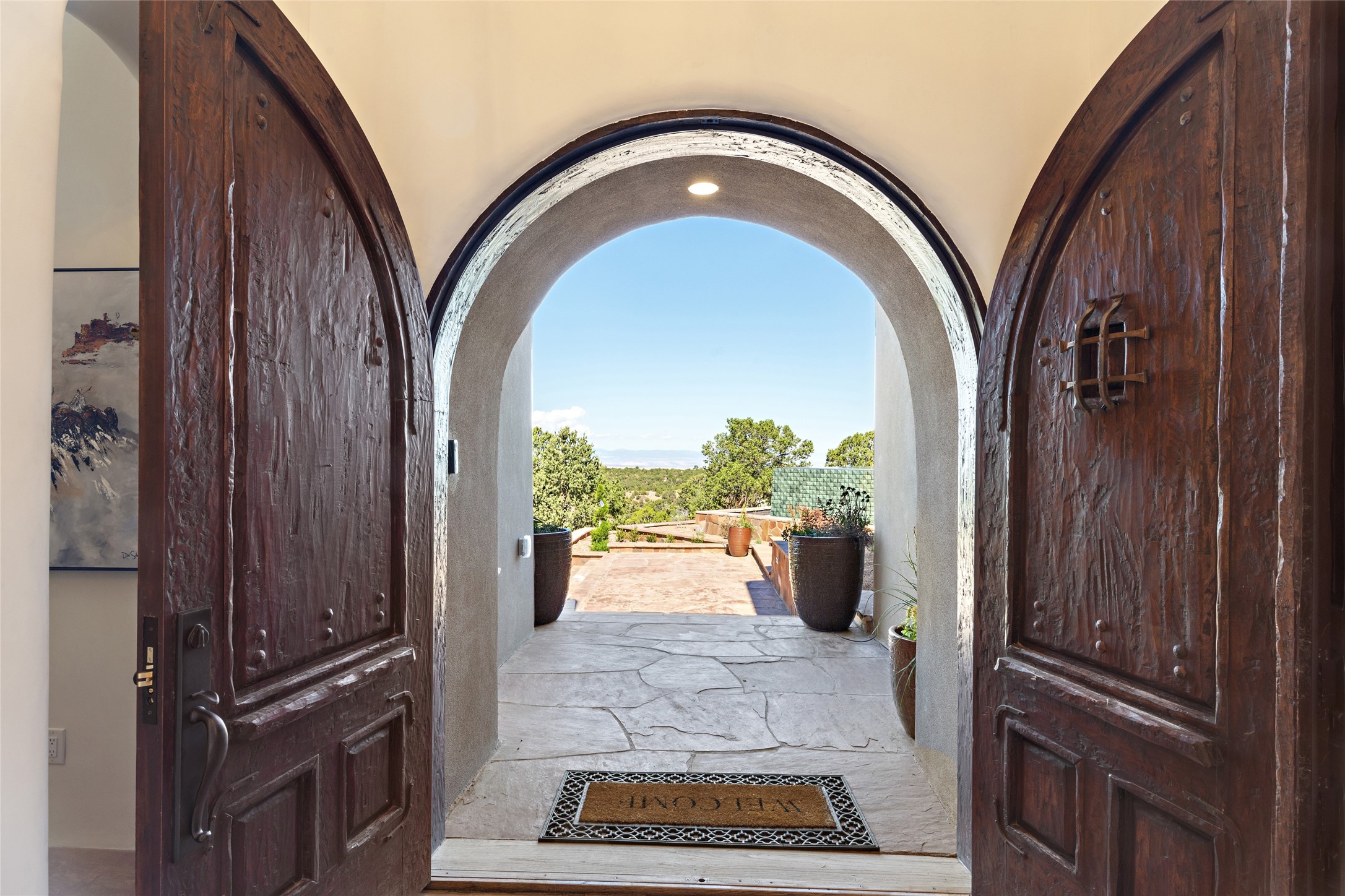 Masterpiece! Gutted to the studs, reimagined to the highest standards and blending a cosmopolitan twist with Santa Fe softness, the resulting 5B/6B home is unique and breathtaking. High above a landscape that stretches for miles, this exceptional multi-level home that hugs the hillside features premiere finishes and customizations throughout. Within the gated entry, the drive leads to a sea-green reflective tile wall framing an infinity pool. The 6,540 square foot floor plan is contained in a classic Pueblo exterior. A great room fashioned for large gatherings centers around a see-through frameless fireplace flanked by windows with views to the patio, infinity pool and western landscape. The kitchen, designed to facilitate large groups with a massive center island, also accommodates more intimate gatherings with counter seating. Custom cabinets, a large wet bar, high-end appliances and a wine room leave nothing to be desired. An interior courtyard is the perfect setting for smaller groups or household gatherings. A private media room with built-in bookshelves and fireplace adjuncts the Primary Suite as well as an oversized bath with double vanities and artisan tile walls. Three guest bedroom suites (two with sitting rooms) are positioned for ultimate privacy opposite the Primary wing. Other features include a heated garage with attached room that can be used as another guest room, exercise room or office, a Butler's pantry and beautifully landscaped backyard.