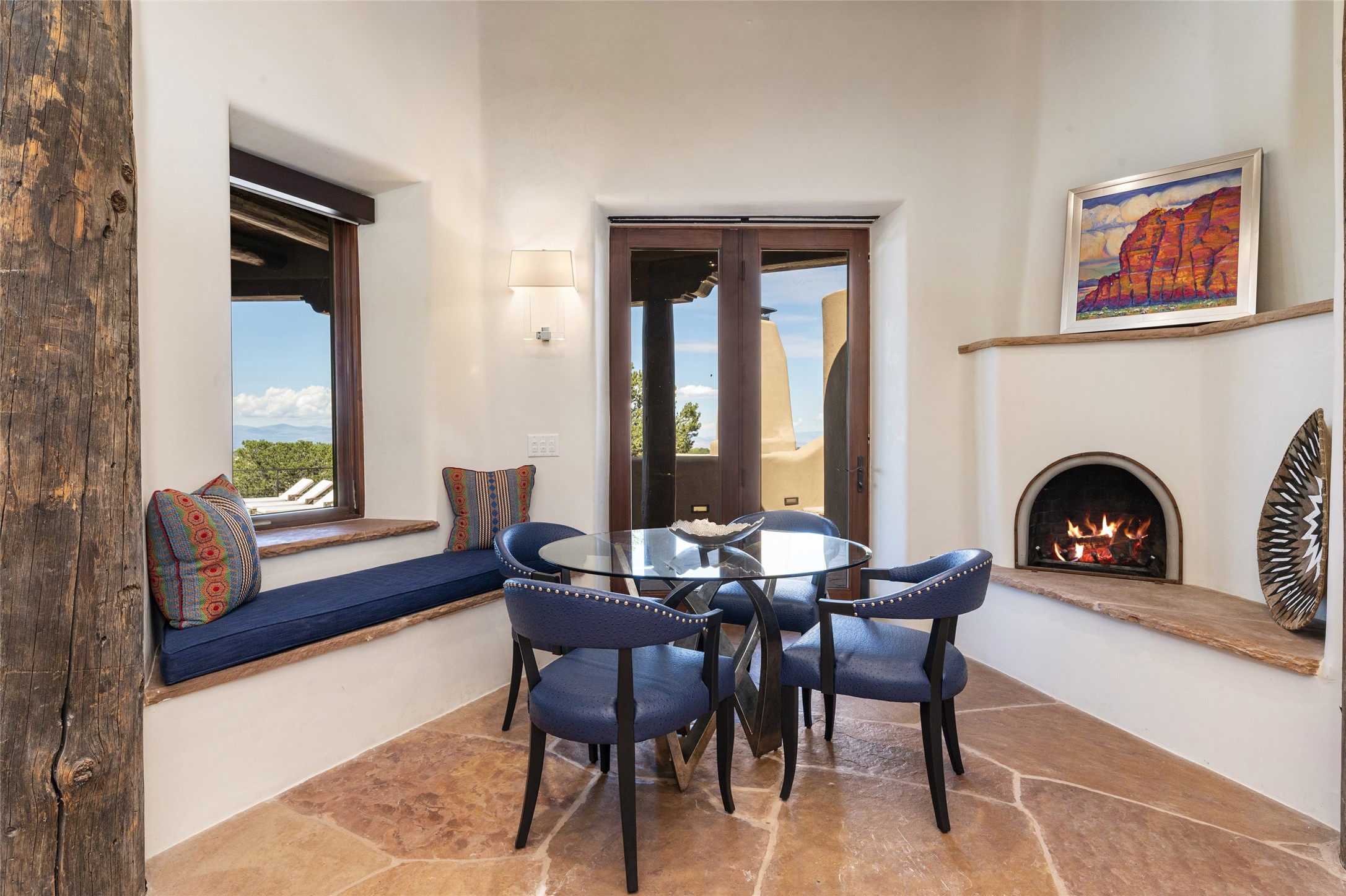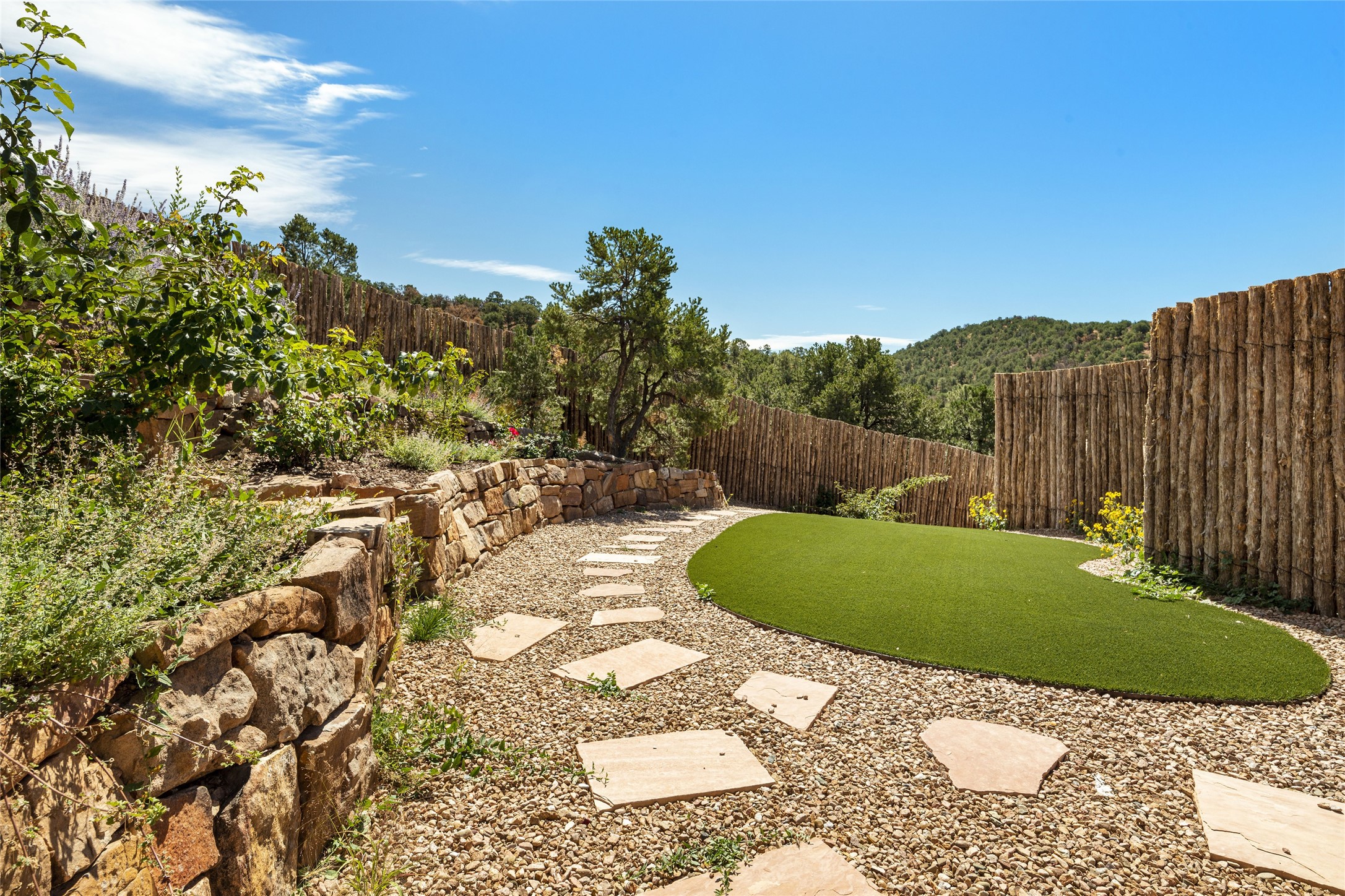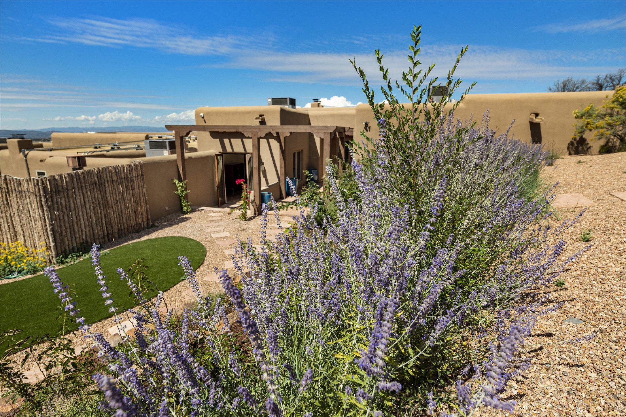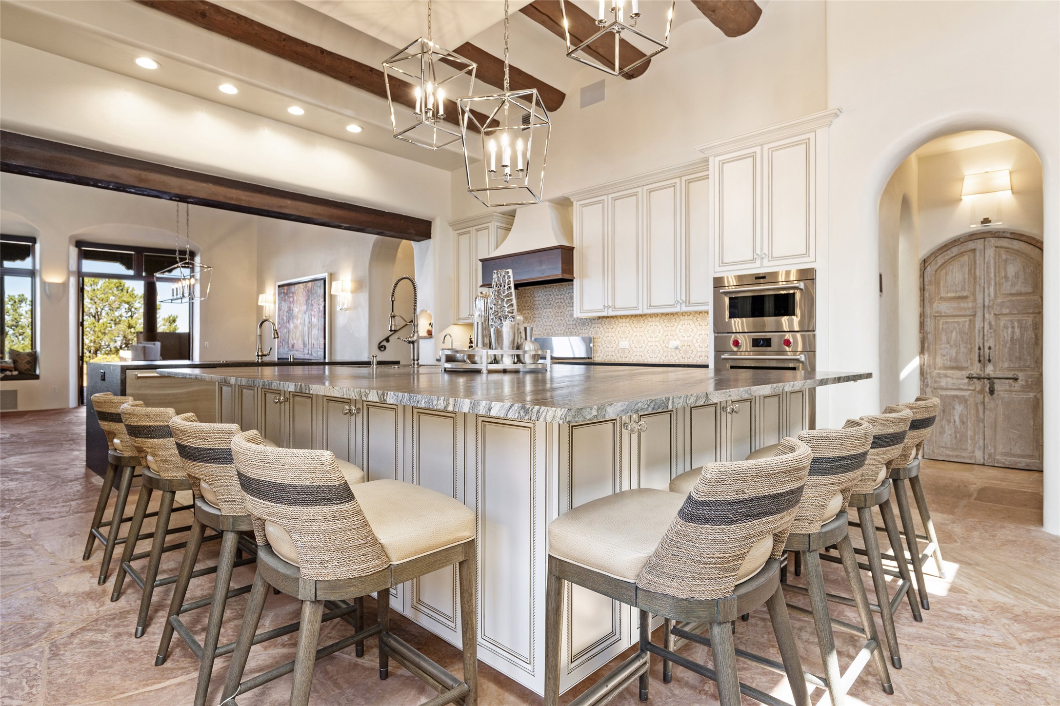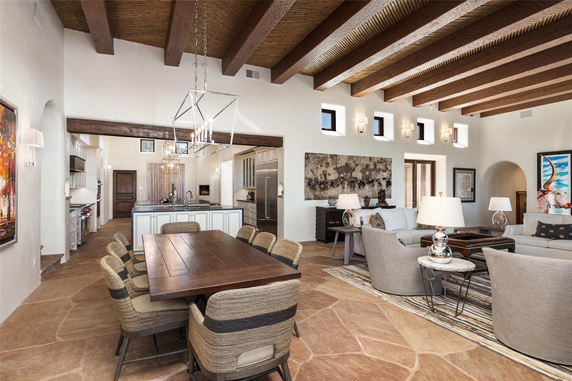 Masterpiece! Gutted to the studs, reimagined to the highest standards and blending a cosmopolitan twist with Santa Fe softness, the resulting 5B/6B home is unique and breathtaking. High above a landscape that stretches for miles, this exceptional multi-level home that hugs the hillside features premiere finishes and customizations throughout. Within the gated entry, the drive leads to a sea-green reflective tile wall framing an infinity pool. The 6,540 square foot floor plan is contained in a classic Pueblo exterior. A great room fashioned for large gatherings centers around a see-through frameless fireplace flanked by windows with views to the patio, infinity pool and western landscape. The kitchen, designed to facilitate large groups with a massive center island, also accommodates more intimate gatherings with counter seating. Custom cabinets, a large wet bar, high-end appliances and a wine room leave nothing to be desired. An interior courtyard is the perfect setting for smaller groups or household gatherings. A private media room with built-in bookshelves and fireplace adjuncts the Primary Suite as well as an oversized bath with double vanities and artisan tile walls. Three guest bedroom suites (two with sitting rooms) are positioned for ultimate privacy opposite the Primary wing. Other features include a heated garage with attached room that can be used as another guest room, exercise room or office, a Butler's pantry and beautifully landscaped backyard.