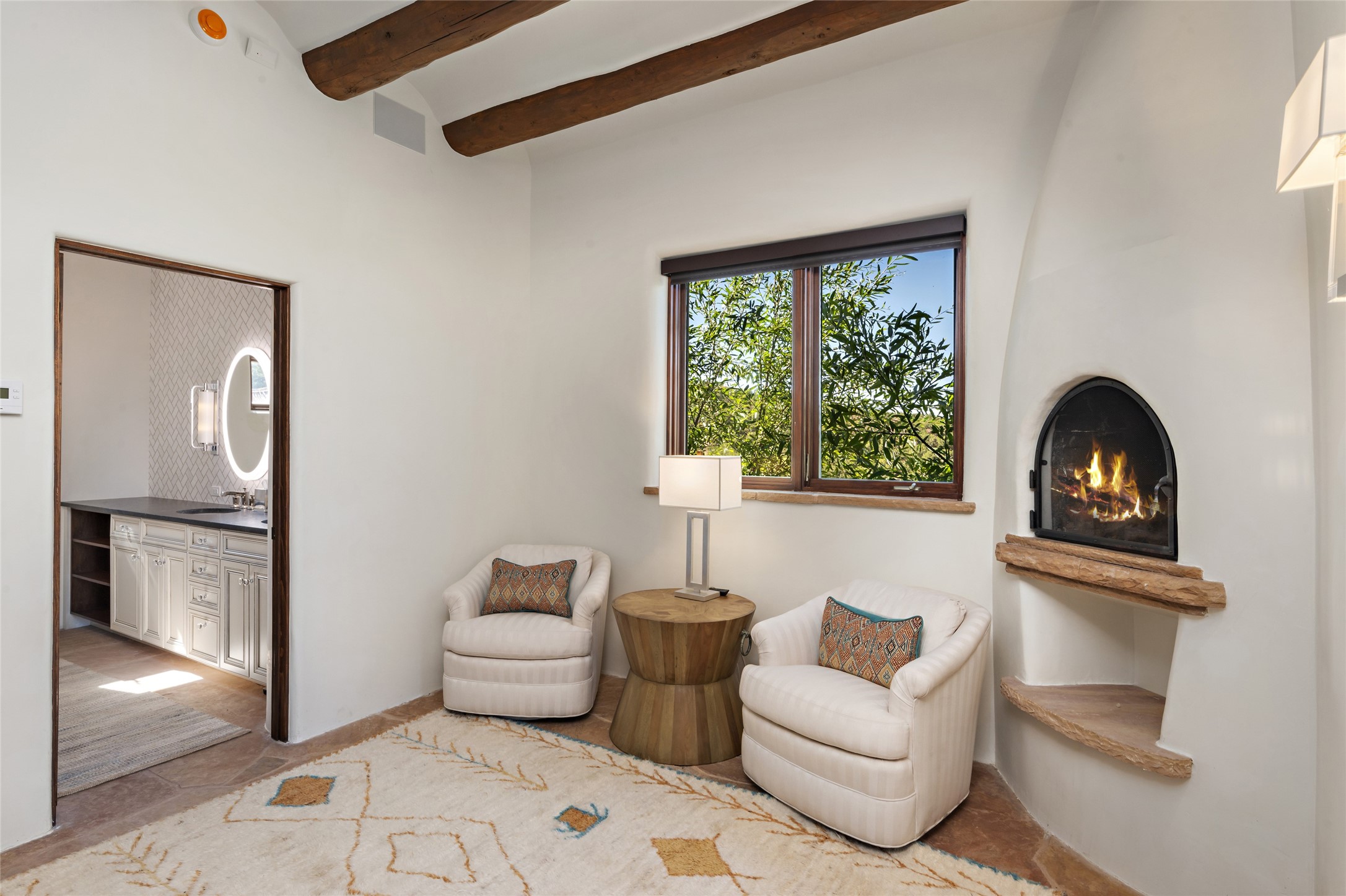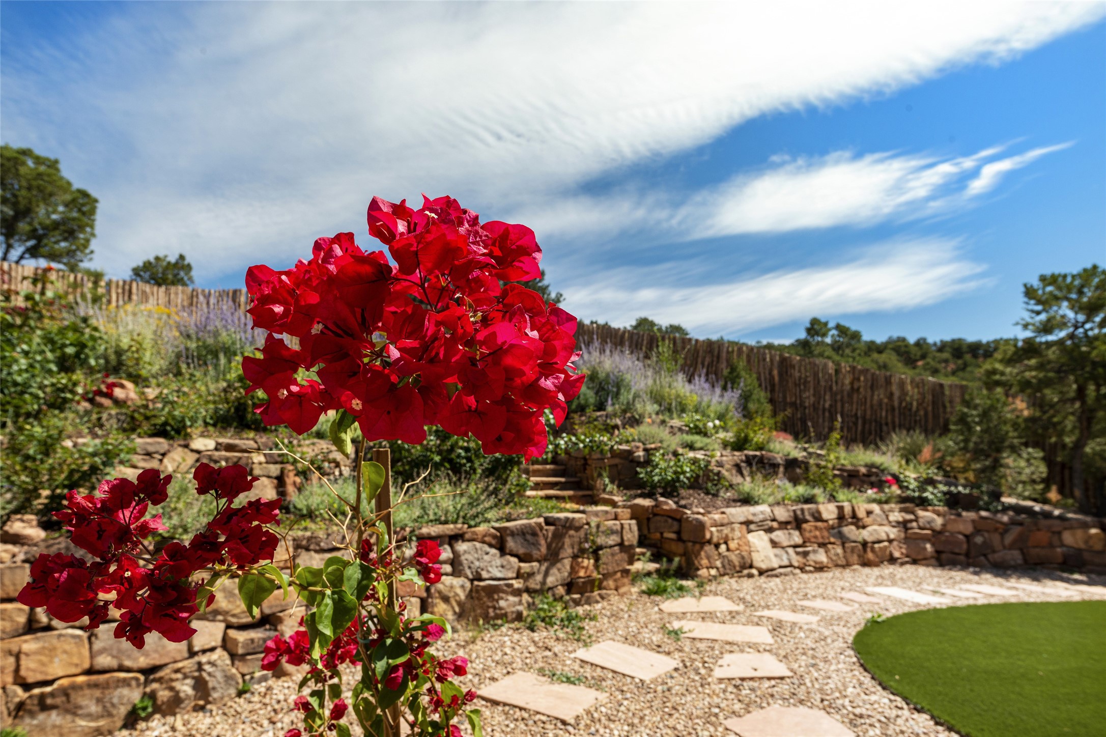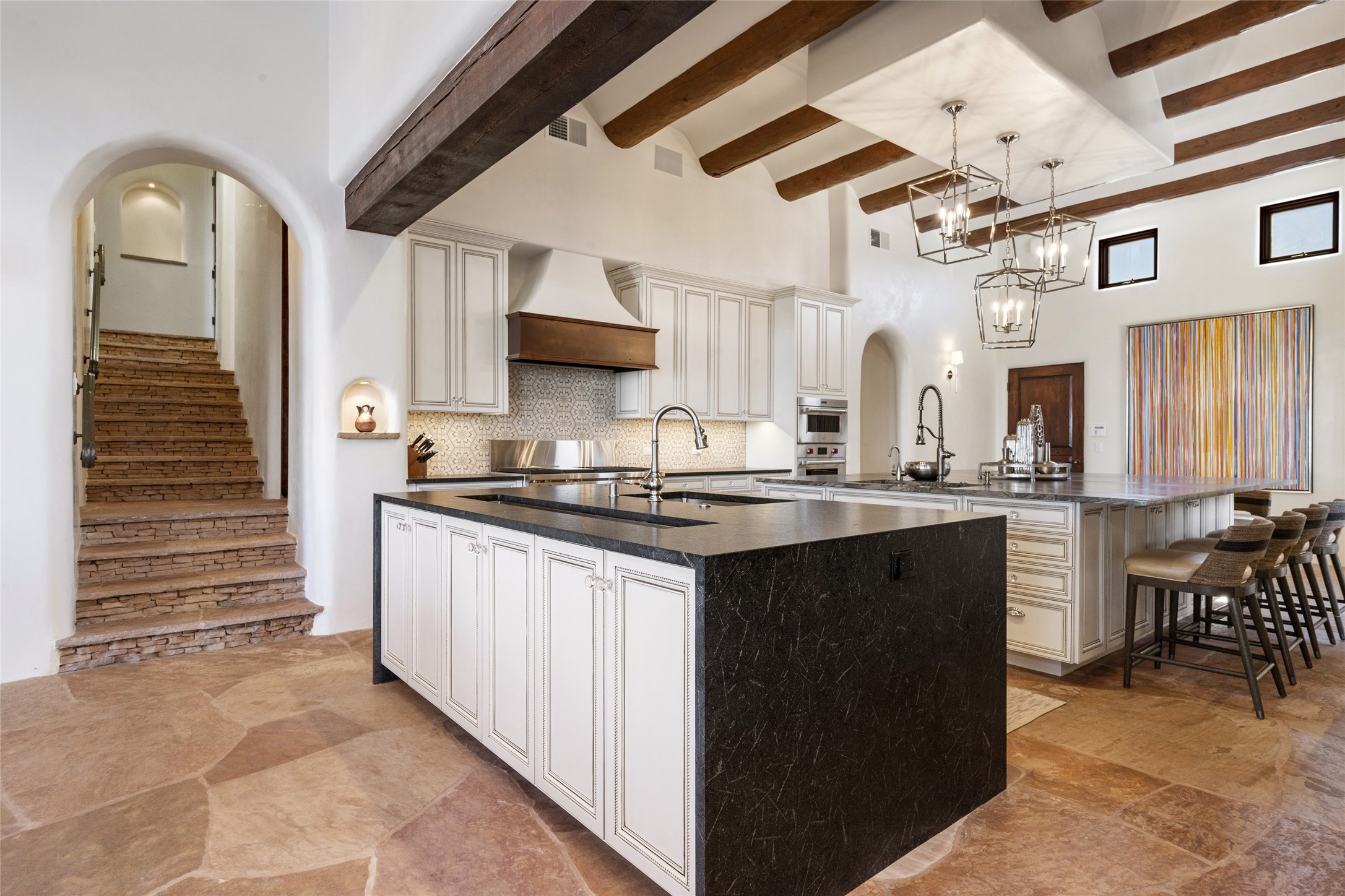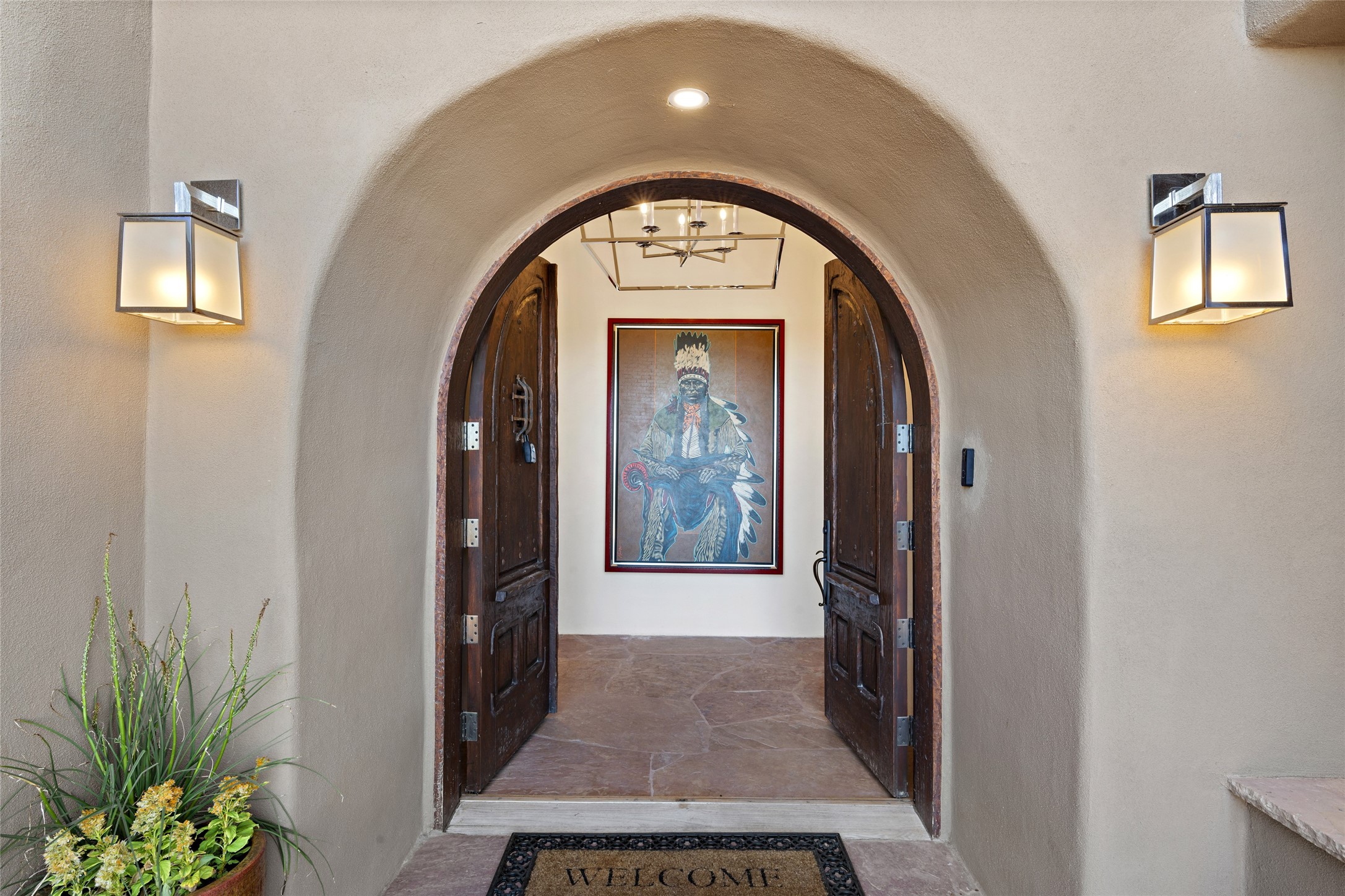 Masterpiece! Gutted to the studs, reimagined to the highest standards and blending a cosmopolitan twist with Santa Fe softness, the resulting 5B/6B home is unique and breathtaking. High above a landscape that stretches for miles, this exceptional multi-level home that hugs the hillside features premiere finishes and customizations throughout. Within the gated entry, the drive leads to a sea-green reflective tile wall framing an infinity pool. The 6,540 square foot floor plan is contained in a classic Pueblo exterior. A great room fashioned for large gatherings centers around a see-through frameless fireplace flanked by windows with views to the patio, infinity pool and western landscape. The kitchen, designed to facilitate large groups with a massive center island, also accommodates more intimate gatherings with counter seating. Custom cabinets, a large wet bar, high-end appliances and a wine room leave nothing to be desired. An interior courtyard is the perfect setting for smaller groups or household gatherings. A private media room with built-in bookshelves and fireplace adjuncts the Primary Suite as well as an oversized bath with double vanities and artisan tile walls. Three guest bedroom suites (two with sitting rooms) are positioned for ultimate privacy opposite the Primary wing. Other features include a heated garage with attached room that can be used as another guest room, exercise room or office, a Butler's pantry and beautifully landscaped backyard.