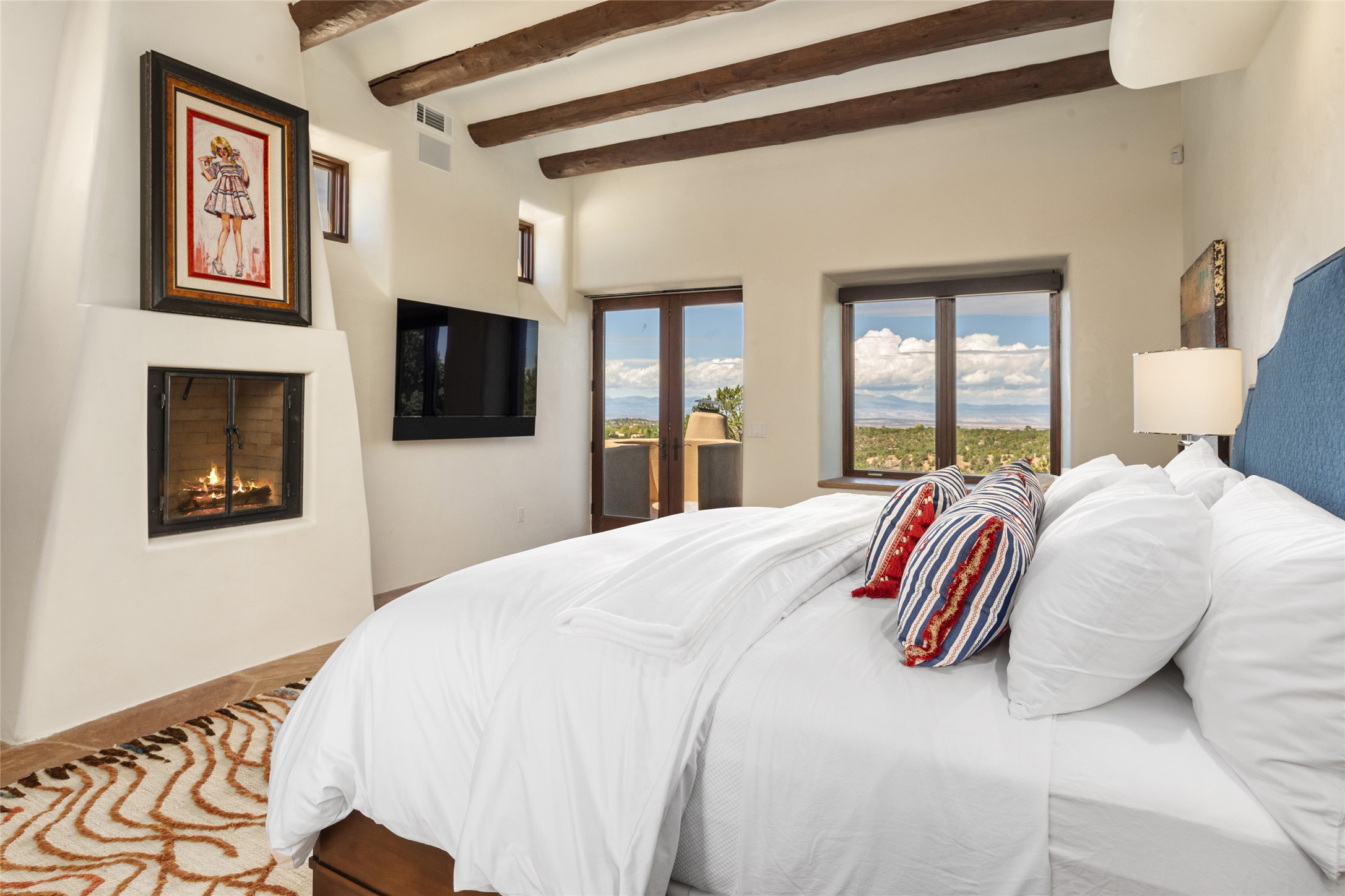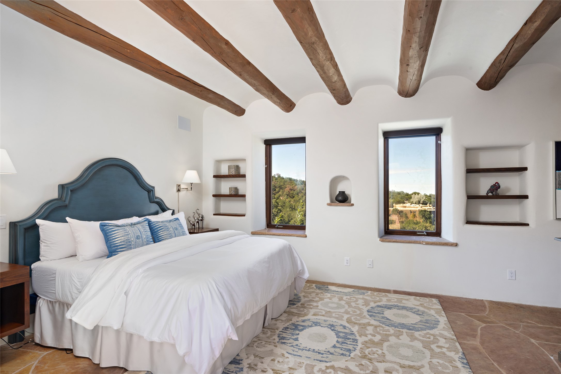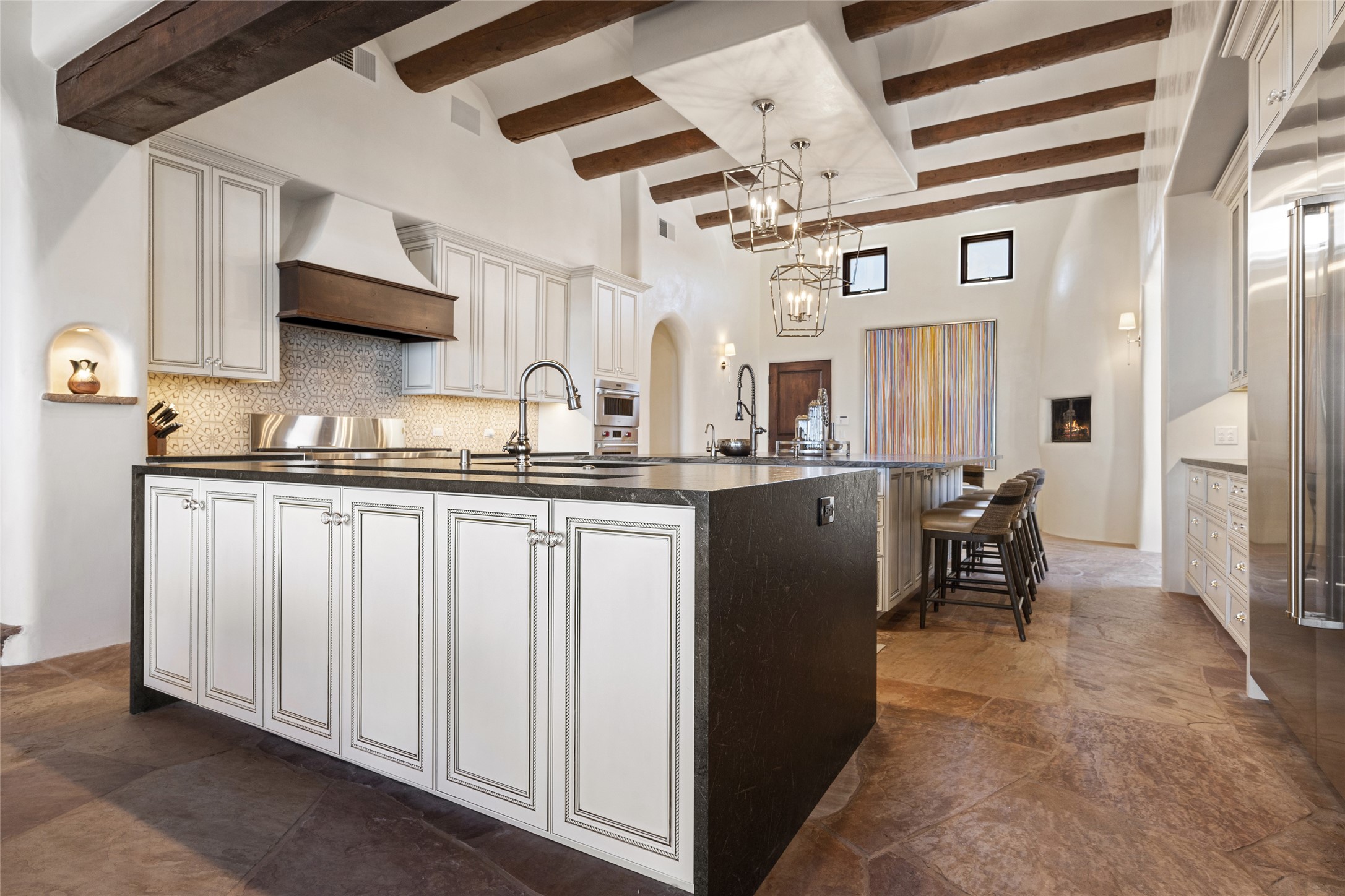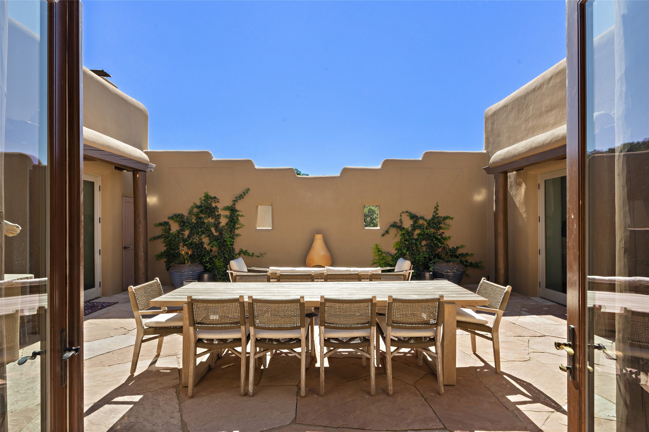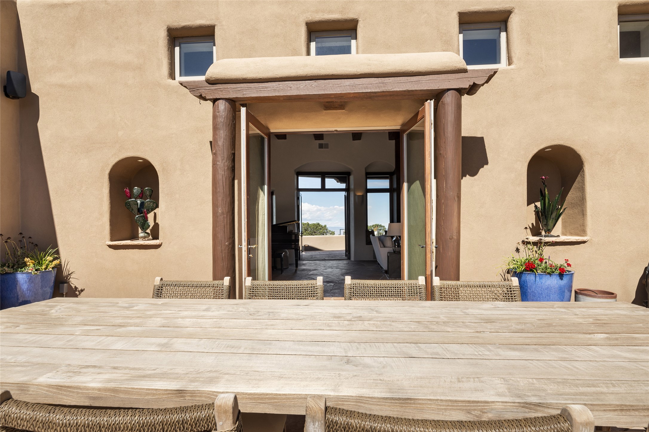 Masterpiece! Gutted to the studs, reimagined to the highest standards and blending a cosmopolitan twist with Santa Fe softness, the resulting 5B/6B home is unique and breathtaking. High above a landscape that stretches for miles, this exceptional multi-level home that hugs the hillside features premiere finishes and customizations throughout. Within the gated entry, the drive leads to a sea-green reflective tile wall framing an infinity pool. The 6,540 square foot floor plan is contained in a classic Pueblo exterior. A great room fashioned for large gatherings centers around a see-through frameless fireplace flanked by windows with views to the patio, infinity pool and western landscape. The kitchen, designed to facilitate large groups with a massive center island, also accommodates more intimate gatherings with counter seating. Custom cabinets, a large wet bar, high-end appliances and a wine room leave nothing to be desired. An interior courtyard is the perfect setting for smaller groups or household gatherings. A private media room with built-in bookshelves and fireplace adjuncts the Primary Suite as well as an oversized bath with double vanities and artisan tile walls. Three guest bedroom suites (two with sitting rooms) are positioned for ultimate privacy opposite the Primary wing. Other features include a heated garage with attached room that can be used as another guest room, exercise room or office, a Butler's pantry and beautifully landscaped backyard.