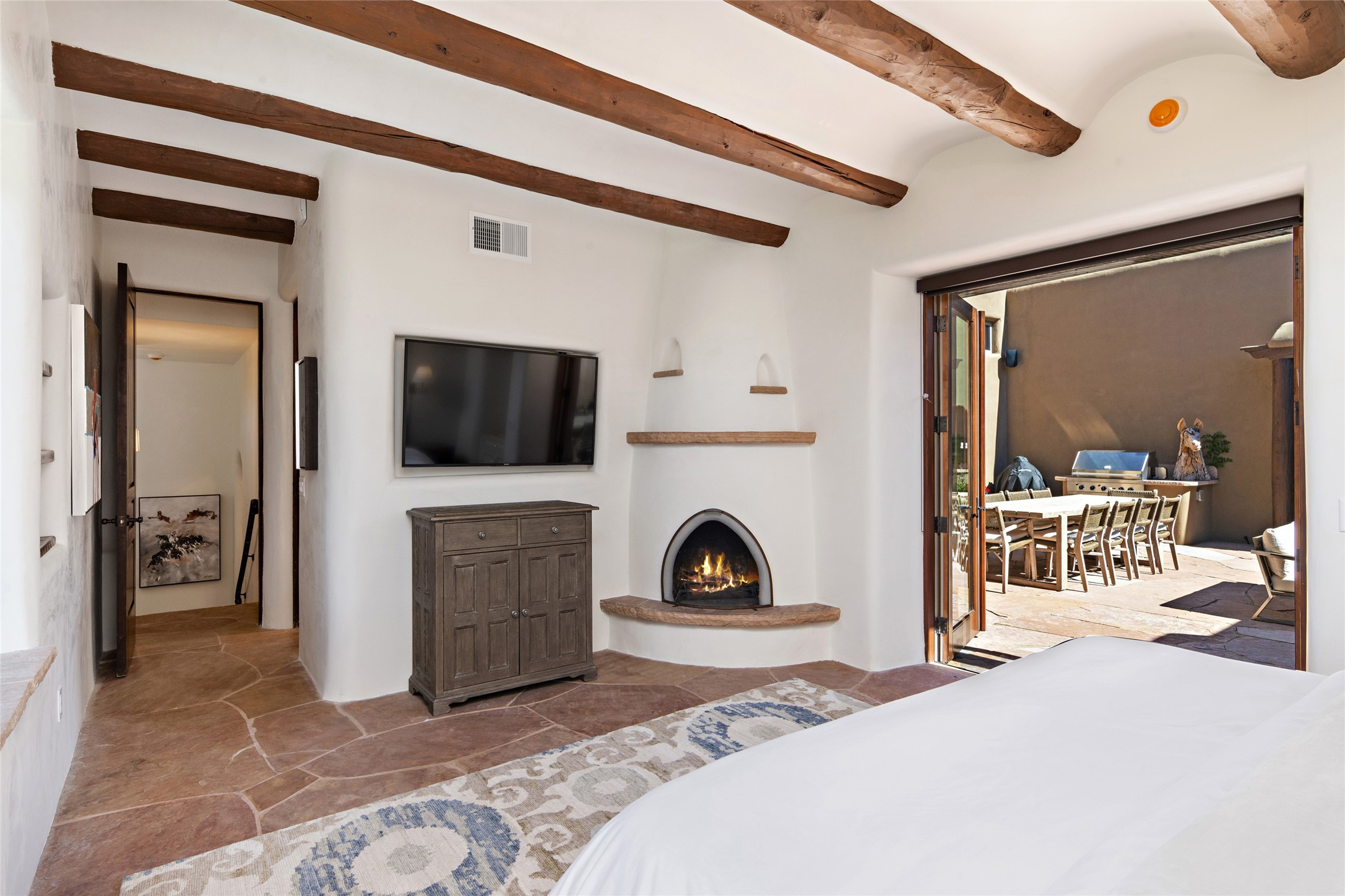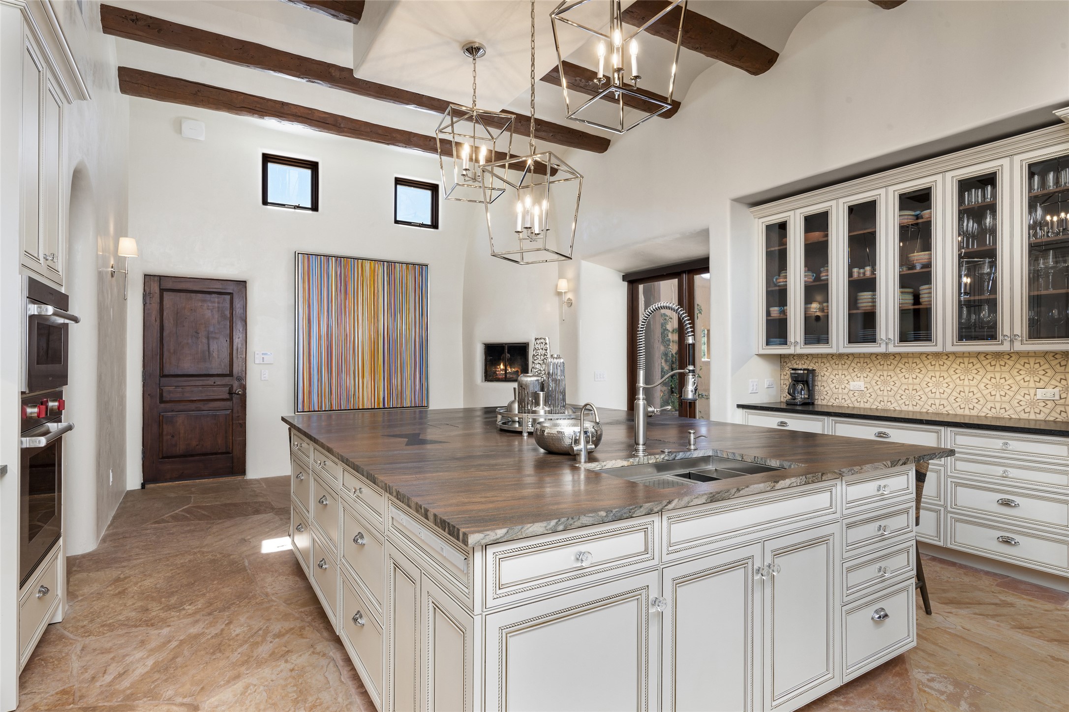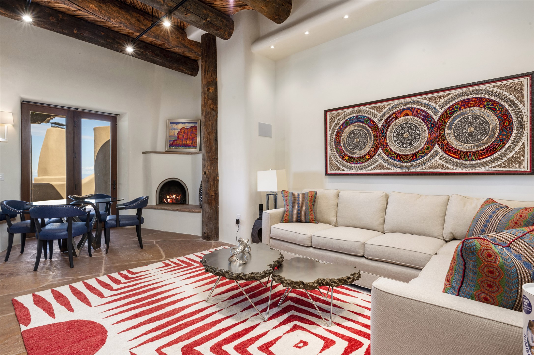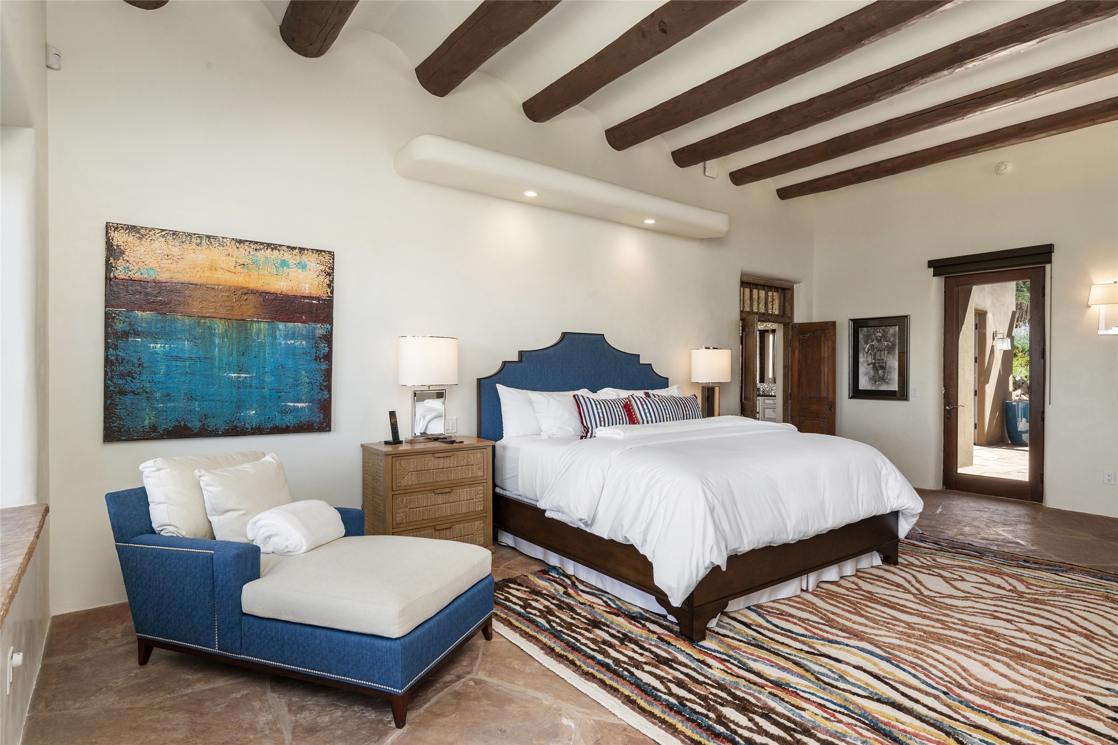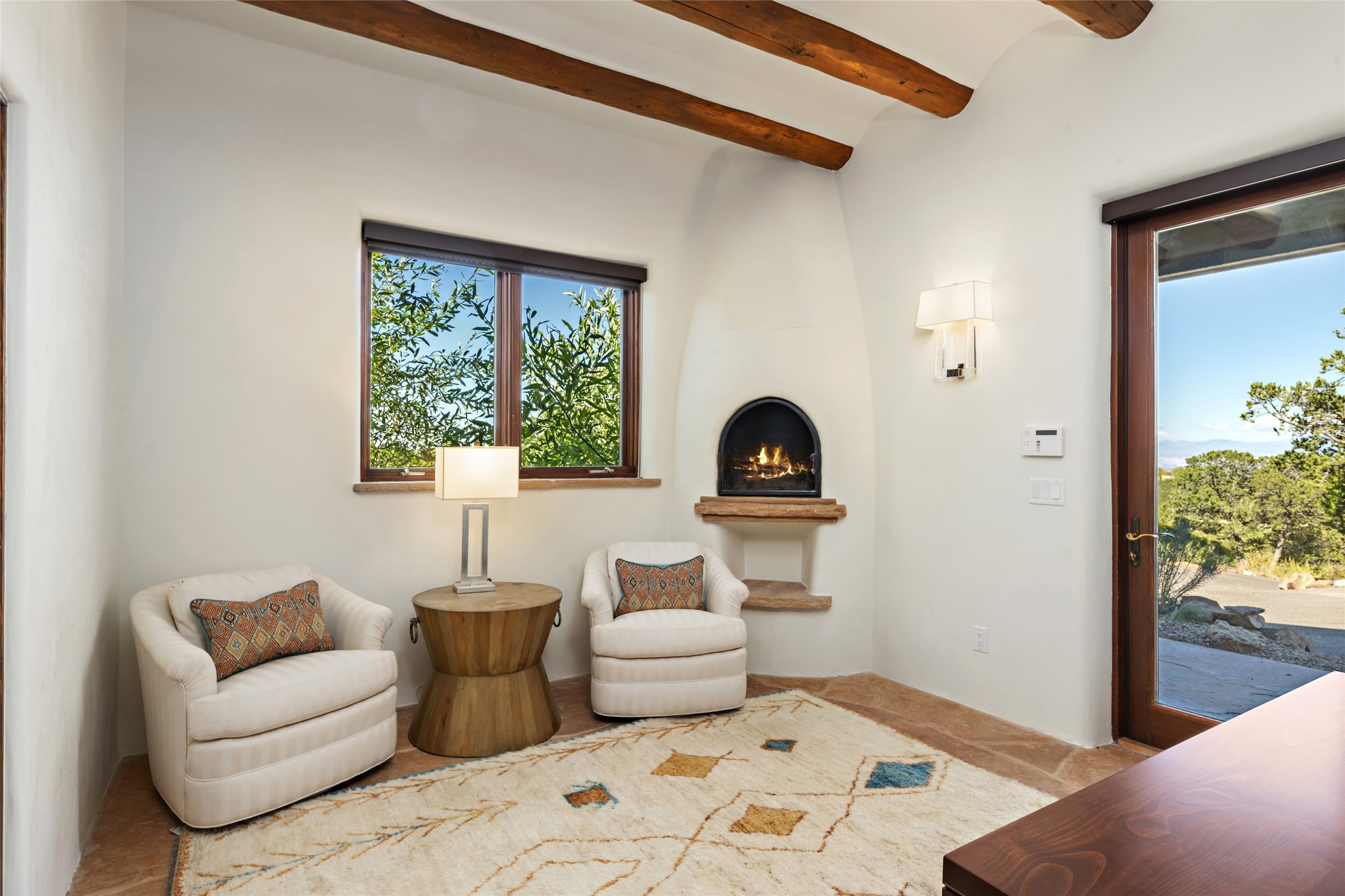 Masterpiece! Gutted to the studs, reimagined to the highest standards and blending a cosmopolitan twist with Santa Fe softness, the resulting 5B/6B home is unique and breathtaking. High above a landscape that stretches for miles, this exceptional multi-level home that hugs the hillside features premiere finishes and customizations throughout. Within the gated entry, the drive leads to a sea-green reflective tile wall framing an infinity pool. The 6,540 square foot floor plan is contained in a classic Pueblo exterior. A great room fashioned for large gatherings centers around a see-through frameless fireplace flanked by windows with views to the patio, infinity pool and western landscape. The kitchen, designed to facilitate large groups with a massive center island, also accommodates more intimate gatherings with counter seating. Custom cabinets, a large wet bar, high-end appliances and a wine room leave nothing to be desired. An interior courtyard is the perfect setting for smaller groups or household gatherings. A private media room with built-in bookshelves and fireplace adjuncts the Primary Suite as well as an oversized bath with double vanities and artisan tile walls. Three guest bedroom suites (two with sitting rooms) are positioned for ultimate privacy opposite the Primary wing. Other features include a heated garage with attached room that can be used as another guest room, exercise room or office, a Butler's pantry and beautifully landscaped backyard.