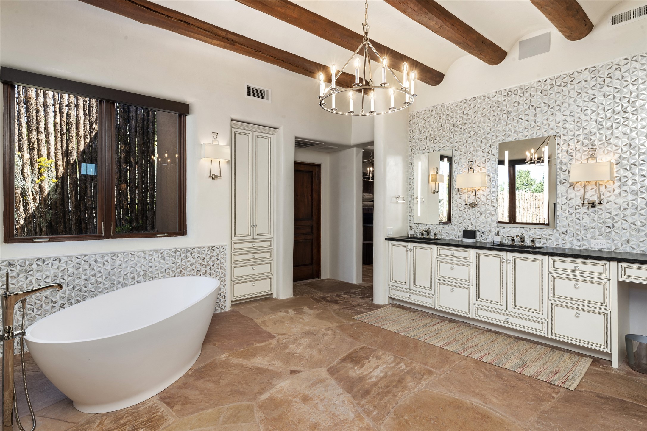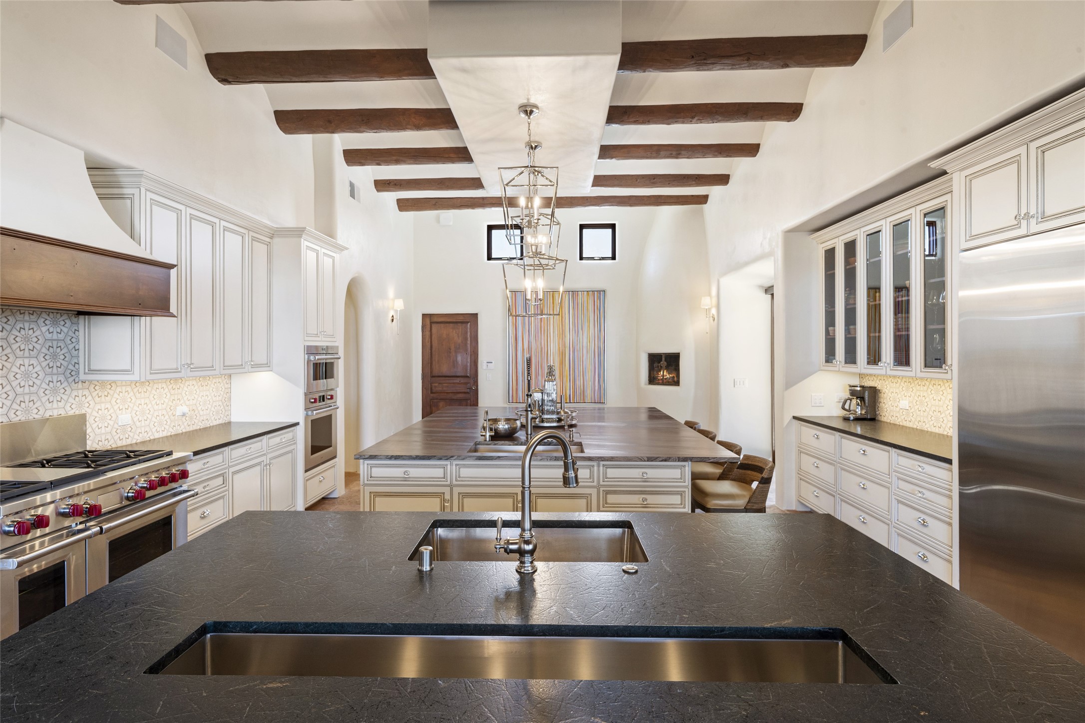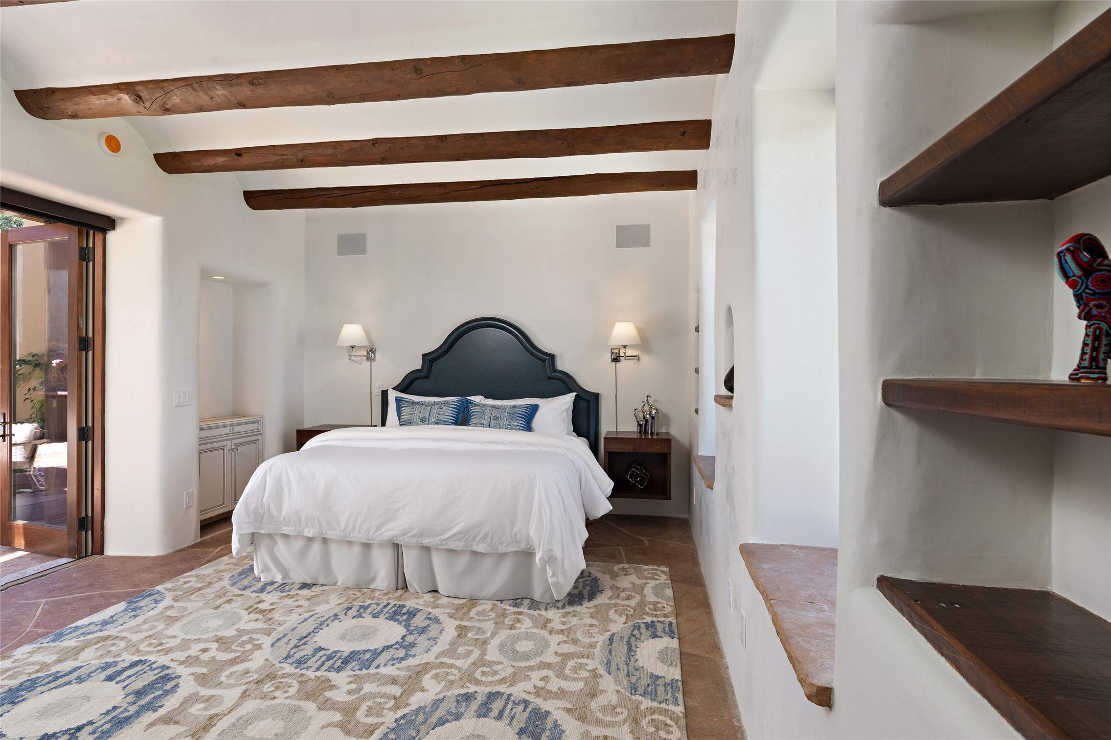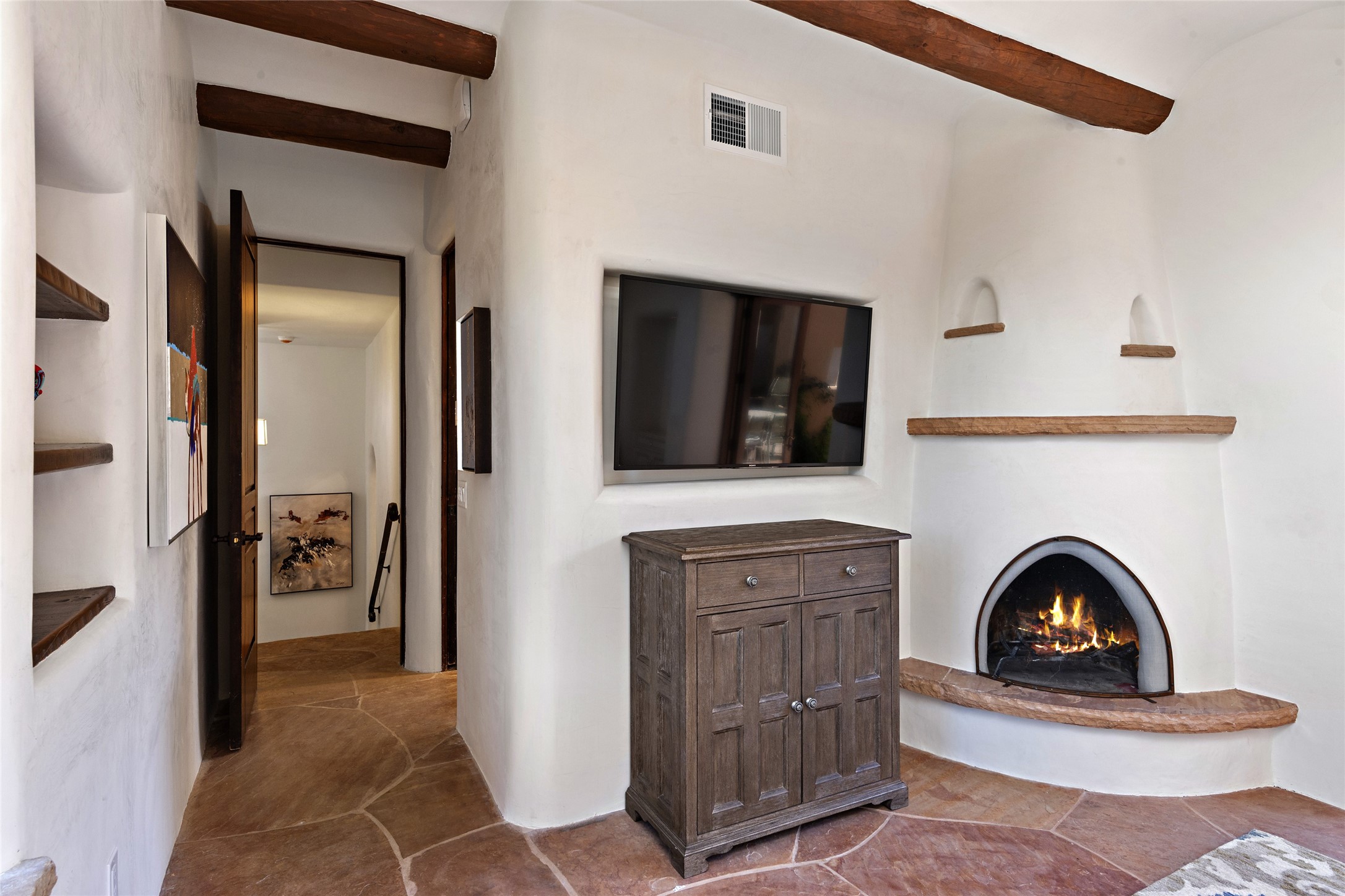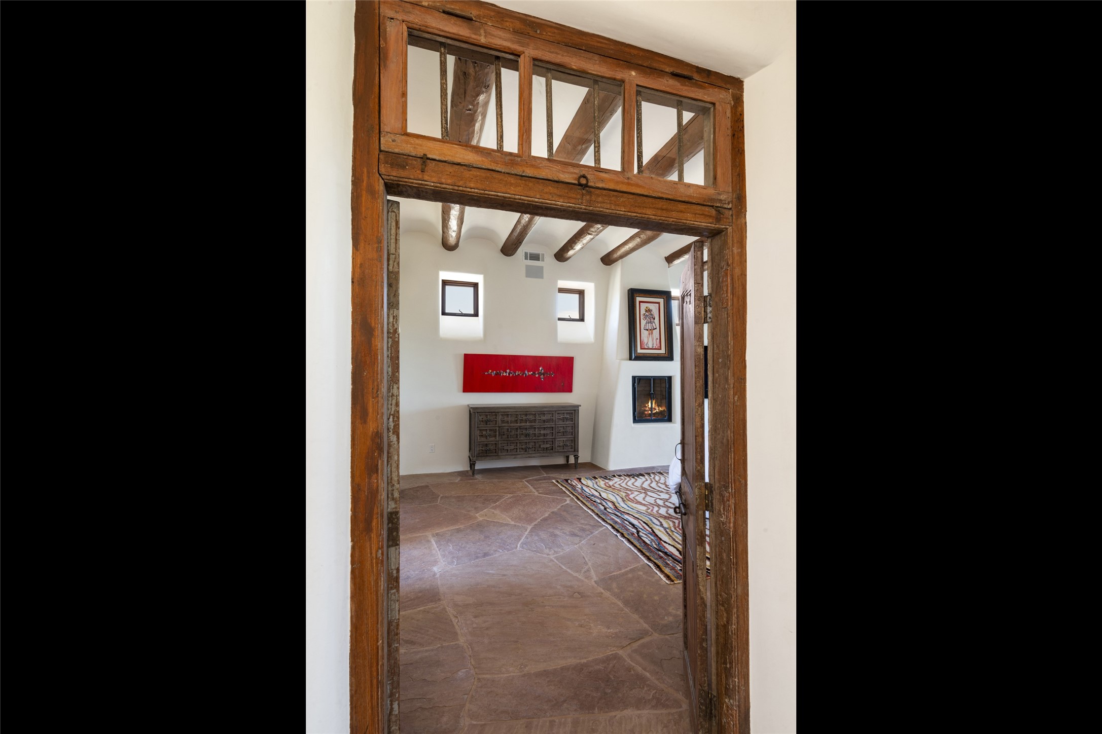 Masterpiece! Gutted to the studs, reimagined to the highest standards and blending a cosmopolitan twist with Santa Fe softness, the resulting 5B/6B home is unique and breathtaking. High above a landscape that stretches for miles, this exceptional multi-level home that hugs the hillside features premiere finishes and customizations throughout. Within the gated entry, the drive leads to a sea-green reflective tile wall framing an infinity pool. The 6,540 square foot floor plan is contained in a classic Pueblo exterior. A great room fashioned for large gatherings centers around a see-through frameless fireplace flanked by windows with views to the patio, infinity pool and western landscape. The kitchen, designed to facilitate large groups with a massive center island, also accommodates more intimate gatherings with counter seating. Custom cabinets, a large wet bar, high-end appliances and a wine room leave nothing to be desired. An interior courtyard is the perfect setting for smaller groups or household gatherings. A private media room with built-in bookshelves and fireplace adjuncts the Primary Suite as well as an oversized bath with double vanities and artisan tile walls. Three guest bedroom suites (two with sitting rooms) are positioned for ultimate privacy opposite the Primary wing. Other features include a heated garage with attached room that can be used as another guest room, exercise room or office, a Butler's pantry and beautifully landscaped backyard.