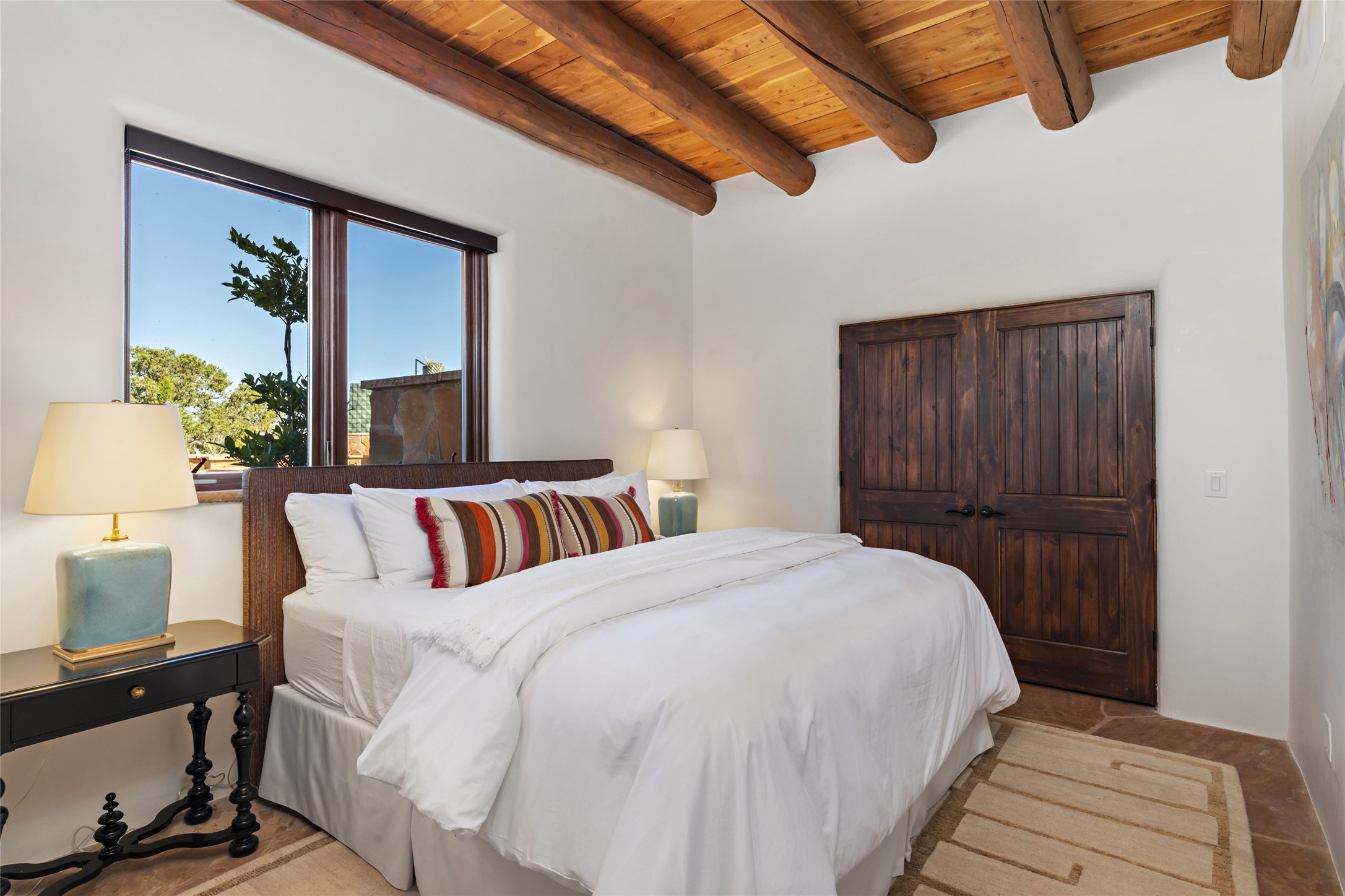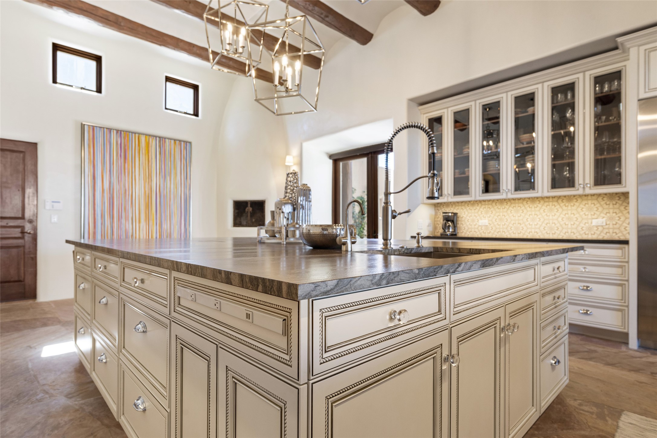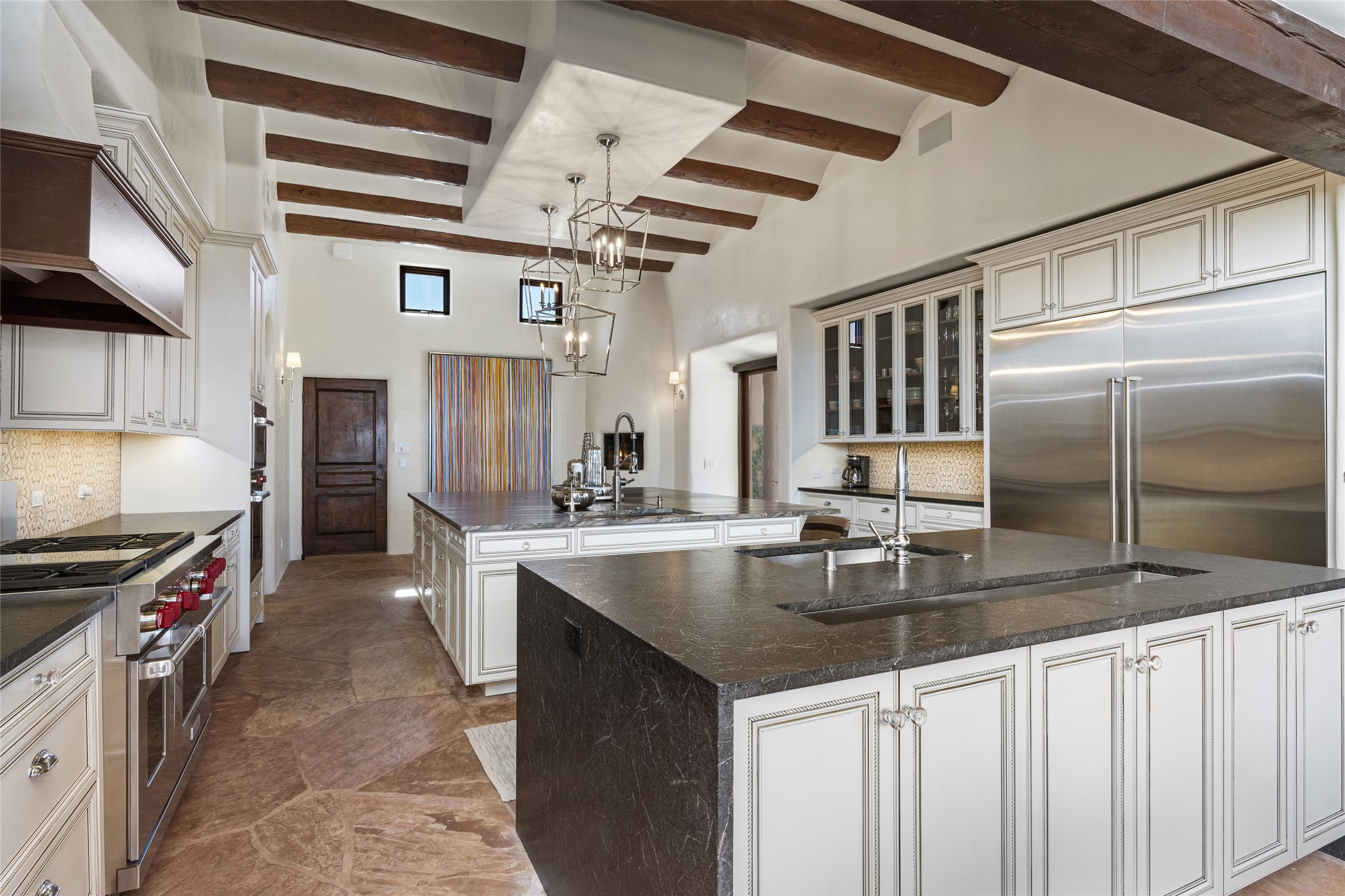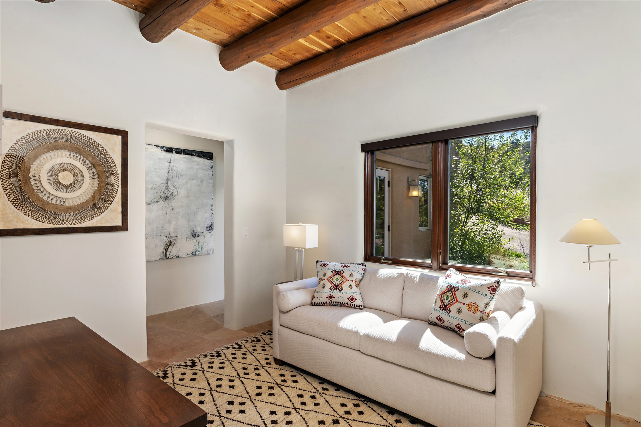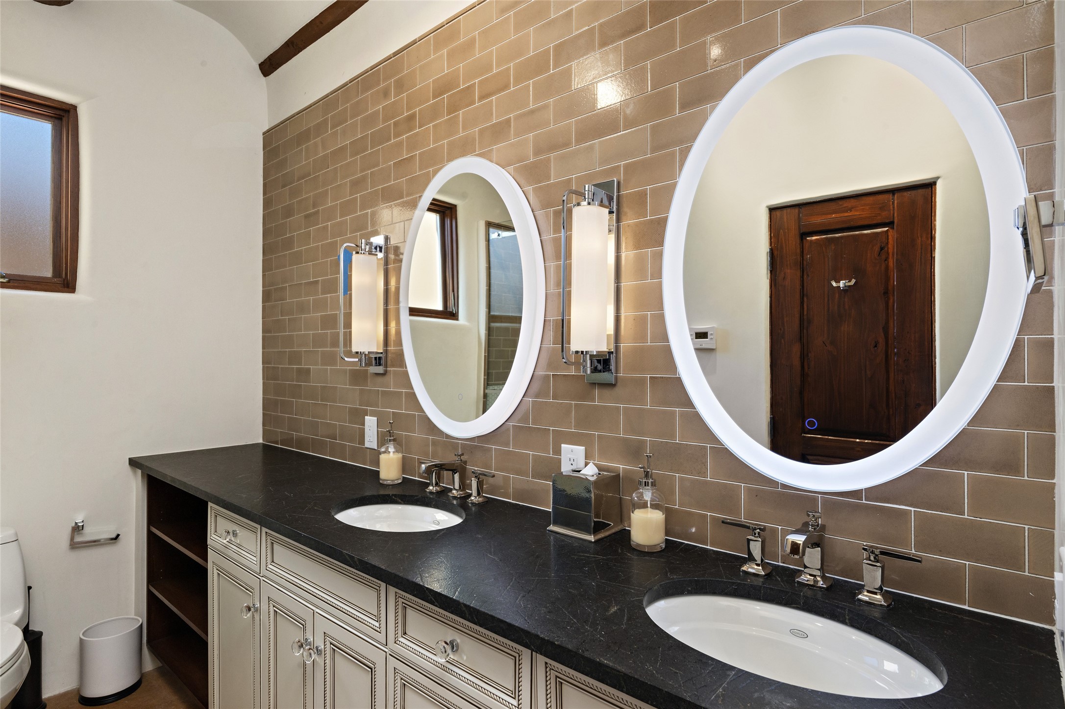 Masterpiece! Gutted to the studs, reimagined to the highest standards and blending a cosmopolitan twist with Santa Fe softness, the resulting 5B/6B home is unique and breathtaking. High above a landscape that stretches for miles, this exceptional multi-level home that hugs the hillside features premiere finishes and customizations throughout. Within the gated entry, the drive leads to a sea-green reflective tile wall framing an infinity pool. The 6,540 square foot floor plan is contained in a classic Pueblo exterior. A great room fashioned for large gatherings centers around a see-through frameless fireplace flanked by windows with views to the patio, infinity pool and western landscape. The kitchen, designed to facilitate large groups with a massive center island, also accommodates more intimate gatherings with counter seating. Custom cabinets, a large wet bar, high-end appliances and a wine room leave nothing to be desired. An interior courtyard is the perfect setting for smaller groups or household gatherings. A private media room with built-in bookshelves and fireplace adjuncts the Primary Suite as well as an oversized bath with double vanities and artisan tile walls. Three guest bedroom suites (two with sitting rooms) are positioned for ultimate privacy opposite the Primary wing. Other features include a heated garage with attached room that can be used as another guest room, exercise room or office, a Butler's pantry and beautifully landscaped backyard.