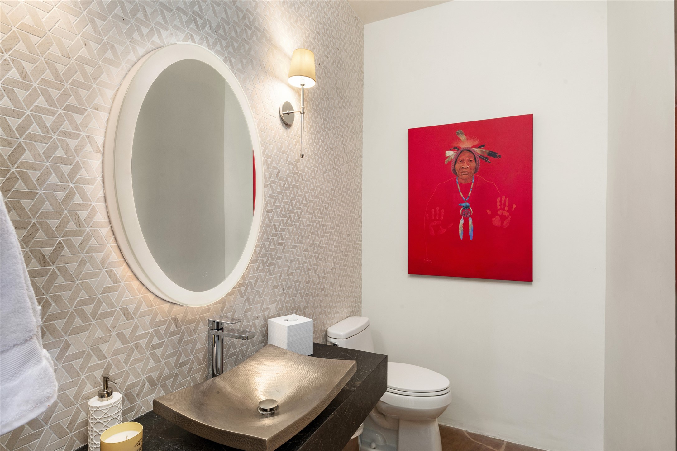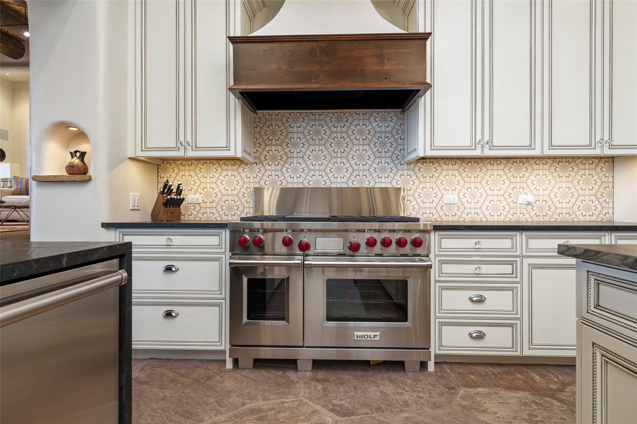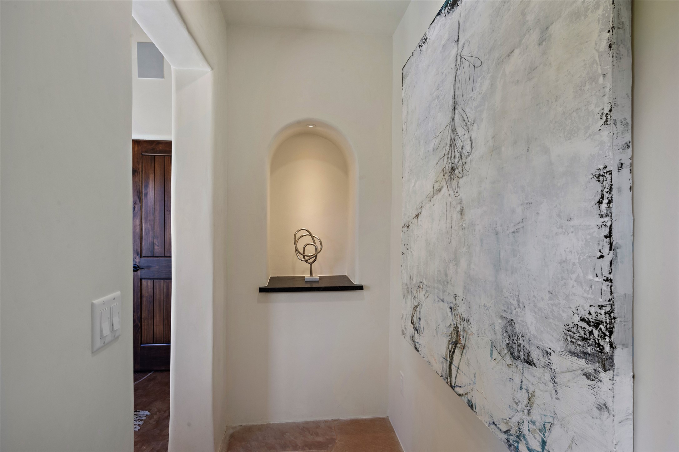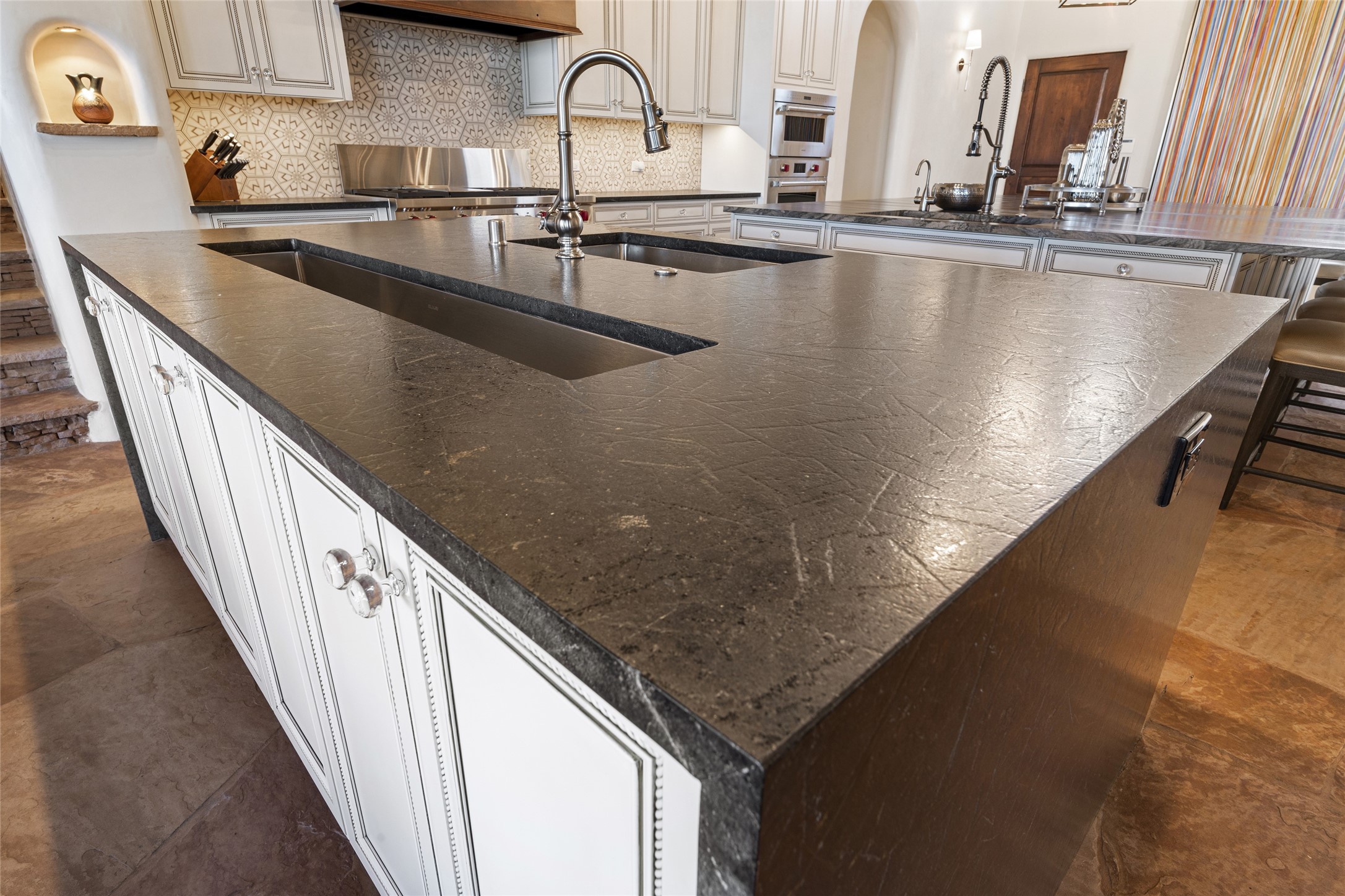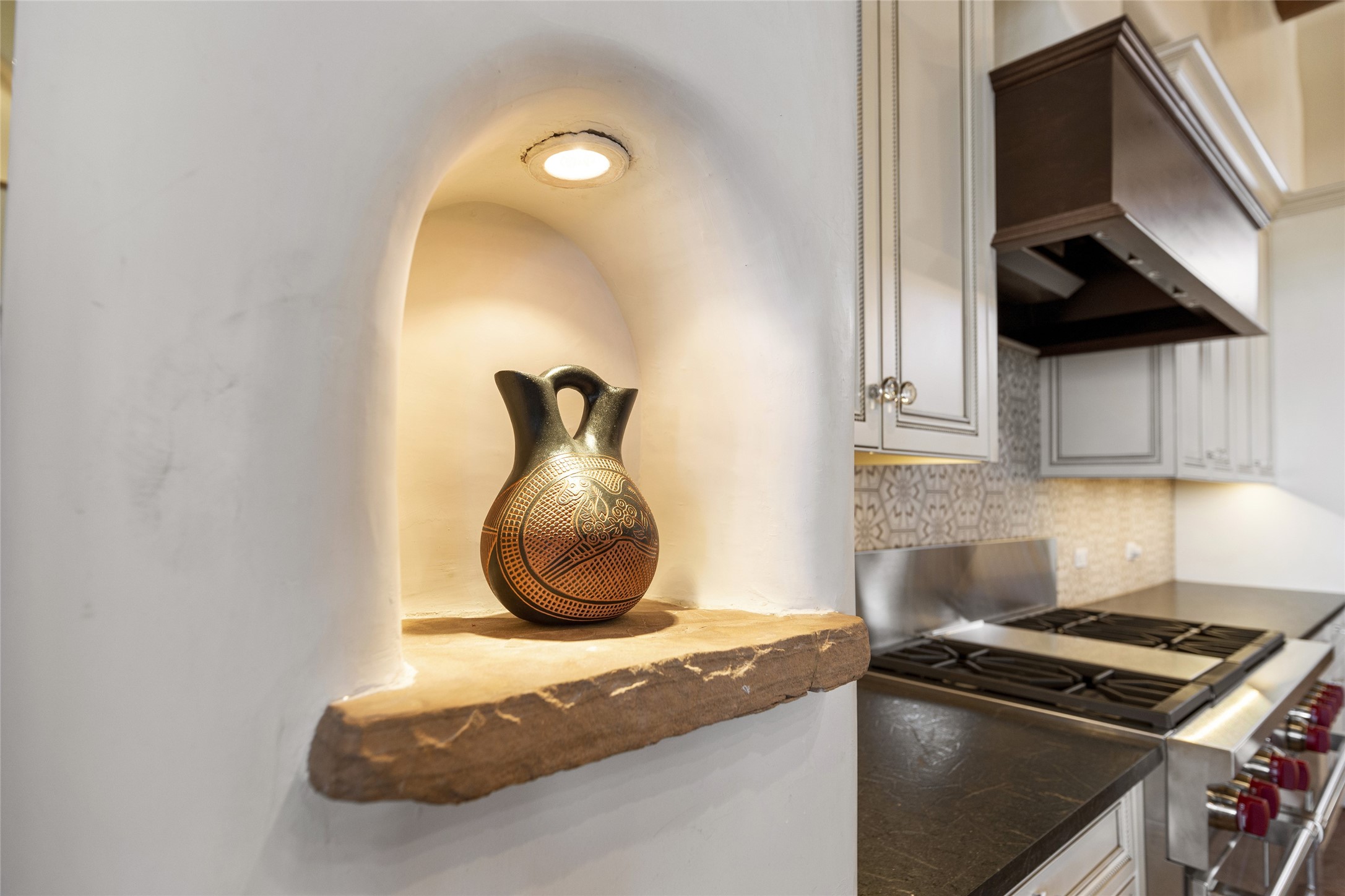 Masterpiece! Gutted to the studs, reimagined to the highest standards and blending a cosmopolitan twist with Santa Fe softness, the resulting 5B/6B home is unique and breathtaking. High above a landscape that stretches for miles, this exceptional multi-level home that hugs the hillside features premiere finishes and customizations throughout. Within the gated entry, the drive leads to a sea-green reflective tile wall framing an infinity pool. The 6,540 square foot floor plan is contained in a classic Pueblo exterior. A great room fashioned for large gatherings centers around a see-through frameless fireplace flanked by windows with views to the patio, infinity pool and western landscape. The kitchen, designed to facilitate large groups with a massive center island, also accommodates more intimate gatherings with counter seating. Custom cabinets, a large wet bar, high-end appliances and a wine room leave nothing to be desired. An interior courtyard is the perfect setting for smaller groups or household gatherings. A private media room with built-in bookshelves and fireplace adjuncts the Primary Suite as well as an oversized bath with double vanities and artisan tile walls. Three guest bedroom suites (two with sitting rooms) are positioned for ultimate privacy opposite the Primary wing. Other features include a heated garage with attached room that can be used as another guest room, exercise room or office, a Butler's pantry and beautifully landscaped backyard.