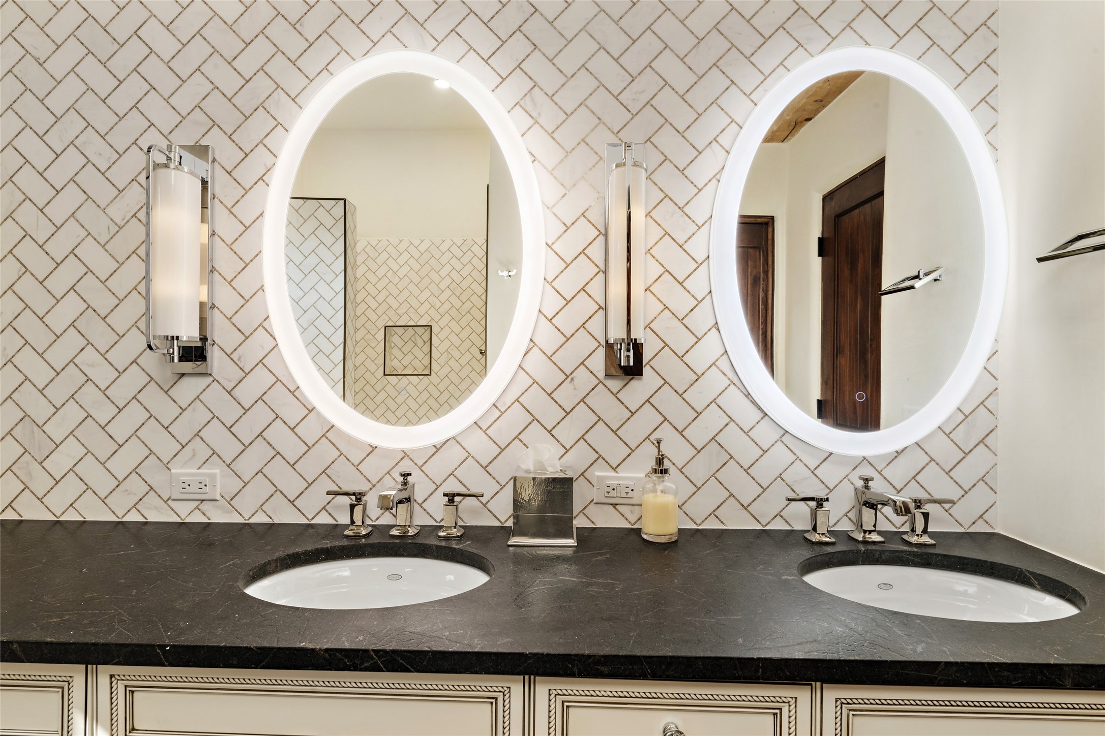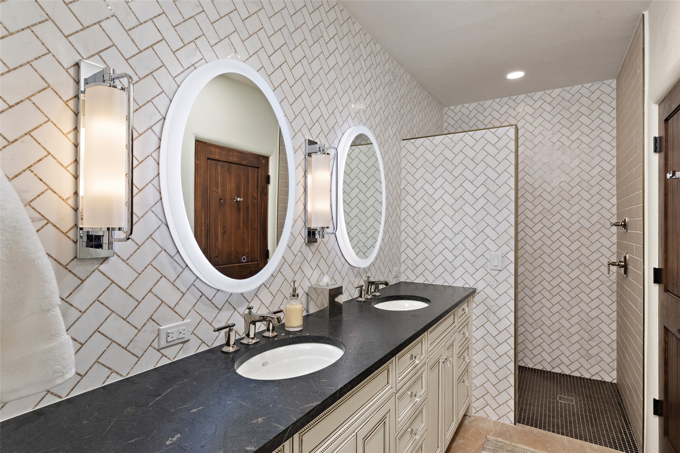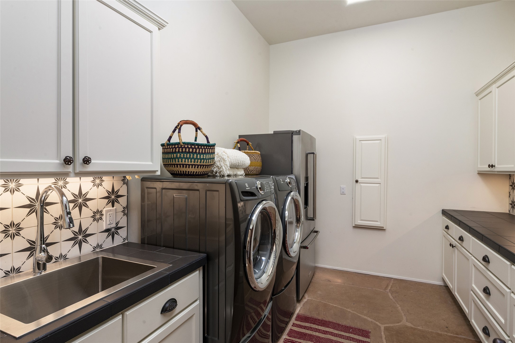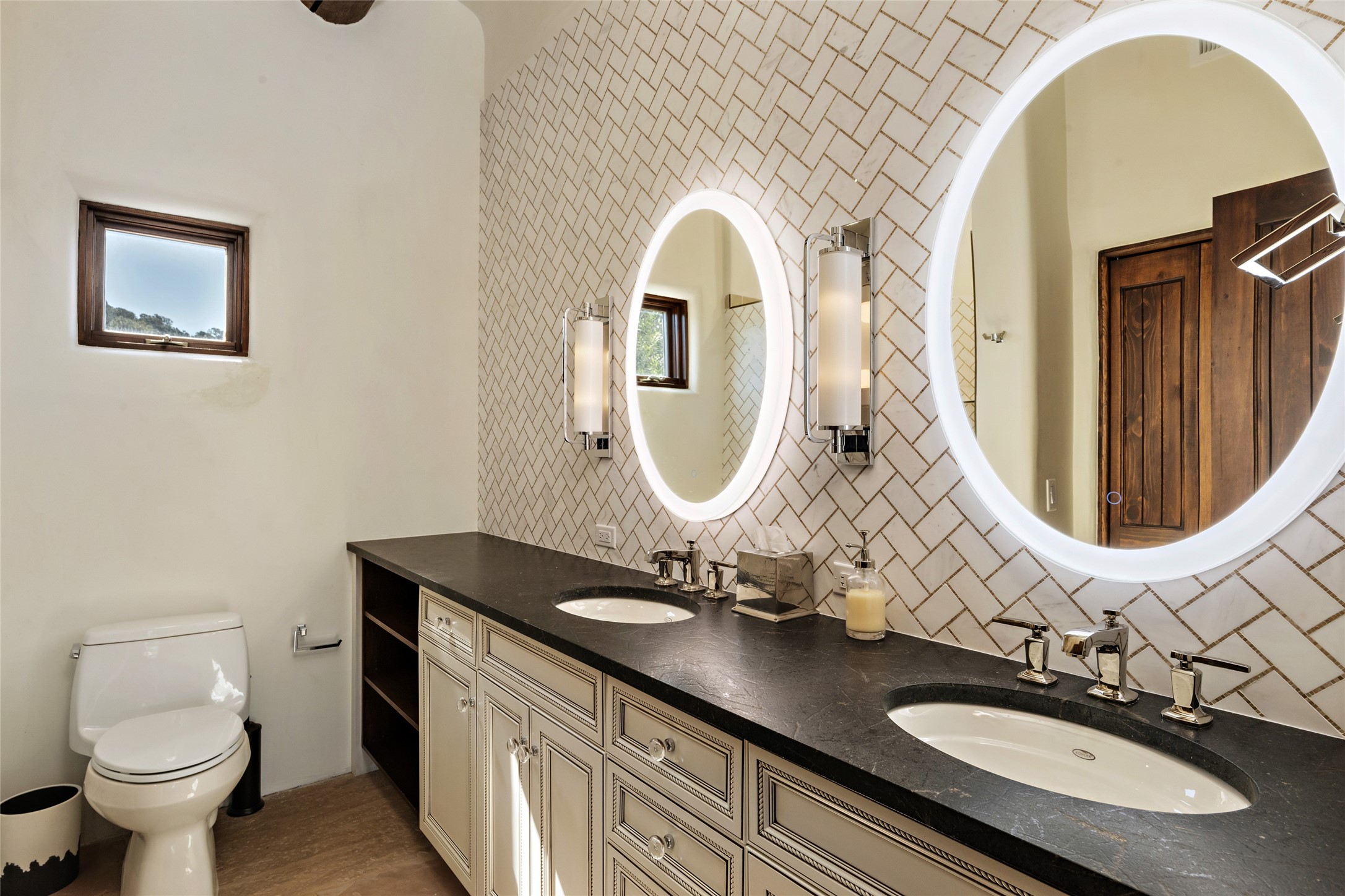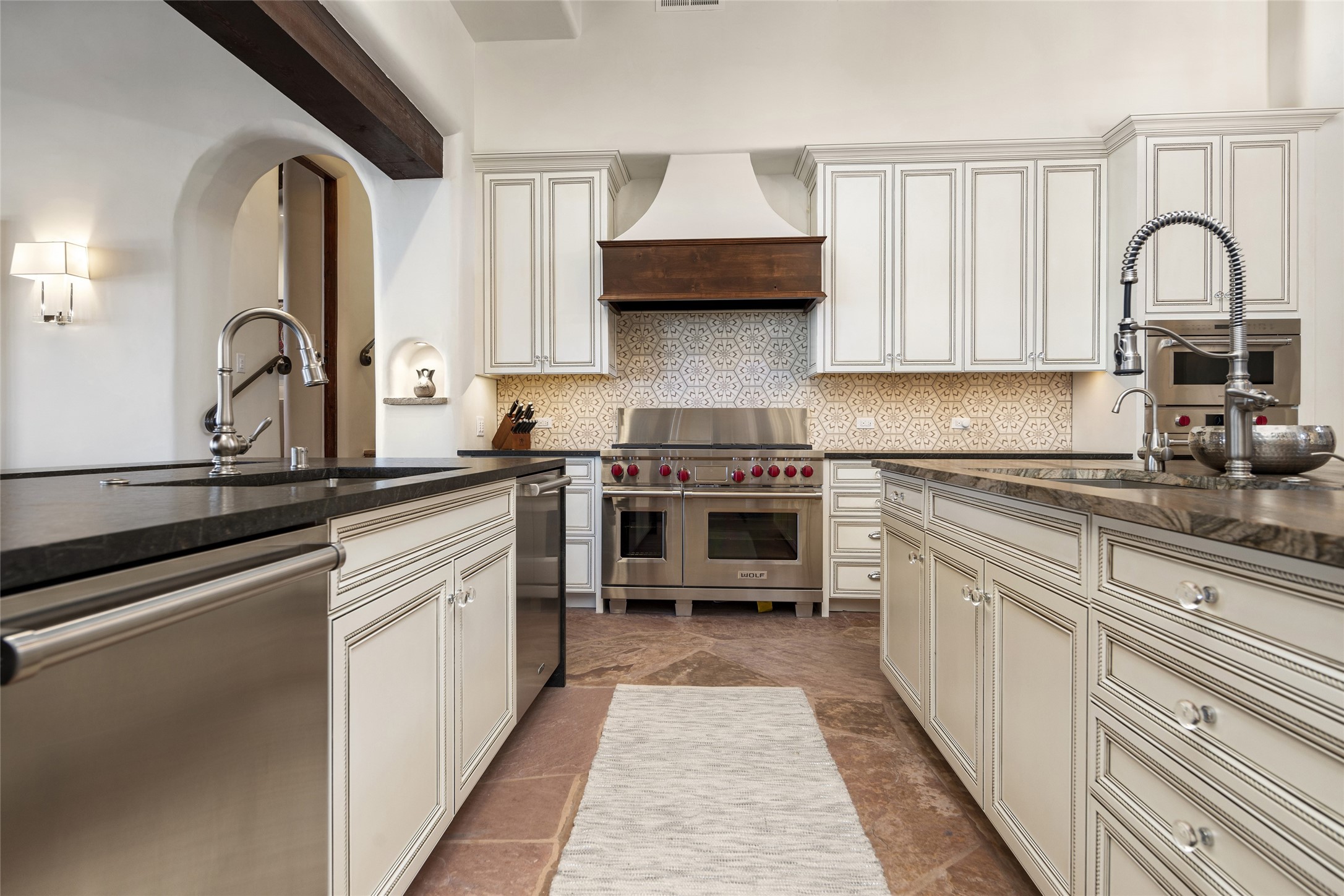Masterpiece! Gutted to the studs, reimagined to the highest standards and blending a cosmopolitan twist with Santa Fe softness, the resulting 5B/6B home is unique and breathtaking. High above a landscape that stretches for miles, this exceptional multi-level home that hugs the hillside features premiere finishes and customizations throughout. Within the gated entry, the drive leads to a sea-green reflective tile wall framing an infinity pool. The 6,540 square foot floor plan is contained in a classic Pueblo exterior. A great room fashioned for large gatherings centers around a see-through frameless fireplace flanked by windows with views to the patio, infinity pool and western landscape. The kitchen, designed to facilitate large groups with a massive center island, also accommodates more intimate gatherings with counter seating. Custom cabinets, a large wet bar, high-end appliances and a wine room leave nothing to be desired. An interior courtyard is the perfect setting for smaller groups or household gatherings. A private media room with built-in bookshelves and fireplace adjuncts the Primary Suite as well as an oversized bath with double vanities and artisan tile walls. Three guest bedroom suites (two with sitting rooms) are positioned for ultimate privacy opposite the Primary wing. Other features include a heated garage with attached room that can be used as another guest room, exercise room or office, a Butler's pantry and beautifully landscaped backyard.