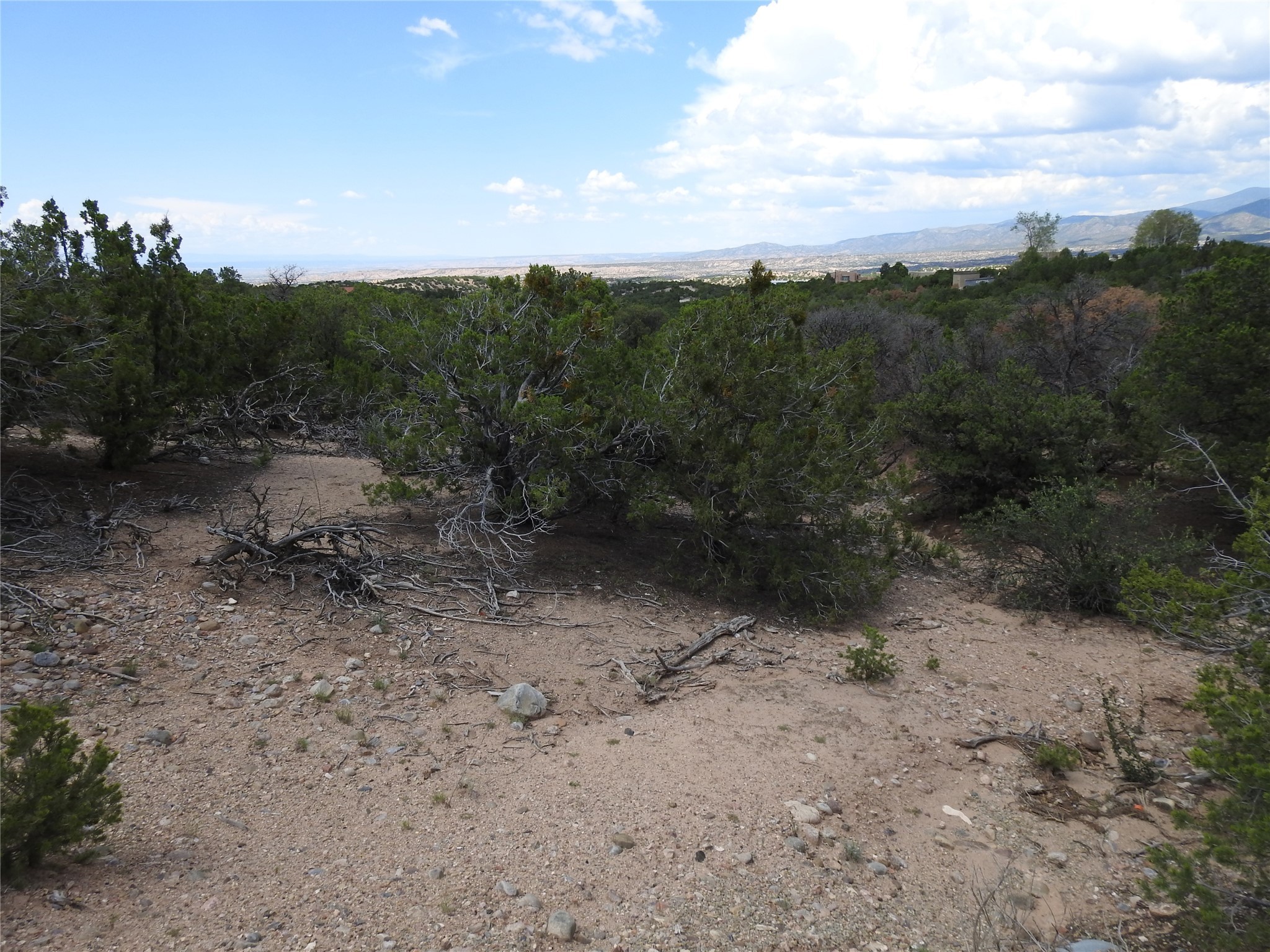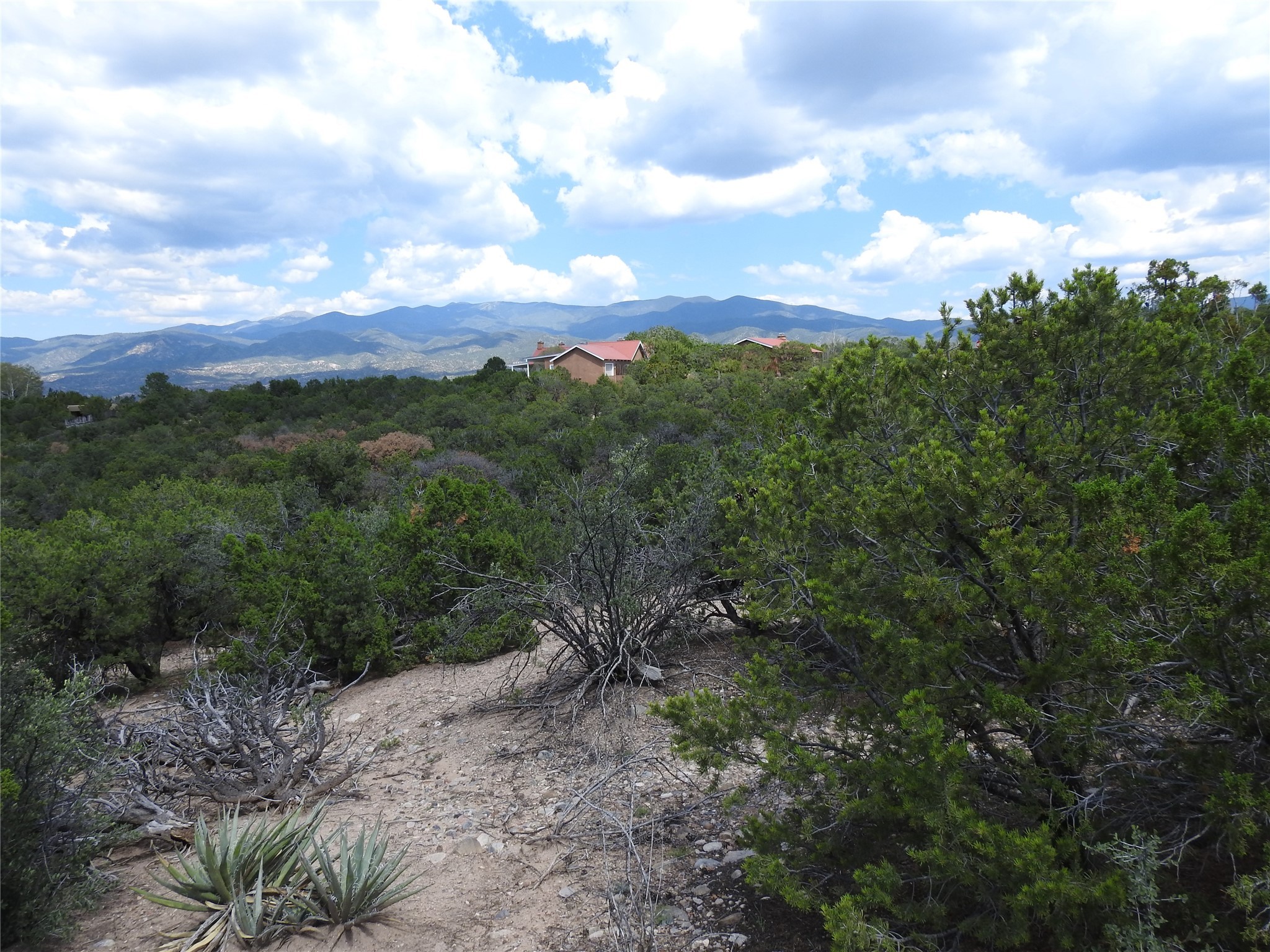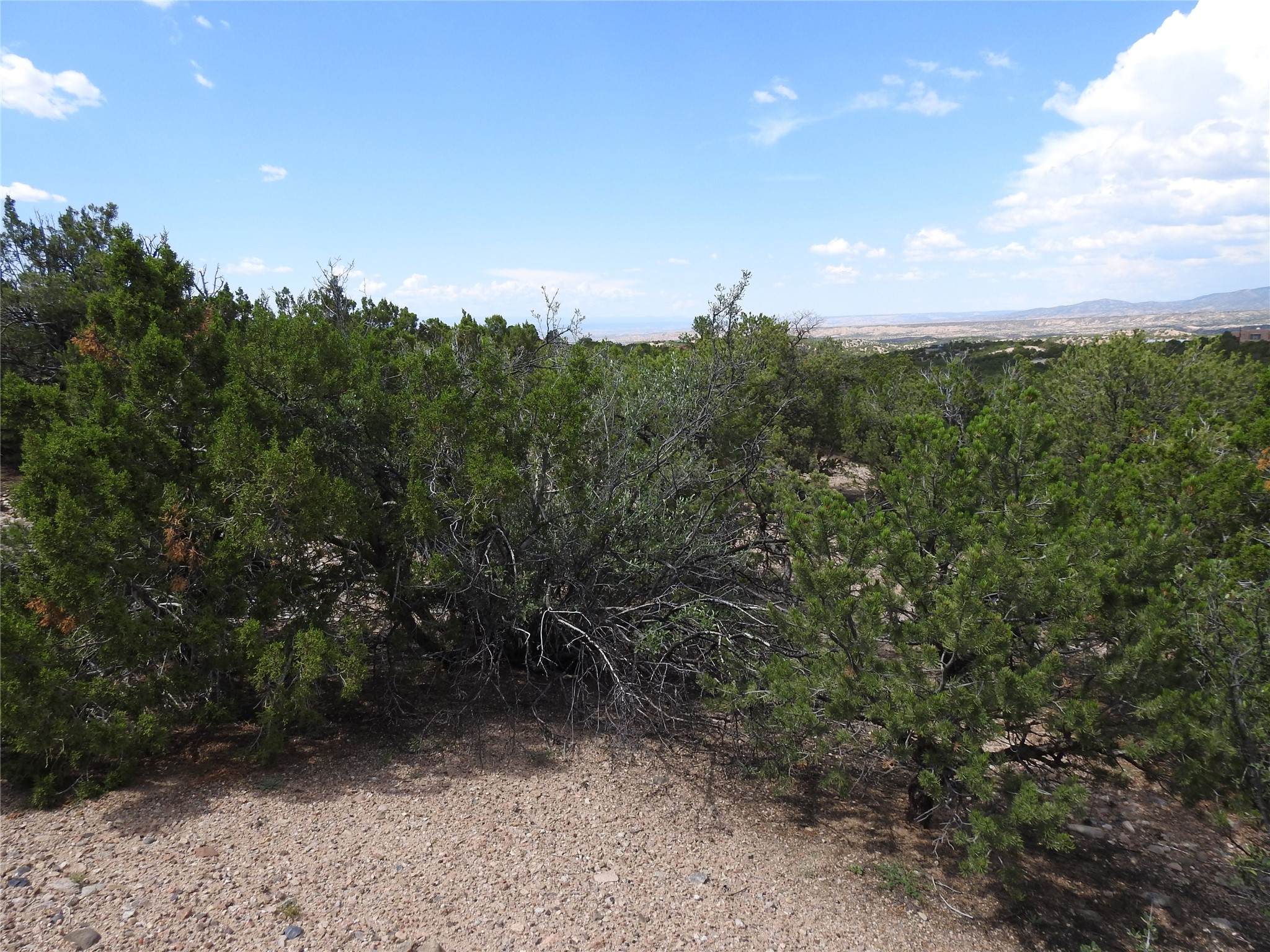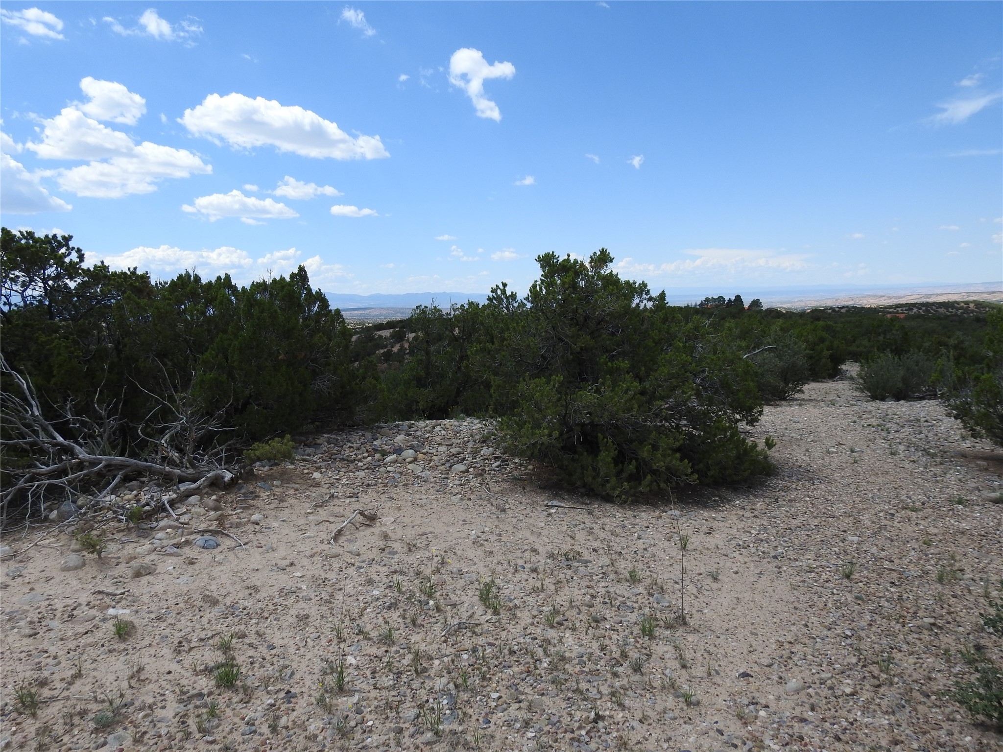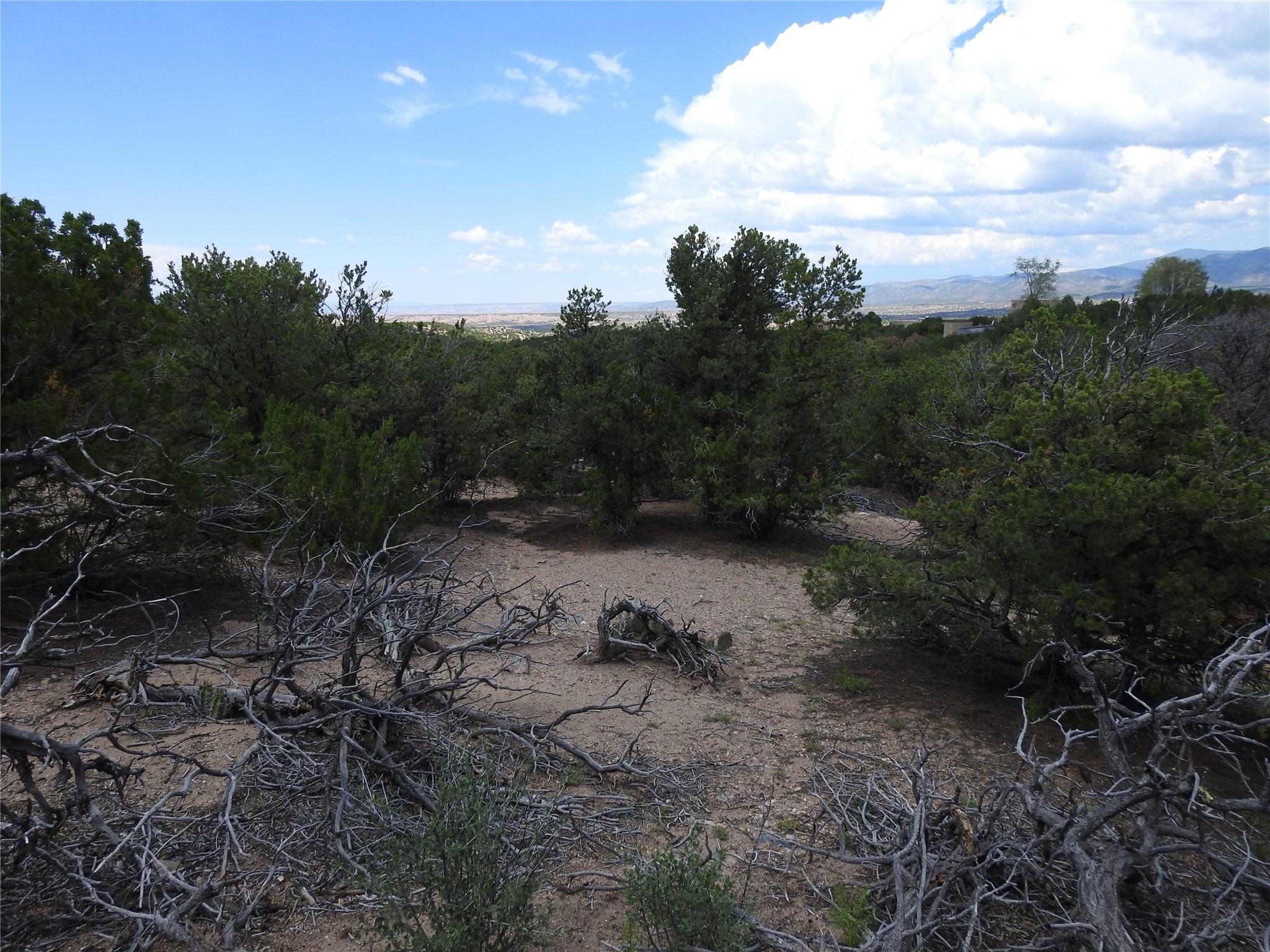 Beautiful, Pristine acreage off San Rafael. This triangular piece is covered with Pinon, Cedar, and different bushes. Ridges are hidden throughout and with existing roads going down two sides of this triangular lot, there are many points of entry sites. Over 700 feet down San Rafael and over 580 feet along Tano Trail.